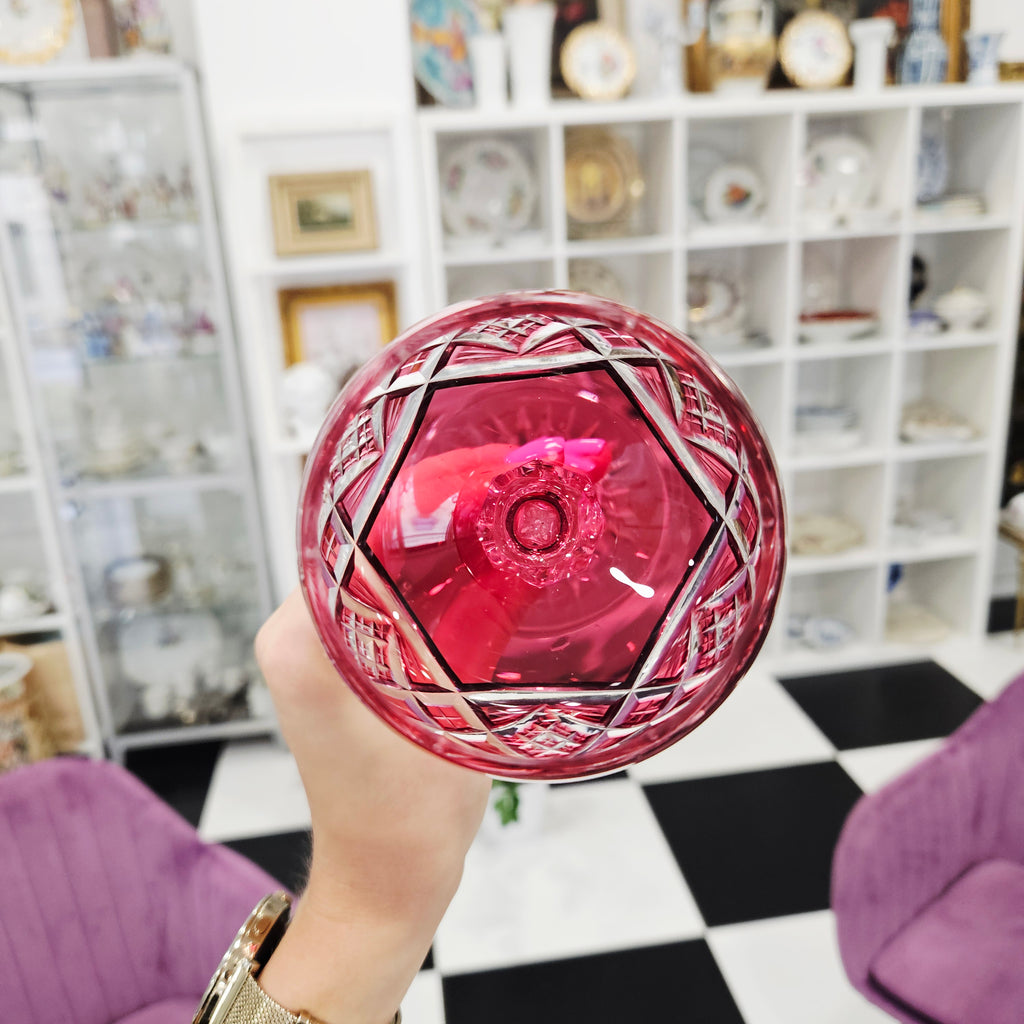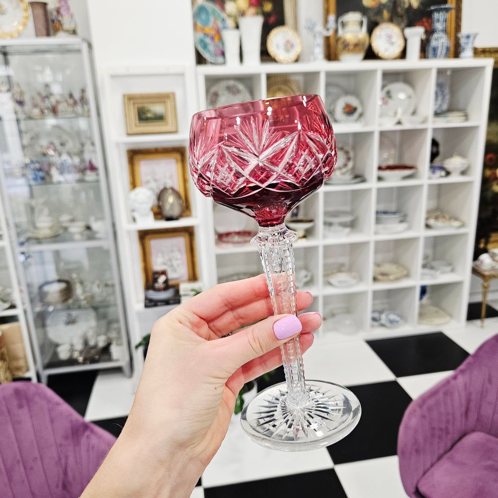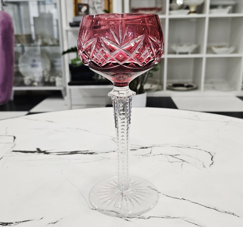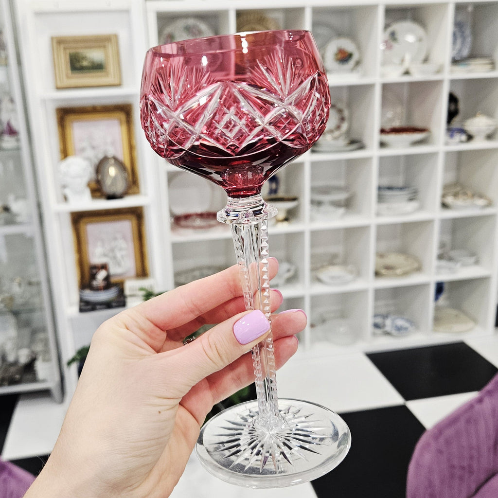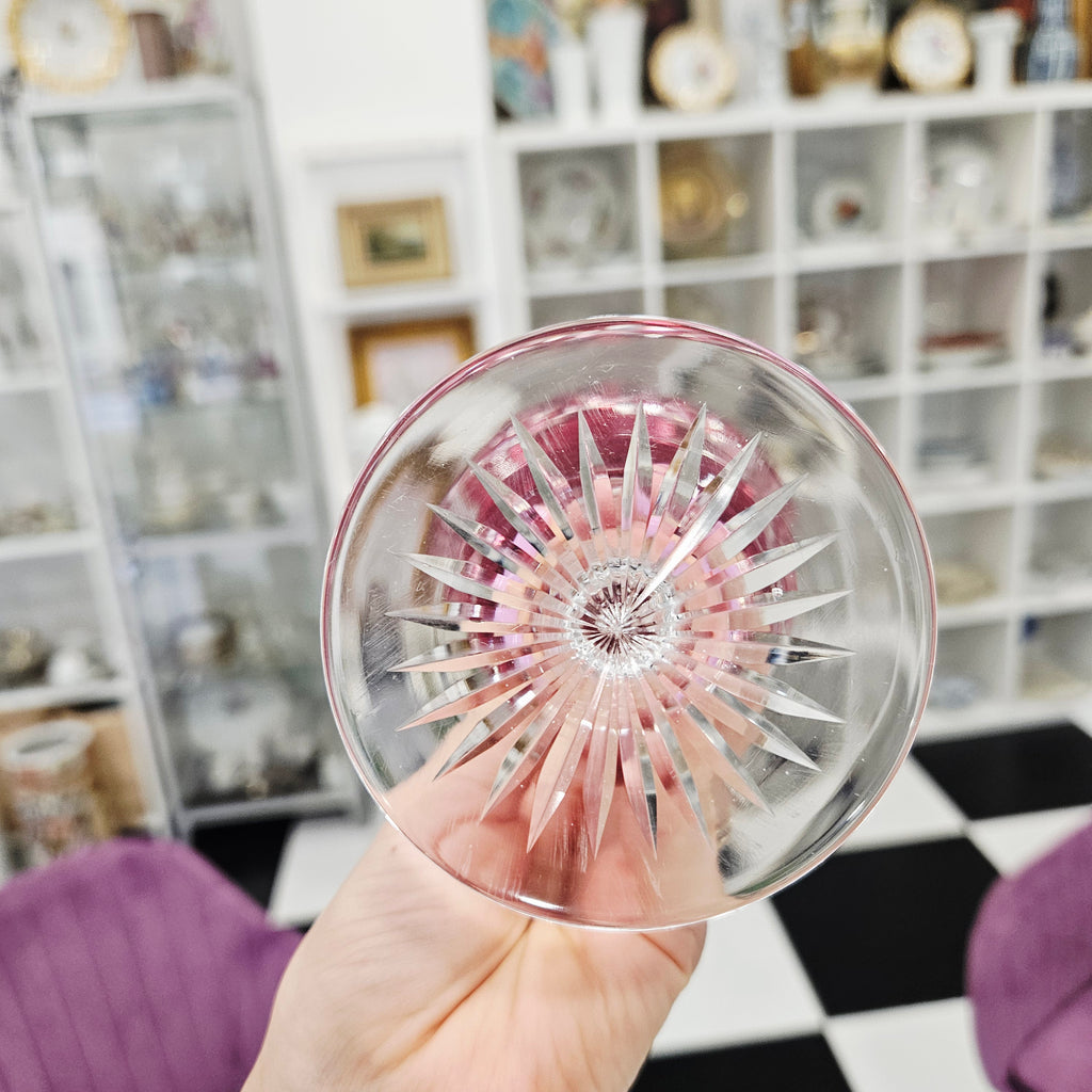 Rankomis raišyta, rausvos spalvos, krištolinės vyno taurė.