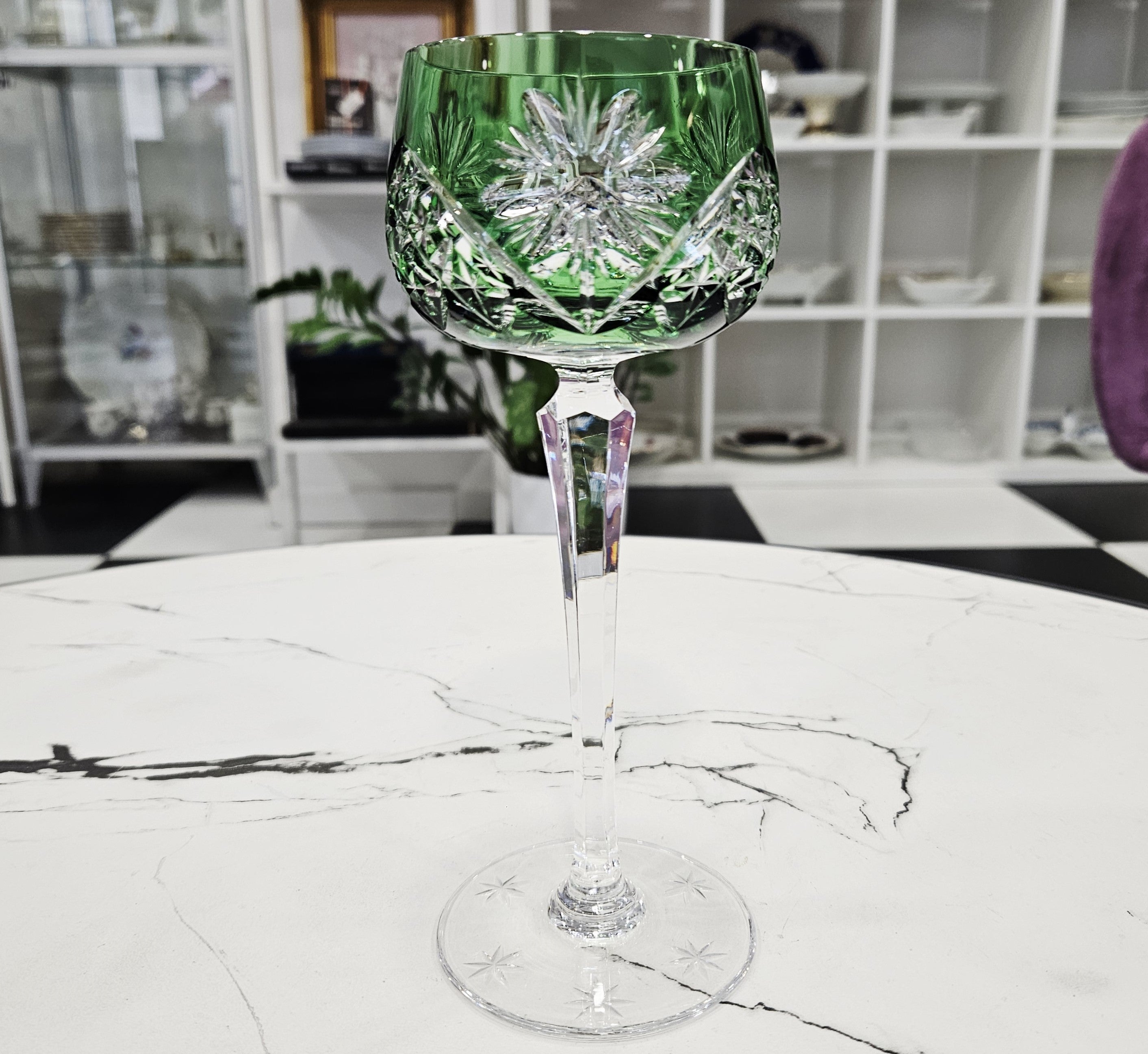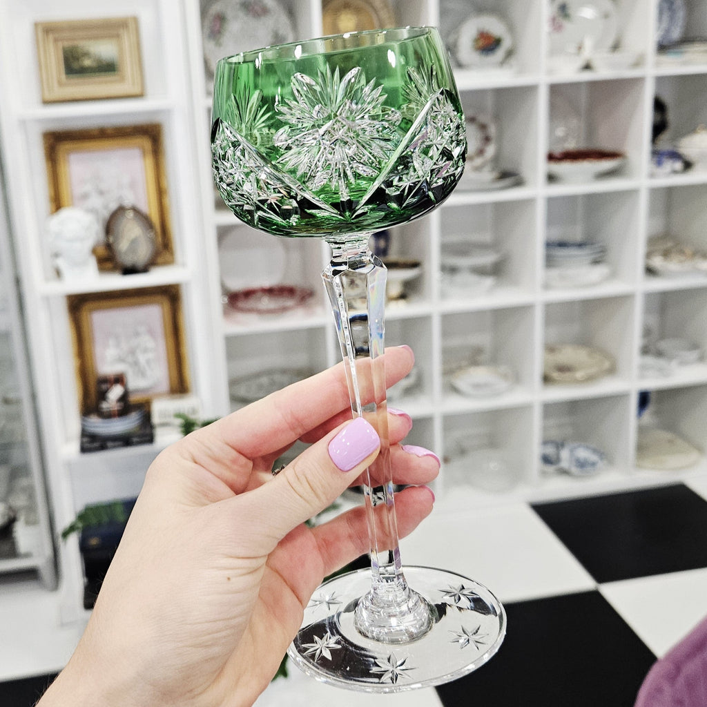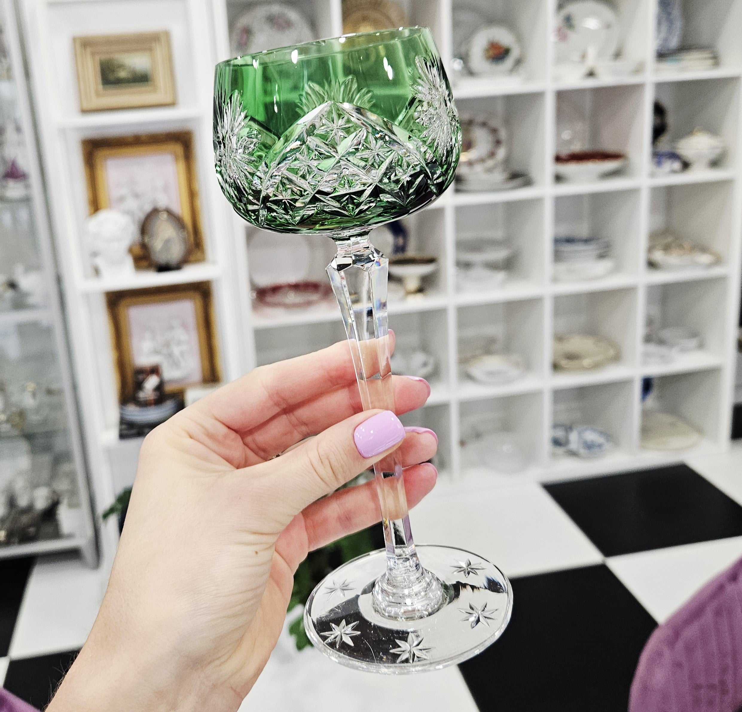 Rankomis raišyta, žalios spalvos, krištolinės vyno taurė.