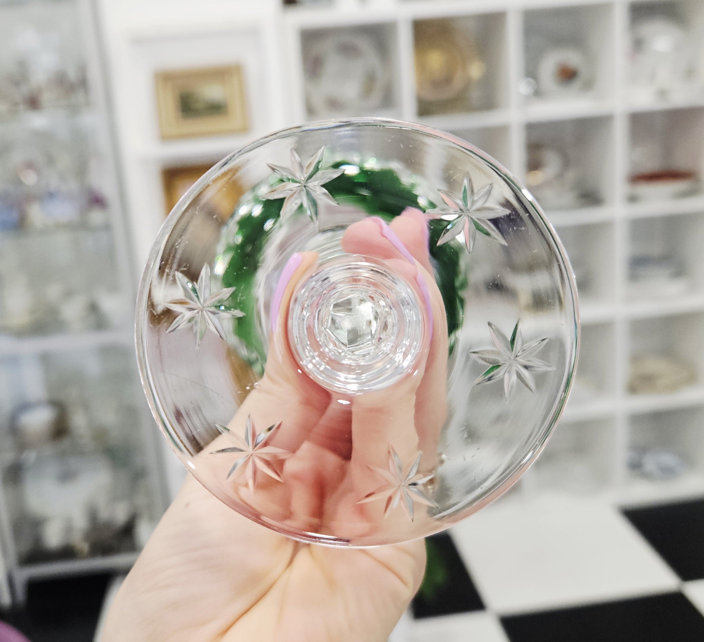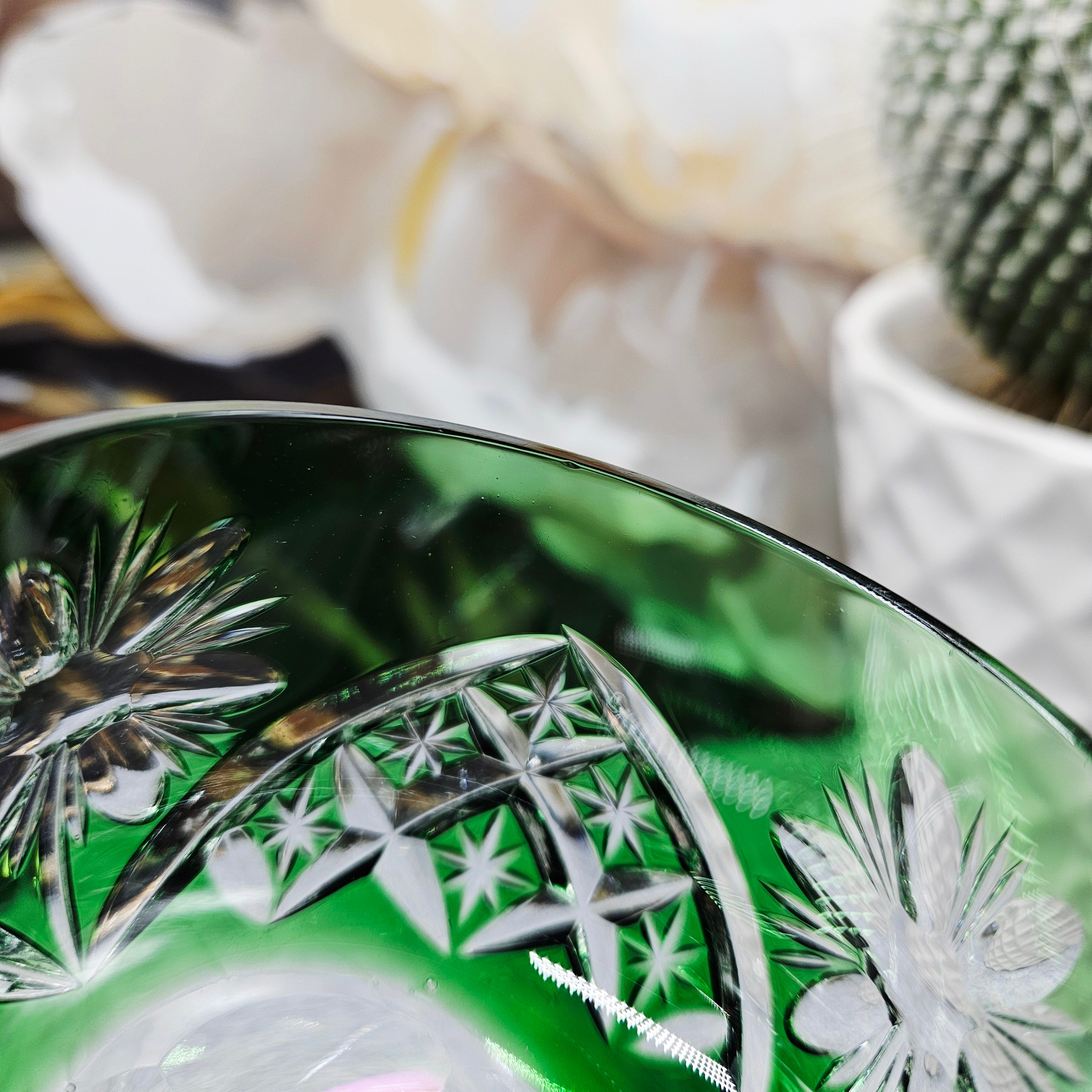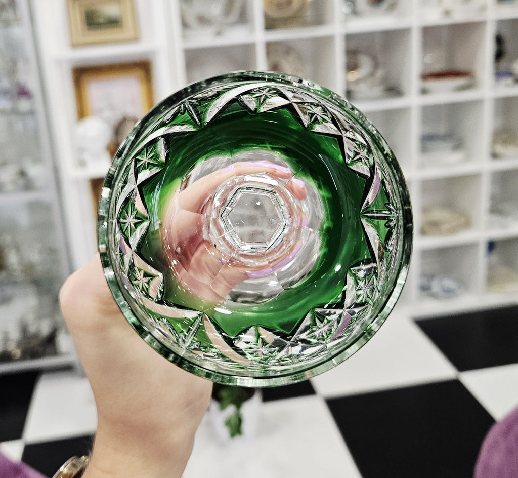 Rankomis raišyta, žalios spalvos, krištolinės vyno taurė.