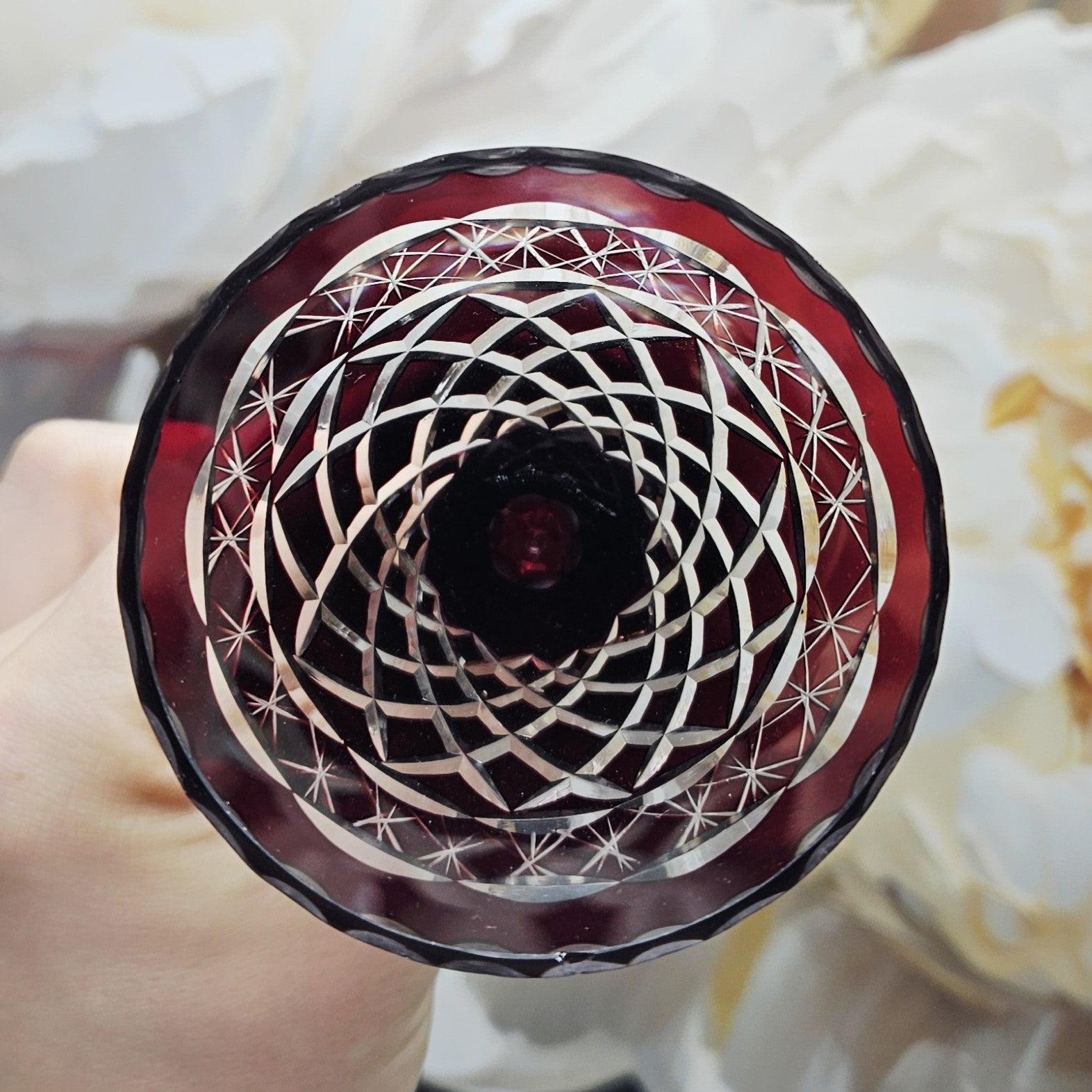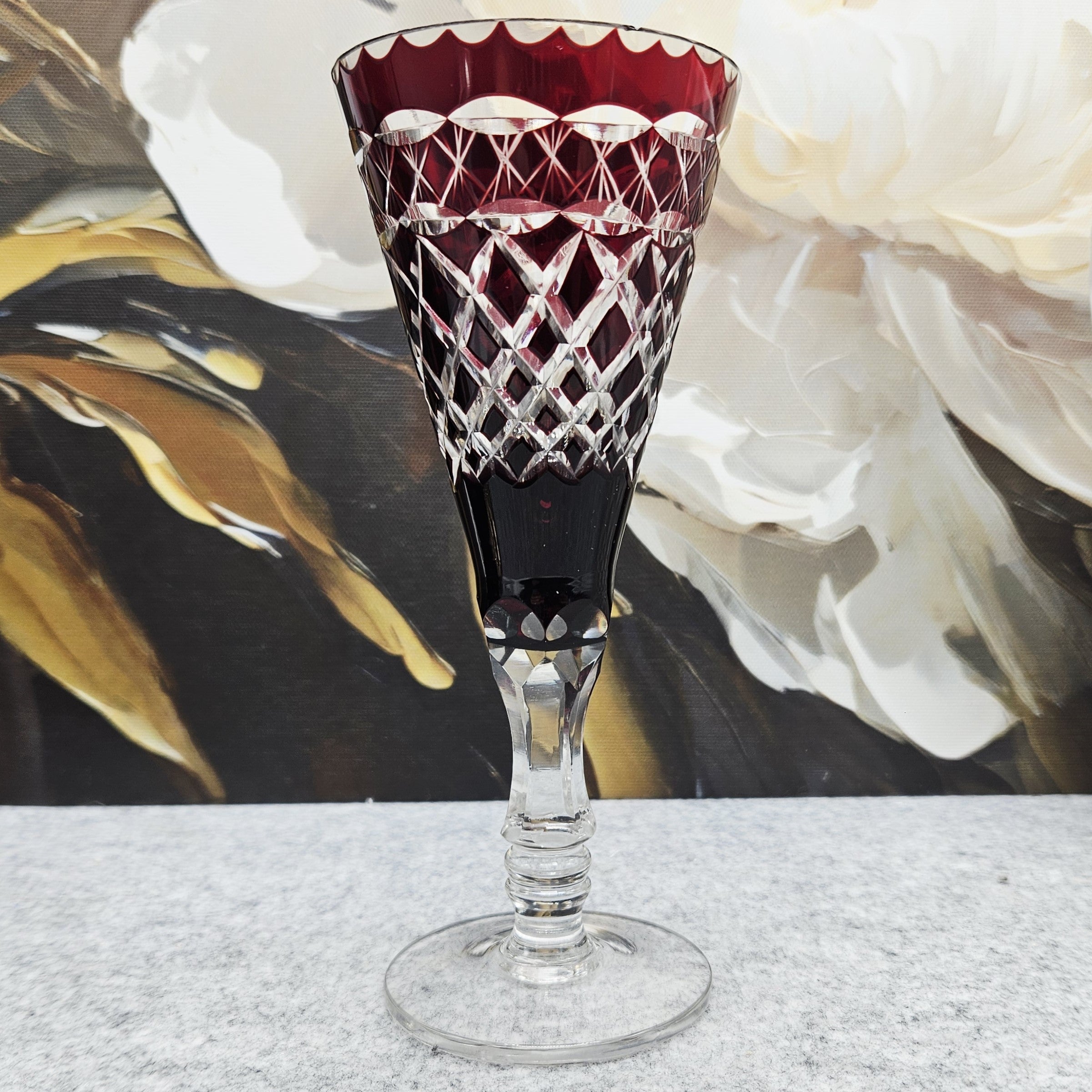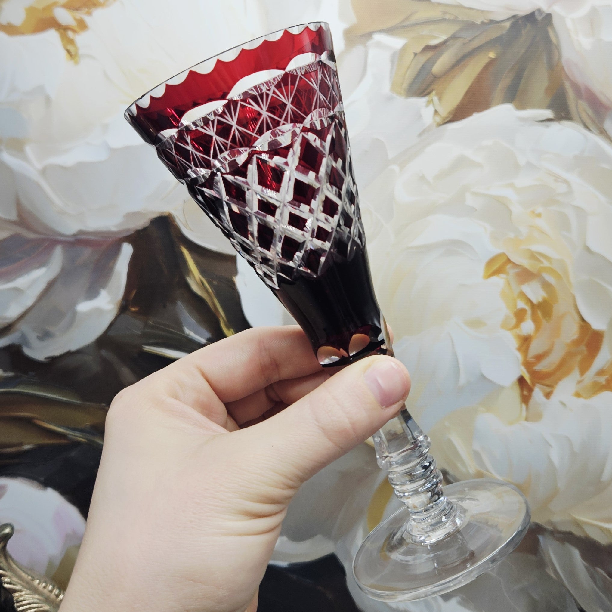 Elegantiška ir išskirtinė Bohemijos stiklo (Bohemian glass) taurė, pasižyminti sodria rubino raudonumo spalva ir subtiliu rankiniu šlifavimu. Taurės sienelės dekoruotos klasikiniu deimantinio pjūvio („diamond cut“) ornamentu, kuris gražiai atspindi šviesą ir suteikia krištolui ypatingo spindesio. Viršutinę taurės dalį puošia subtilus geometrinis dekoras, suteikiantis gaminiui prabangos ir rafinuotumo.