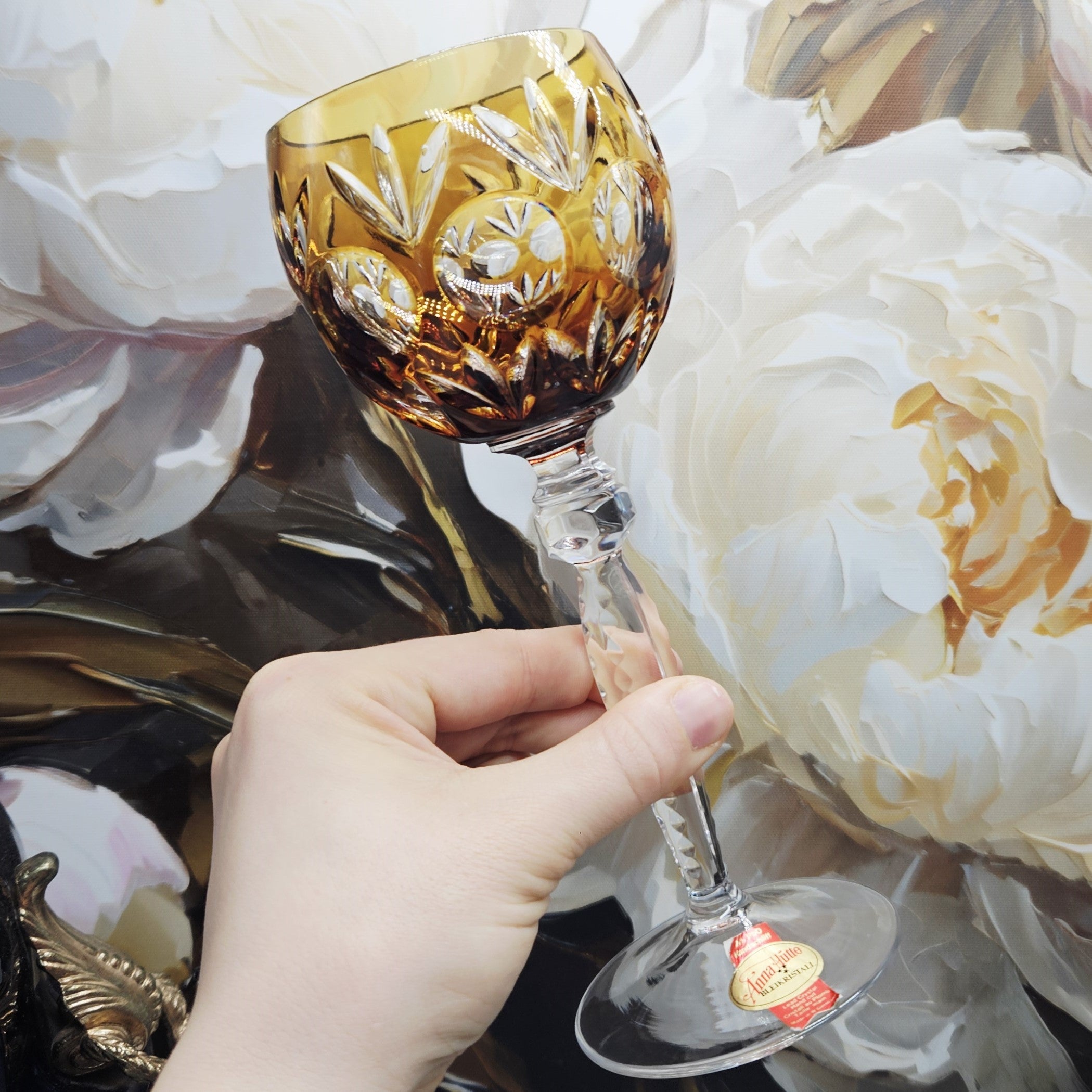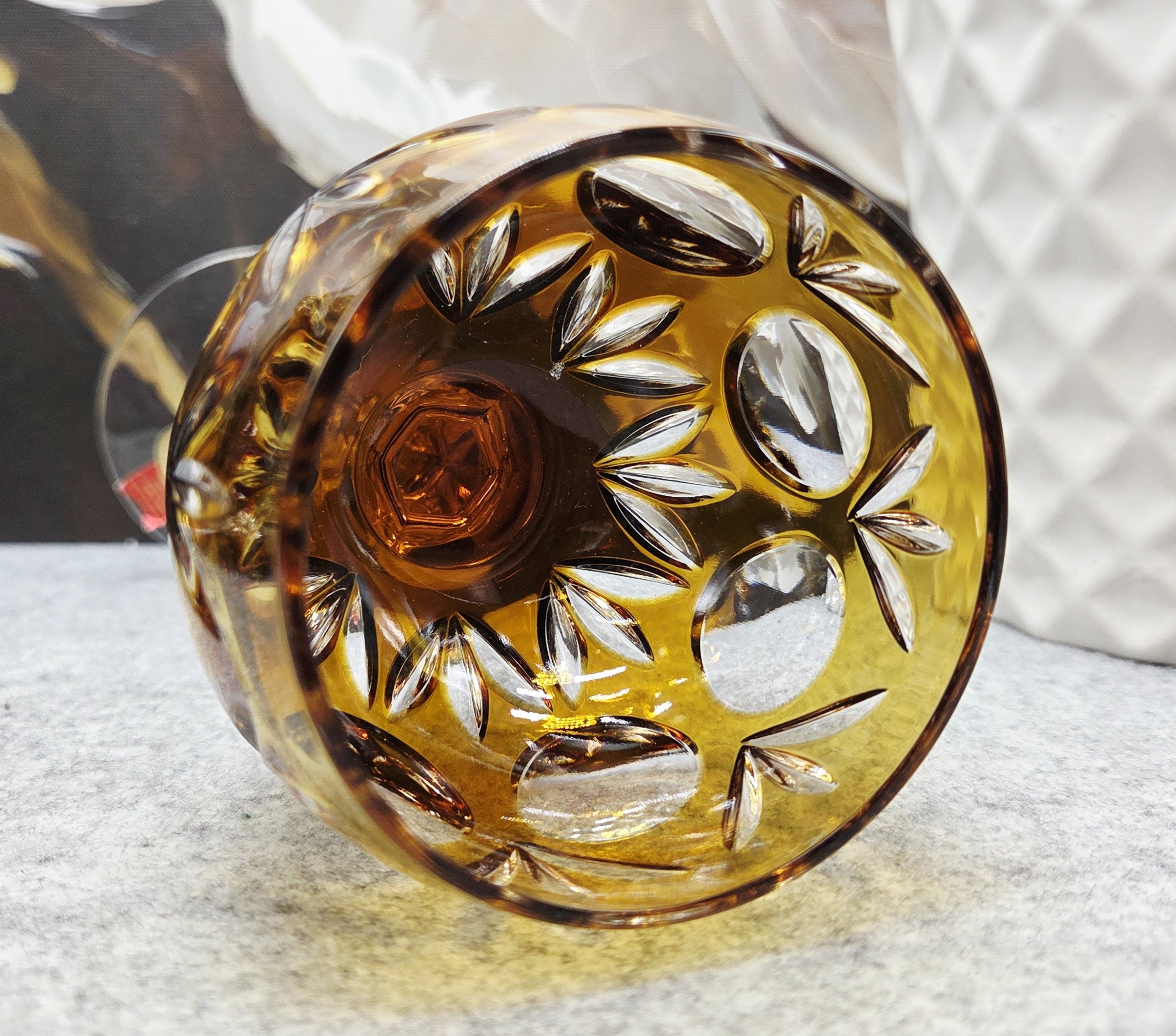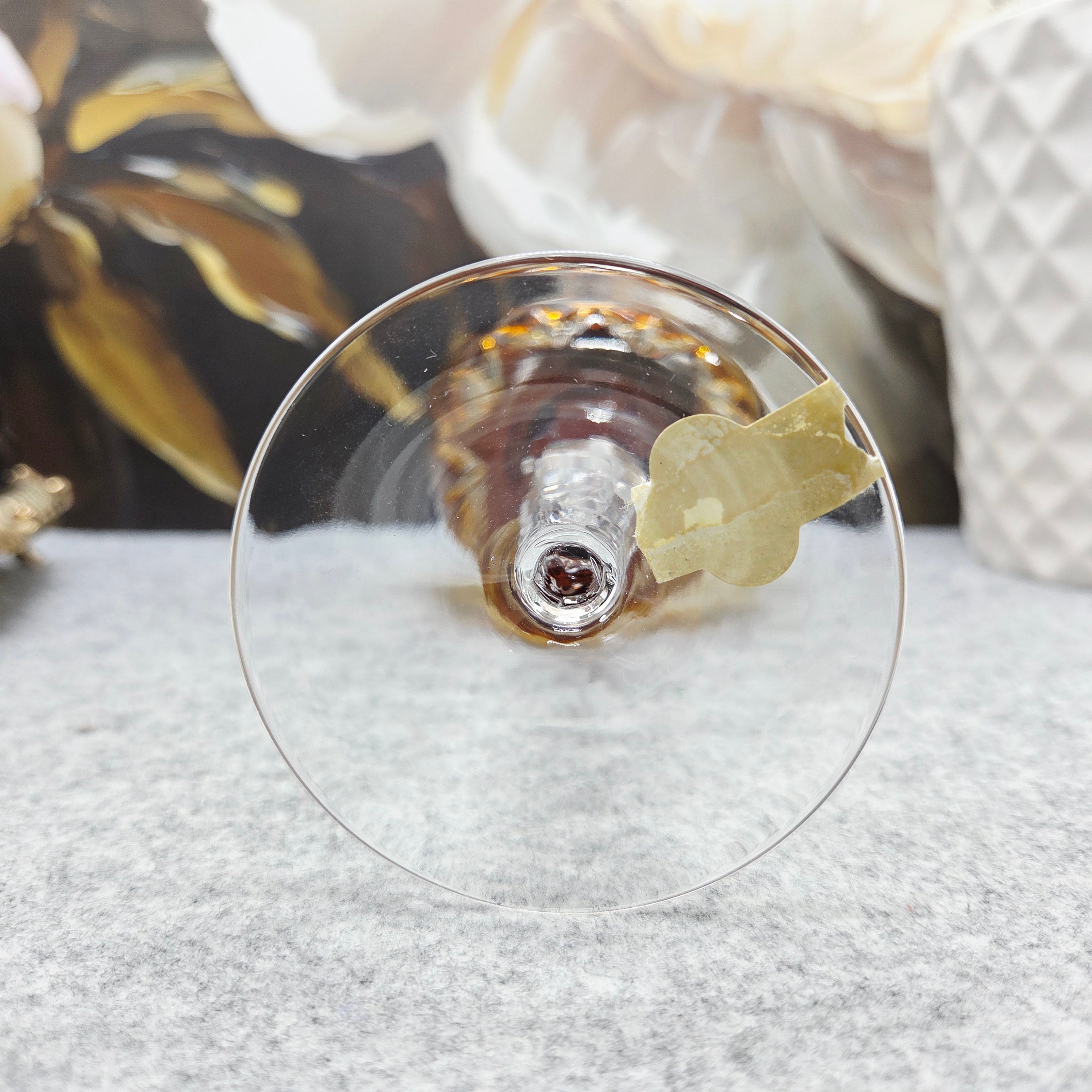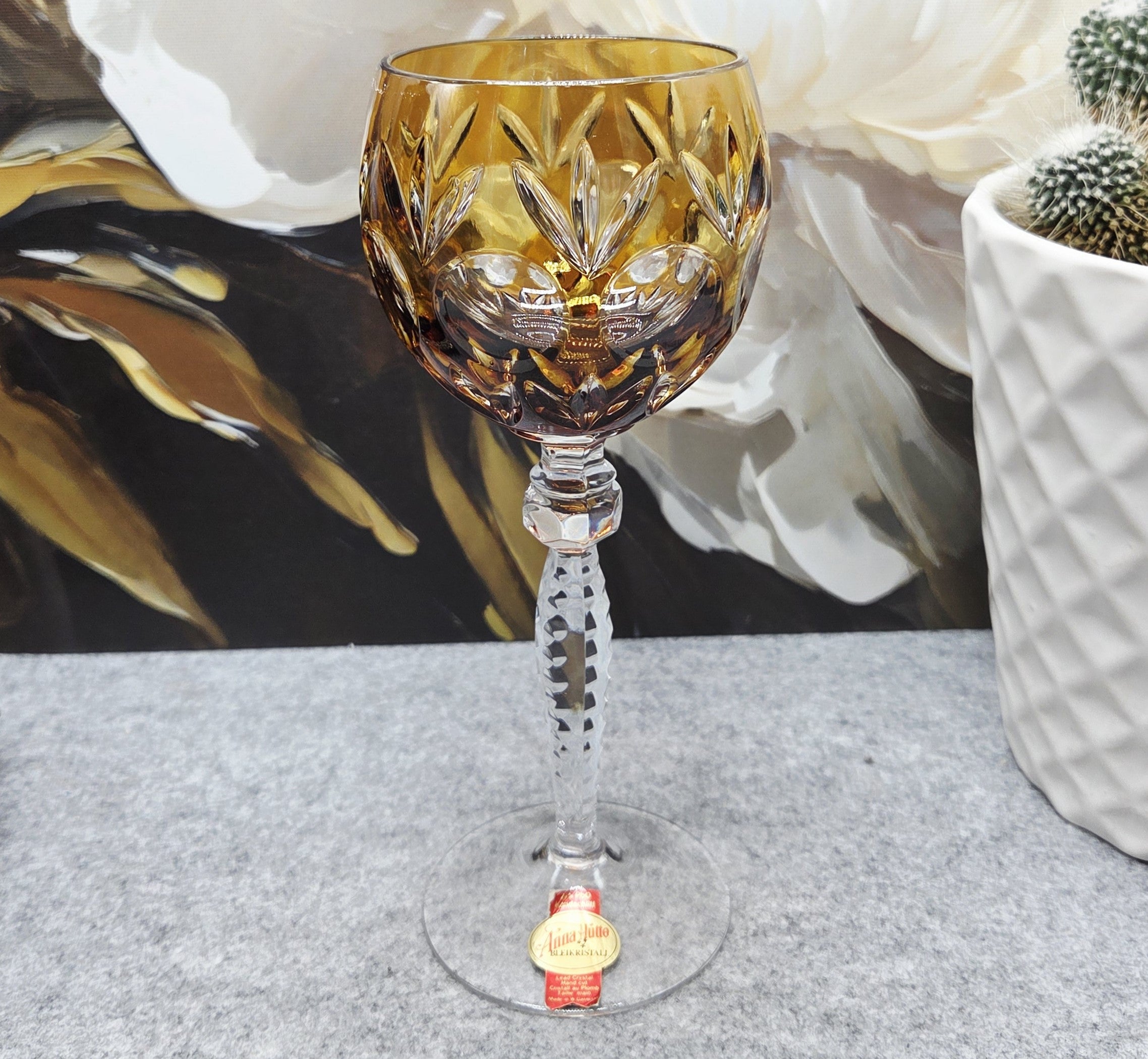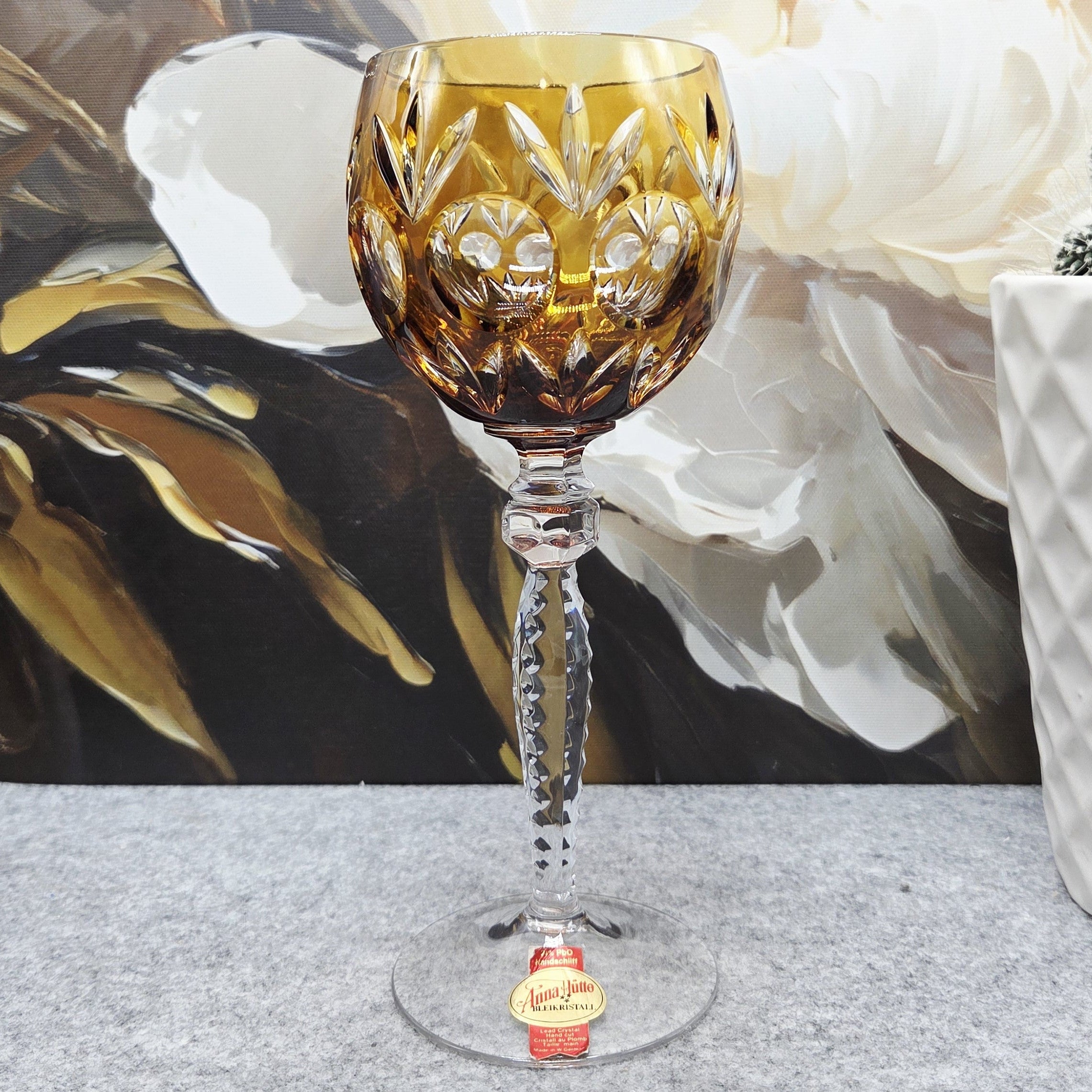 Taurė pagaminta iš aukštos kokybės 24 % PbO švino krištolo, kuris suteikia jai ypatingą skaidrumą, svorį ir prabangų šviesos žaismą. Rankomis šlifuoti ornamentai („Handschliff“) subtiliai laužo šviesą, sukurdami įspūdingą blizgesį ir gylio efektą. Taurės viršus dekoruotas sodria gintarine spalva, kuri suteikia šilumos, išskirtinumo ir rafinuoto charakterio.