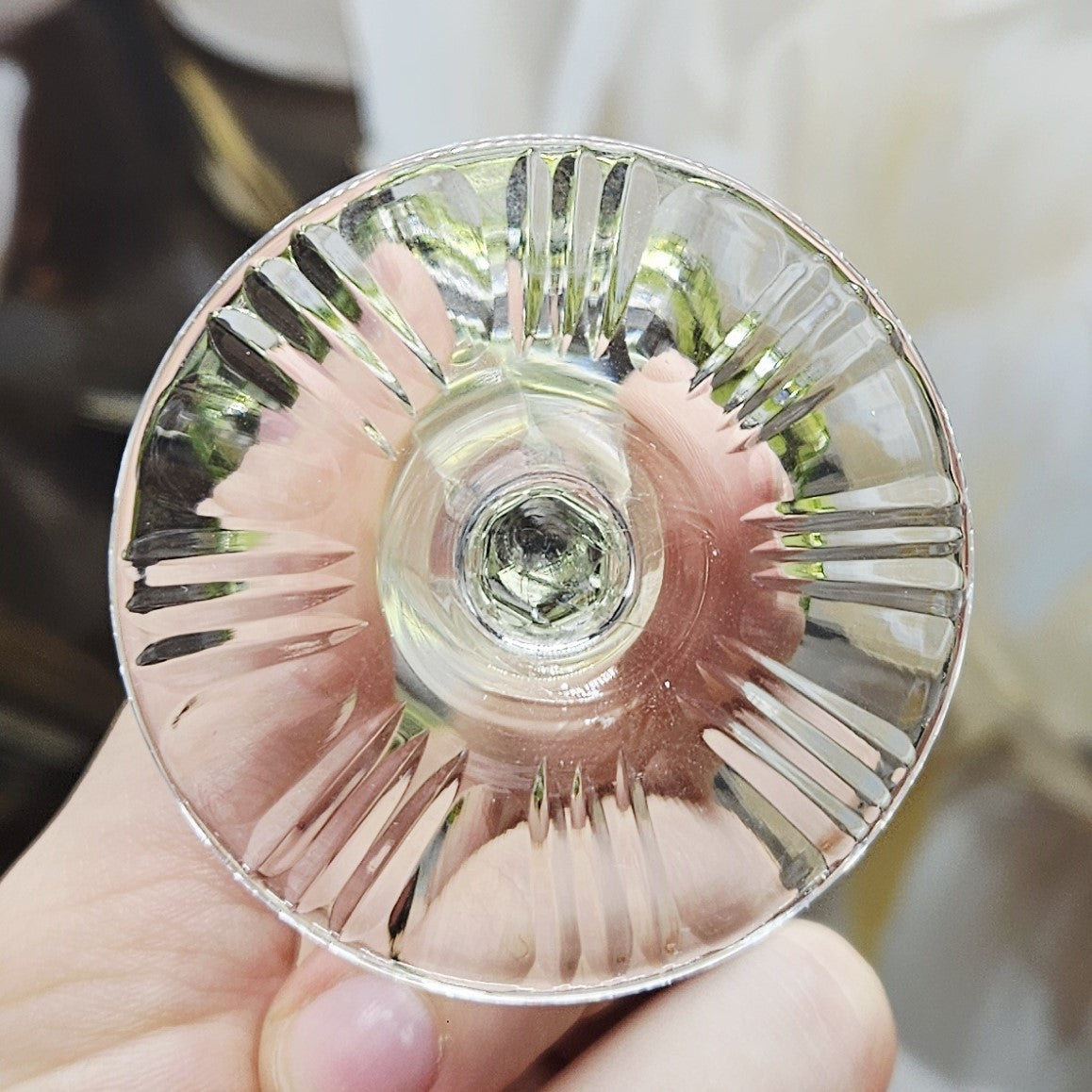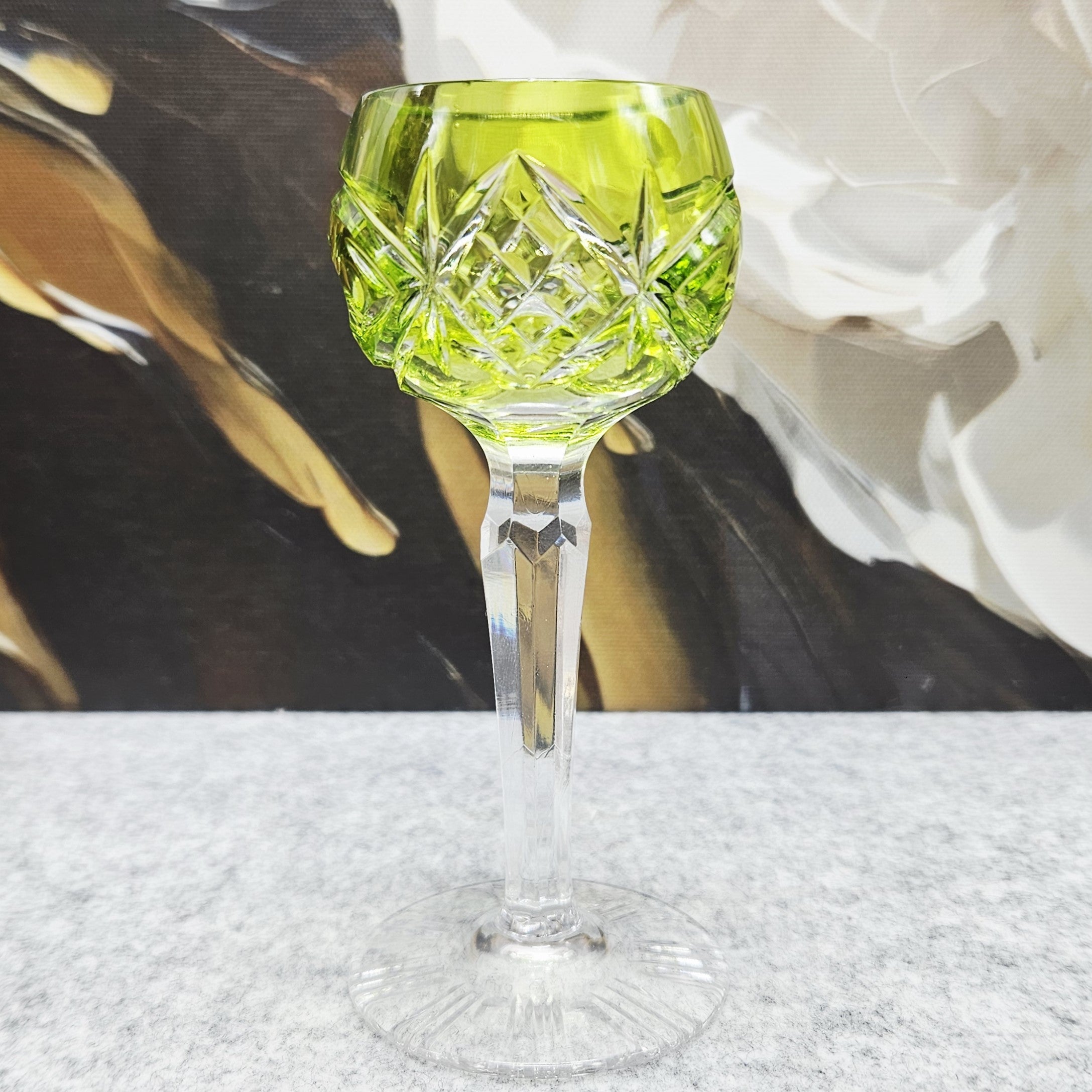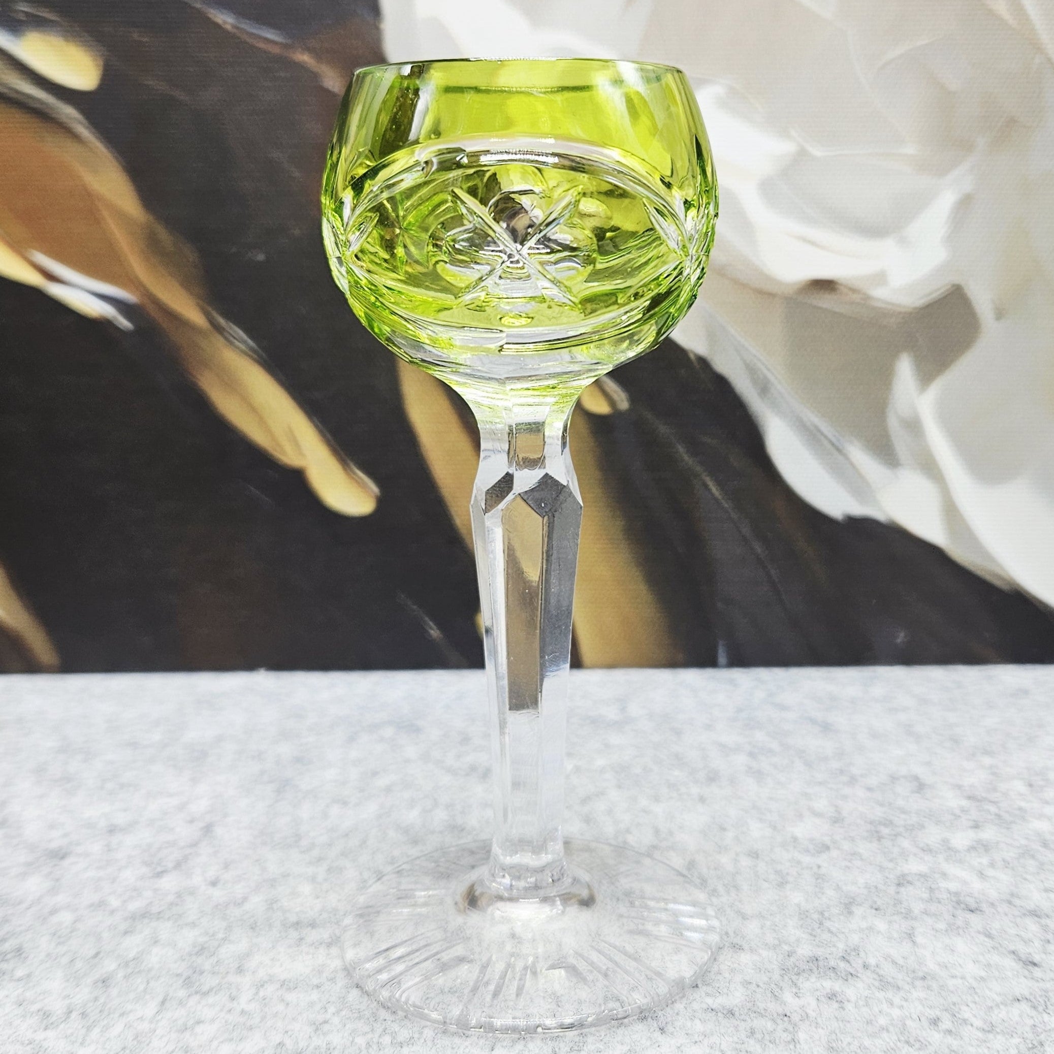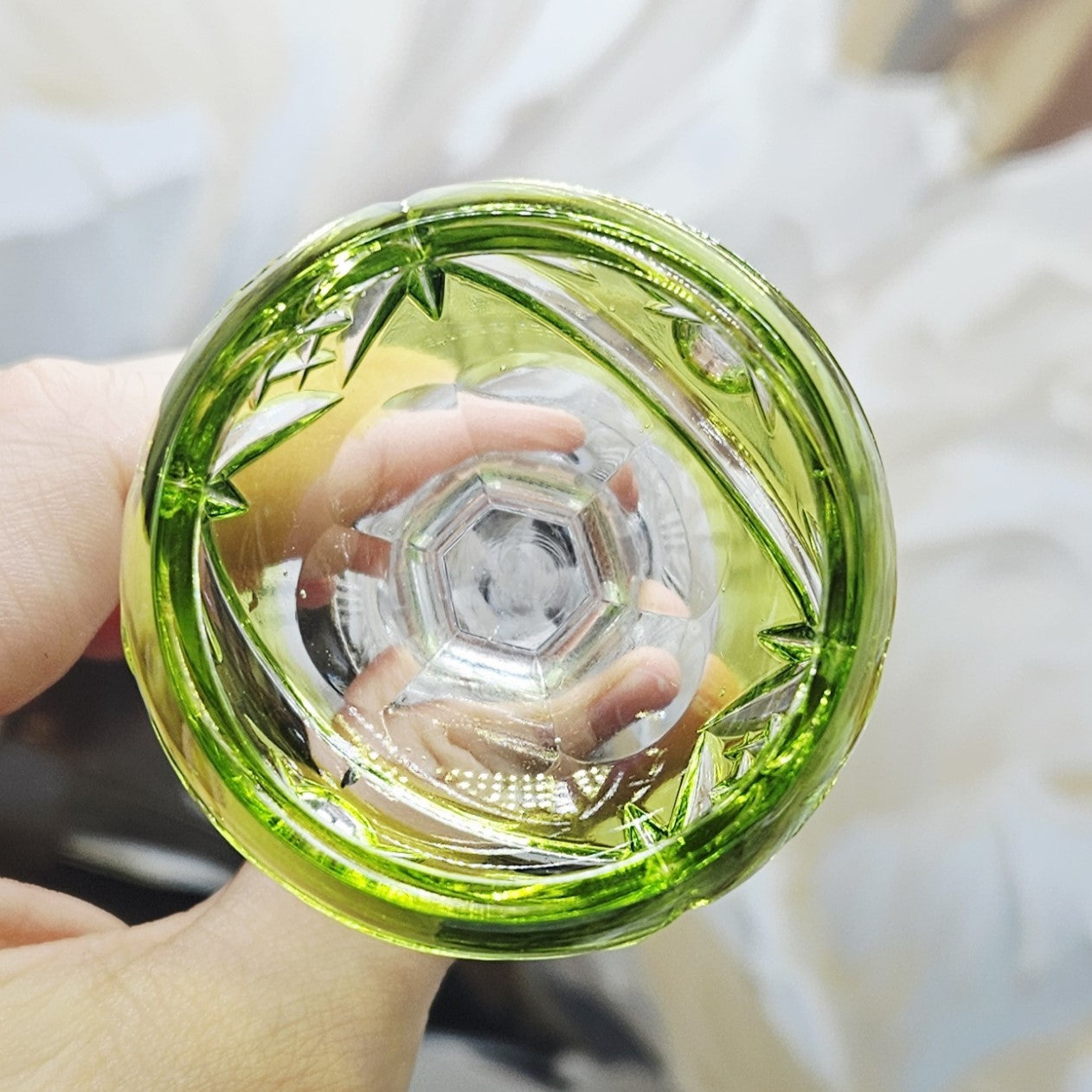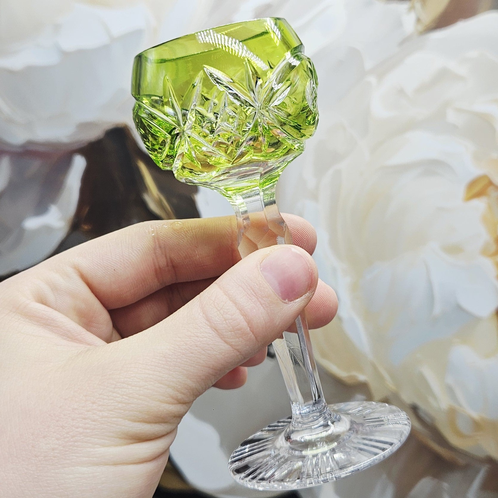 Nuostabi, likerio/ stipriųjų gėrimų taurelė. Salotinė spalva gražiai kontrastuoja su skaidriu paviršiumi, o rankomis išpjaustytas ornamentas sustiprina lūžtančios šviesos efektą.
