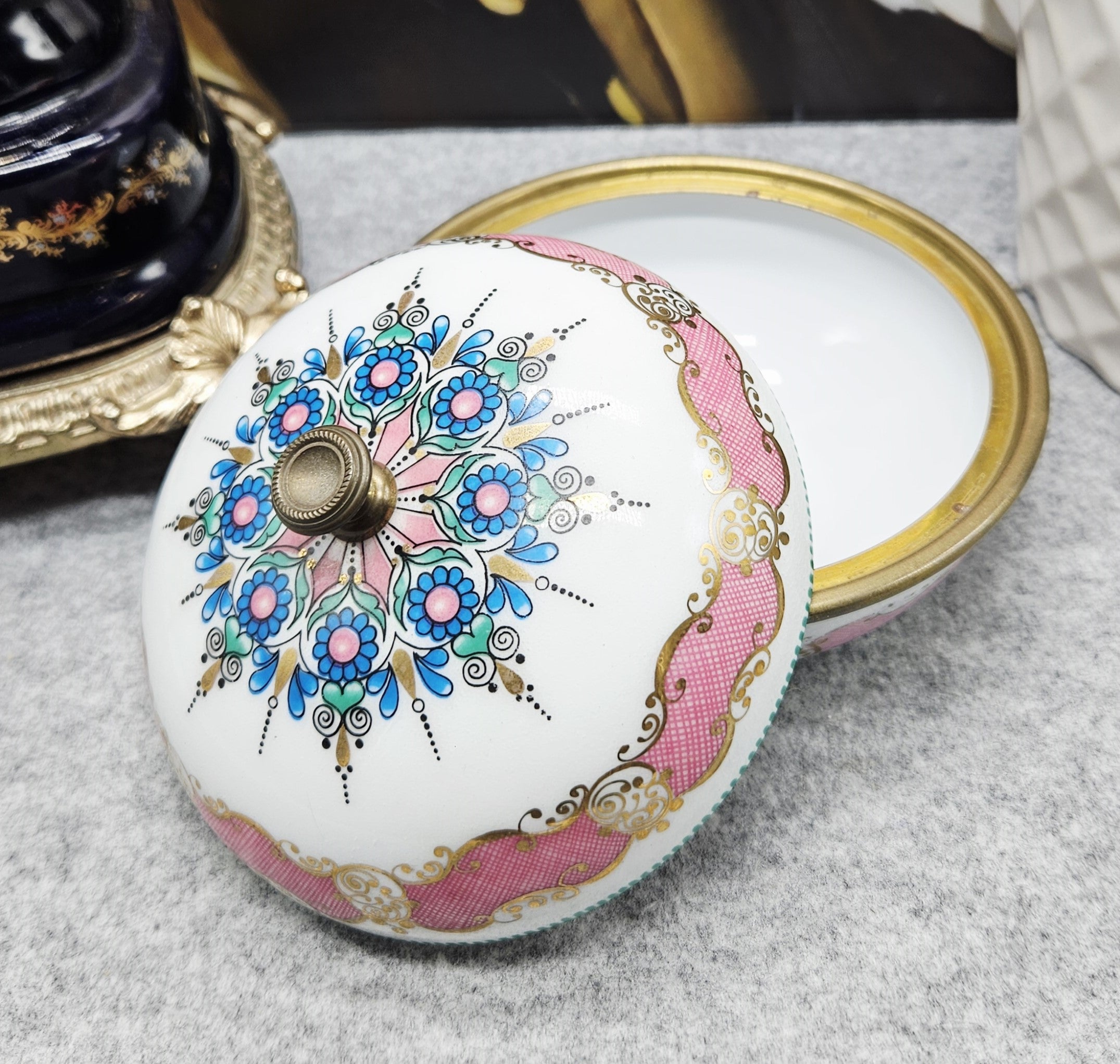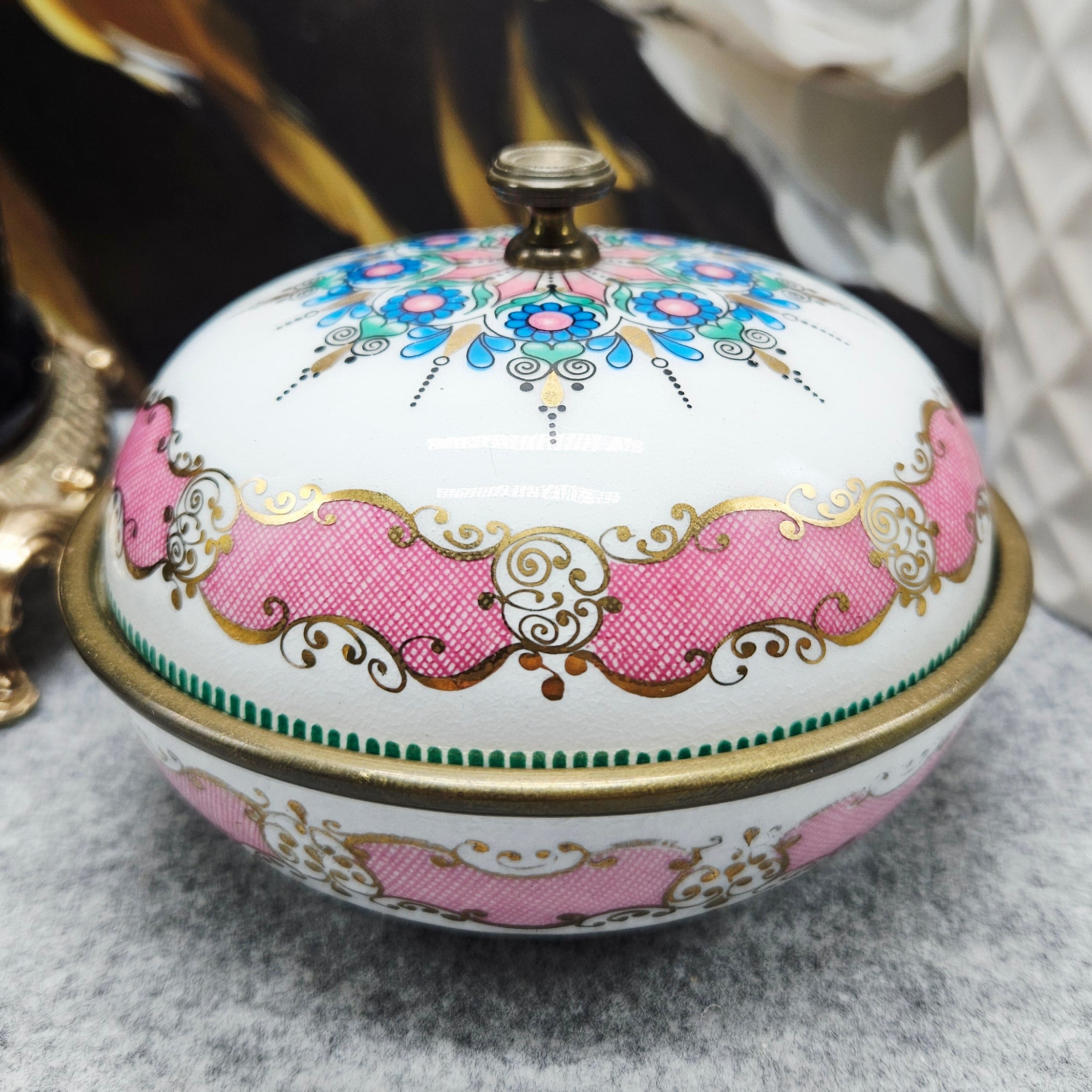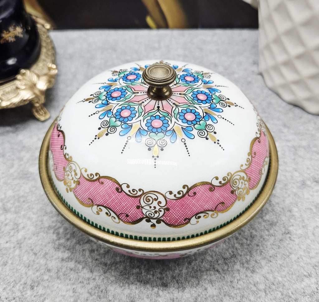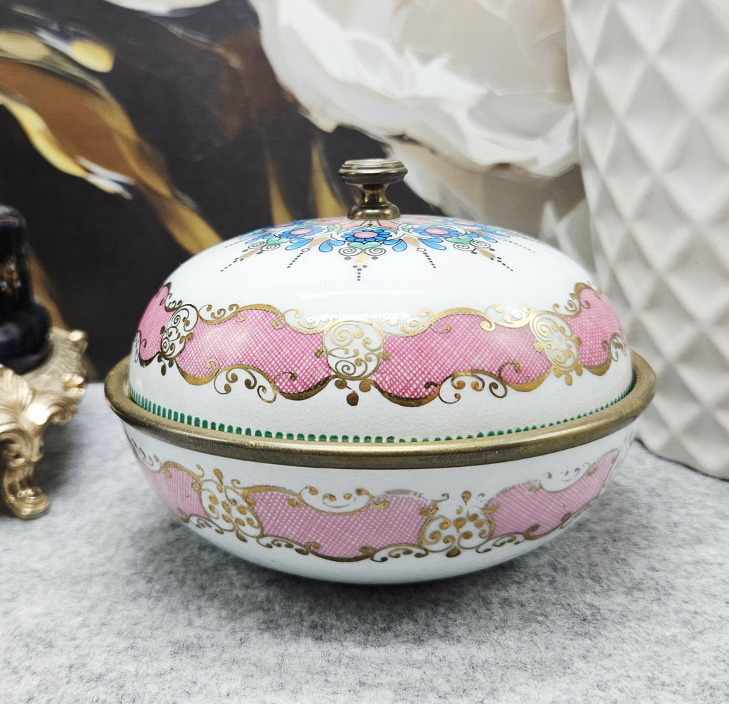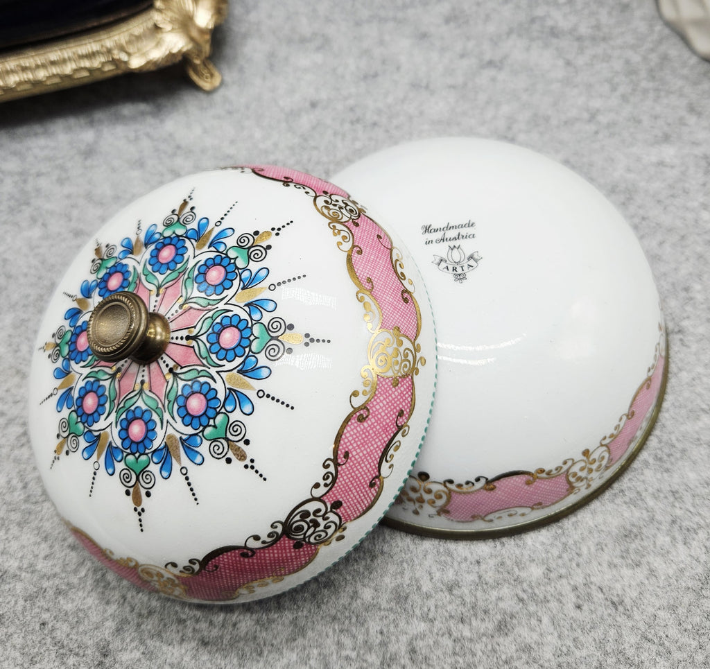 Išskirtinio grožio „ARTA“ rankų darbo emalinė dėžutė, pagaminta Austrijoje. Šis elegantiškas kūrinys žavi savo apvalia forma ir itin kruopščiai atliktu rankiniu emalio dekoru – baltame fone išryškėja rožinės, mėlynos ir auksinės spalvų ornamentai, dekoruoti smulkiais taškiniais bei augaliniais motyvais.