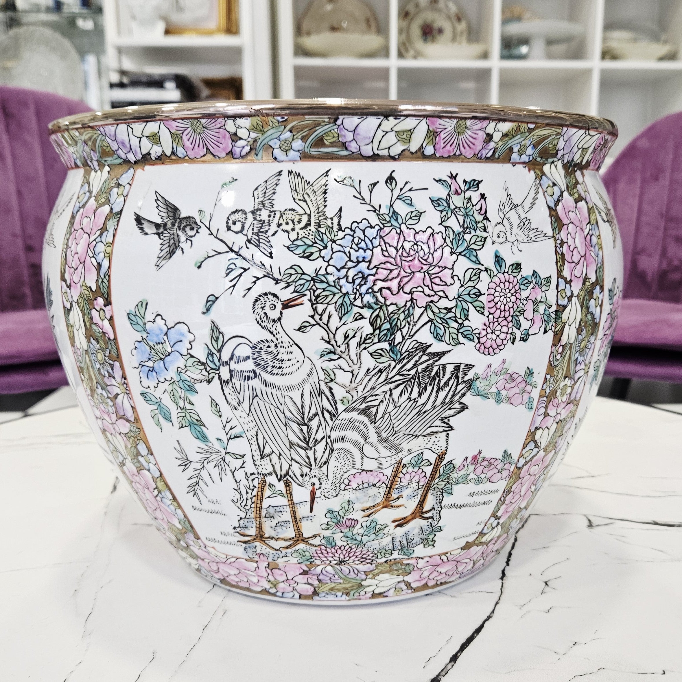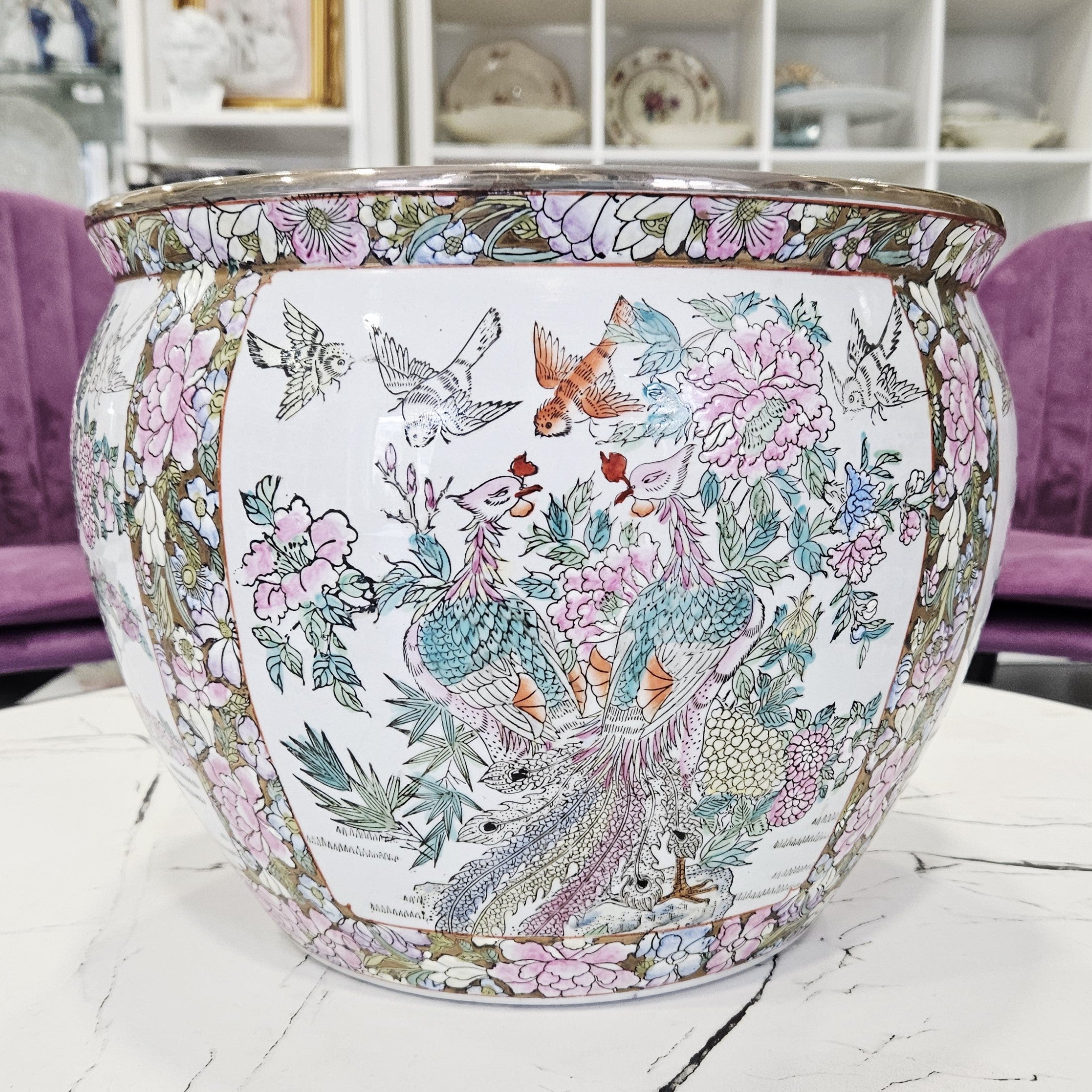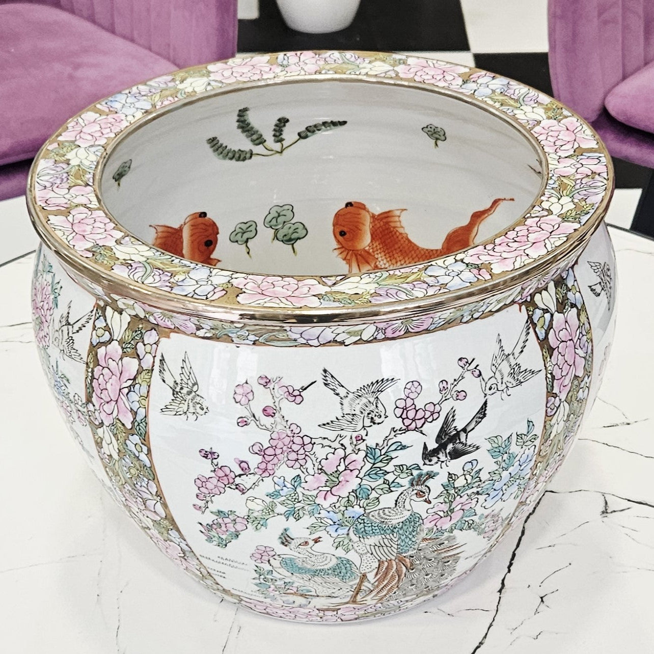 Įspūdingas rankomis tapytas porcelianinis žuvų dubuo- vazonas iš Kinijos – dekoratyvus ir išskirtinis interjero akcentas. Balusterio formos korpusą puošia itin gausus floros ir paukščių dekoras, subtiliai perteikiantis rytietiškos estetikos harmoniją bei gyvybingumą. Indo viduje nutapyti žuvų motyvai suteikia kūriniui simbolinės prasmės – Rytų kultūroje jos siejamos su gausa, sėkme ir klestėjimu.