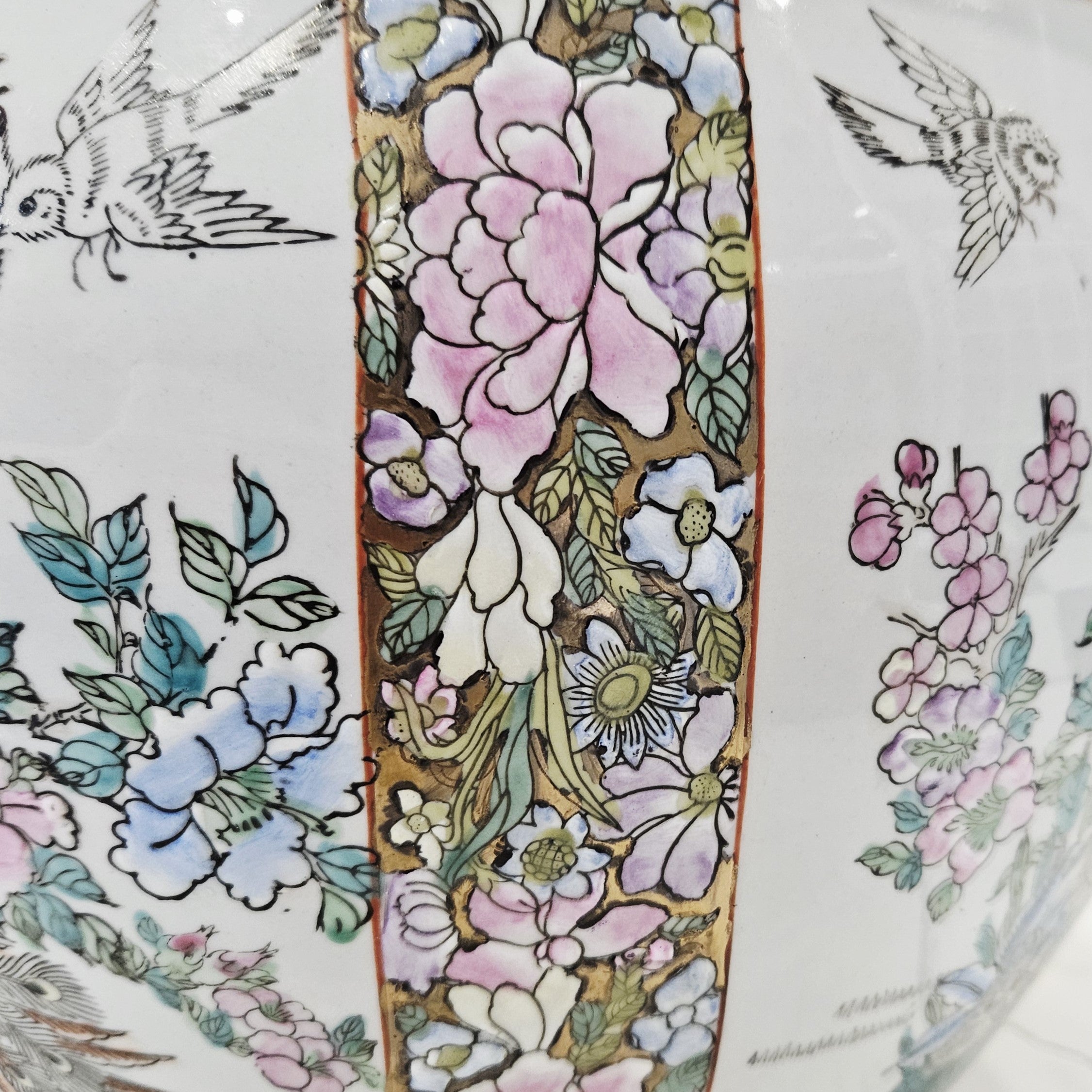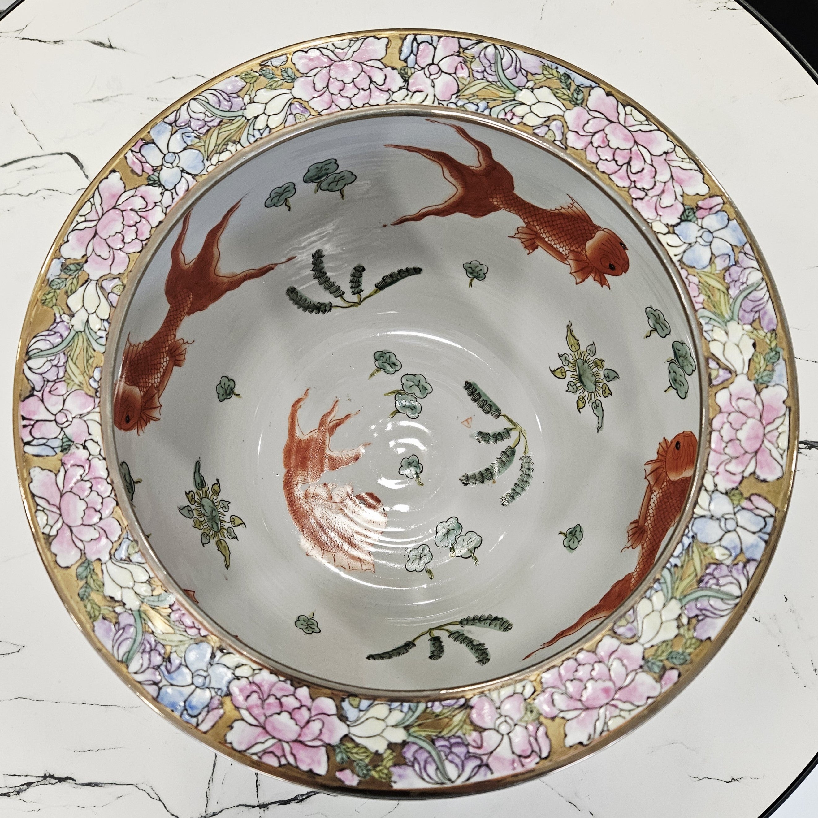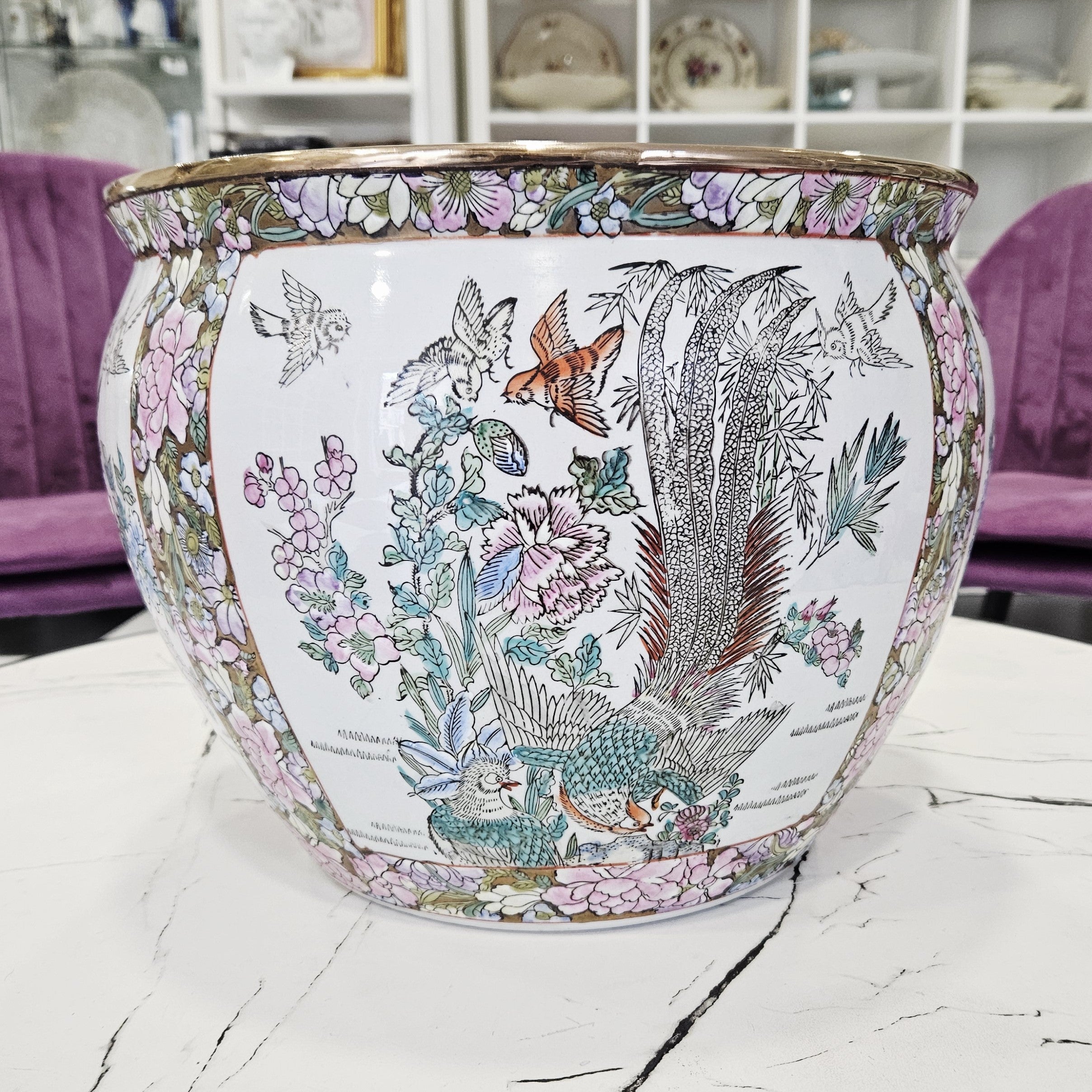 Įspūdingas rankomis tapytas porcelianinis žuvų dubuo- vazonas iš Kinijos – dekoratyvus ir išskirtinis interjero akcentas. Balusterio formos korpusą puošia itin gausus floros ir paukščių dekoras, subtiliai perteikiantis rytietiškos estetikos harmoniją bei gyvybingumą. Indo viduje nutapyti žuvų motyvai suteikia kūriniui simbolinės prasmės – Rytų kultūroje jos siejamos su gausa, sėkme ir klestėjimu.