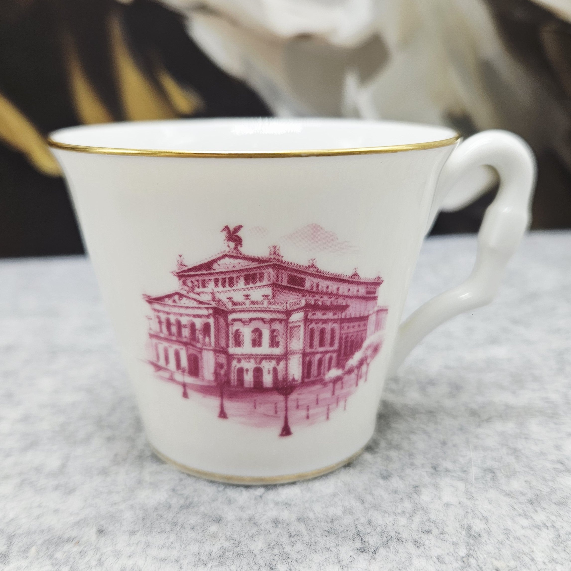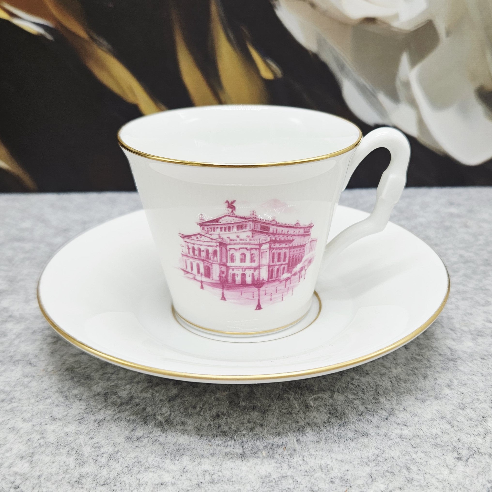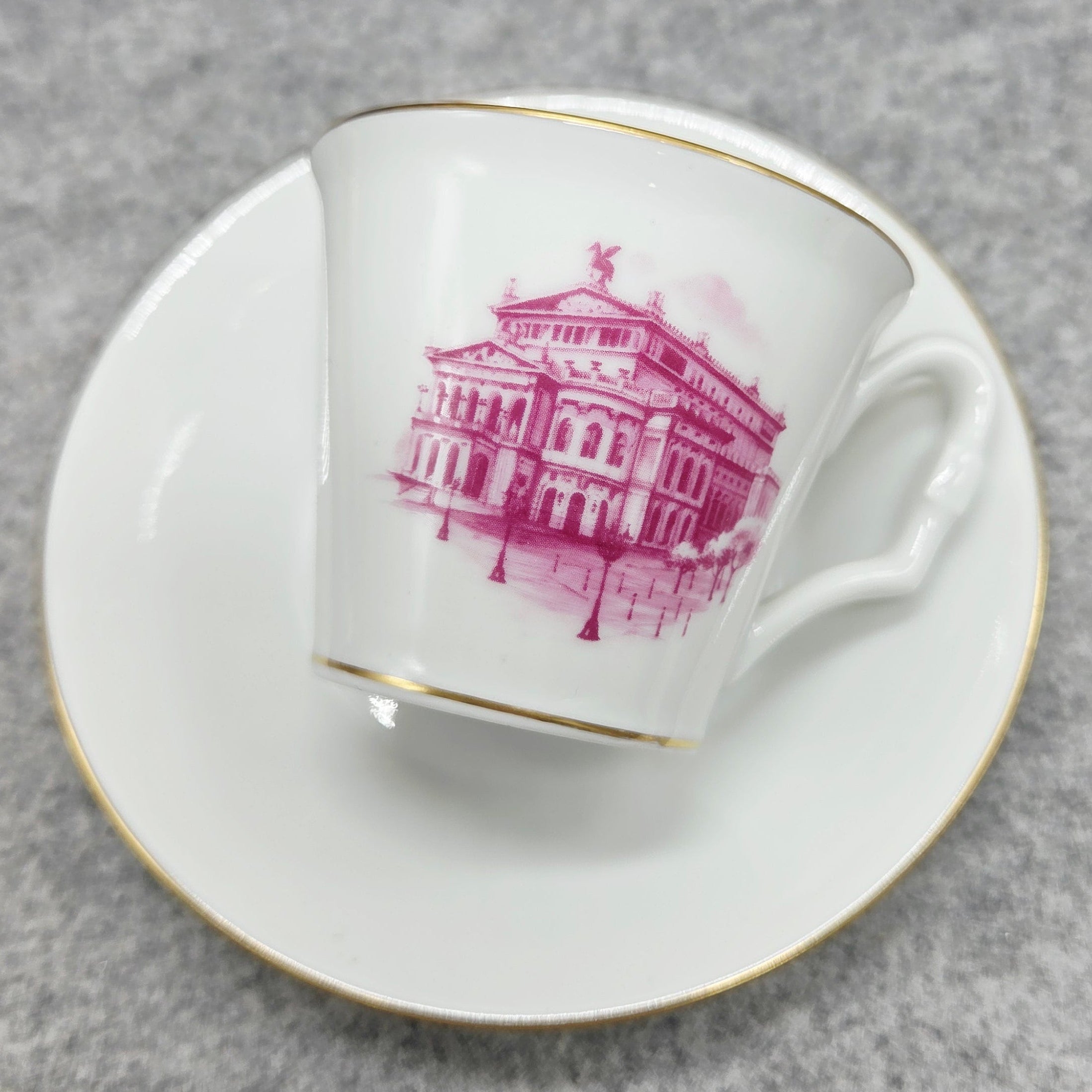 Elegantiškas vokiško Höchst porceliano puodelis su lėkštute, dekoruotas subtiliu rožiniu istorinio Frankfurto operos rūmų „Alte Oper atvaizdu. Minimalistinis baltas porcelianas ir aukso spalvos kraštelių akcentai suteikia dirbiniui rafinuoto klasikinio žavesio.