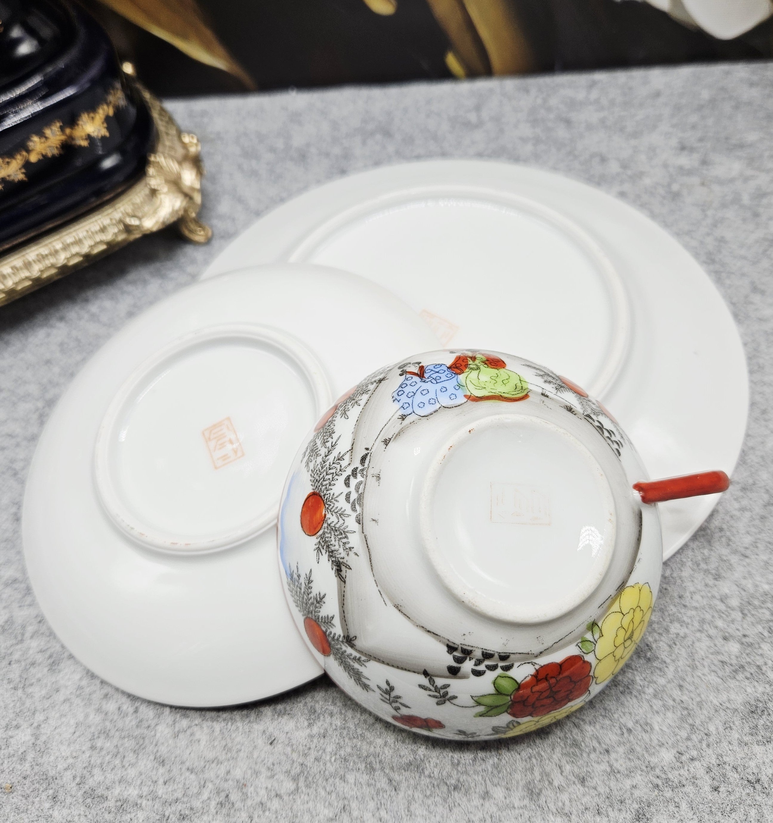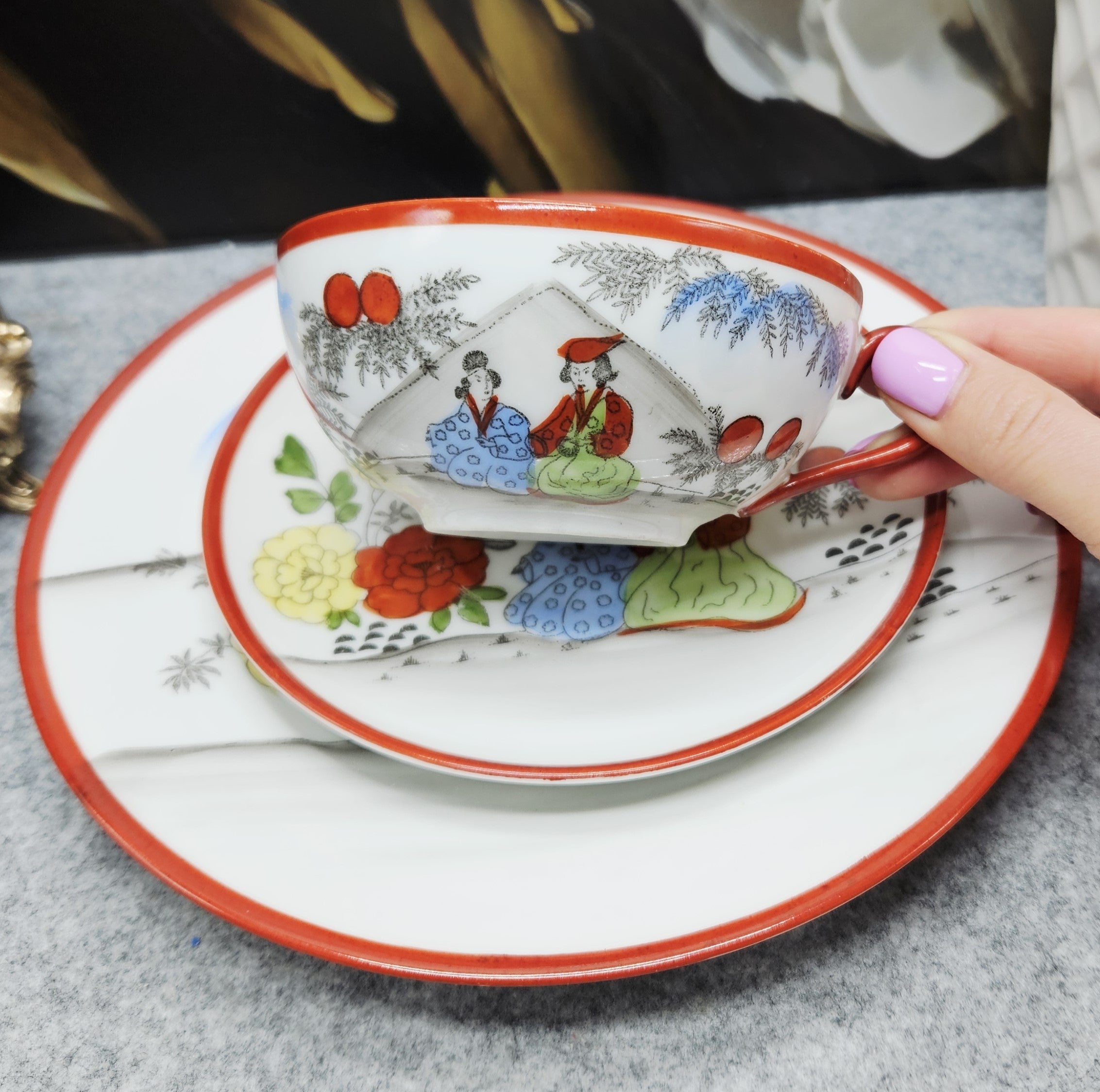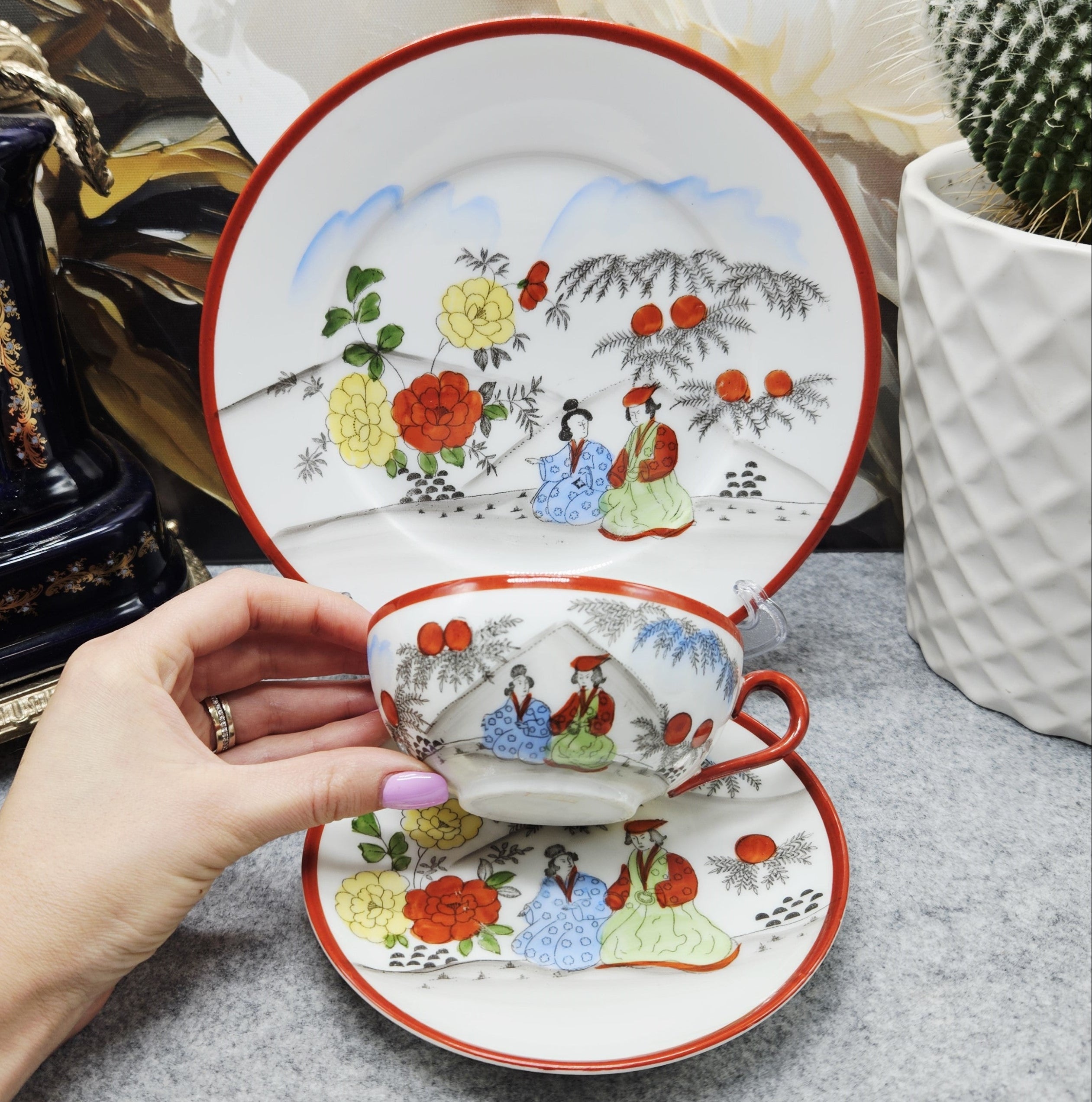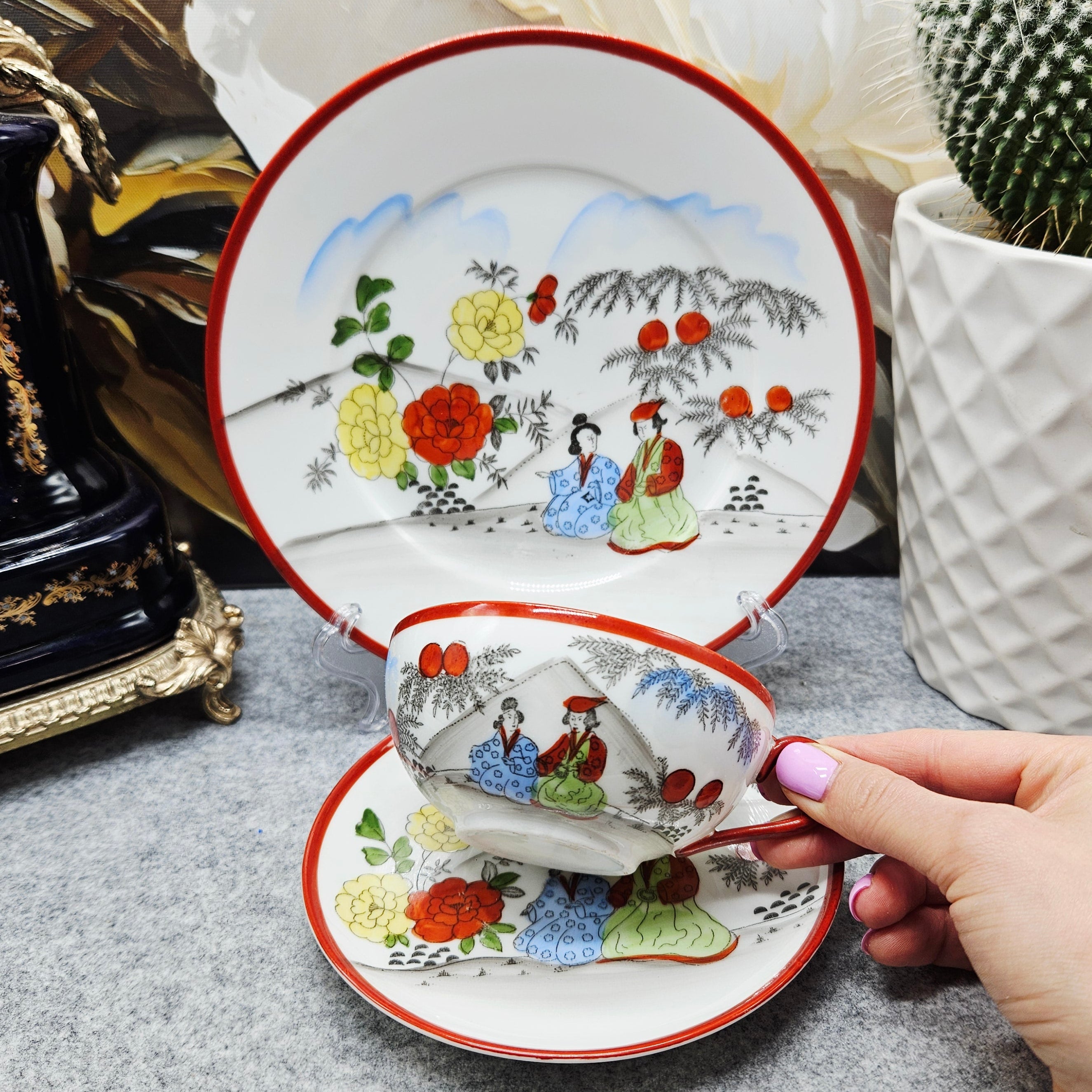 Išskirtinio grožio japoniškas porceliano kompeltukas, sudarytas iš puodelio, lėkštutės ir desertinės lėkštės. Kiekvienas elementas dekoruotas subtiliomis rankų darbo scenomis, vaizduojančiomis tradicinėmis kimono aprengtas figūras sode tarp žydinčių gėlių ir prinokusių vaisių.