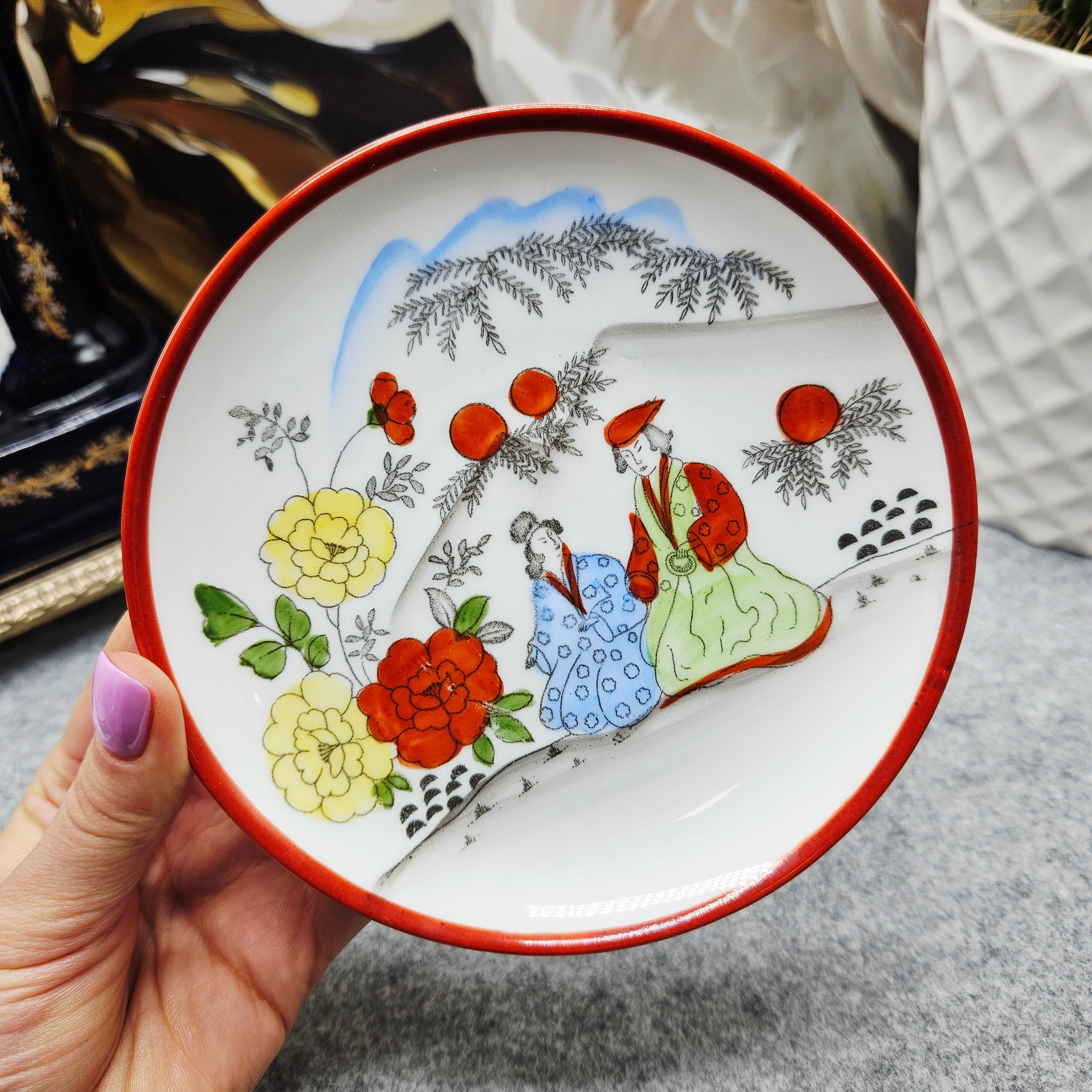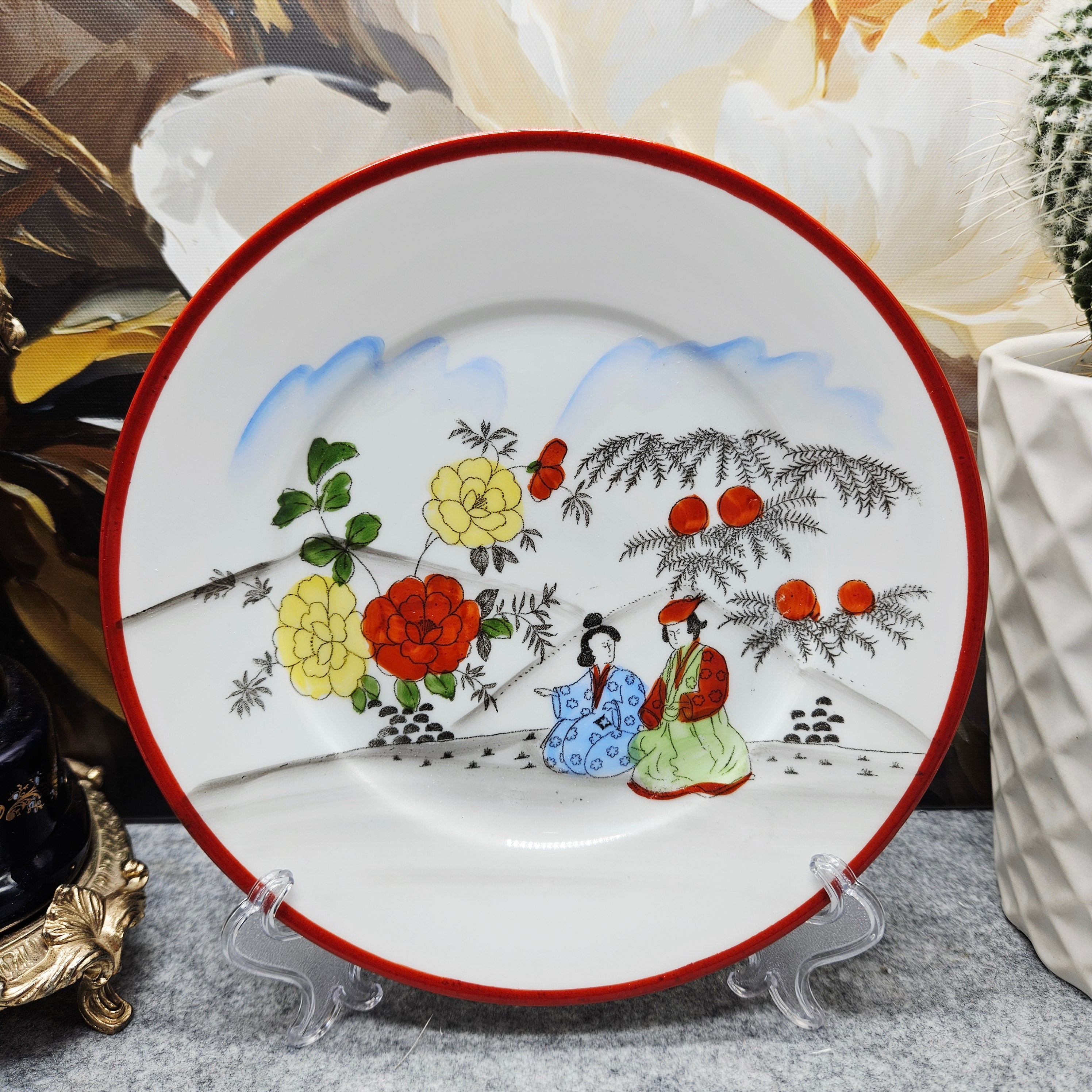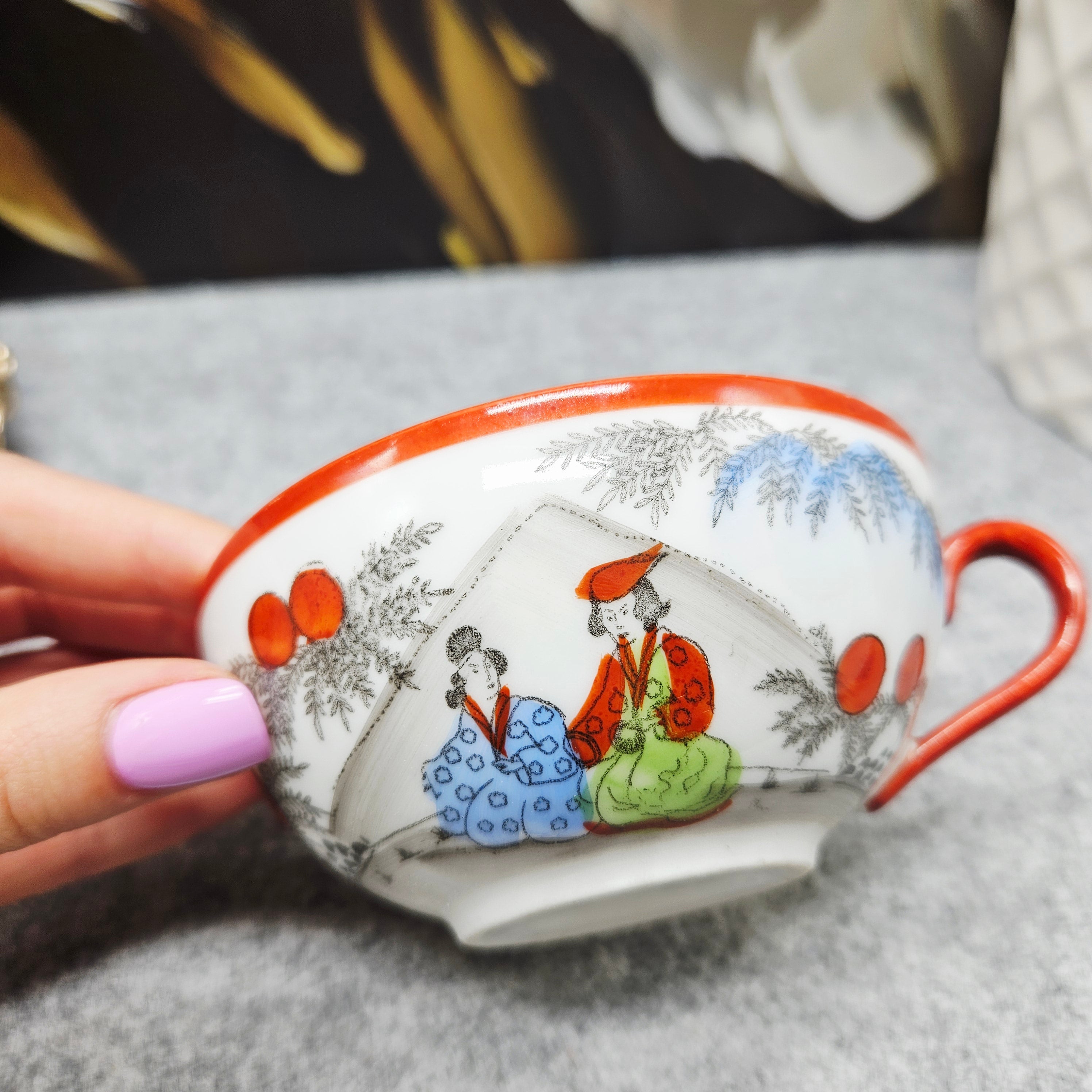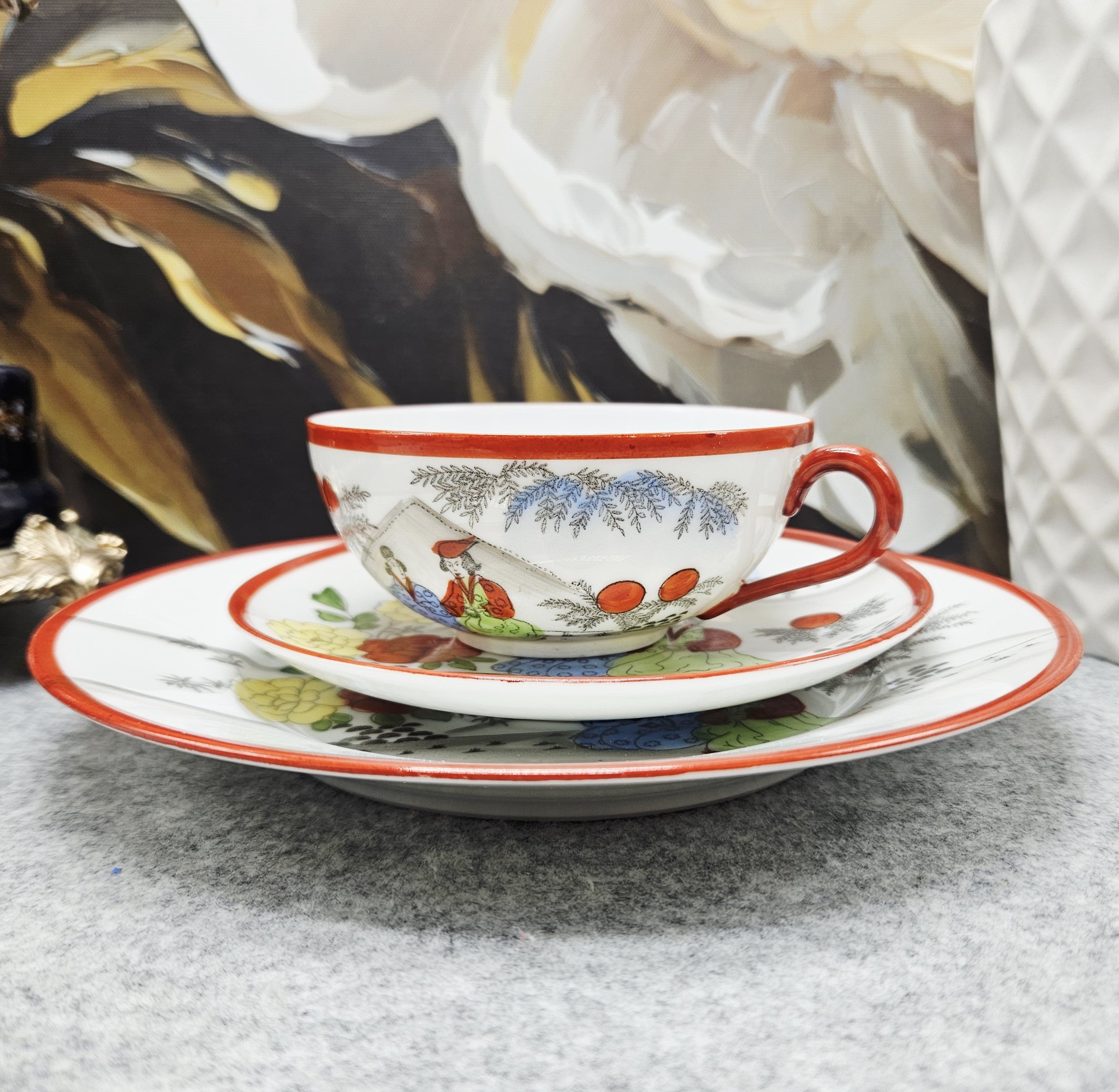 Išskirtinio grožio japoniškas porceliano kompeltukas, sudarytas iš puodelio, lėkštutės ir desertinės lėkštės. Kiekvienas elementas dekoruotas subtiliomis rankų darbo scenomis, vaizduojančiomis tradicinėmis kimono aprengtas figūras sode tarp žydinčių gėlių ir prinokusių vaisių.