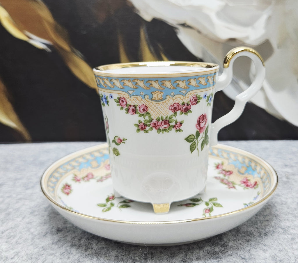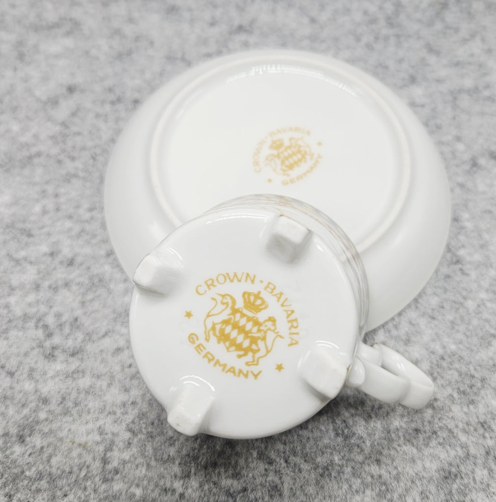 Išskirtinio grožio „Crown Bavaria“ porcelianinis puodelis su lėkštute – tikras klasikinės vokiškos elegancijos pavyzdys. Šis duetas puoštas romantiška gėlių kompozicija su įvairiomis gėlėmis ir auksiniu ornamentu. Viršutinę kraštinę juosia dangiškai mėlynas fonas su paauksuotais barokiniais motyvais, o auksu dekoruota rankenėlė ir keturios puodelio kojelės suteikia prabangos įspūdį.
