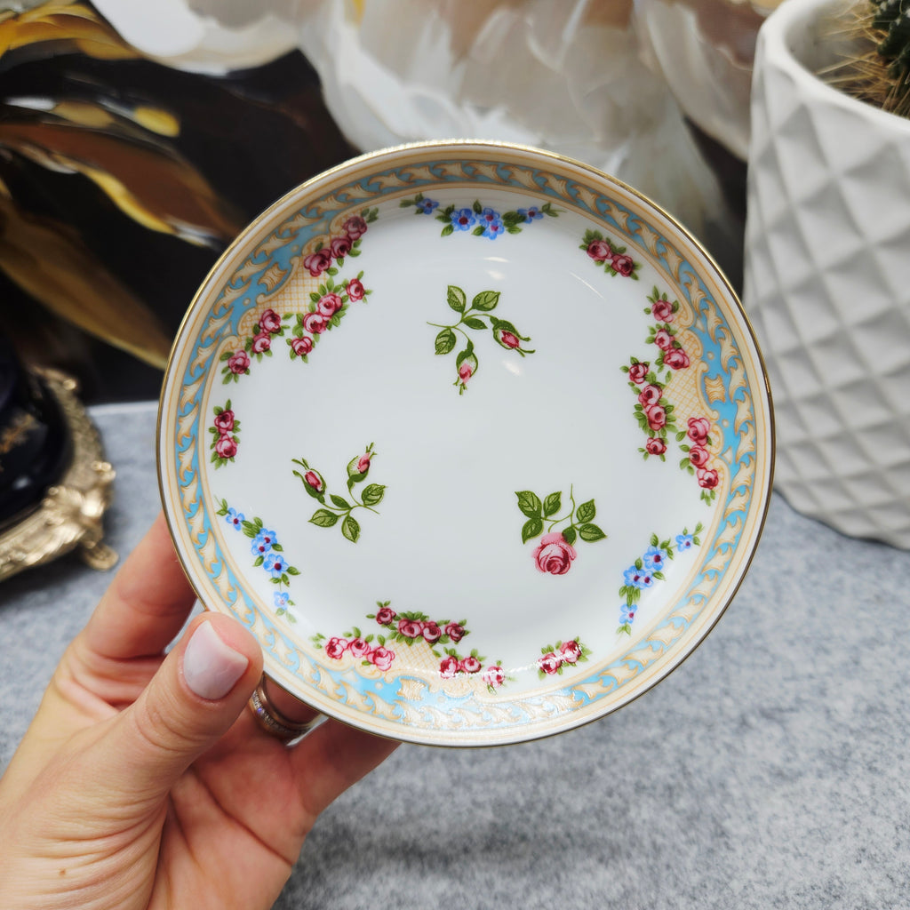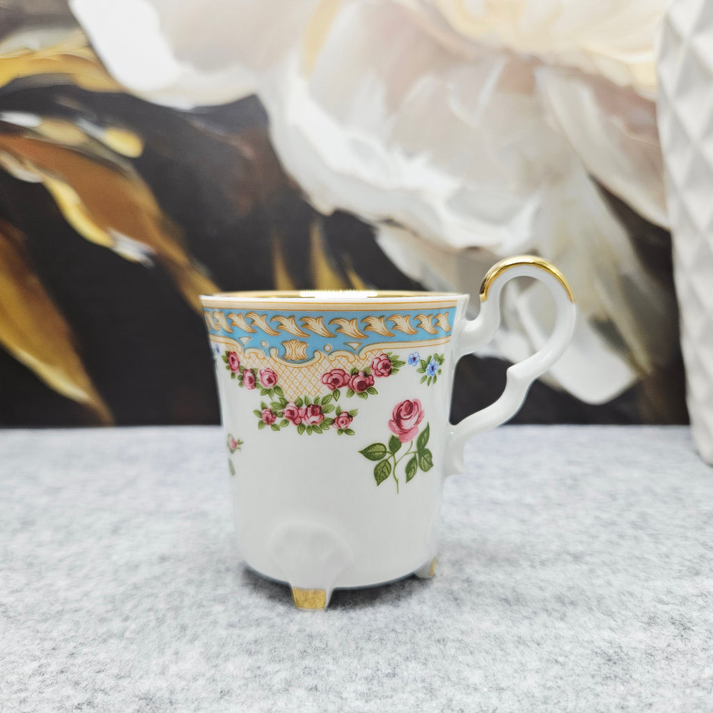Dekoras: Rožės, mėlyni gėlių akcentai, paauksuota rankenėlė ir kojelės, mėlynas ornamentinis kraštas