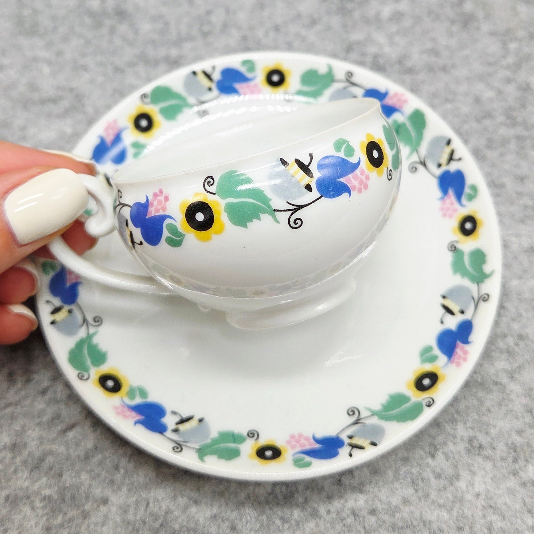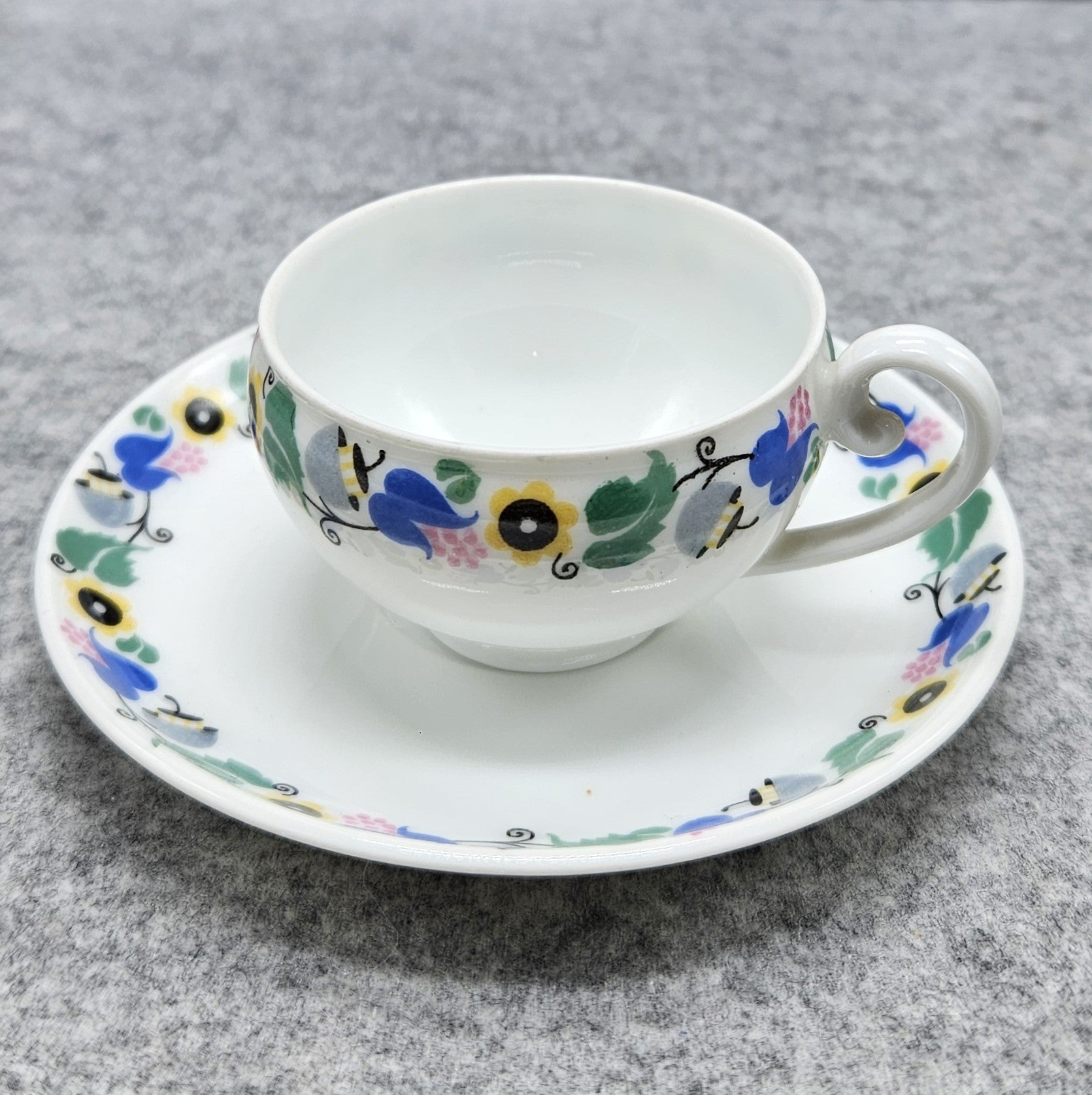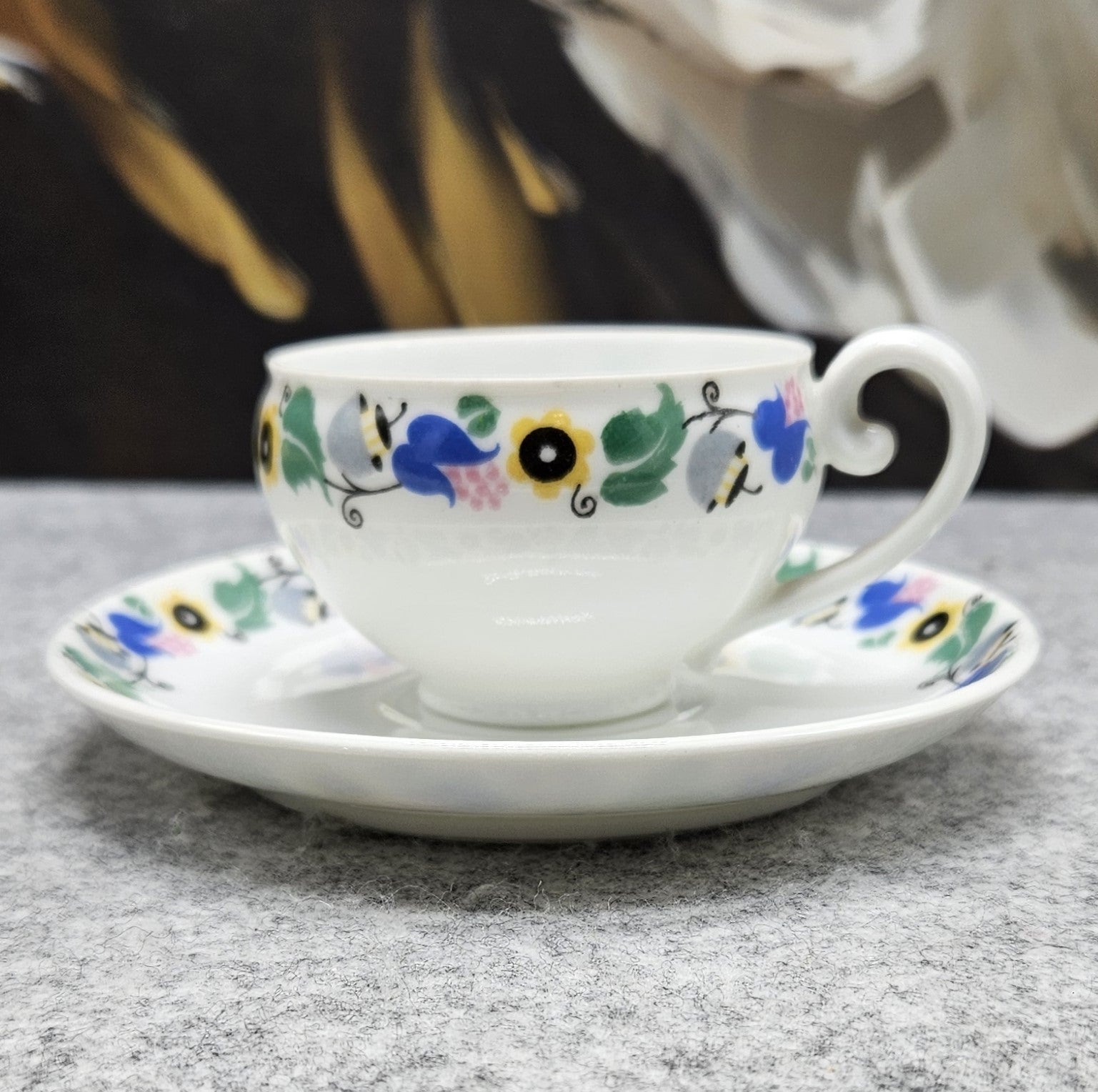 Išskirtinio dizaino „Pirkenhammer“ porceliano puodelis su lėkštute, kurio ornamentas subtiliai derina juodą, geltoną, mėlyną, pilką, žalią ir rožinę spalvas. Šie atspalviai suteikia dirbiniui modernumo pojūtį.