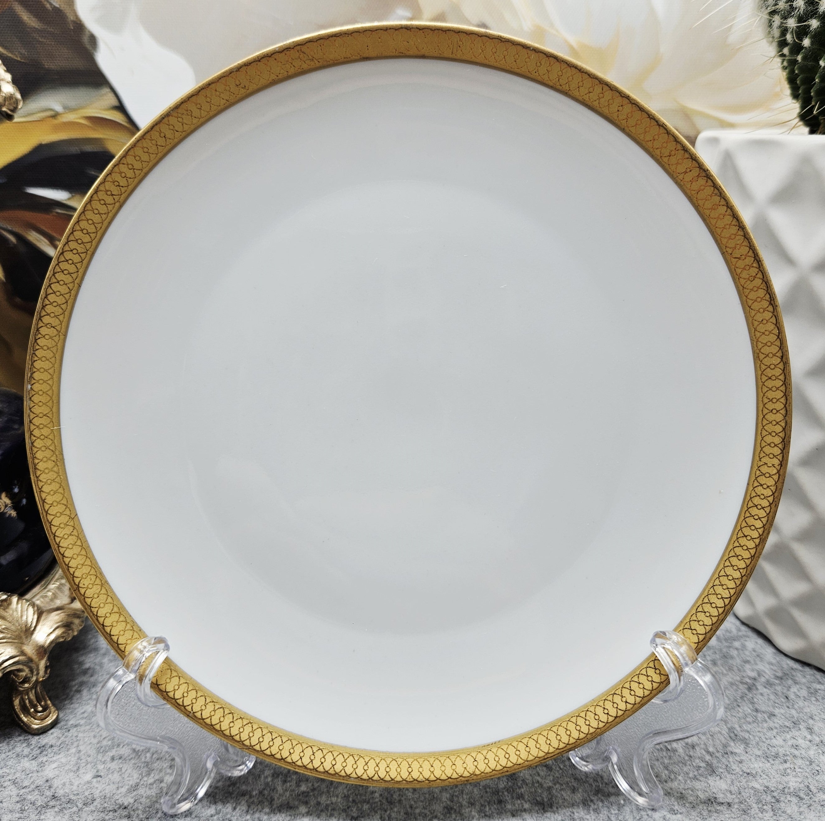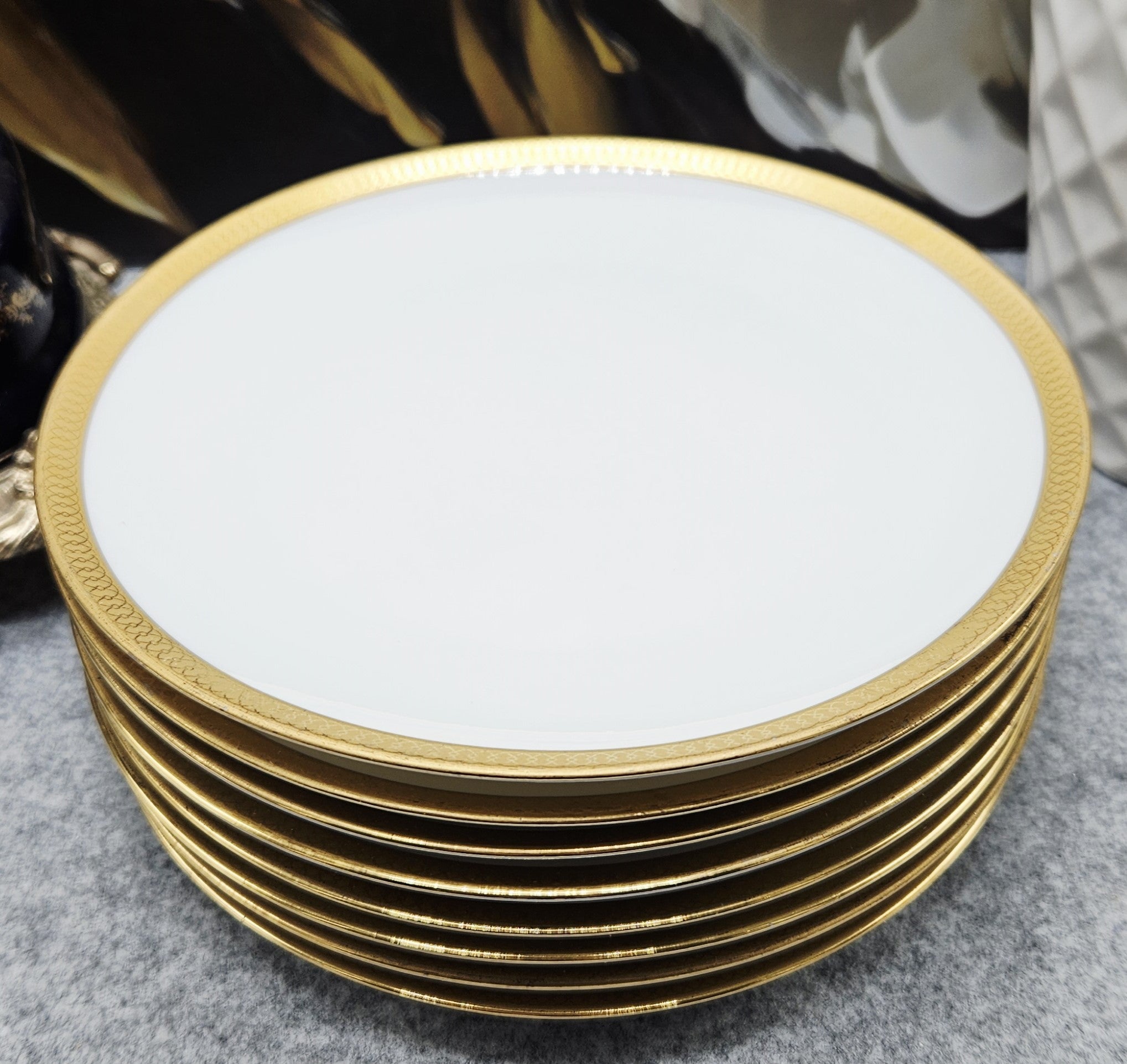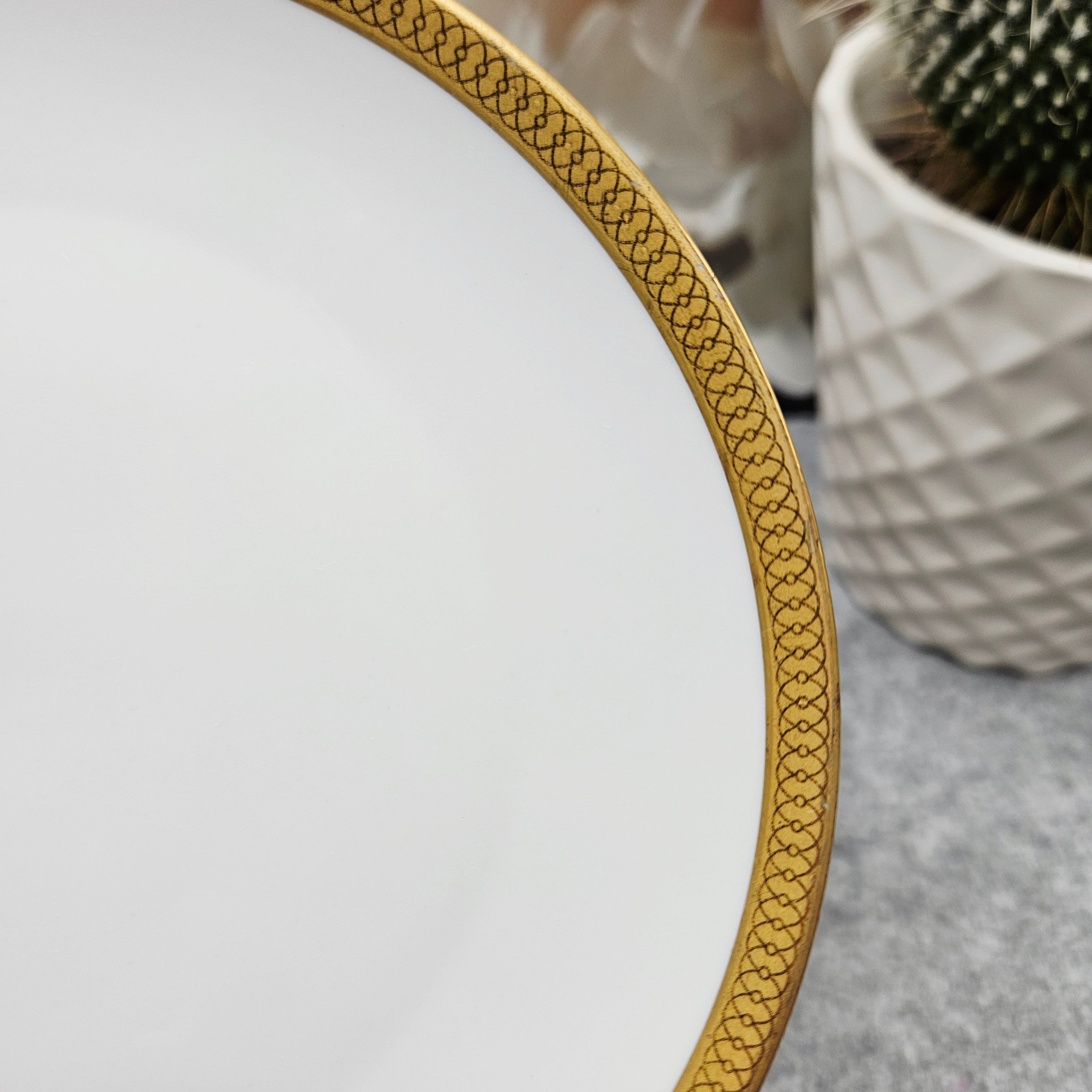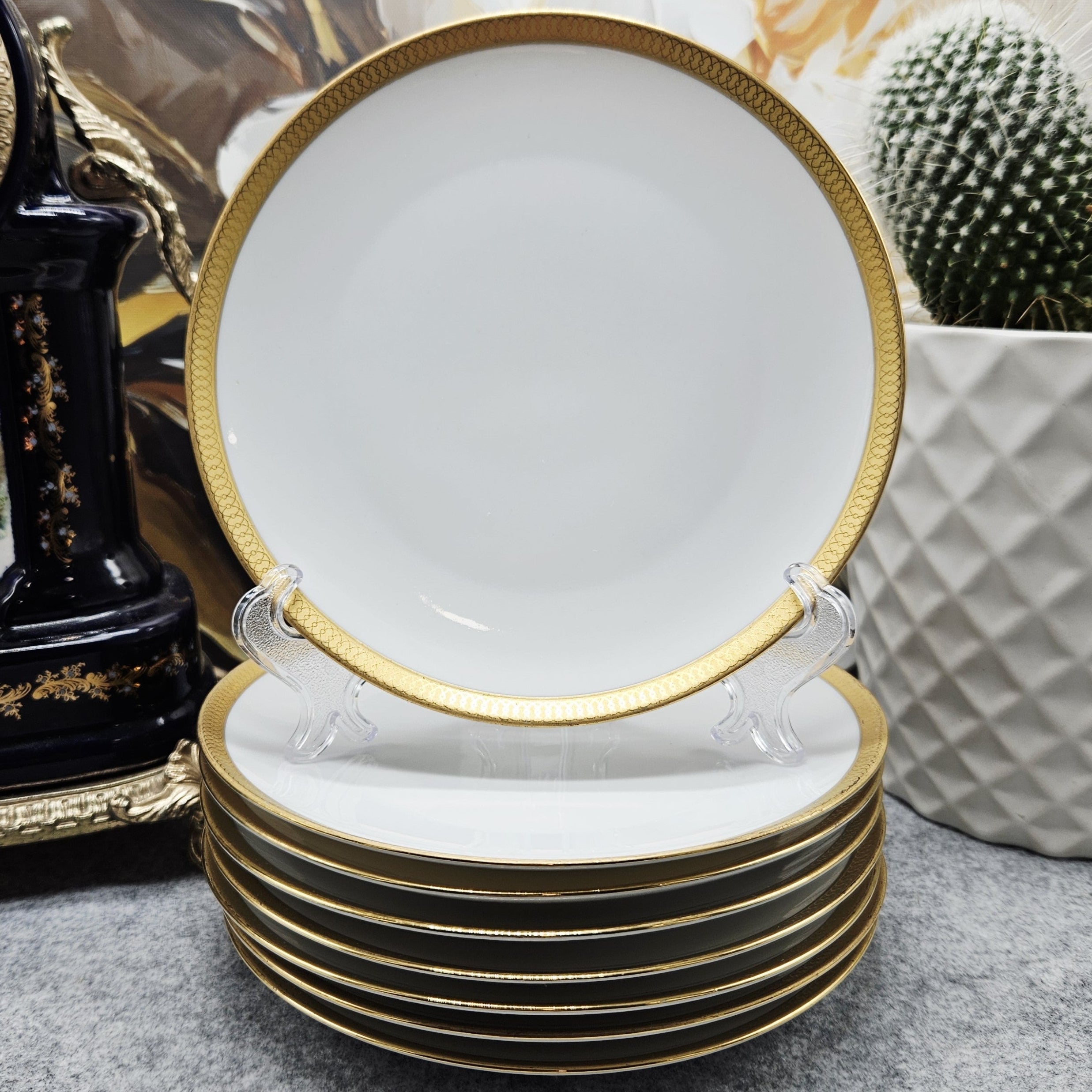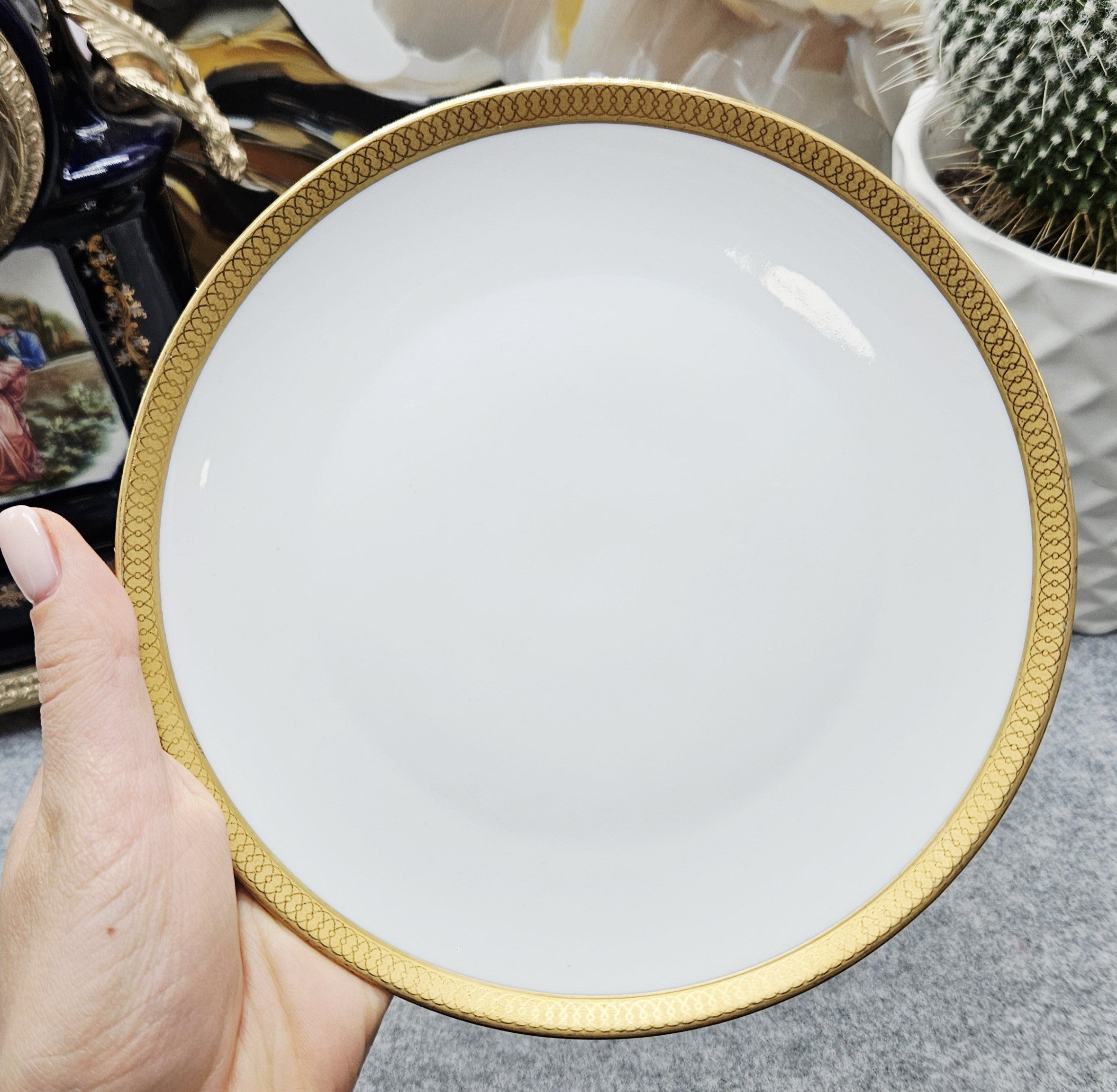 Nuostabios "Seltmann Weiden Bavaria" porceliano desertinės lėkštutės, dekuoruotos auksinių ornamentų juostele.