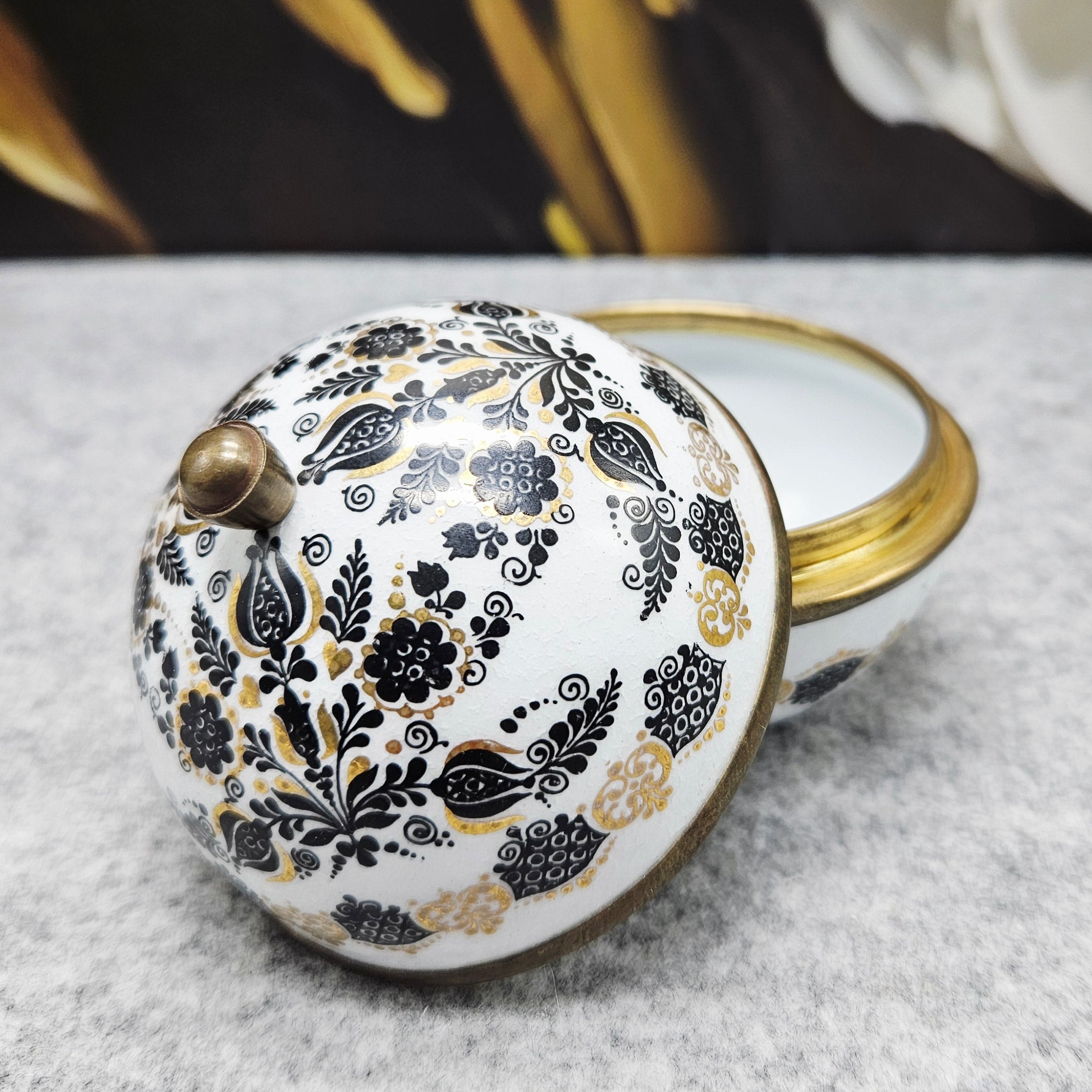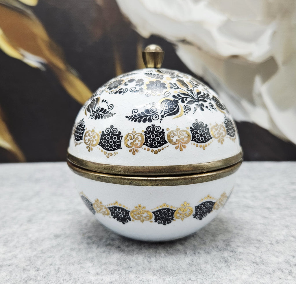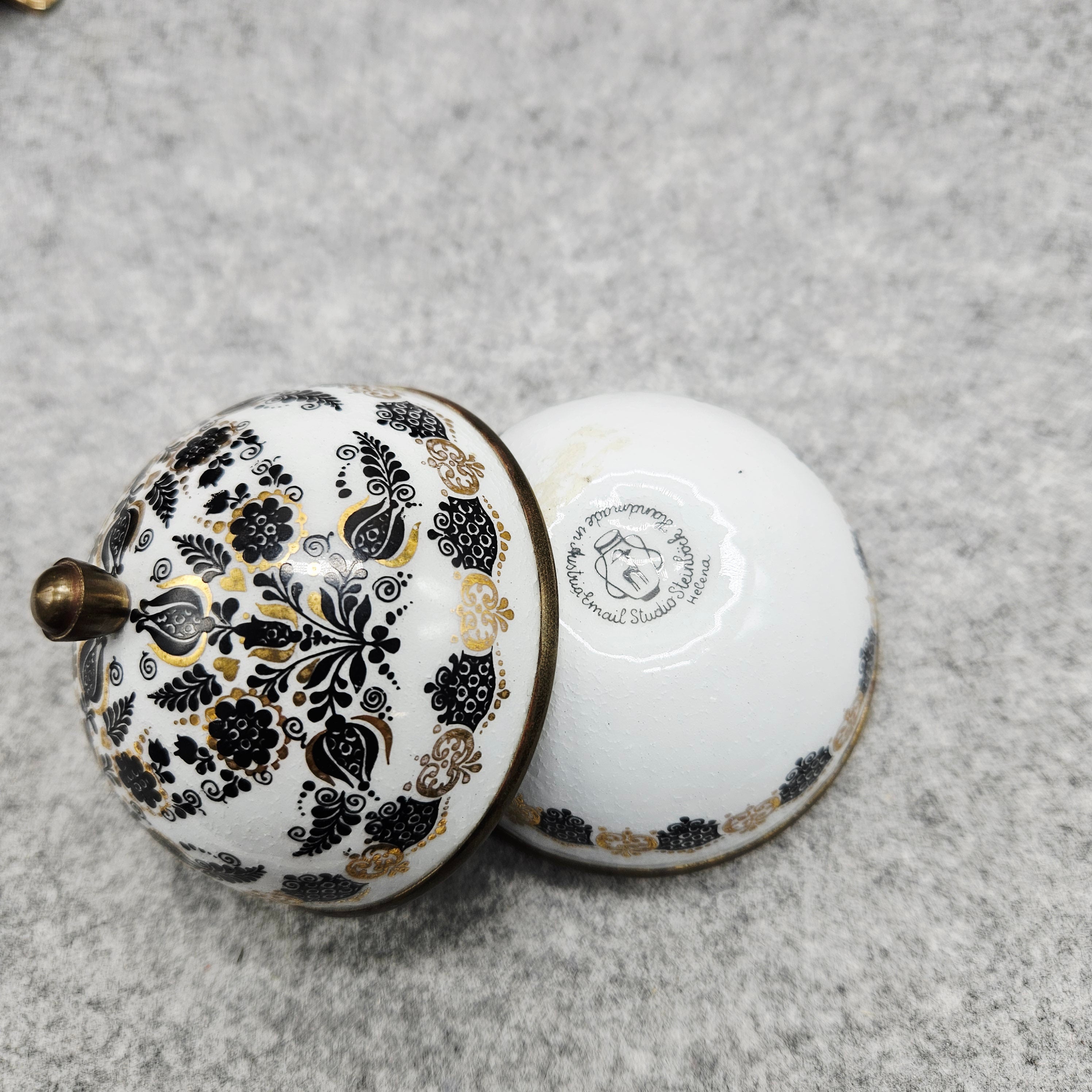 Išskirtinio dizaino, rankų darbo, emalinė „Original Studio Steinböck – Helena dėžutė“ . Apvali, kupolo formos dėžutė dekoruota subtiliais juodos ir auksinės spalvos gėlių ir ornamentiniais raštais.