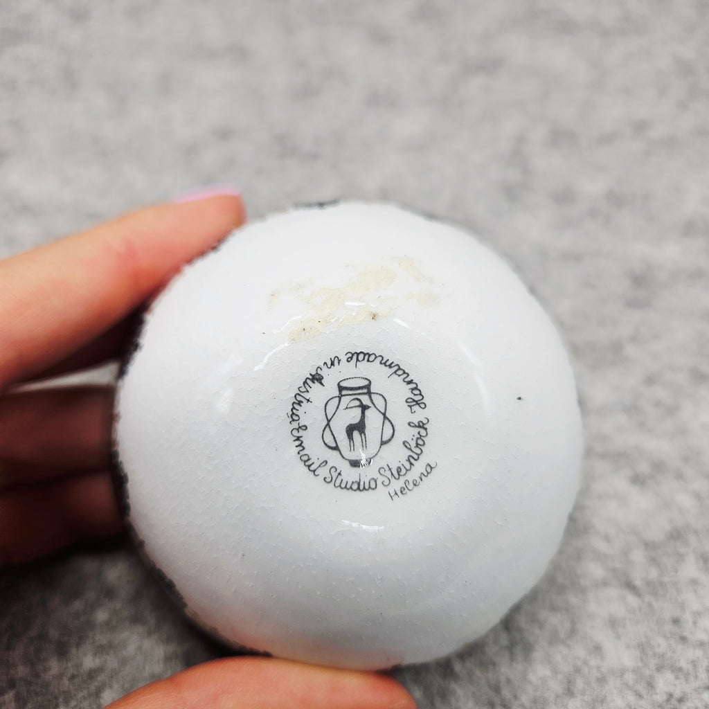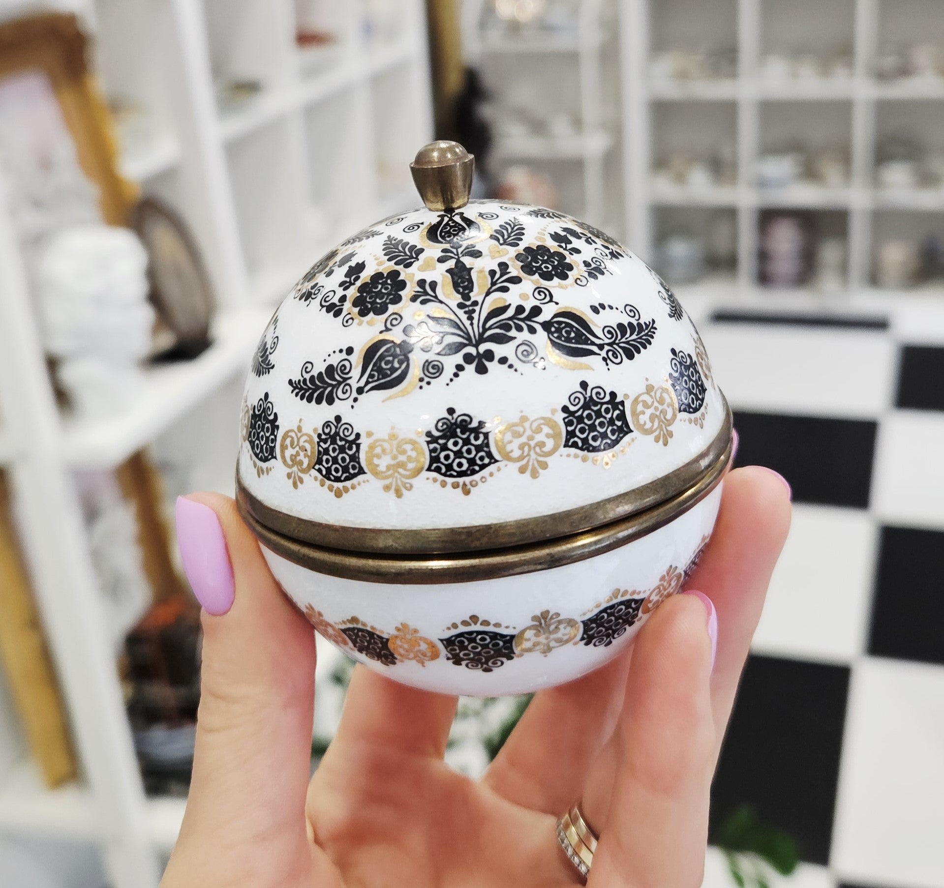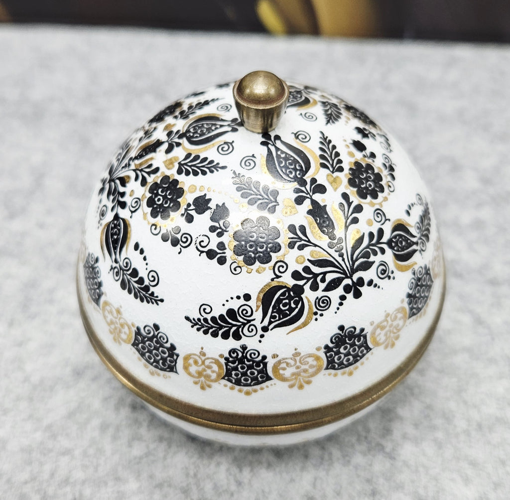Išskirtinio dizaino, rankų darbo, emalinė „Original Studio Steinböck – Helena dėžutė“ . Apvali, kupolo formos dėžutė dekoruota subtiliais juodos ir auksinės spalvos gėlių ir ornamentiniais raštais.