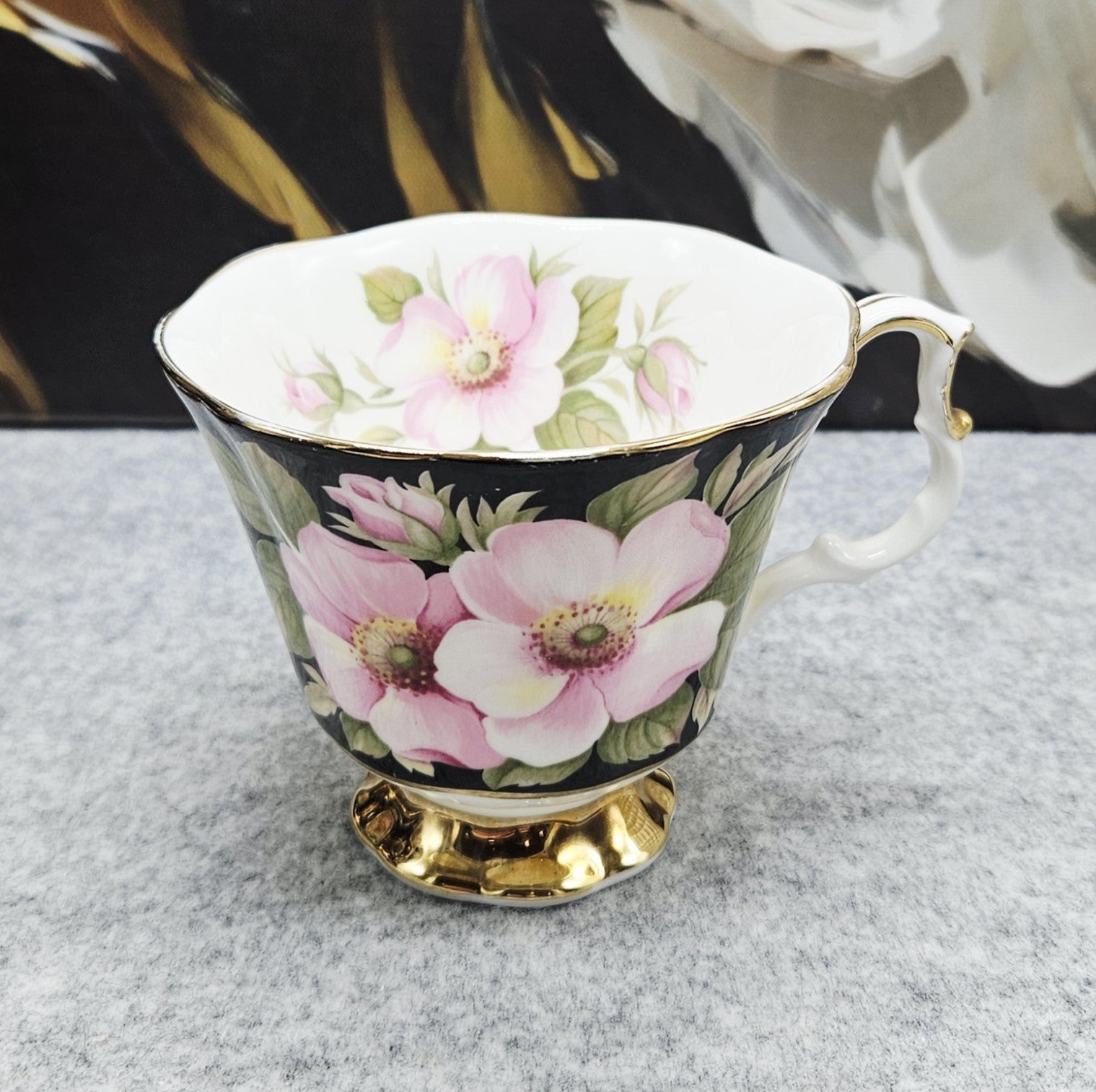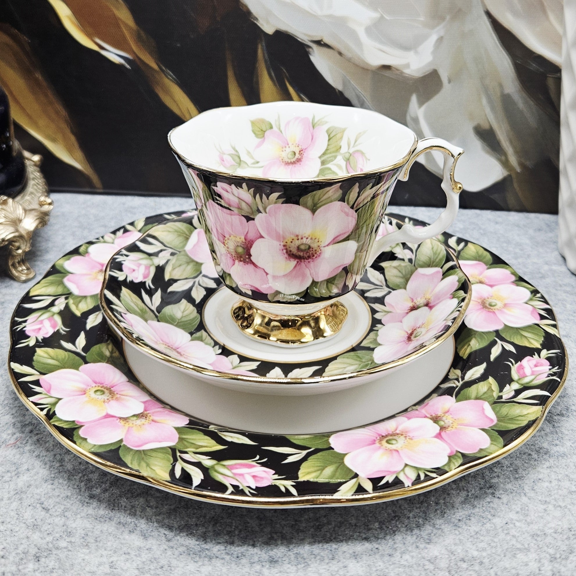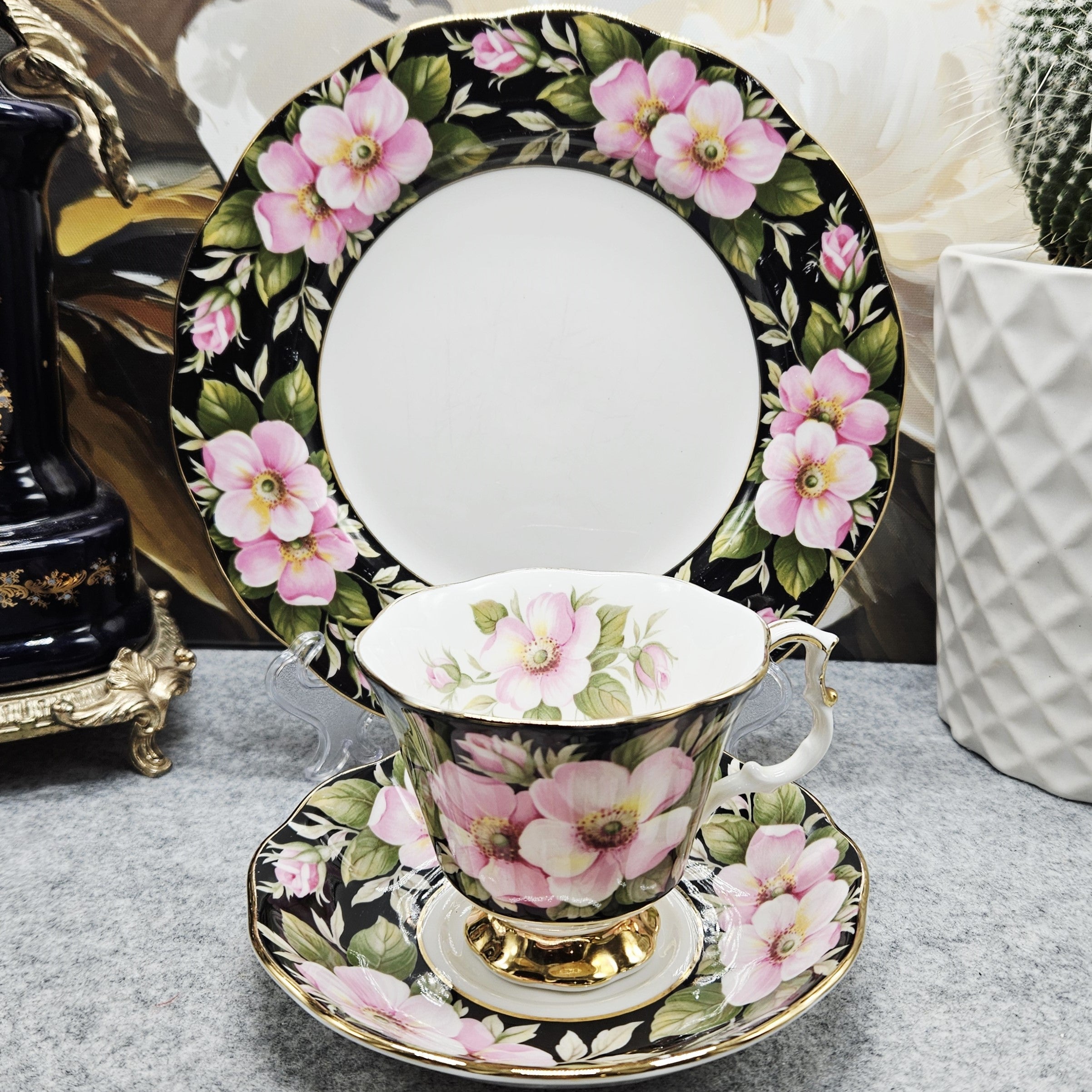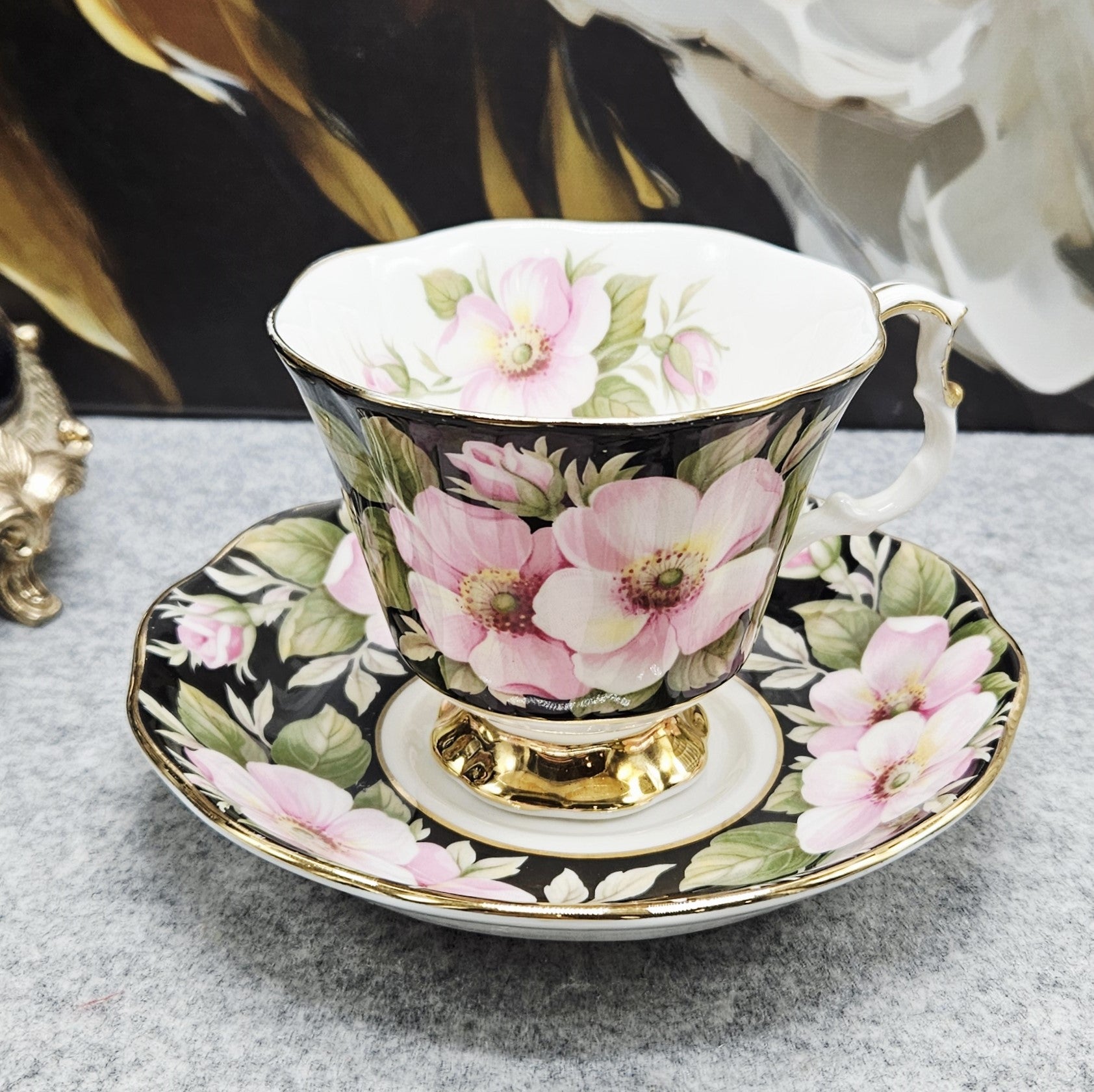 Komplektas dekoruotas sodriais žiedų motyvais tamsiame fone, subtiliai paryškintais auksiniais akcentais. Grakšti puodelio forma, auksu dengta kojelė ir rankenėlė suteikia rinkiniui prabangos pojūtį. Tai išskirtinis, dekoratyvus komplektas, puikiai tinkantis tiek kolekcijai, tiek iškilmingam stalo serviravimui.