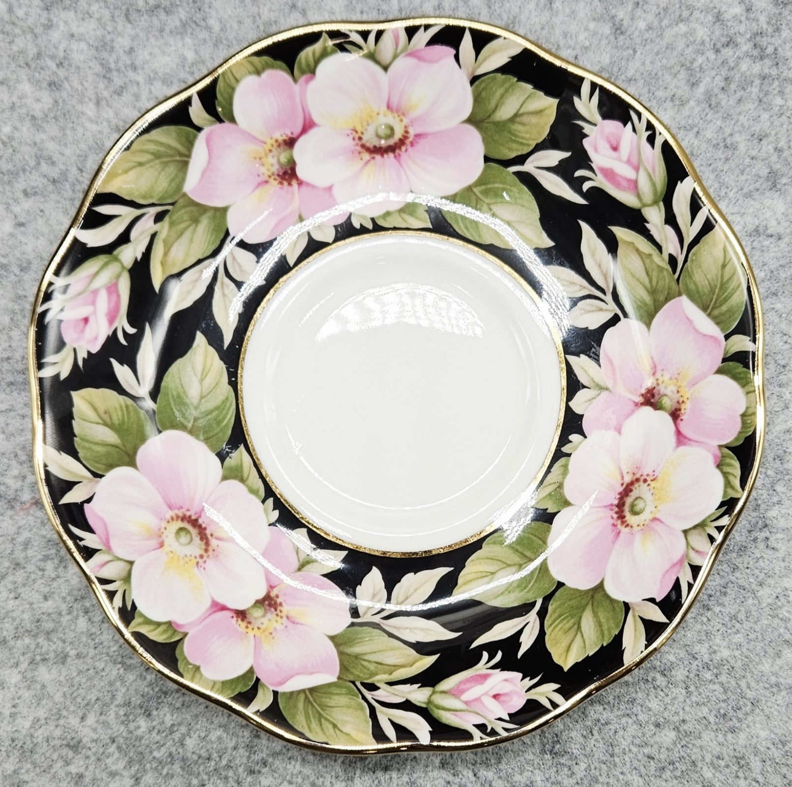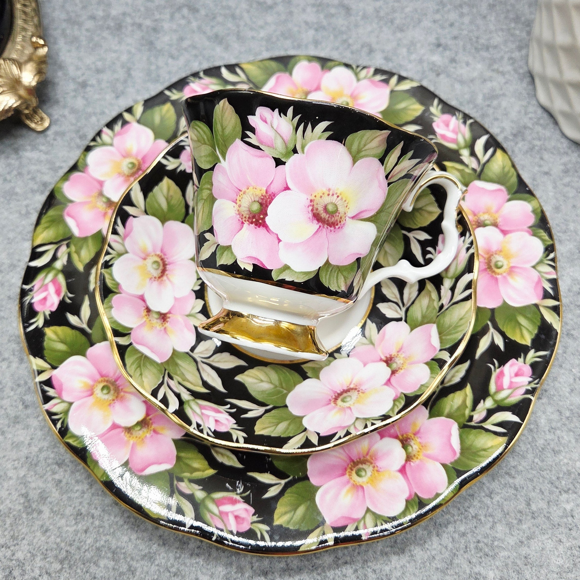 Elegantiškas „ROYAL ALBERT“ „Alberta rose“ porceliano kavos/arbatos TRIO (1 puodelis + 2 lėkštutės). (~190 ml)