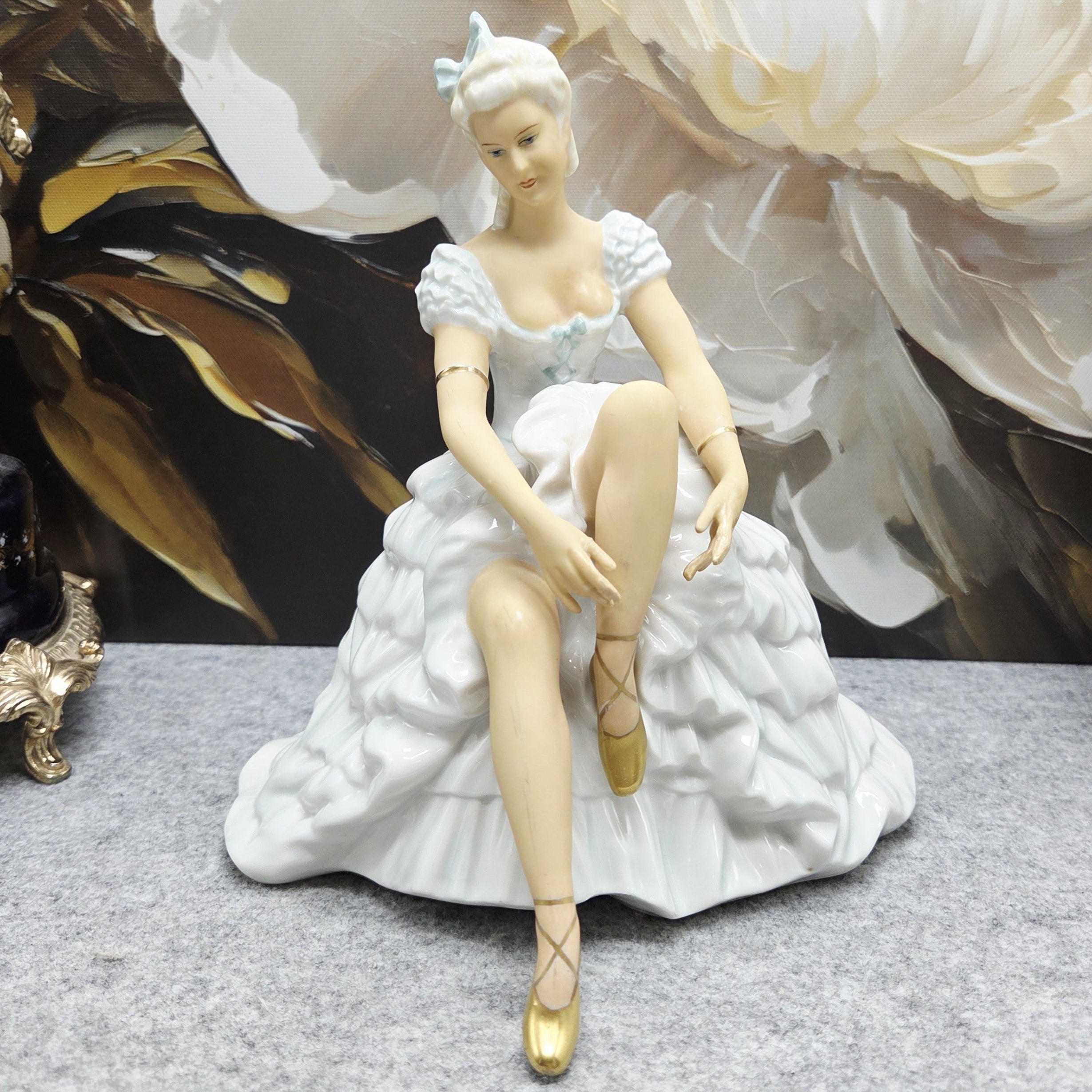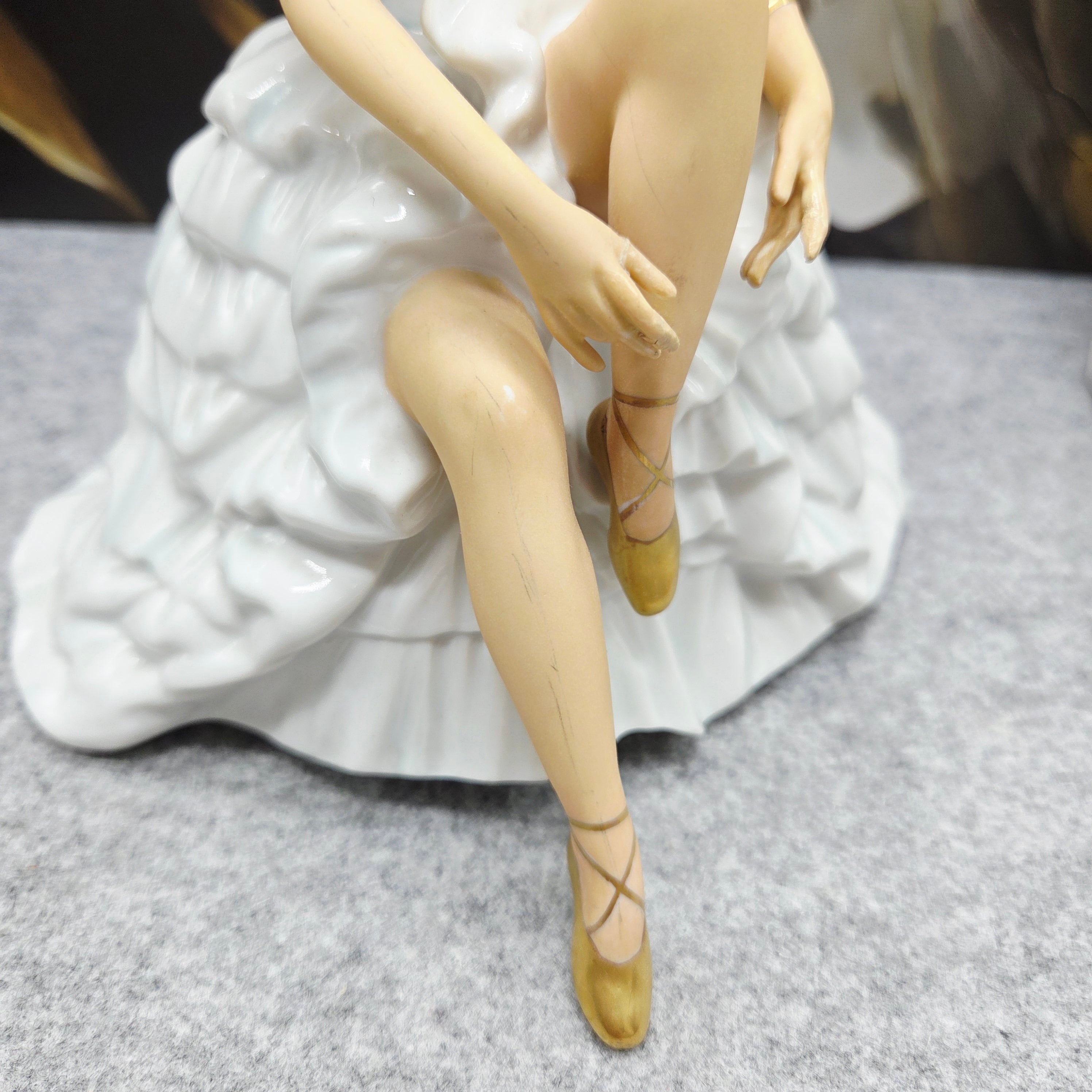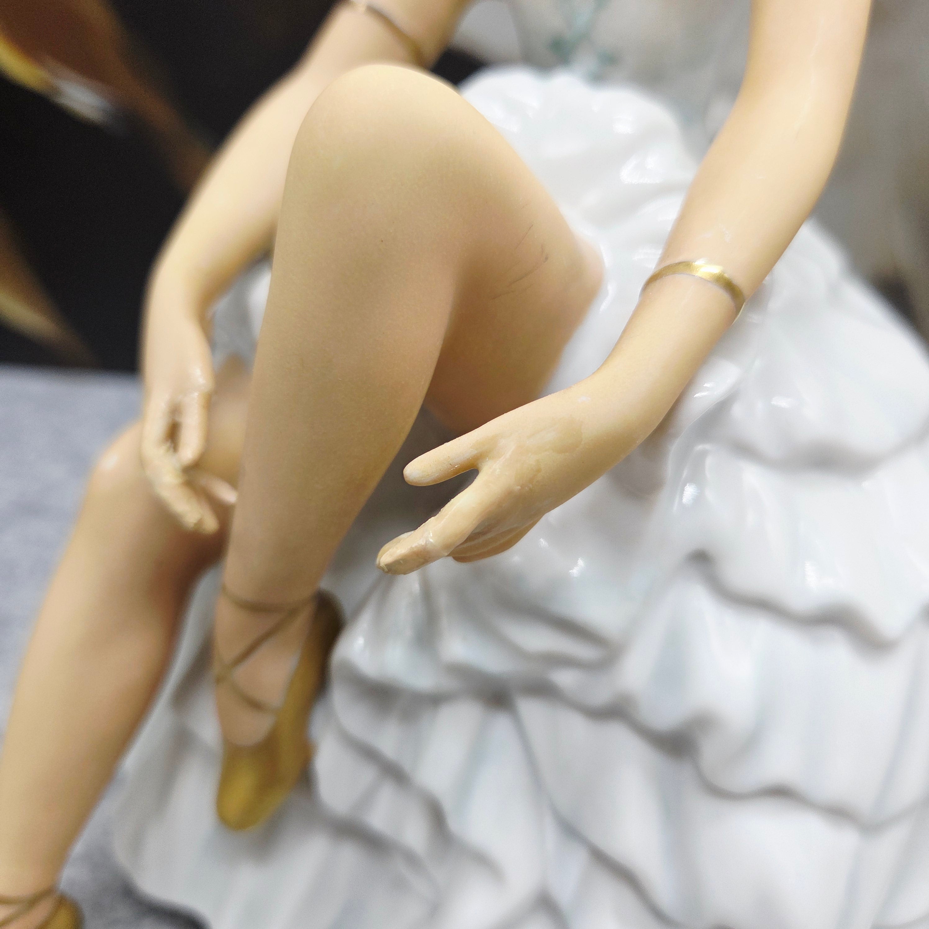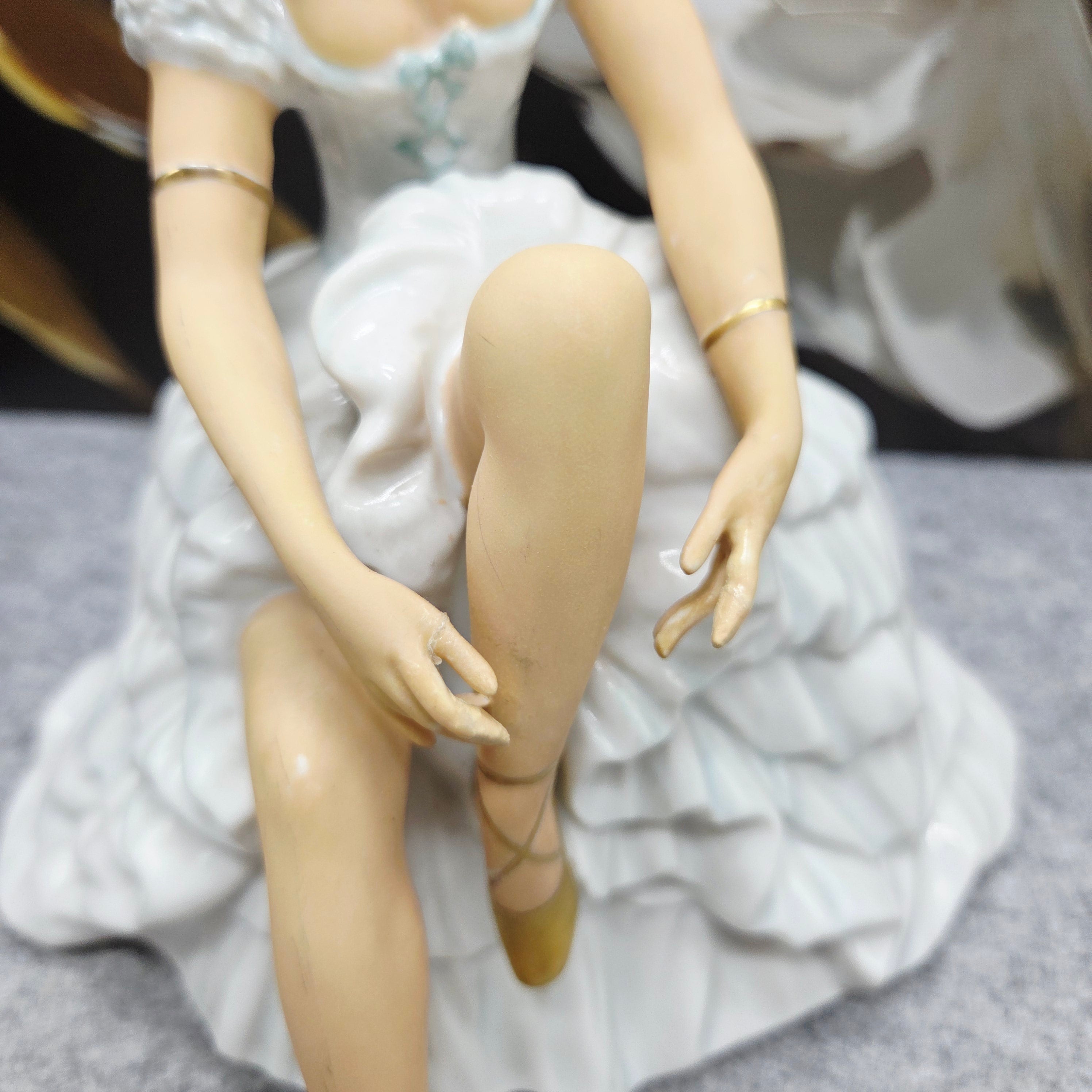 Subtili ir itin moteriška porceliano statulėlė, vaizduojanti baleriną akimirką prieš šokį – ji sėdi lengvai pakėlusi koją, tarsi ruošdamasi užsirišti baleto batelį. Figūra pasižymi švelnia pastelinių tonų koloristika: suknelė su banguotomis, reljefiškai modeliuotomis klostėmis, subtiliai dekoruota auksinėmis detalėmis. Auksu dengti baleto bateliai ir apyrankės suteikia kompozicijai prabangos bei elegancijos pojūtį.