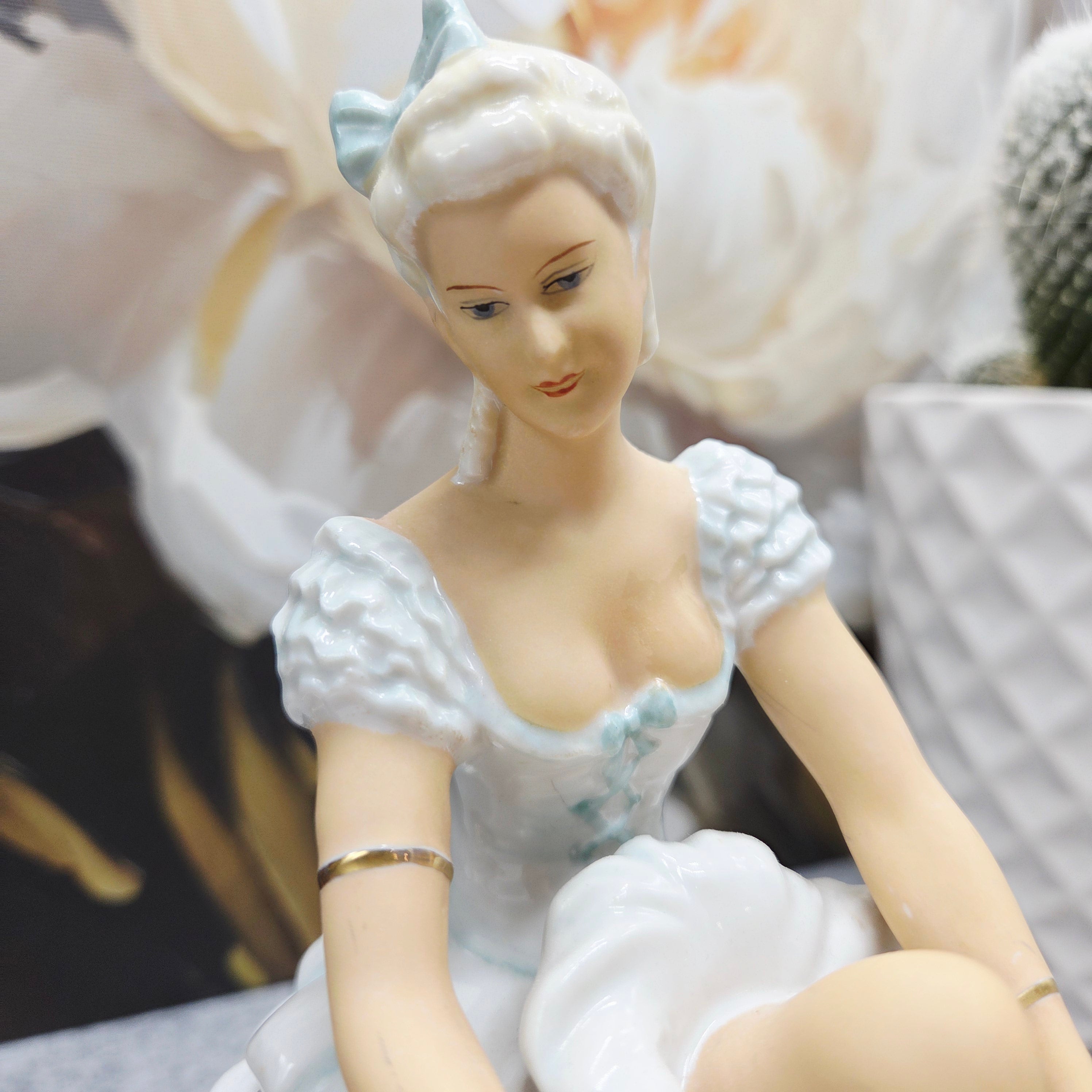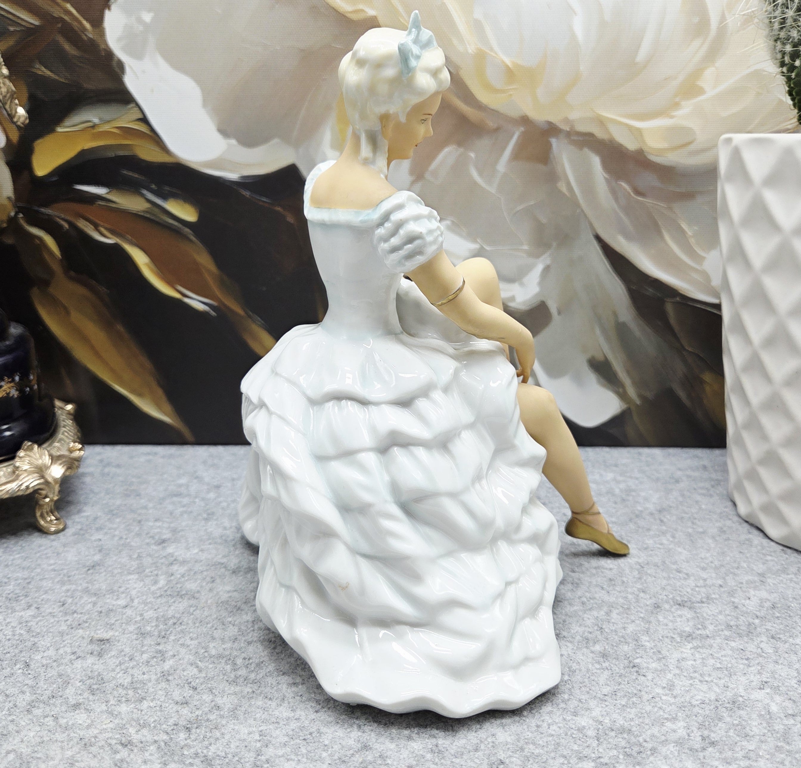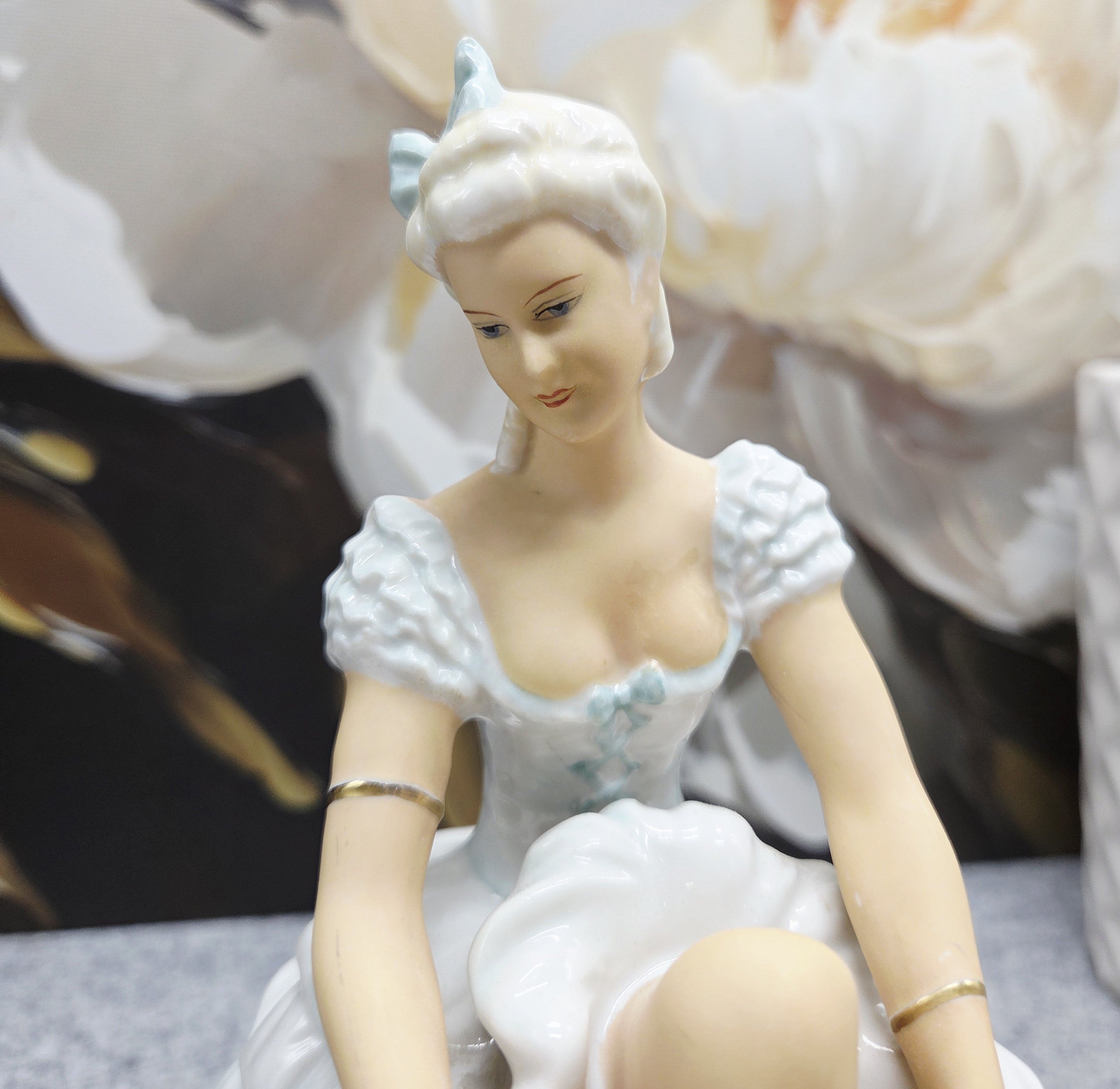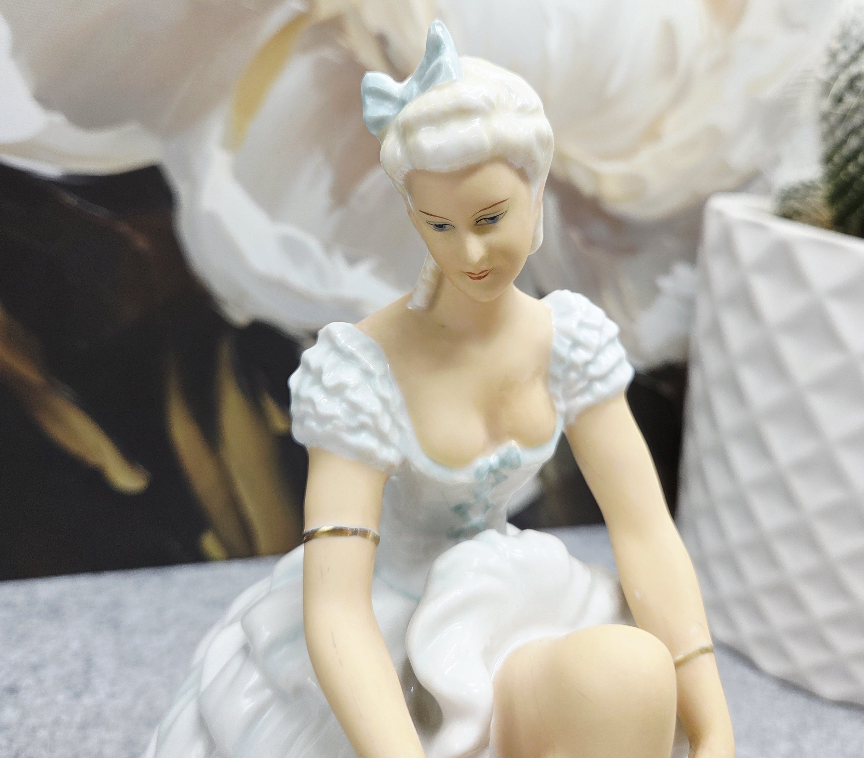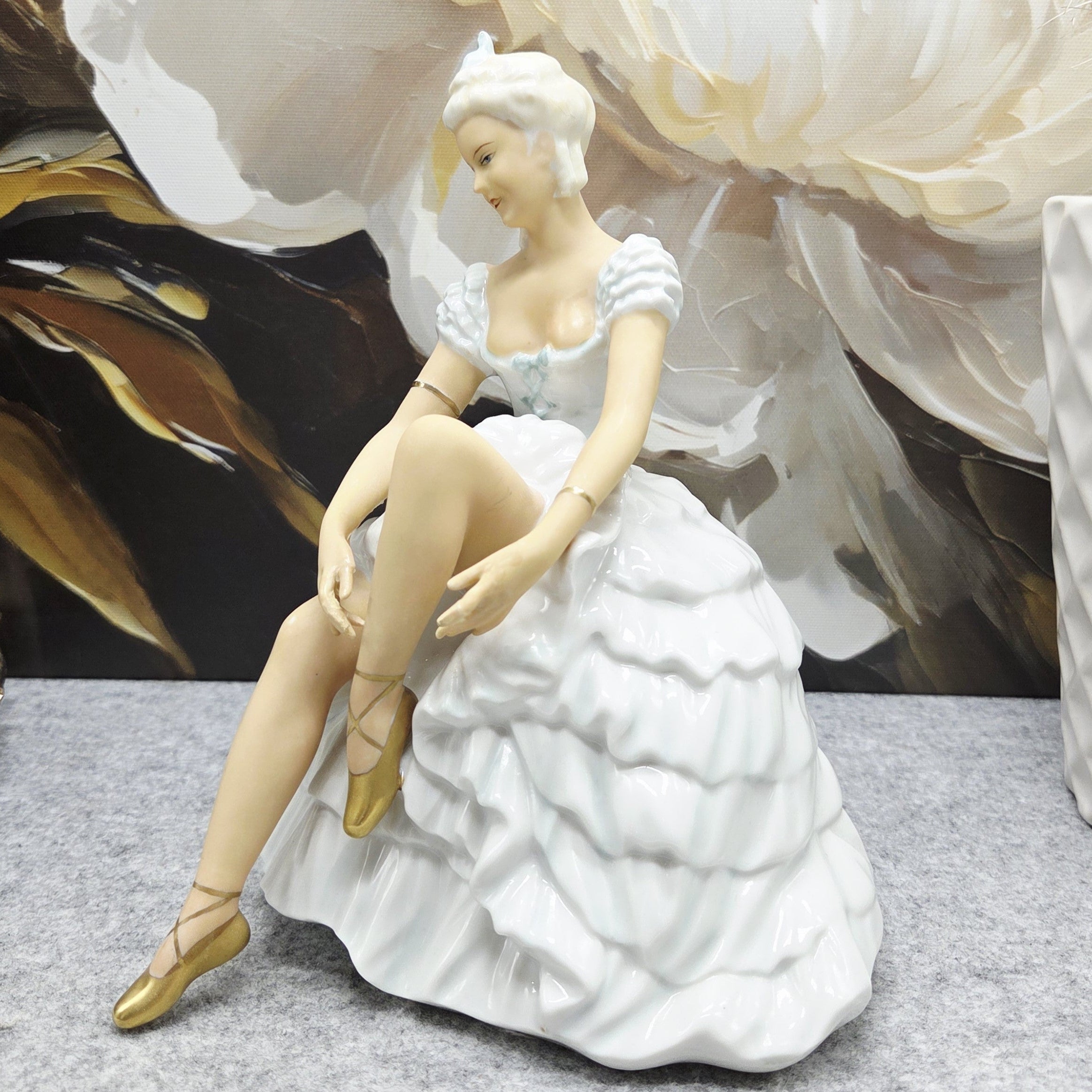 Subtili ir itin moteriška porceliano statulėlė, vaizduojanti baleriną akimirką prieš šokį – ji sėdi lengvai pakėlusi koją, tarsi ruošdamasi užsirišti baleto batelį. Figūra pasižymi švelnia pastelinių tonų koloristika: suknelė su banguotomis, reljefiškai modeliuotomis klostėmis, subtiliai dekoruota auksinėmis detalėmis. Auksu dengti baleto bateliai ir apyrankės suteikia kompozicijai prabangos bei elegancijos pojūtį.