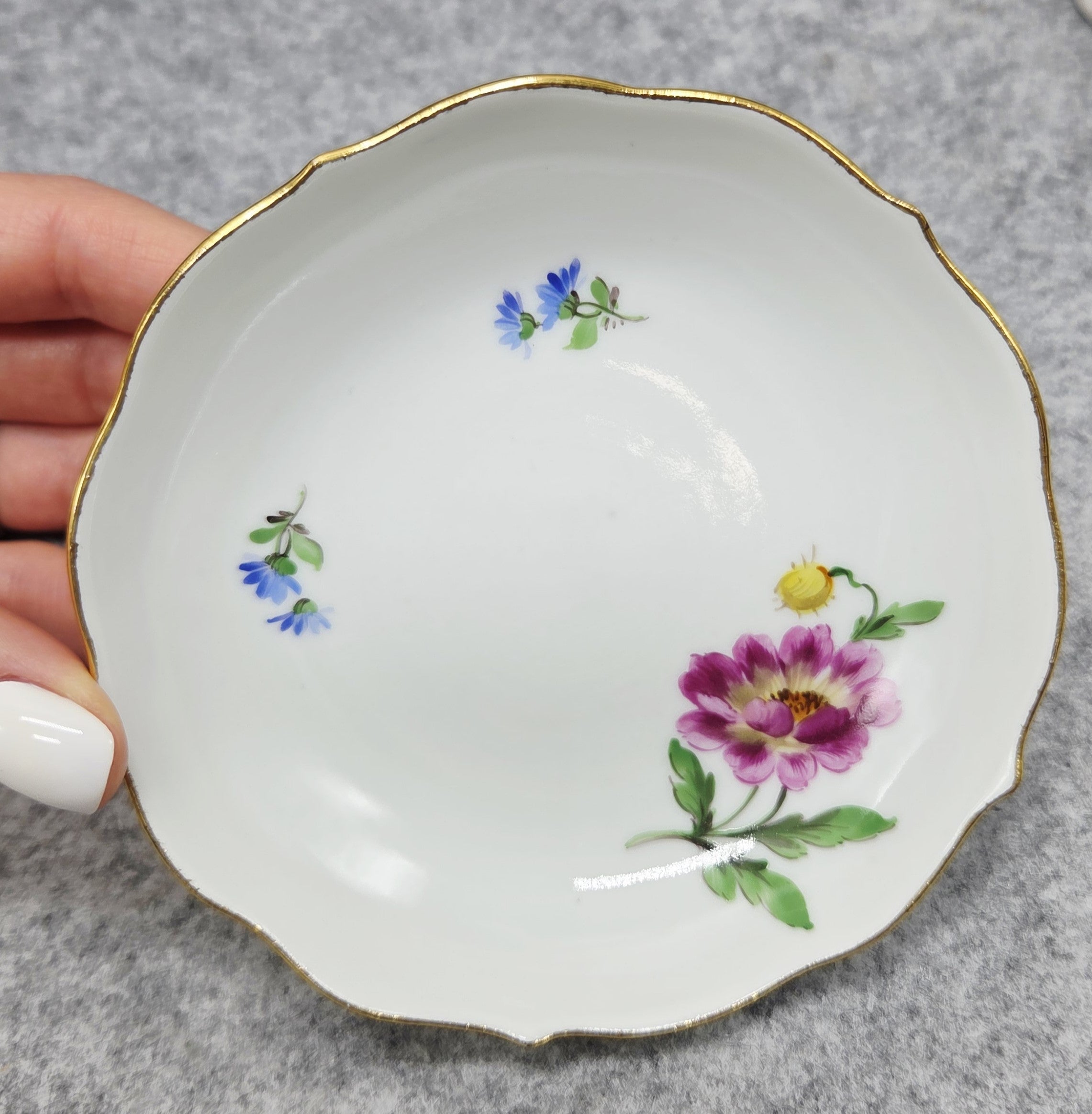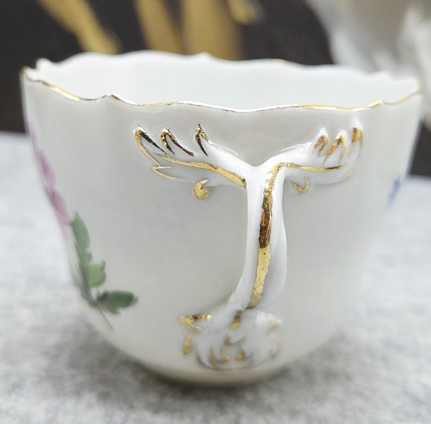 Puodelio forma – grakščiai banguota, su subtiliai išlenktomis sienelėmis ir elegantiška rankenėle. Auksu dekoruoti kraštai pabrėžia iškilmingą stilių ir klasikinį „Meissen“ manufaktūros charakterį. Lėkštutė atkartoja puodelio dizaino motyvus: ant jos taip pat matomos rankomis tapytos gėlės bei smulkus auksinis apvadas, kuris įrėmina visą kompoziciją.