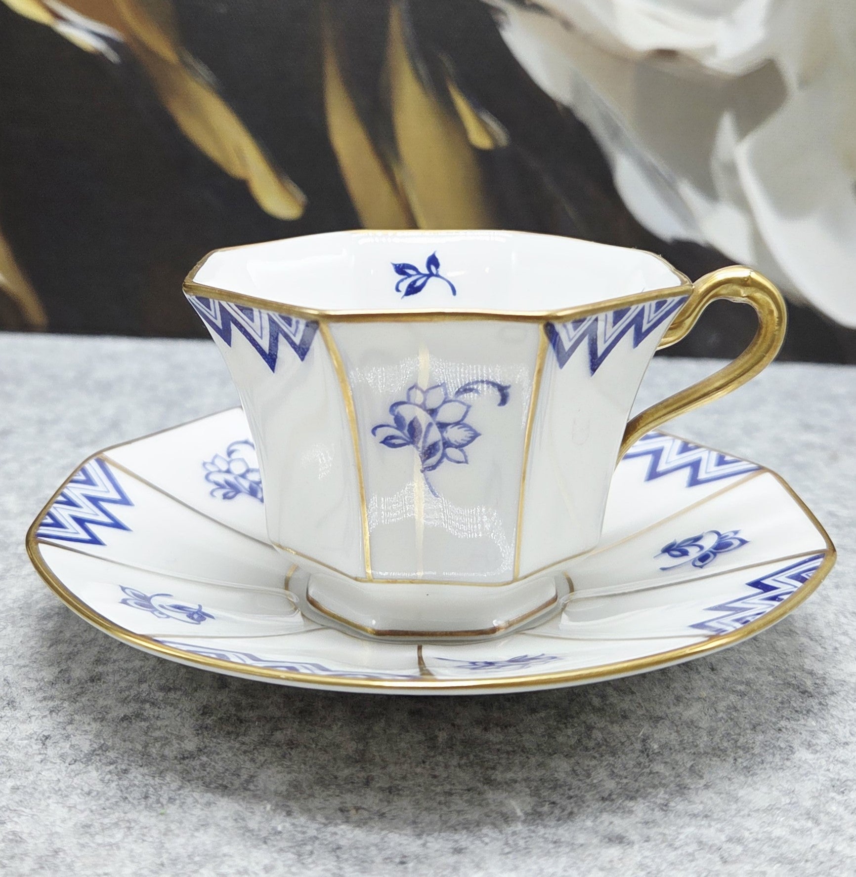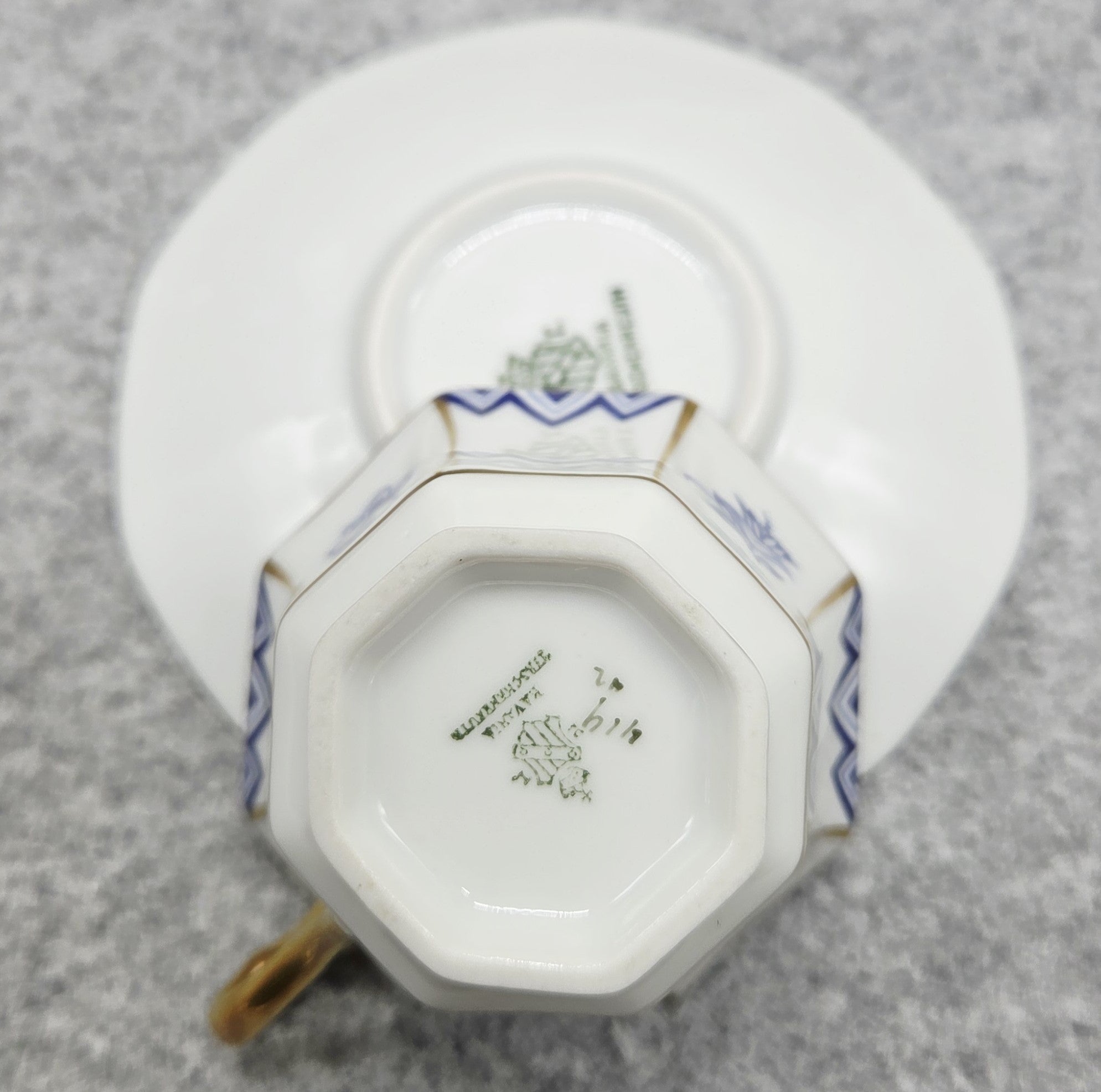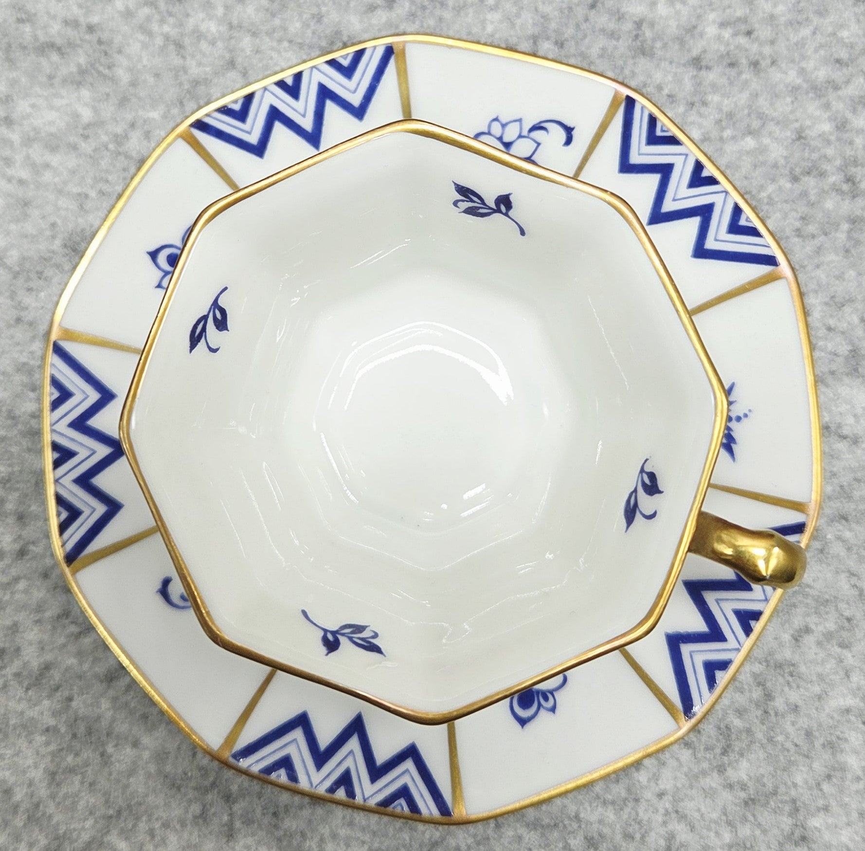 Puodelio kraštą tarsi įrėmina auksinės linijos, padalindamos dekoracijas į atskirus keturkampius, o pati puodelio forma sudaro taisyklingą aštunkampį. Lėkštutė atkartoja tuos pačius motyvus ir ornamentiką, harmoningai papildydama visą komplektą. Auksu dengta rankenėlė suteikia dar daugiau rafinuotumo ir išryškina meistrišką porceliano dirbinį.