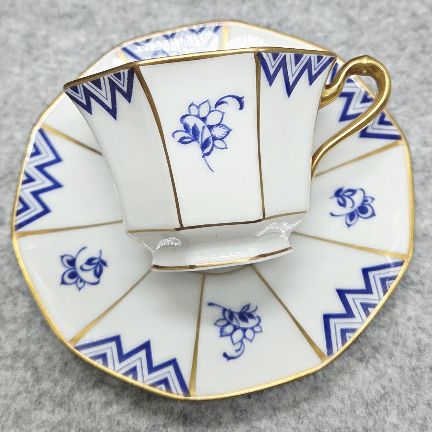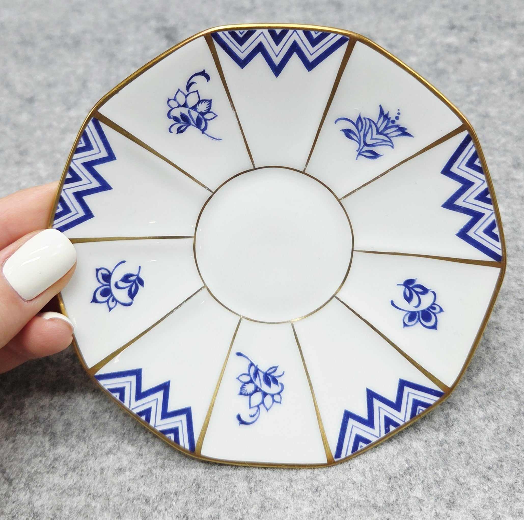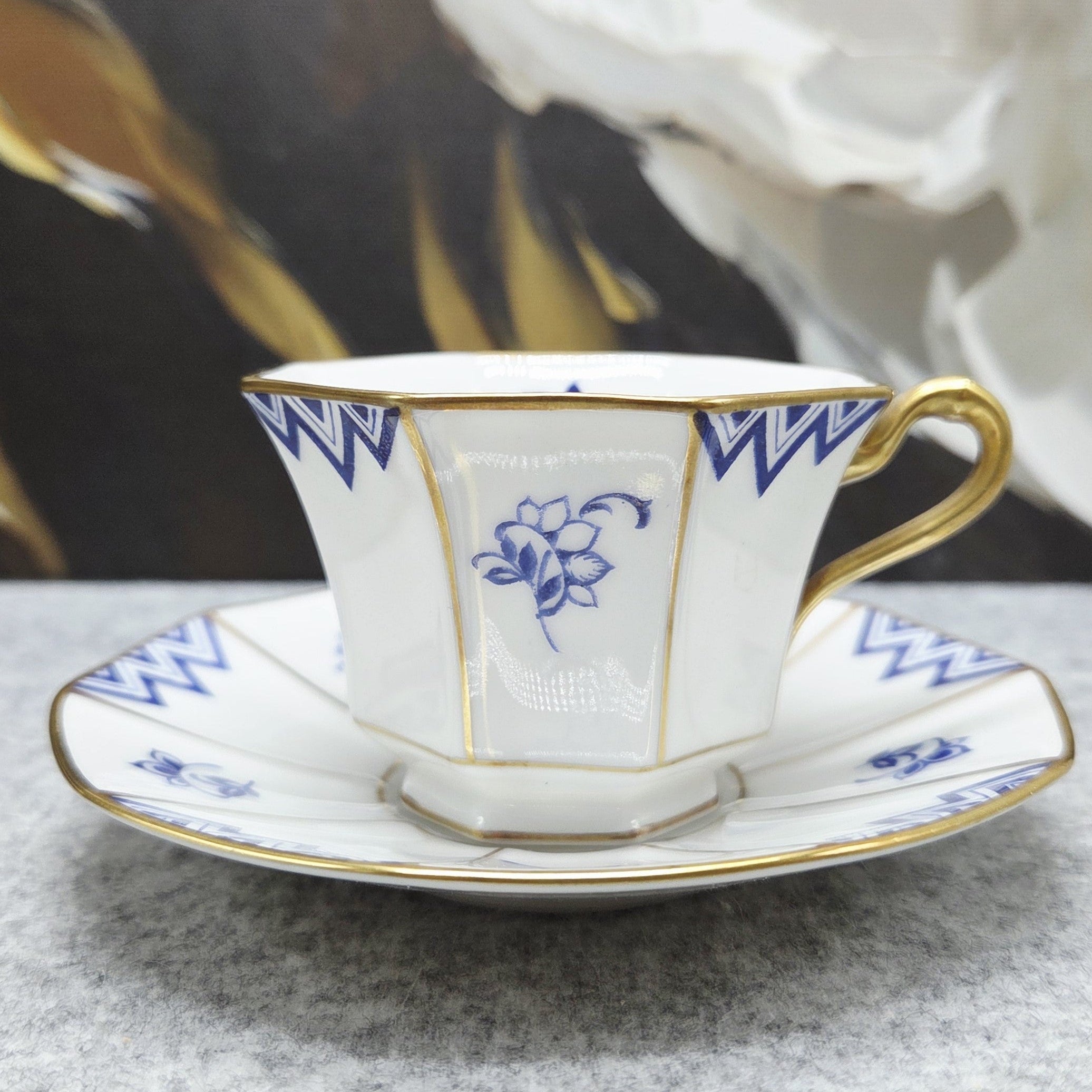 Puodelio kraštą tarsi įrėmina auksinės linijos, padalindamos dekoracijas į atskirus keturkampius, o pati puodelio forma sudaro taisyklingą aštunkampį. Lėkštutė atkartoja tuos pačius motyvus ir ornamentiką, harmoningai papildydama visą komplektą. Auksu dengta rankenėlė suteikia dar daugiau rafinuotumo ir išryškina meistrišką porceliano dirbinį.