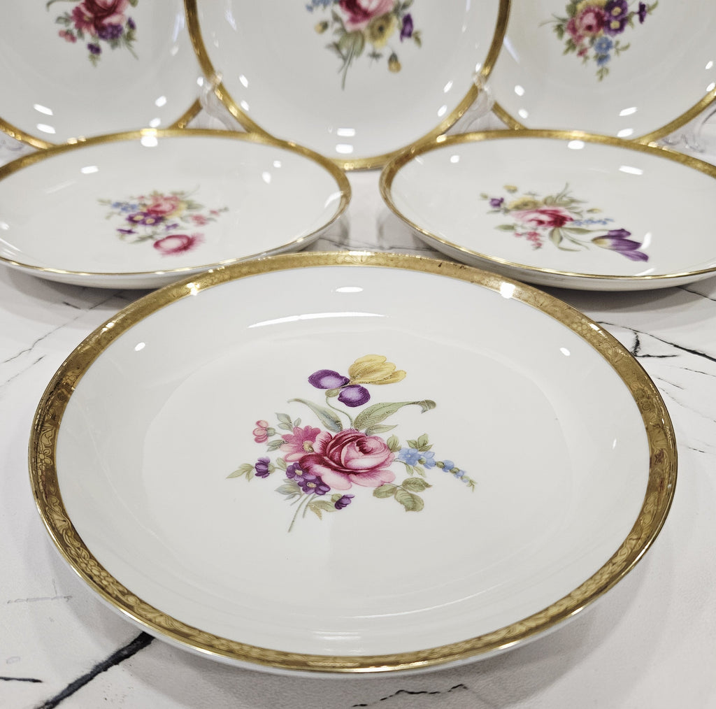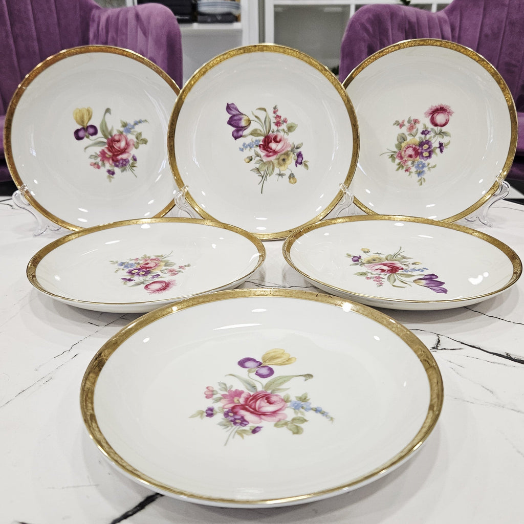 6 vnt. "Royal Ivory, KPM" lėkščių rinkinys, dekoruotas aukso juostele ir sodo gėlių motyvu (19.5 cm)