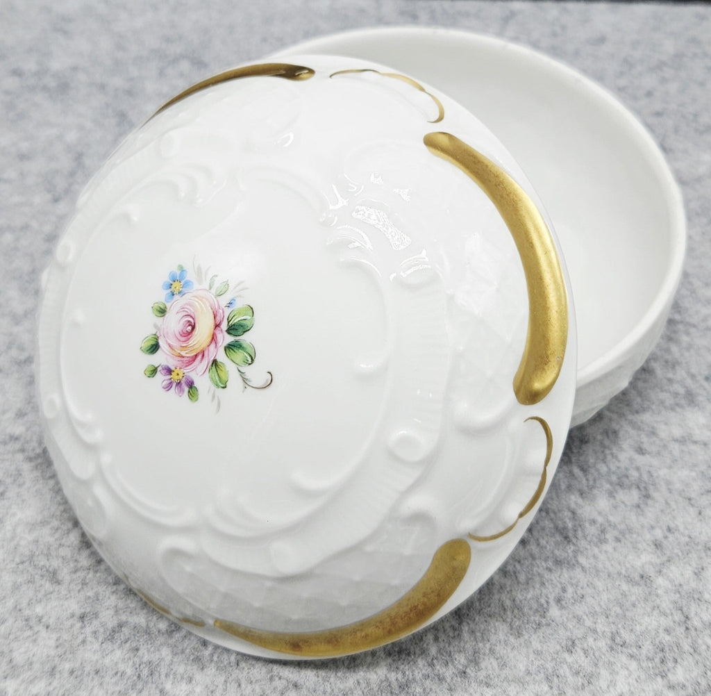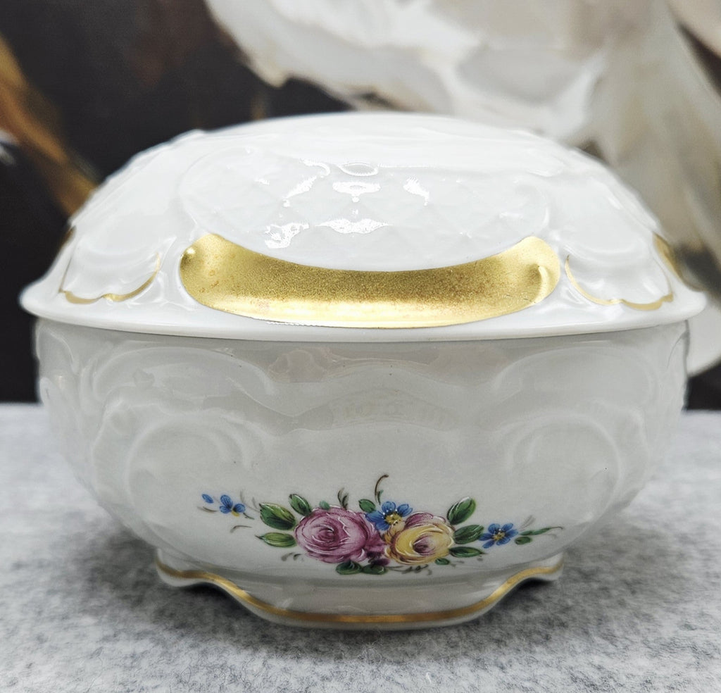Elegantiška "Lindner" porcelianinė dėžutė su dangteliu, dekoruota gėlių motyvais ir auksu