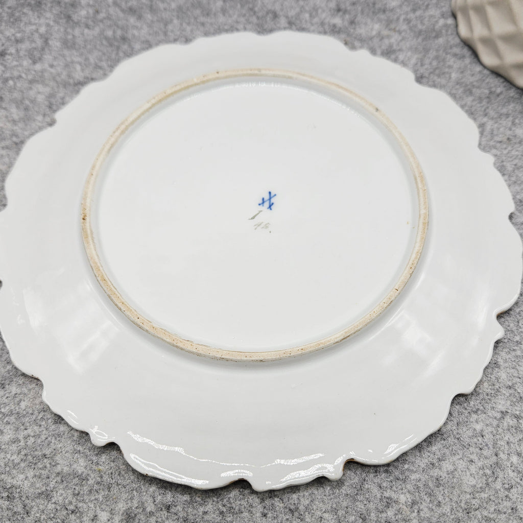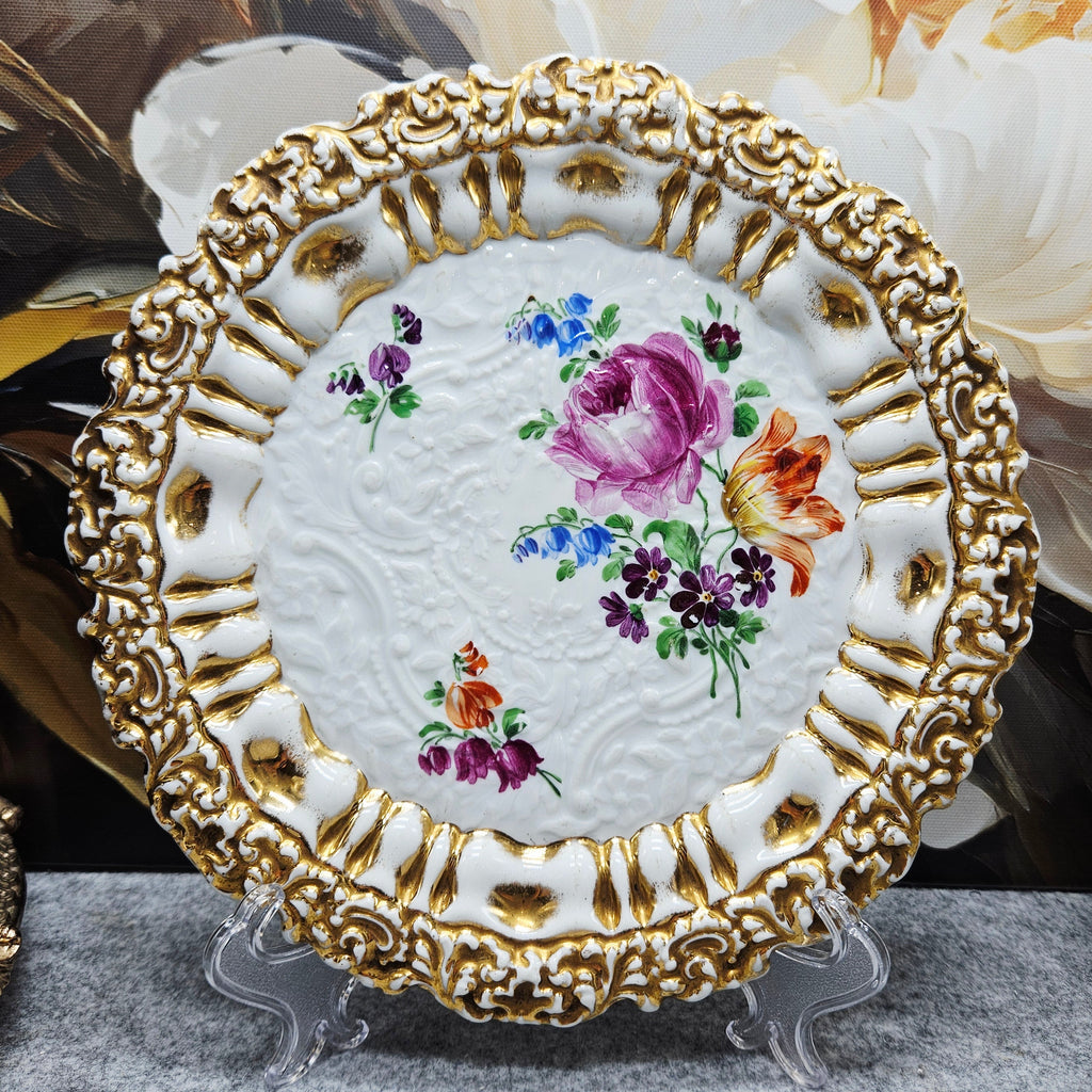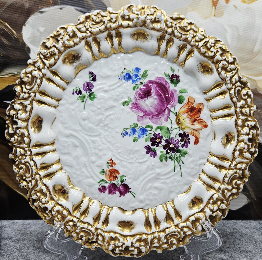 Lėkštės kraštai išpuošti įspūdingu reljefiniu rokoko stiliaus ornamentu, kurį dar labiau pabrėžia rankomis dengtas prabangus 24 karatų auksavimas. Šis derinys suteikia kūriniui išskirtinės elegancijos ir laiko patinos žavesio.