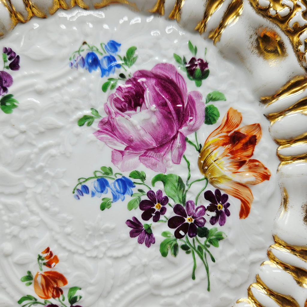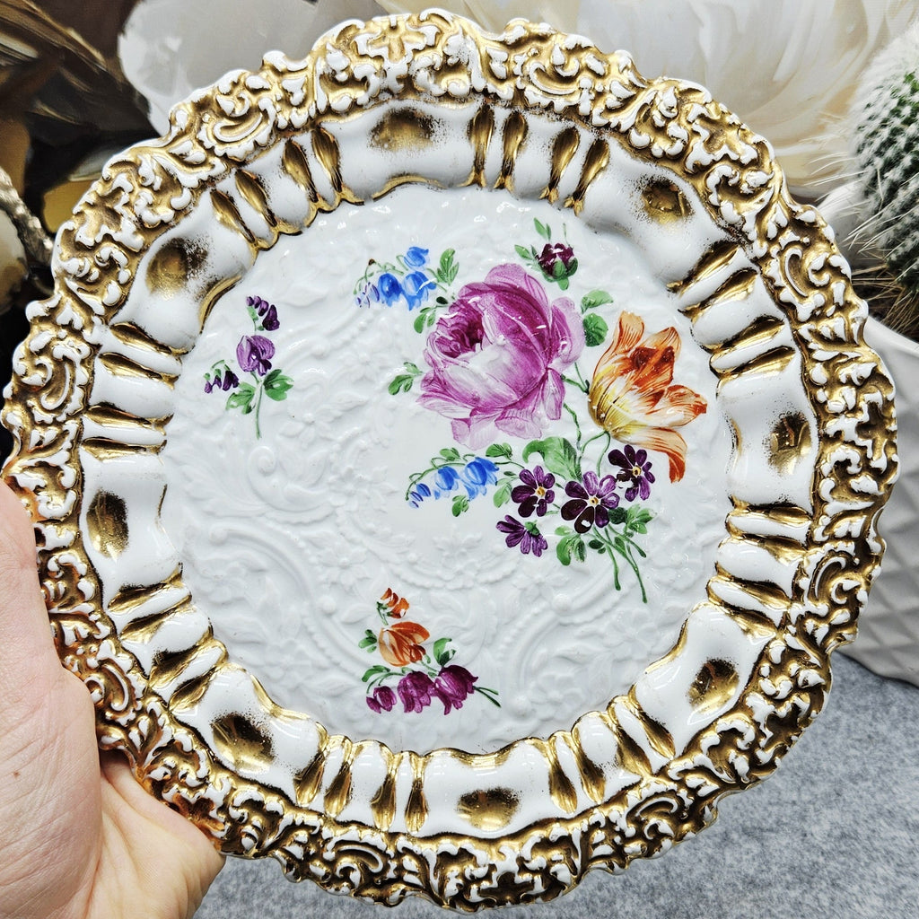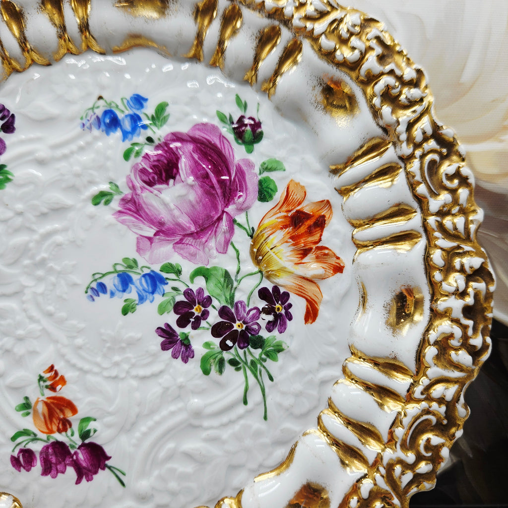 Prabangus Meissen porcelianas – tai ne tik indas, bet tikras meno kūrinys, spinduliuojantis istoriją, grožį ir meistrystę. Ši išskirtinė dekoratyvinė lėkštė pagaminta iš aukščiausios kokybės balto porceliano, puošto rankomis tapyta polichromine gėlių kompozicija, kurios centre išsiskiria sodriai rožinė rožė, oranžinis tulpės žiedas ir violetiniai žiedeliai. Kiekvienas potėpis kruopščiai atliktas, perteikiant tikrąjį Meissen manufaktūros tapytojų talentą.