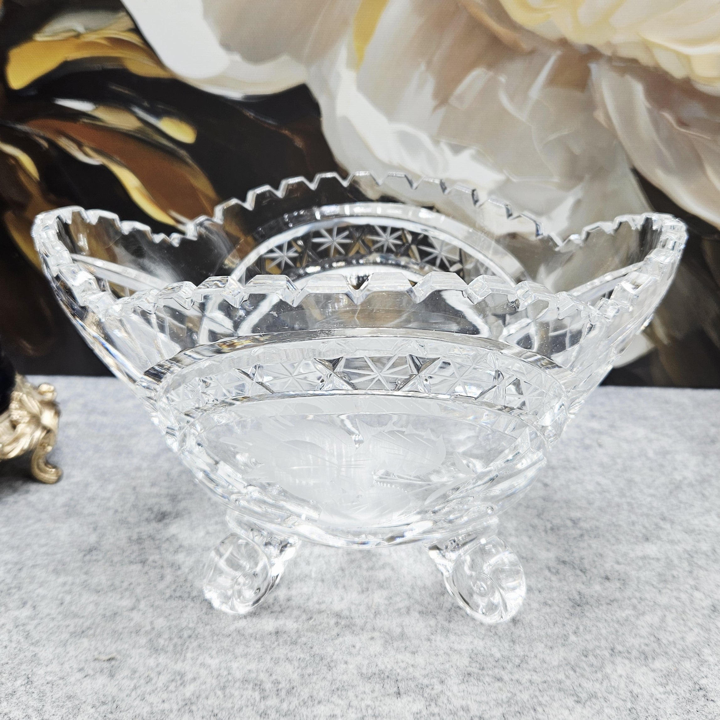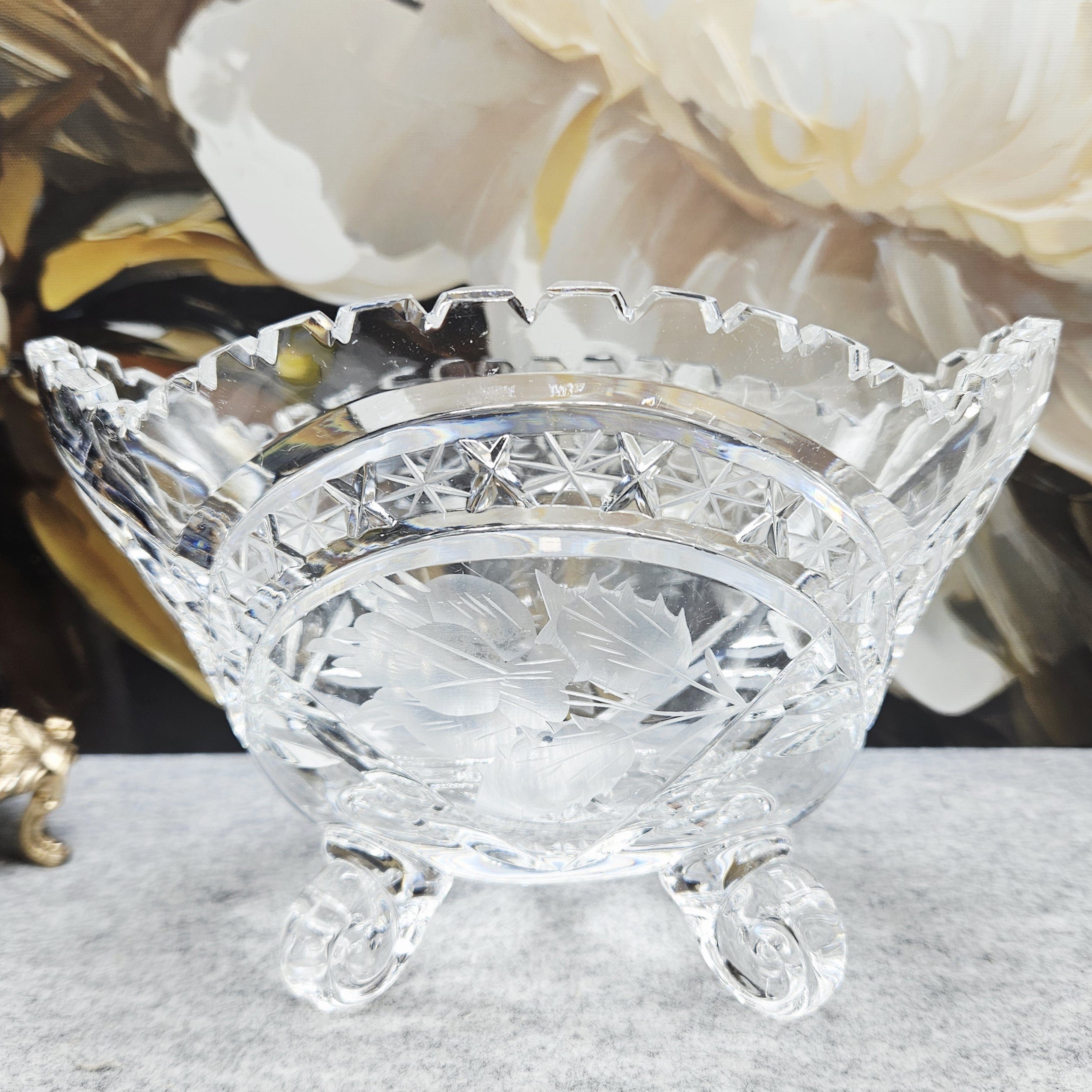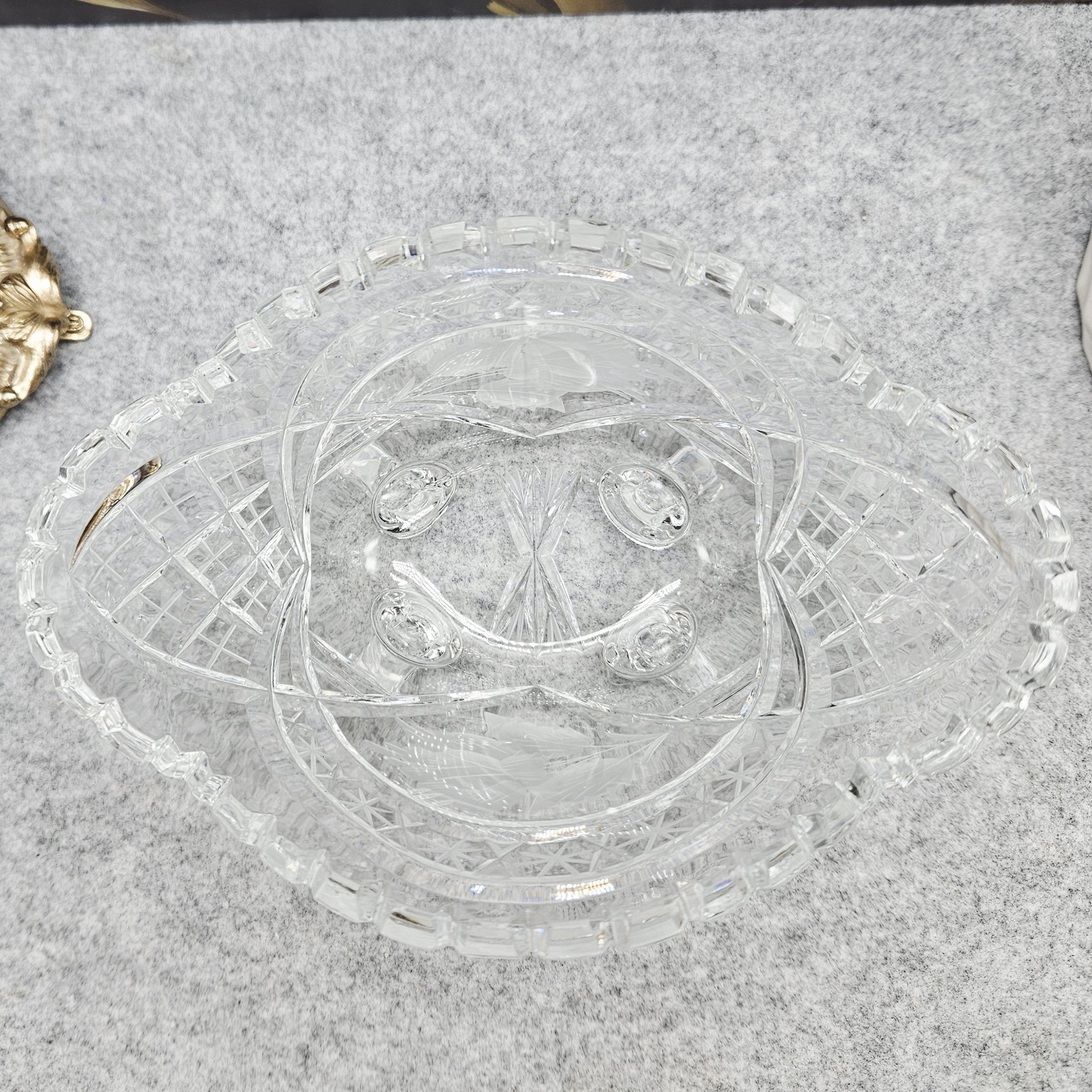 Elegantiškas krištolo indas ant dekoratyvių kojelių – klasikinio stiklo meistriškumo pavyzdys. Indas dekoruotas išraiškingais briaunuoto krištolo raštais, subtiliomis žvaigždžių ir augalinio motyvo graviruotėmis, kurios gražiai laužia šviesą ir suteikia dirbiniui ypatingo spindesio. Banguotas, karūną primenantis kraštas ir masyvios, meniškai suformuotos kojelės suteikia indui prabangos bei išskirtinio dekoratyvumo. Toks krištolo indas puikiai tinka smulkiems vaisiams, saldumynams ar kaip elegantiška stalo bei interjero puošmena, išlaikanti klasikinę krištolo dirbinių estetiką.