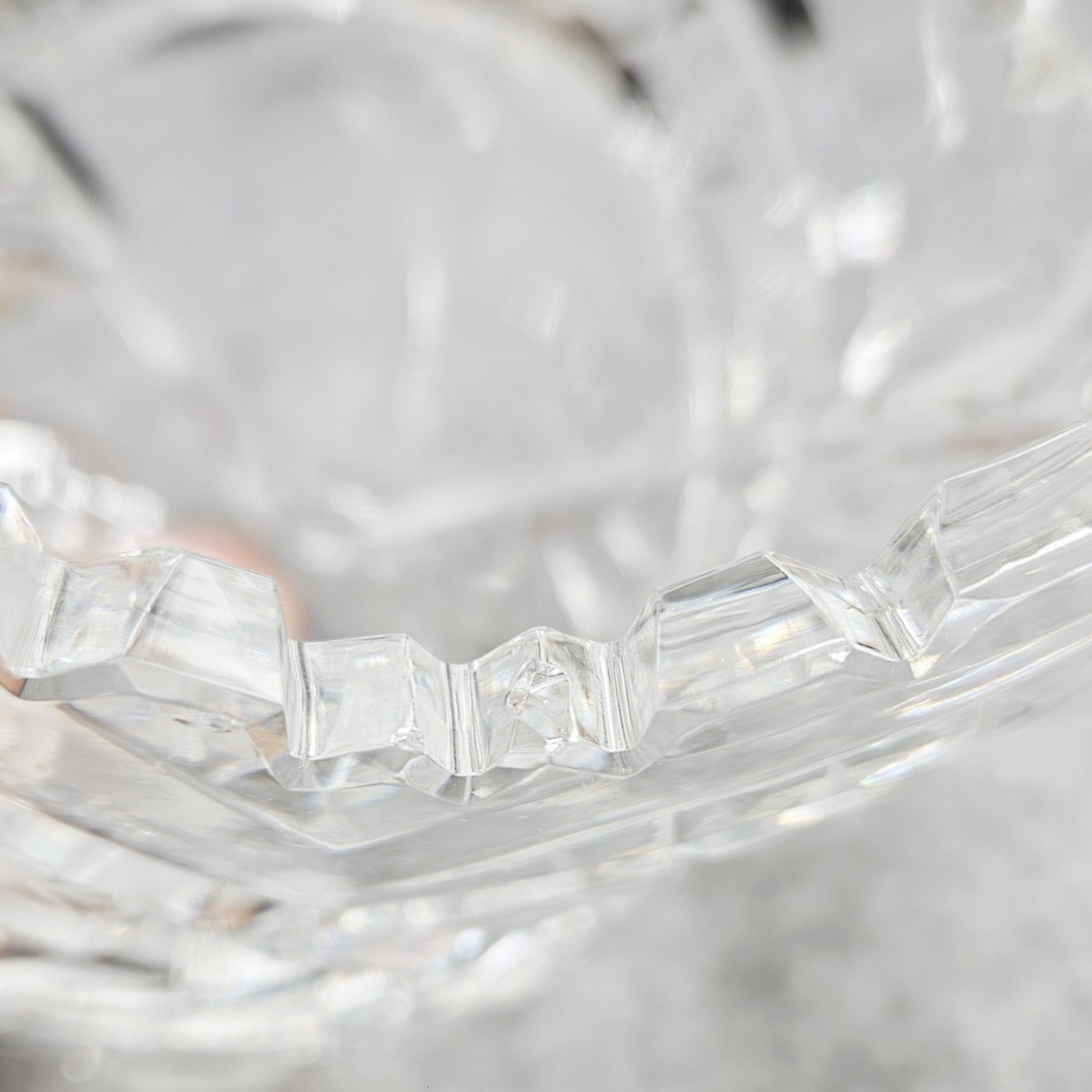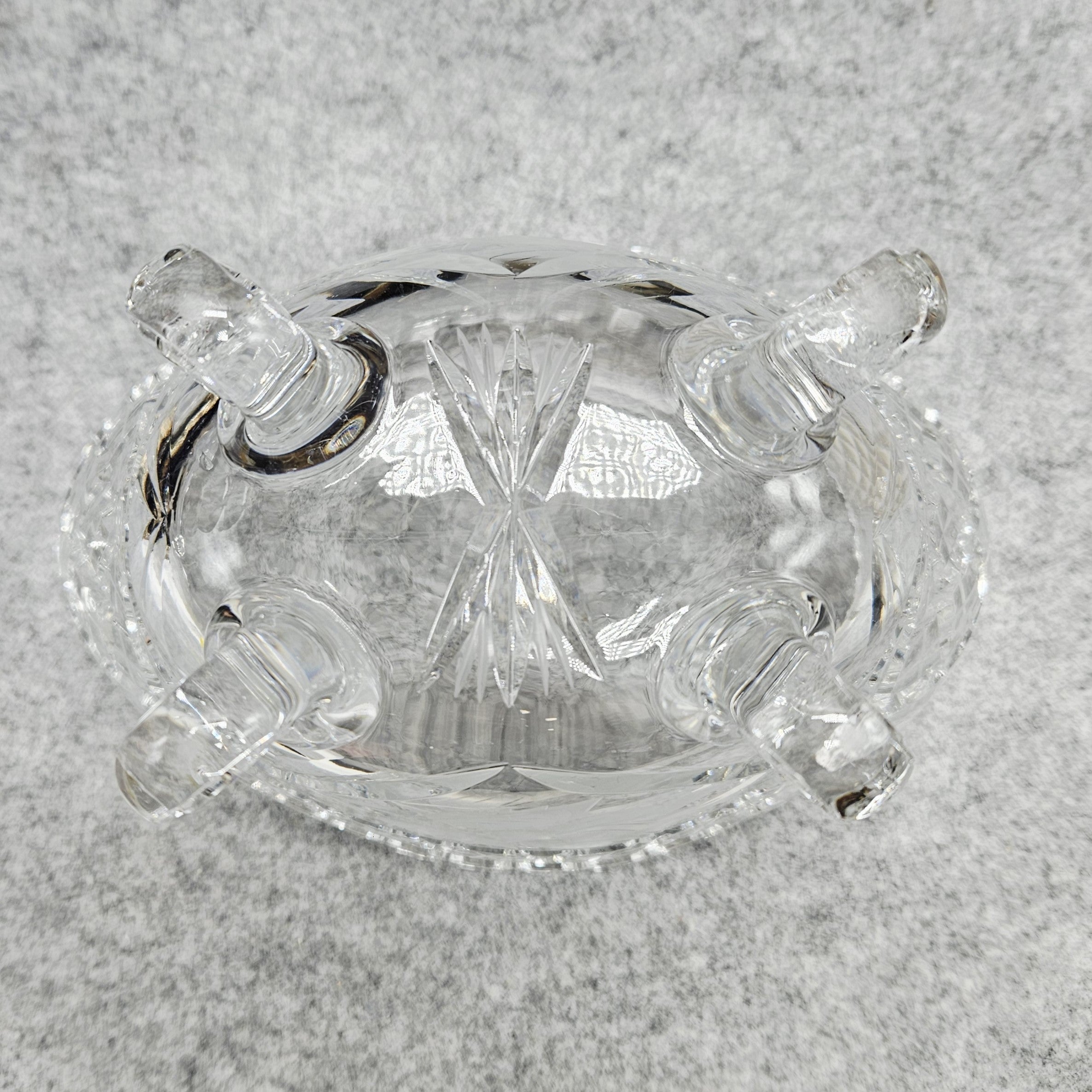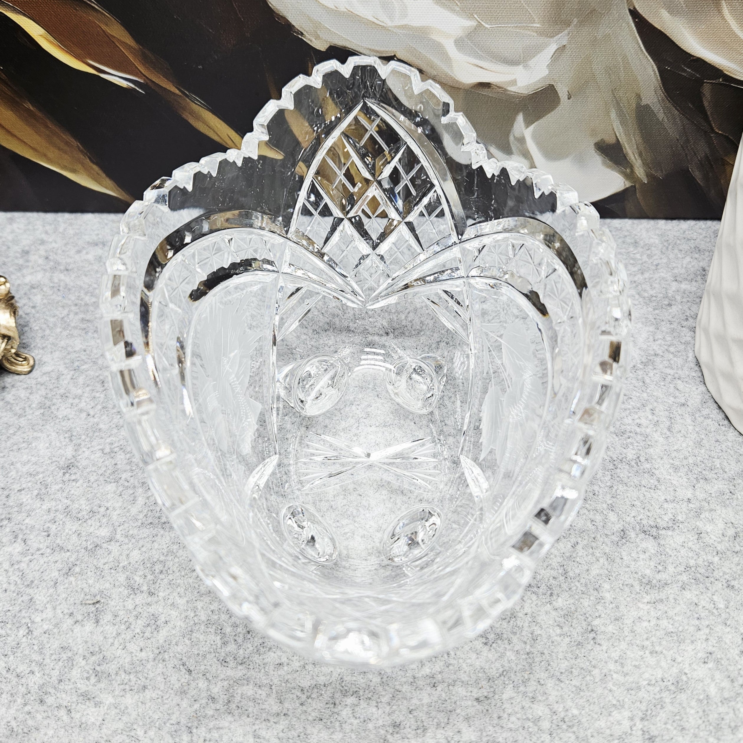 Elegantiškas krištolo indas ant dekoratyvių kojelių – klasikinio stiklo meistriškumo pavyzdys. Indas dekoruotas išraiškingais briaunuoto krištolo raštais, subtiliomis žvaigždžių ir augalinio motyvo graviruotėmis, kurios gražiai laužia šviesą ir suteikia dirbiniui ypatingo spindesio. Banguotas, karūną primenantis kraštas ir masyvios, meniškai suformuotos kojelės suteikia indui prabangos bei išskirtinio dekoratyvumo. Toks krištolo indas puikiai tinka smulkiems vaisiams, saldumynams ar kaip elegantiška stalo bei interjero puošmena, išlaikanti klasikinę krištolo dirbinių estetiką.