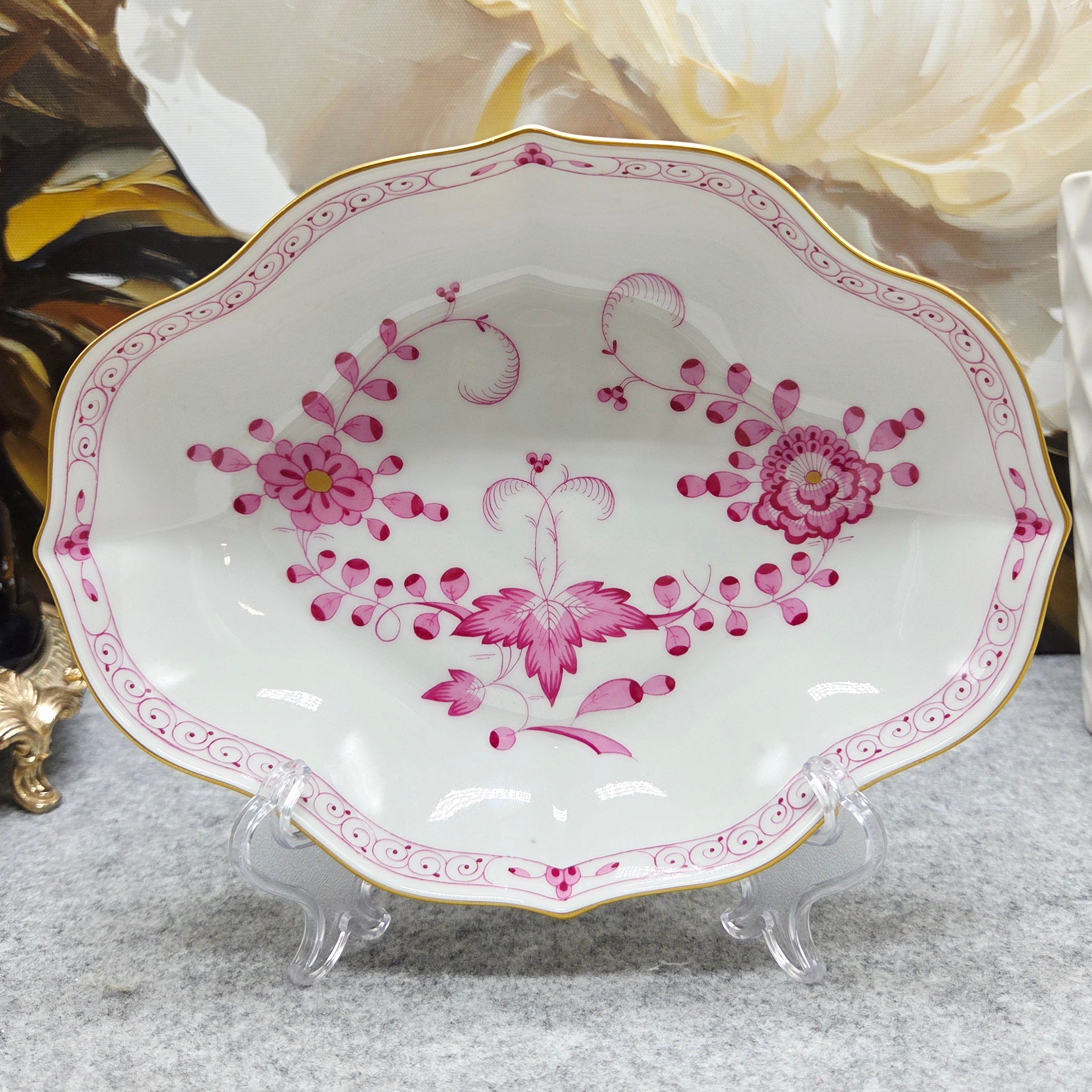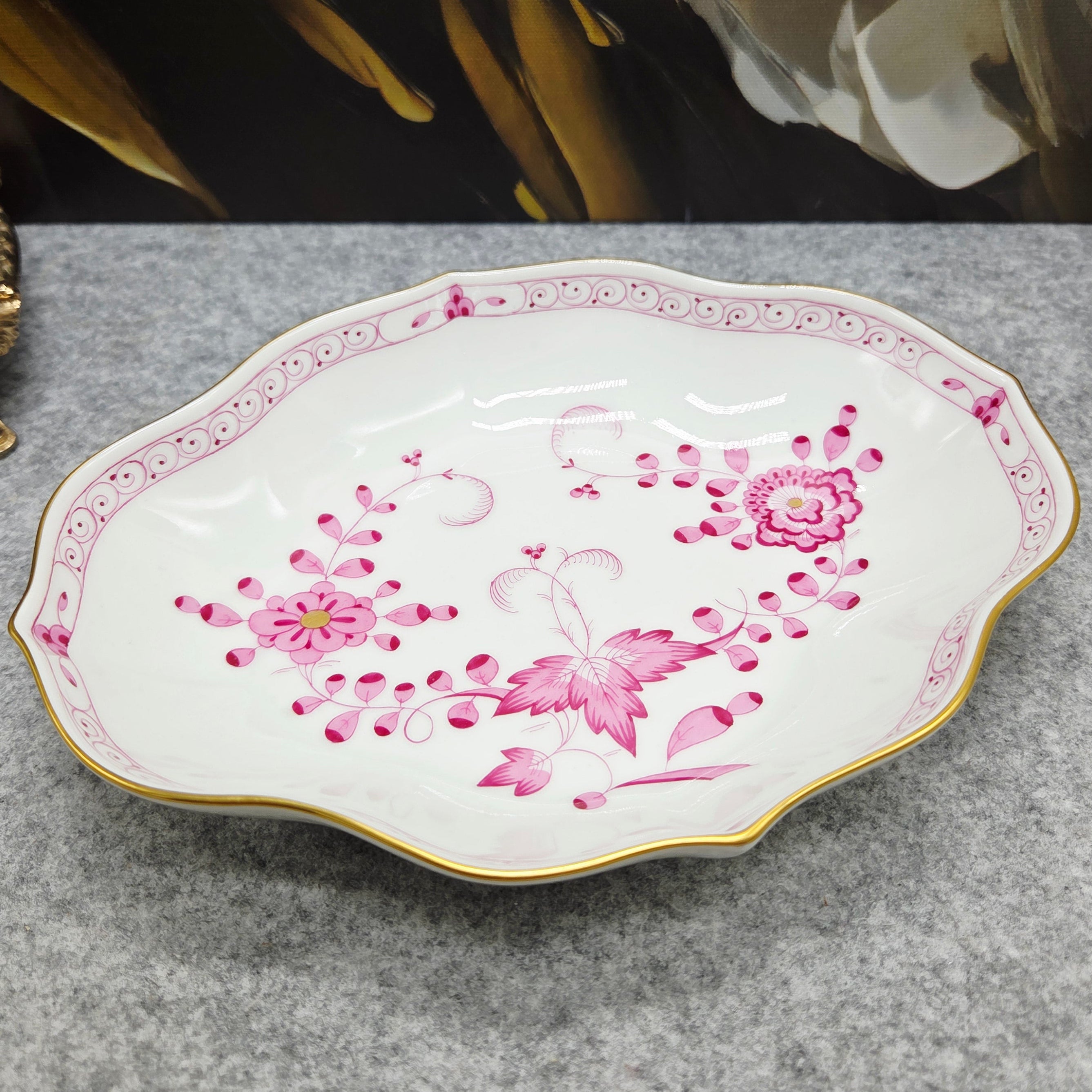Banguotas, švelniai modeliuotas kraštas dekoruotas smulkiu ornamentiniu apvadu bei subtilia aukso linija, kuri suteikia lėkštei aristokratiško spindesio. Šis dekoras – tai istorinės „Indisch“ tradicijos interpretacija, kurioje Meissen meistrai sujungė europietišką preciziškumą su rytietiško meno įkvėpta estetika.