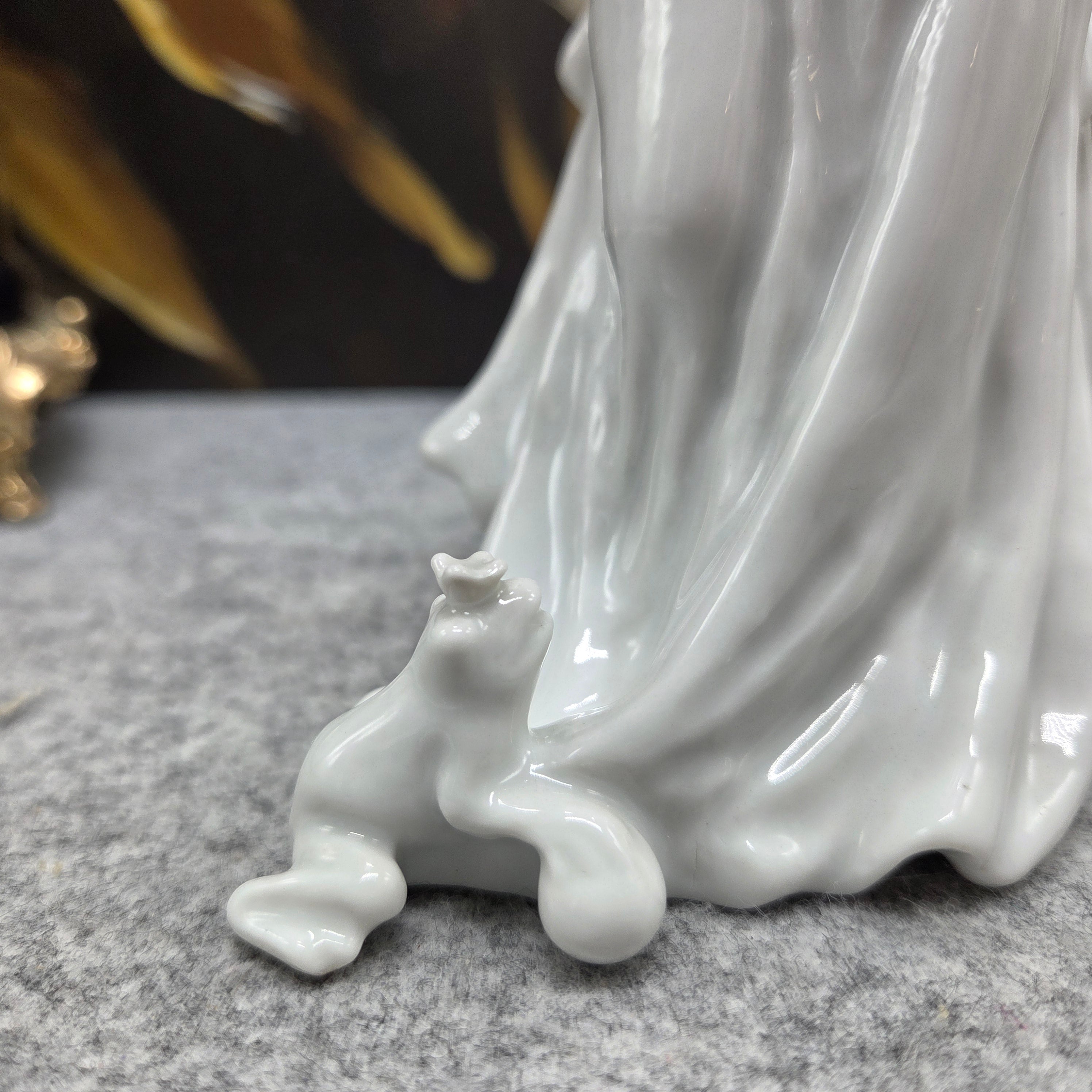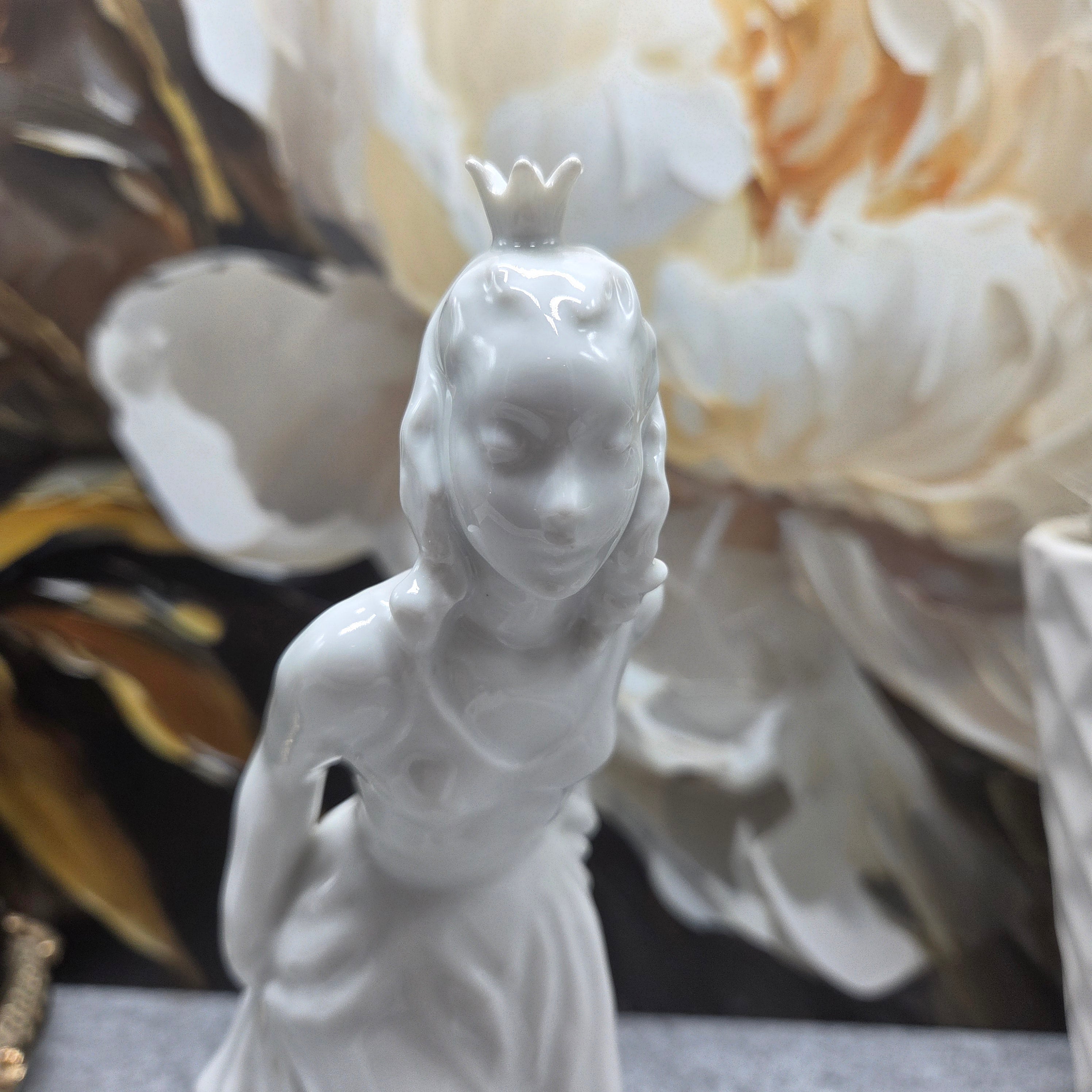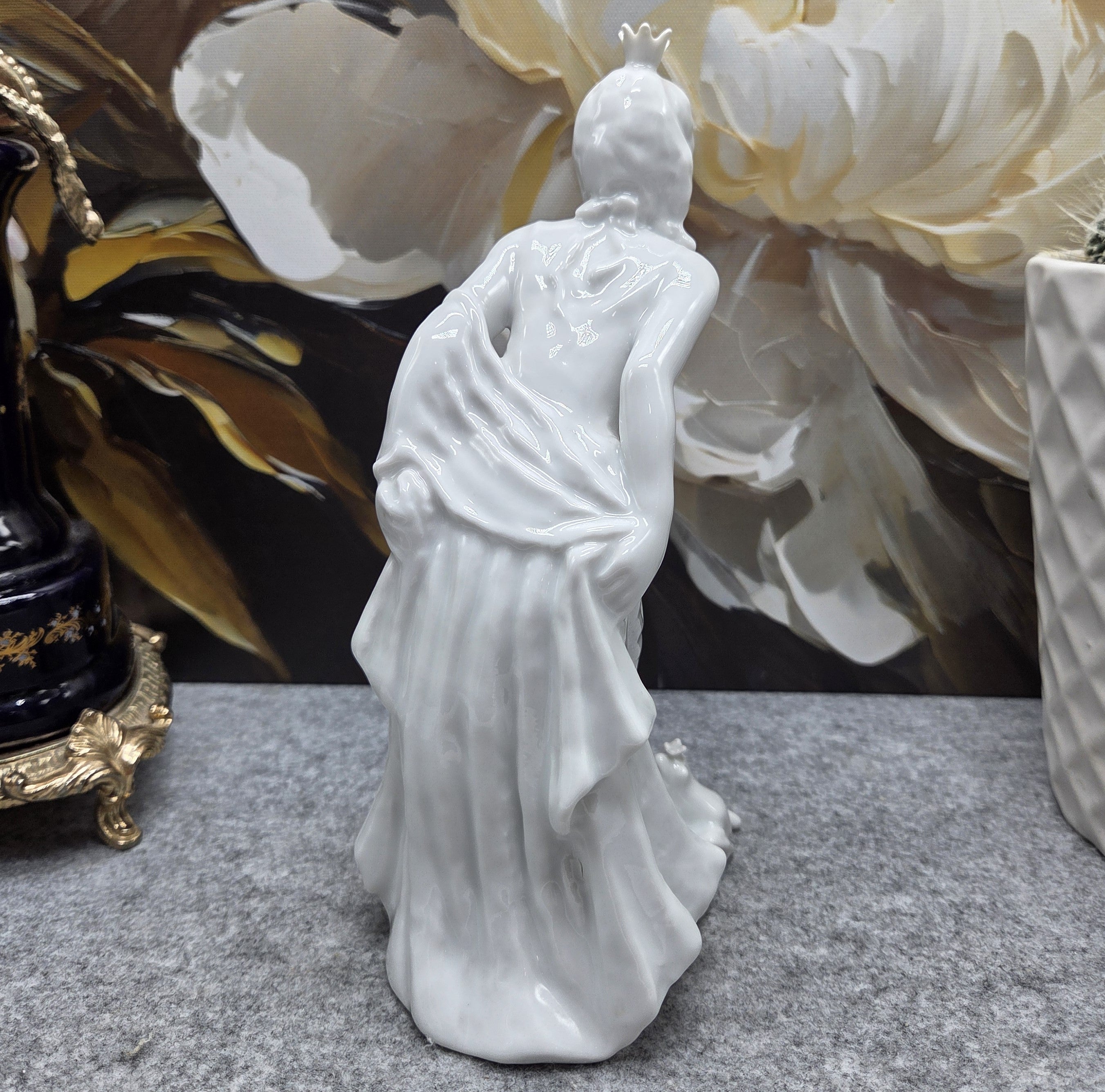 Grakščiai modeliuota figūra, lengvai banguojanti suknelė, subtili karūna ir kruopščiai išdirbtos detalės atskleidžia aukščiausio lygio Rosenthal porceliano meistrystę. Švelniai blizganti balta glazūra išryškina plastikos grožį, suteikia kūriniui lengvumo, tyrumo ir rafinuotos prabangos įspūdį. Minimalistinė spalva leidžia statulėlei harmoningai įsilieti tiek į klasikinį, tiek į modernų interjerą.