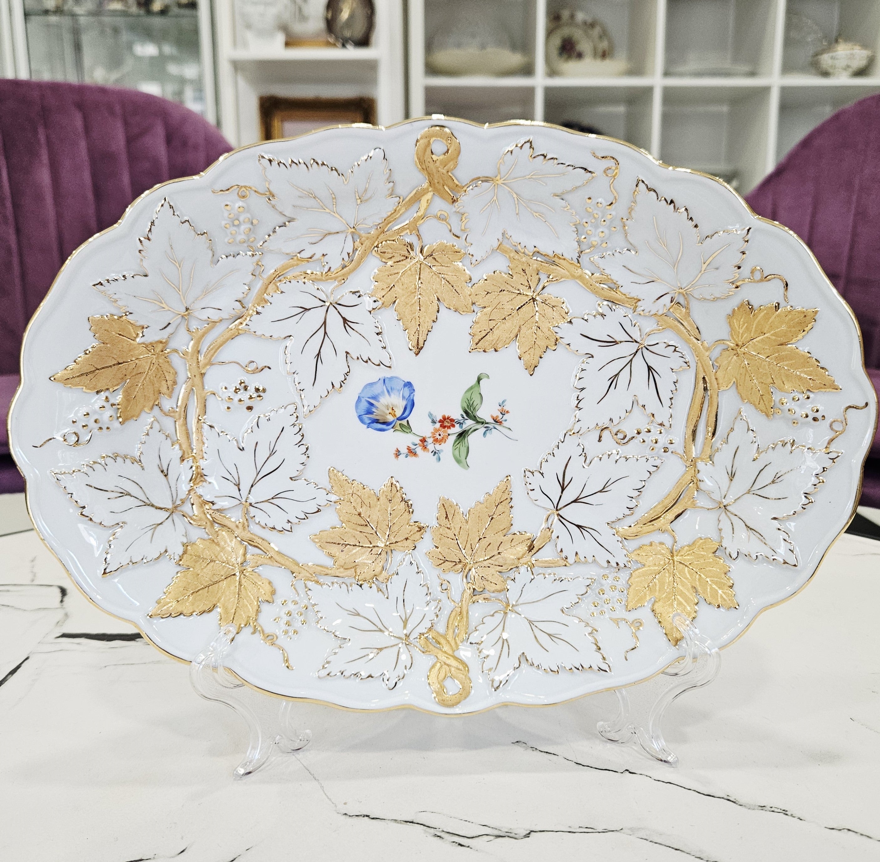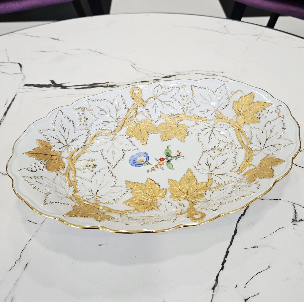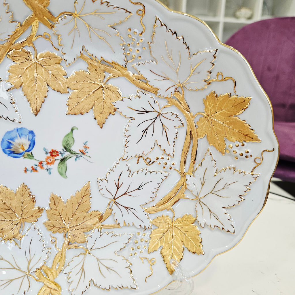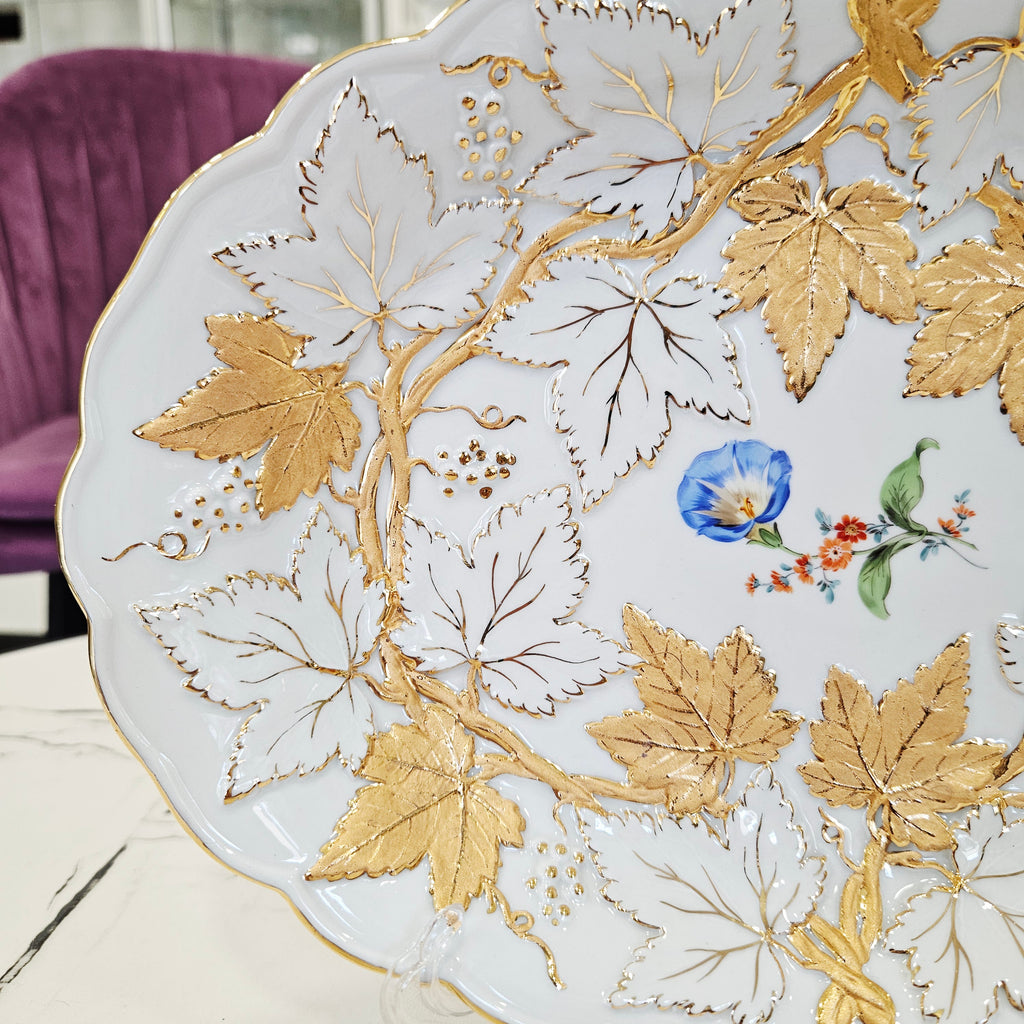 Išskirtinė "Meissen" porceliano serviravimo lėkštė, pagaminta garsiojoje Saksonijos manufaktūroje, pažymėtoje autentišku mėlynų kryžiuotų kardų ženklu. Lėkštė dekoruota įspūdingu rankų darbo aukso reljefiniu motyvu – vynuogių lapų girlianda, apjuosianti centrą. Viduryje – ranka tapytas švelnus gėlių kompozicijos motyvas: mėlyna varpelio formos gėlė su smulkiomis raudonomis žiedelėmis.