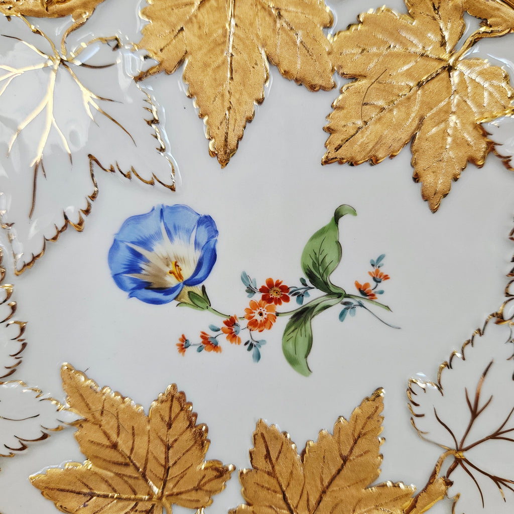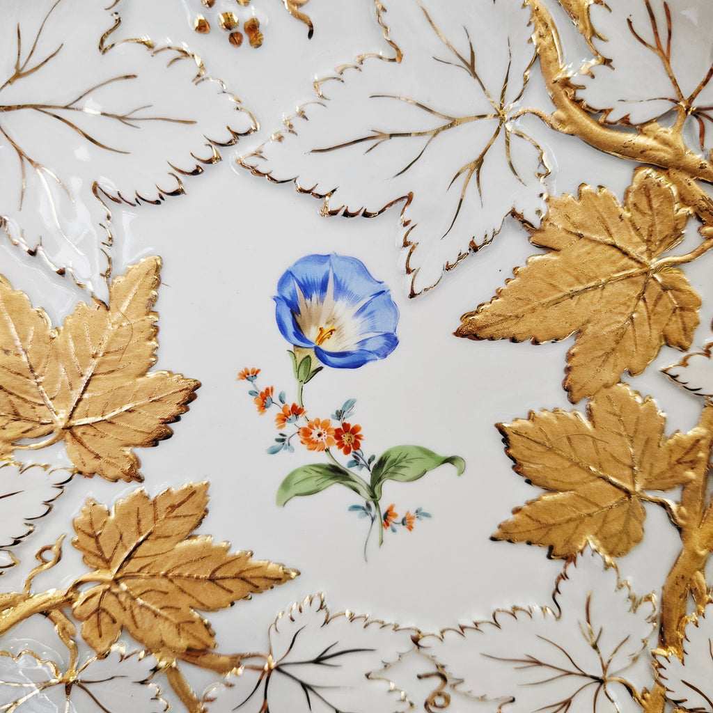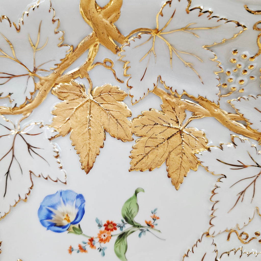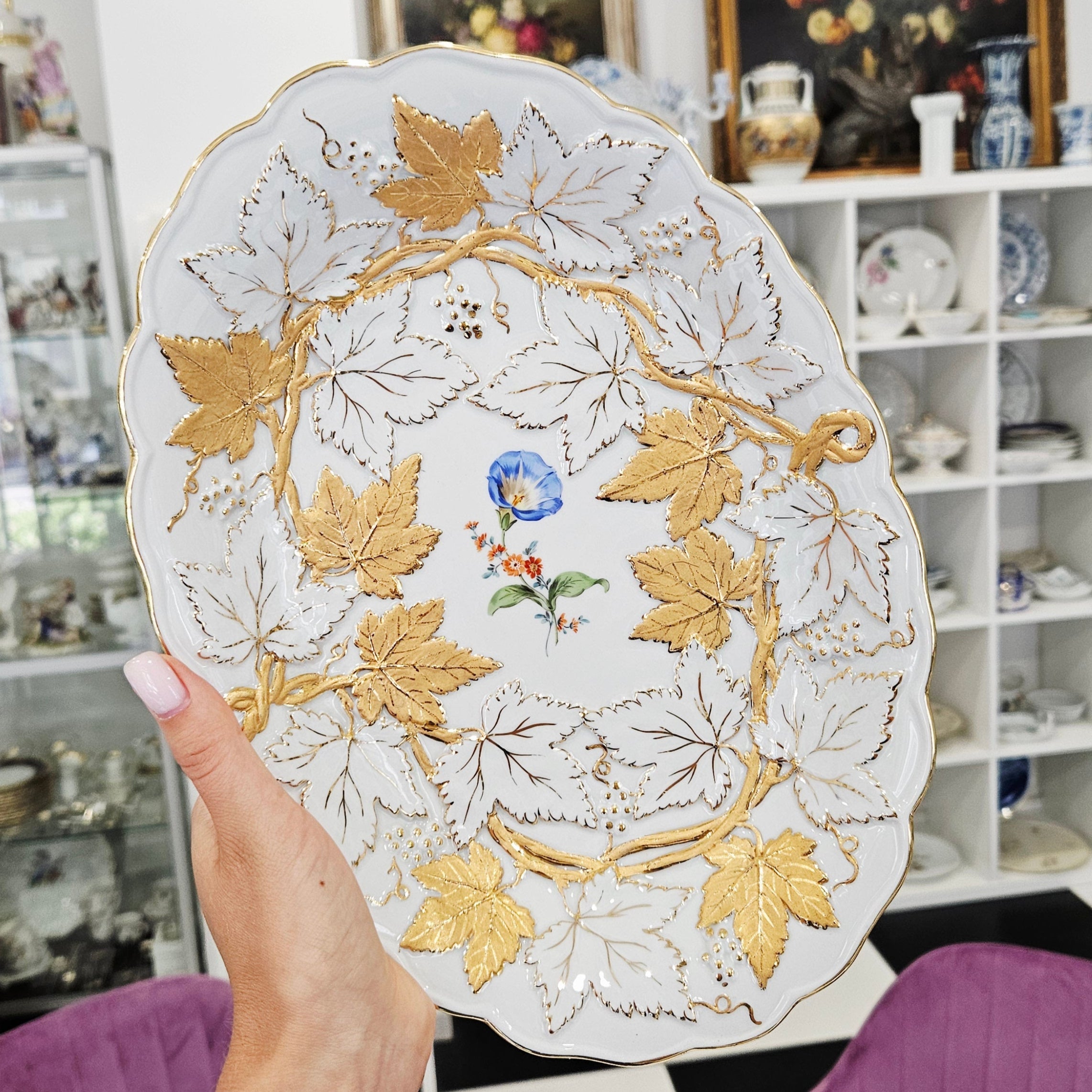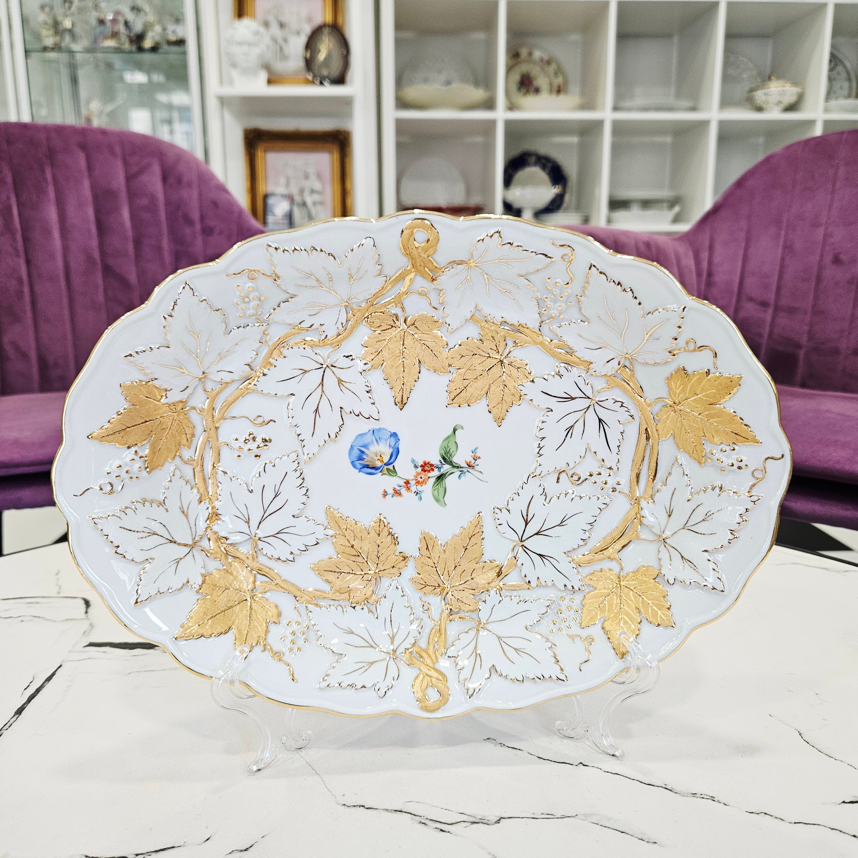 Išskirtinė "Meissen" porceliano serviravimo lėkštė, pagaminta garsiojoje Saksonijos manufaktūroje, pažymėtoje autentišku mėlynų kryžiuotų kardų ženklu. Lėkštė dekoruota įspūdingu rankų darbo aukso reljefiniu motyvu – vynuogių lapų girlianda, apjuosianti centrą. Viduryje – ranka tapytas švelnus gėlių kompozicijos motyvas: mėlyna varpelio formos gėlė su smulkiomis raudonomis žiedelėmis.