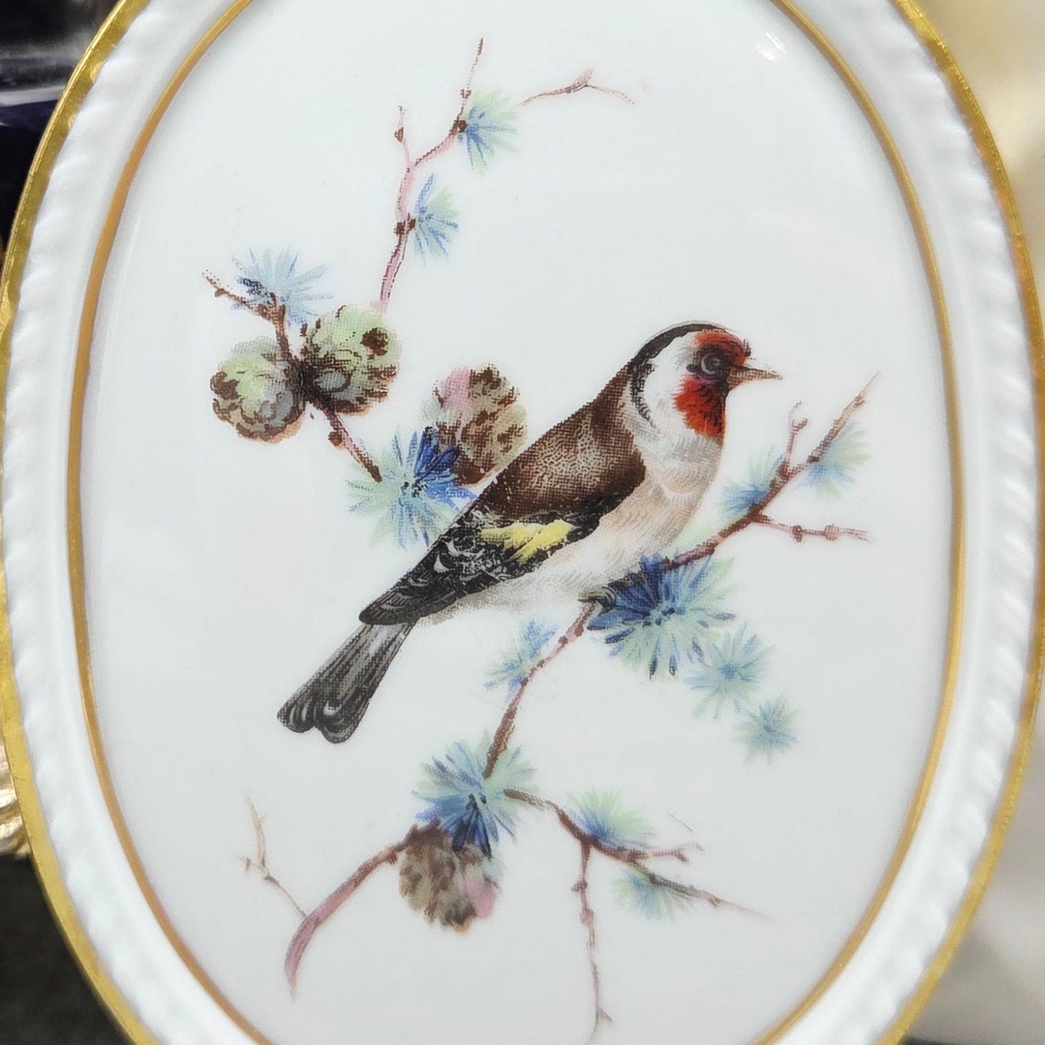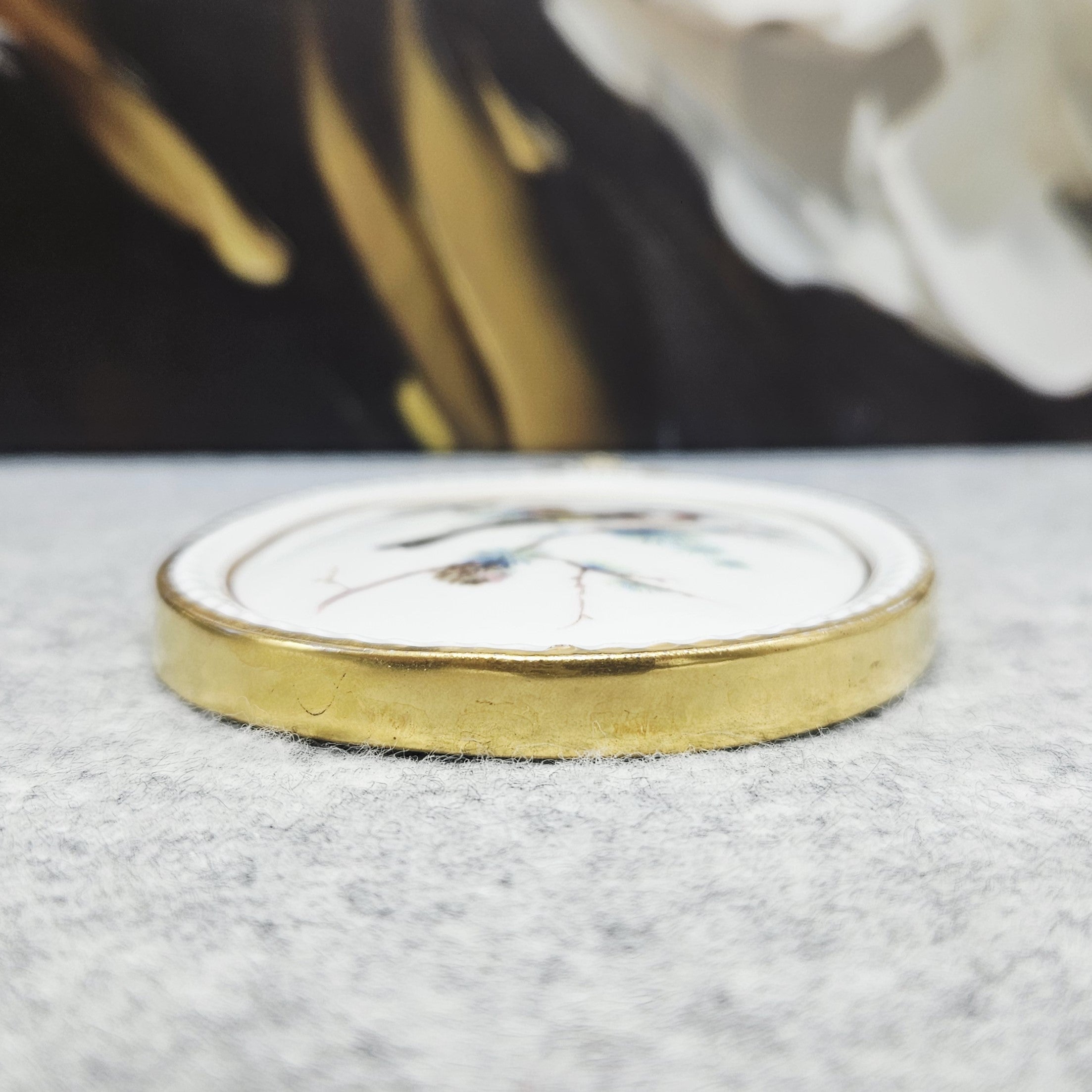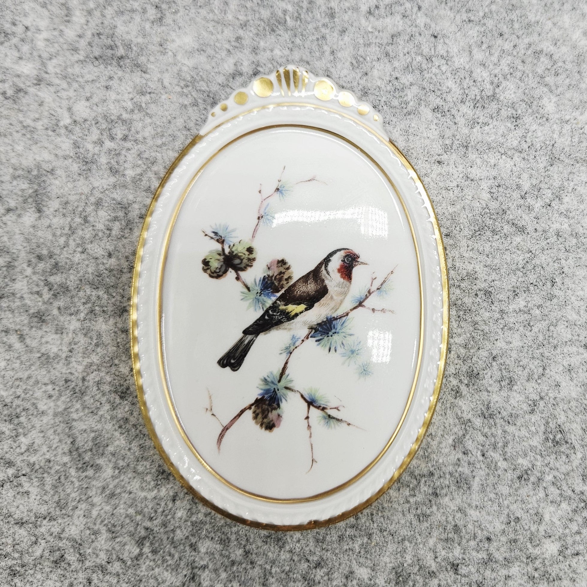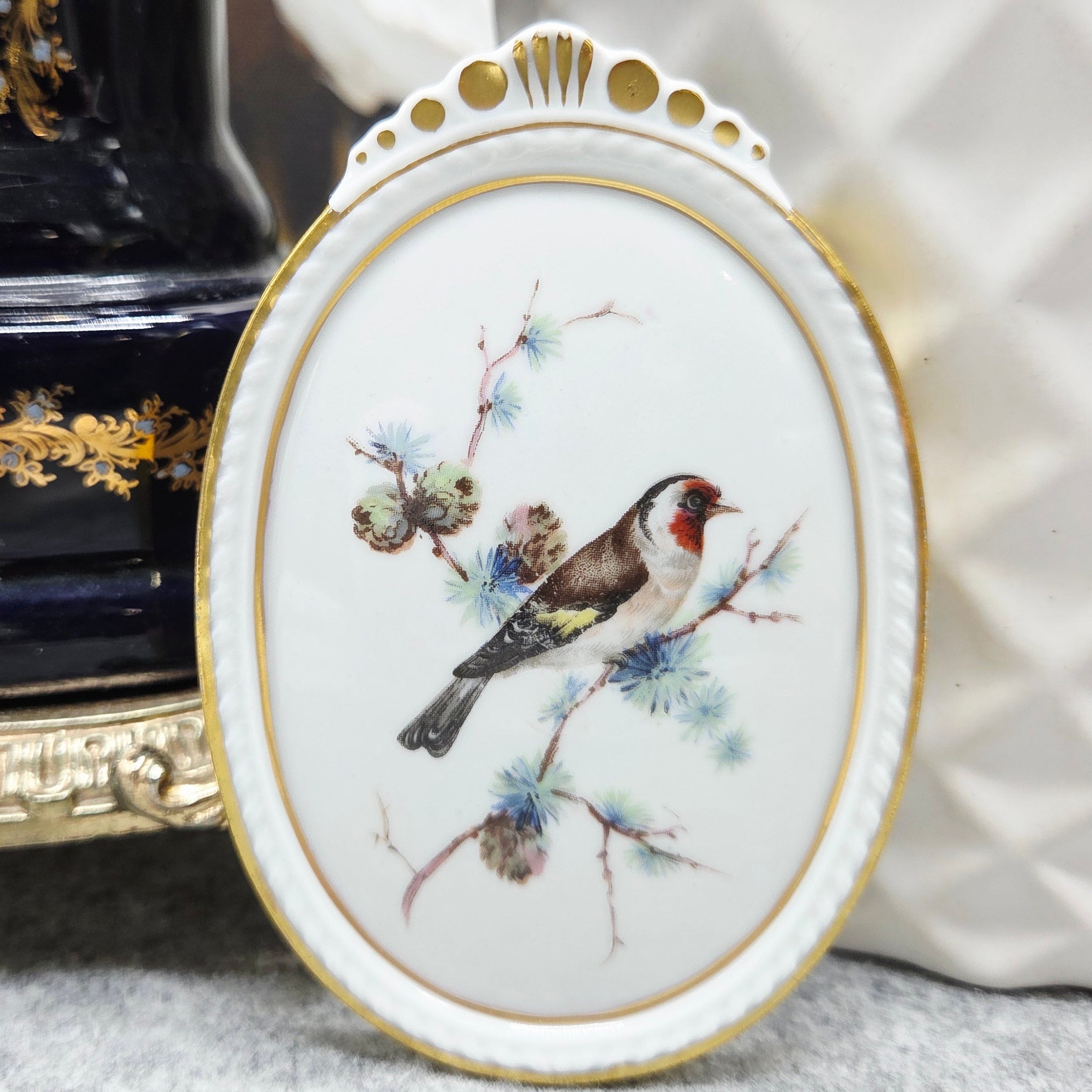 Šis „AK Kaiser“ porceliano dirbinys – subtili, ovalo formos dekoratyvinė plokštelė, išsiskirianti elegantiška klasika ir kruopščiu dekoru. Baltame porceliano fone pavaizduotas natūralistinis paukštis, nutūpęs ant šakelės su kankorėžiais ir melsvais akcentais – motyvas alsuoja ramybe ir gamtos harmonija. Kompoziciją įrėmina švelnus reljefas bei auksu dengtas kraštelis, o viršuje esantis dekoratyvus akcentas suteikia dirbiniui išbaigtumo ir prabangos pojūtį. Tai rafinuotas „AK Kaiser“ kūrinys, puikiai tinkantis sienos dekorui ar kolekcionierių rinkiniui.