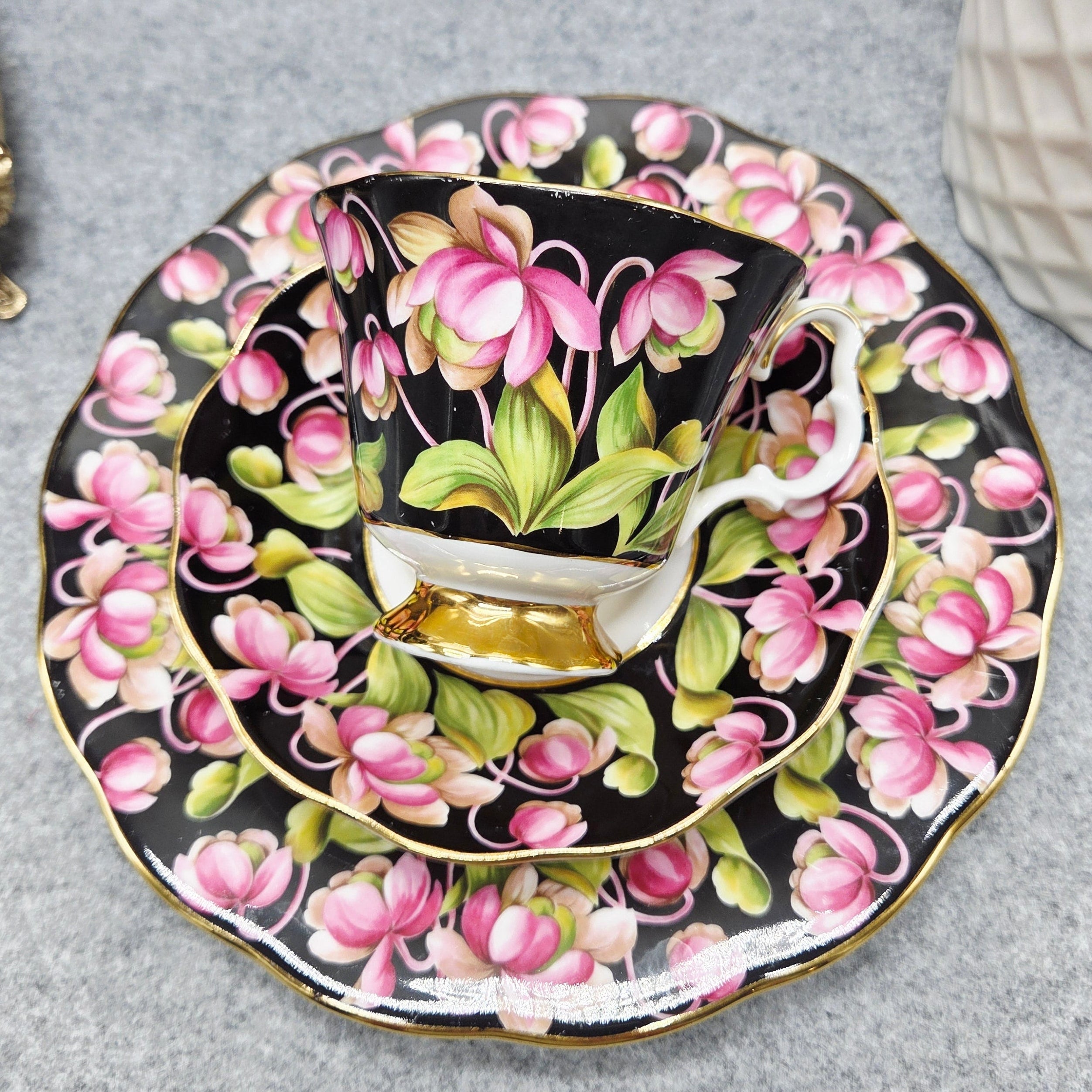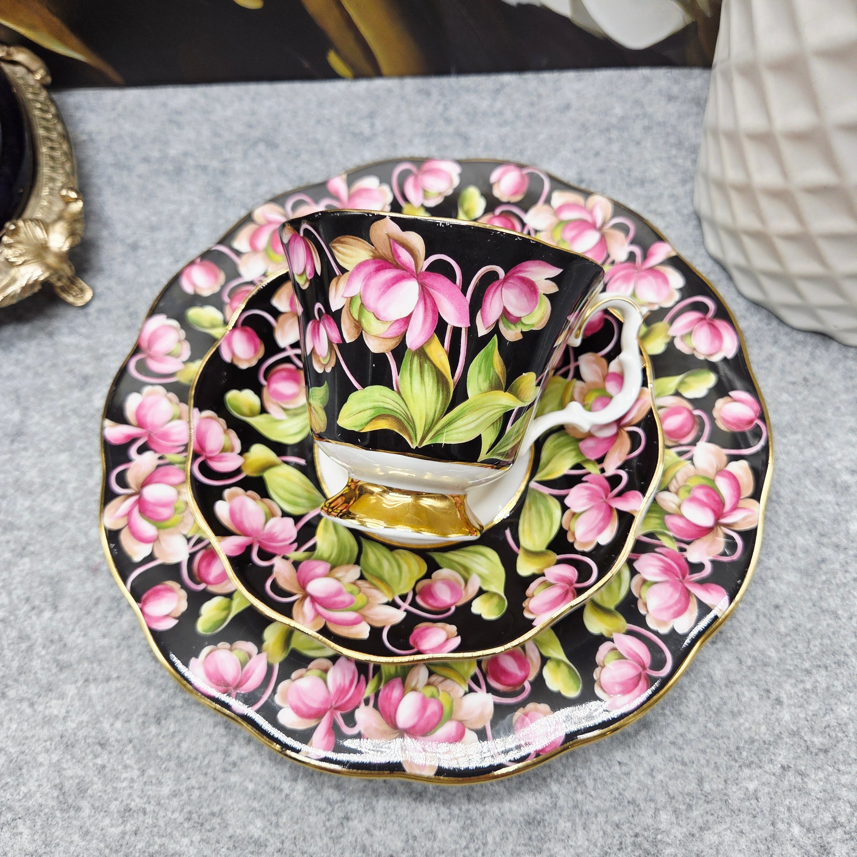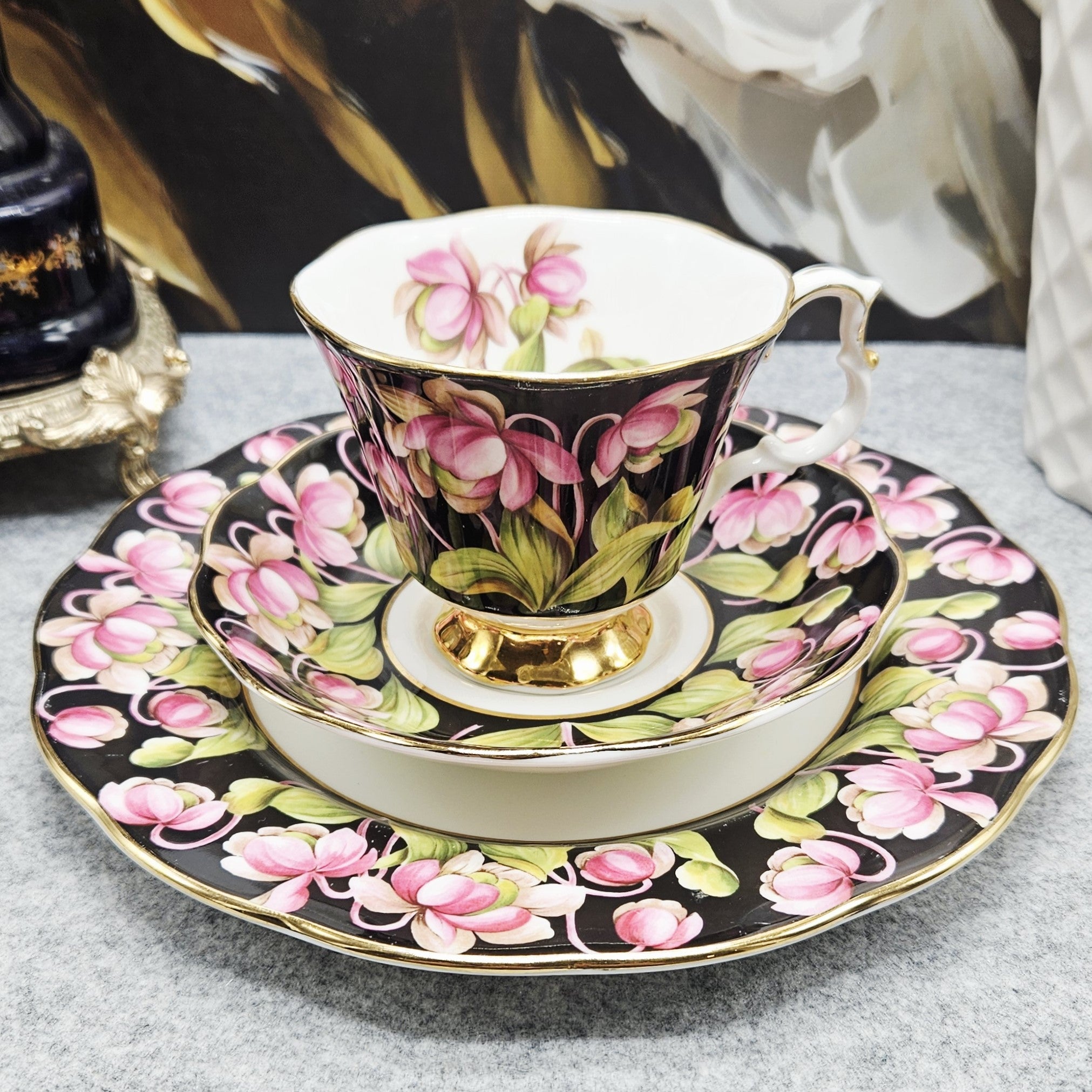 Elegantiškas „ROYAL ALBERT“ „Pitcher plant“ porceliano kavos/ arbatos TRIO (1 puodelis + 2 lėkštutės). (~190 ml)
