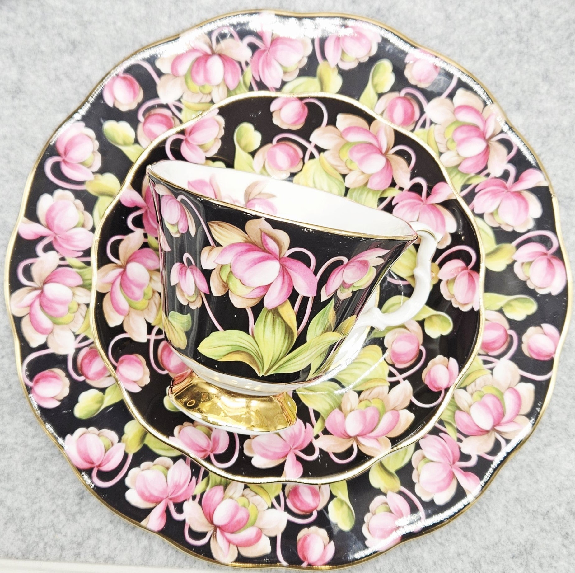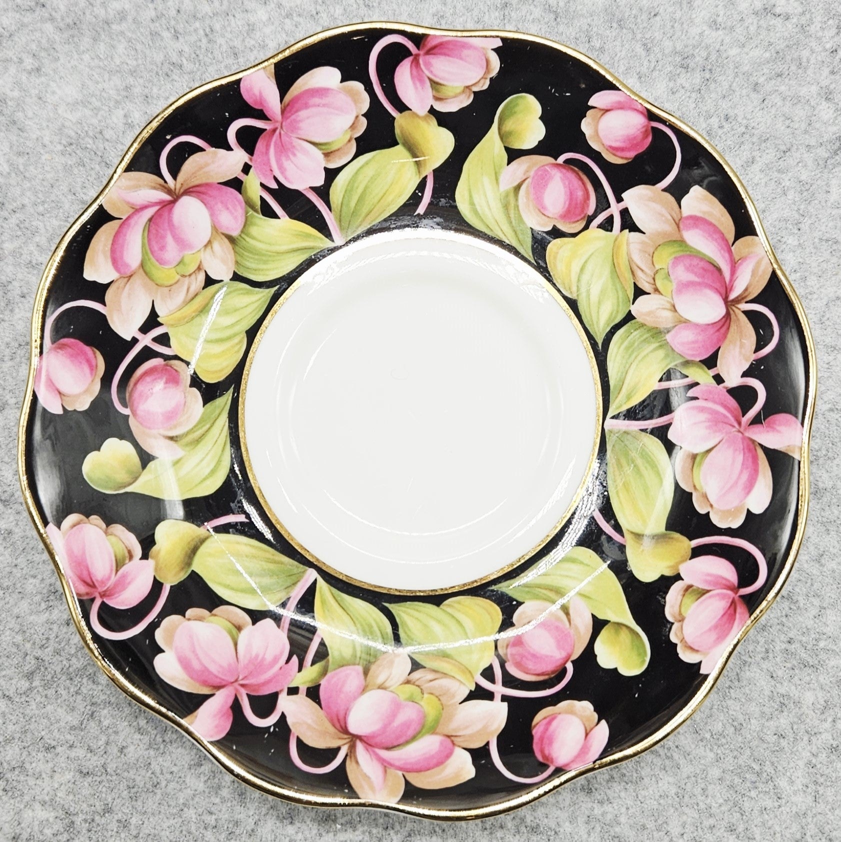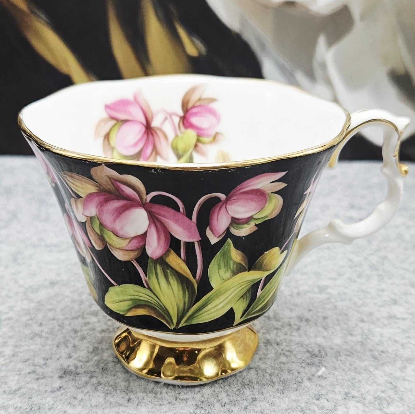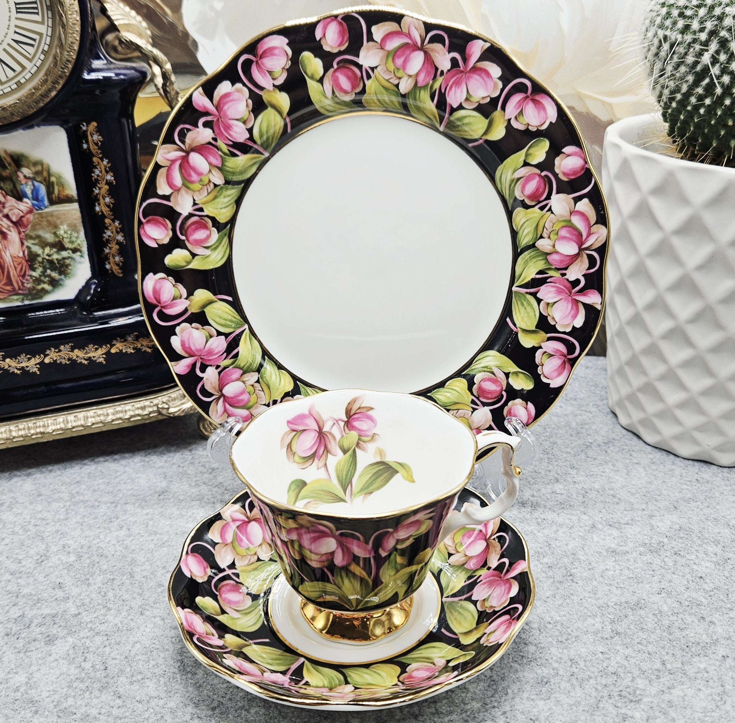 Elegantiškas „ROYAL ALBERT“ „Pitcher plant“ porceliano kavos/ arbatos TRIO (1 puodelis + 2 lėkštutės). (~190 ml)