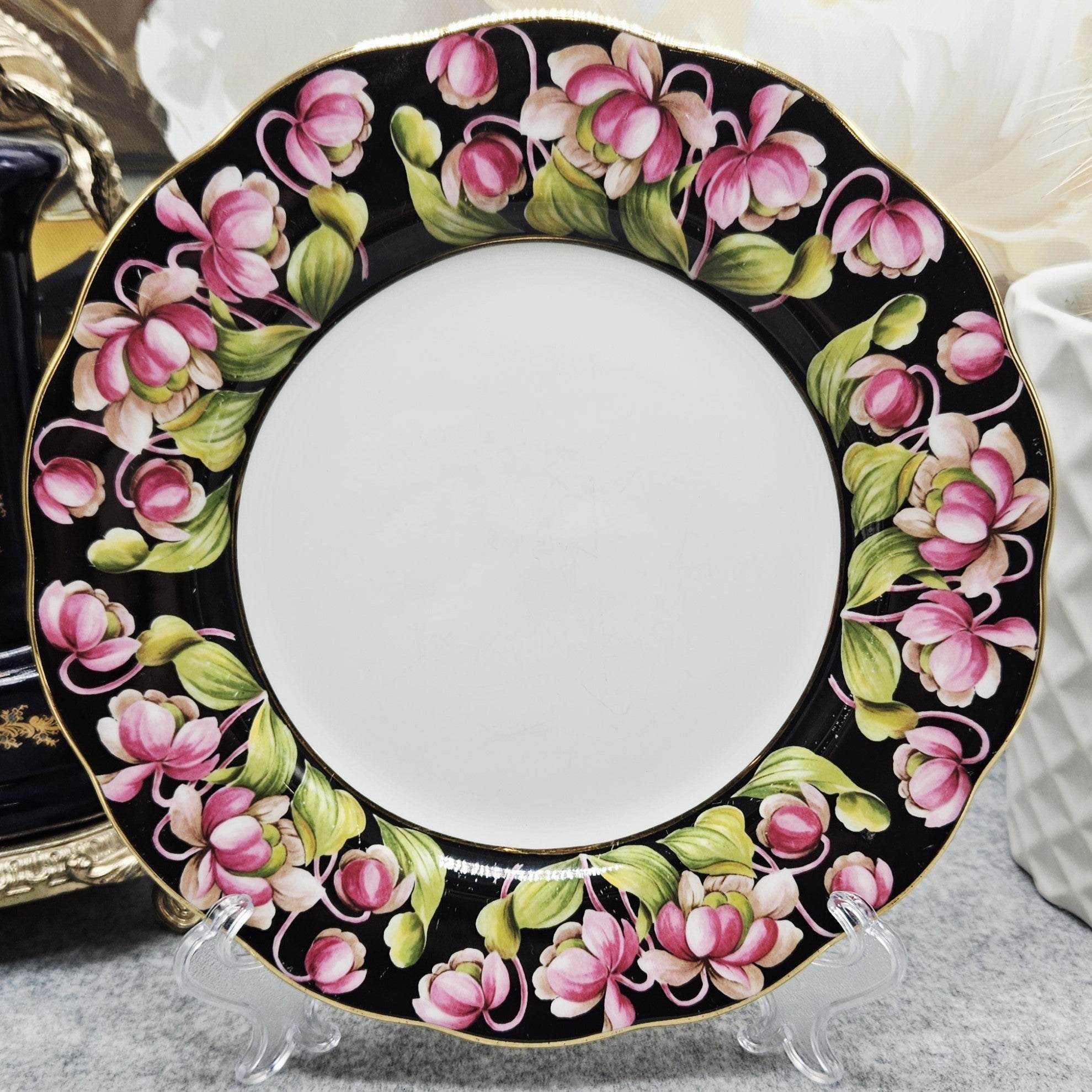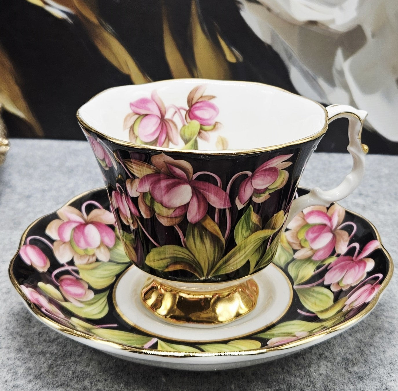 Komplektas dekoruotas sodriais žiedų motyvais tamsiame fone, subtiliai paryškintais auksiniais akcentais. Grakšti puodelio forma, auksu dengta kojelė ir rankenėlė suteikia rinkiniui prabangos pojūtį. Tai išskirtinis, dekoratyvus komplektas, puikiai tinkantis tiek kolekcijai, tiek iškilmingam stalo serviravimui.
