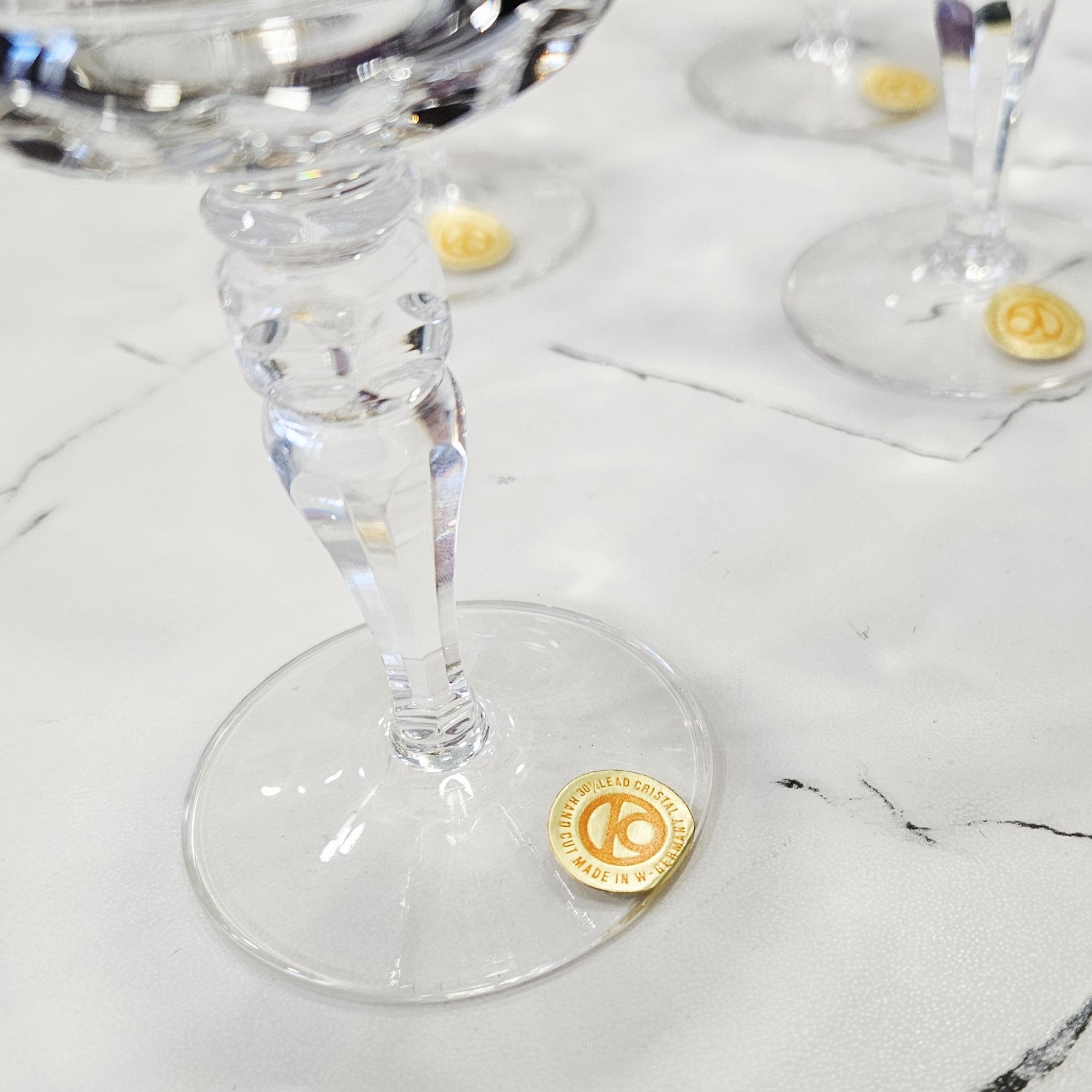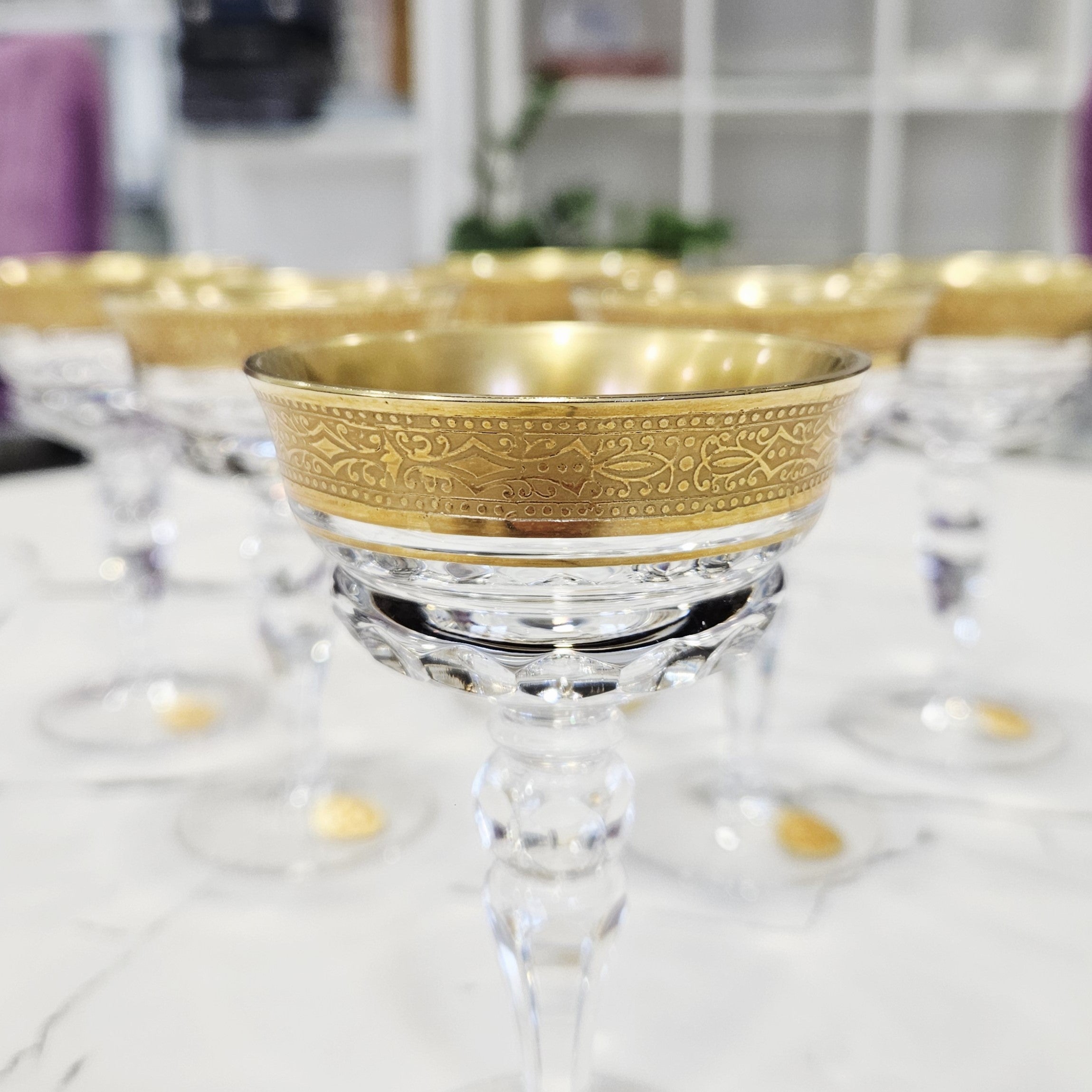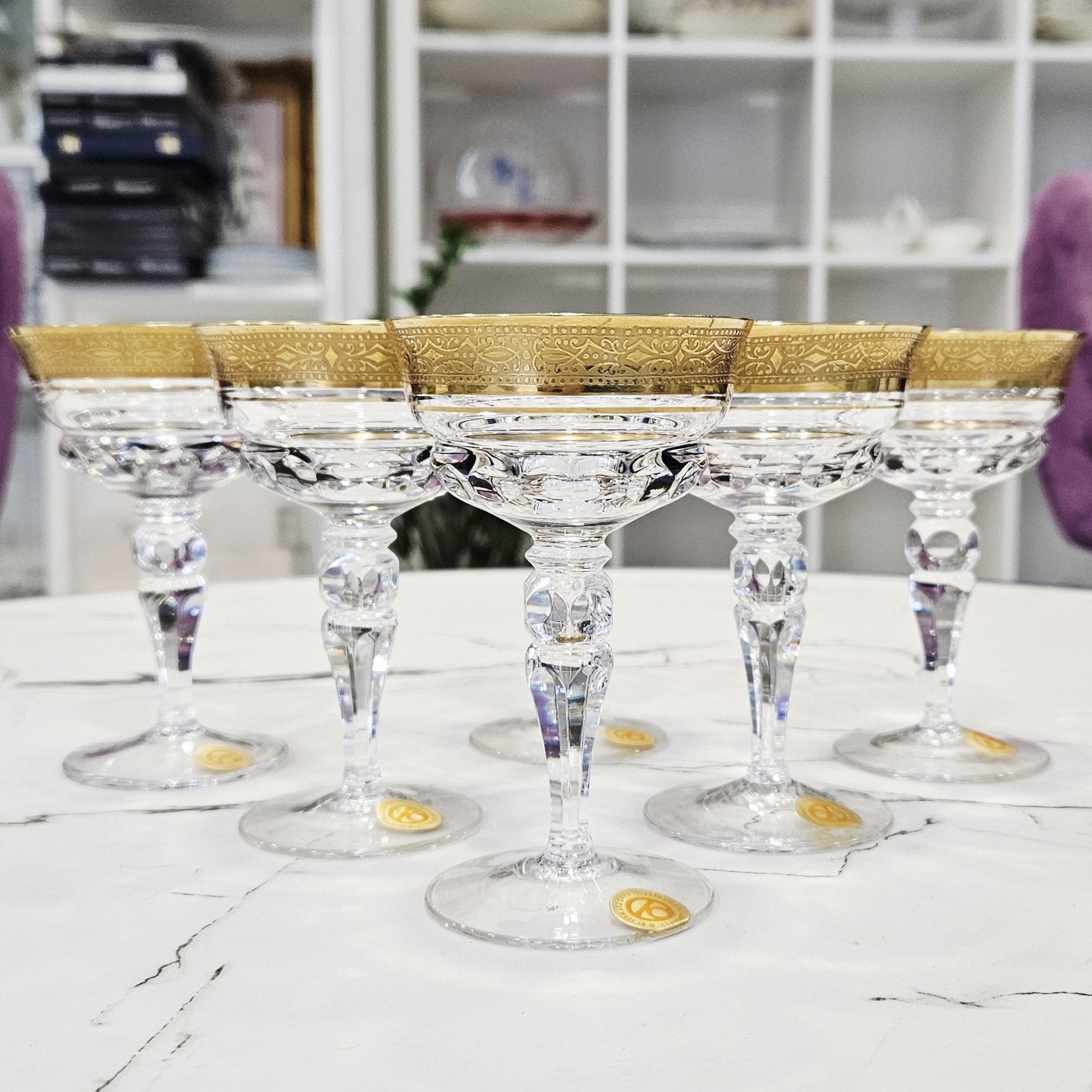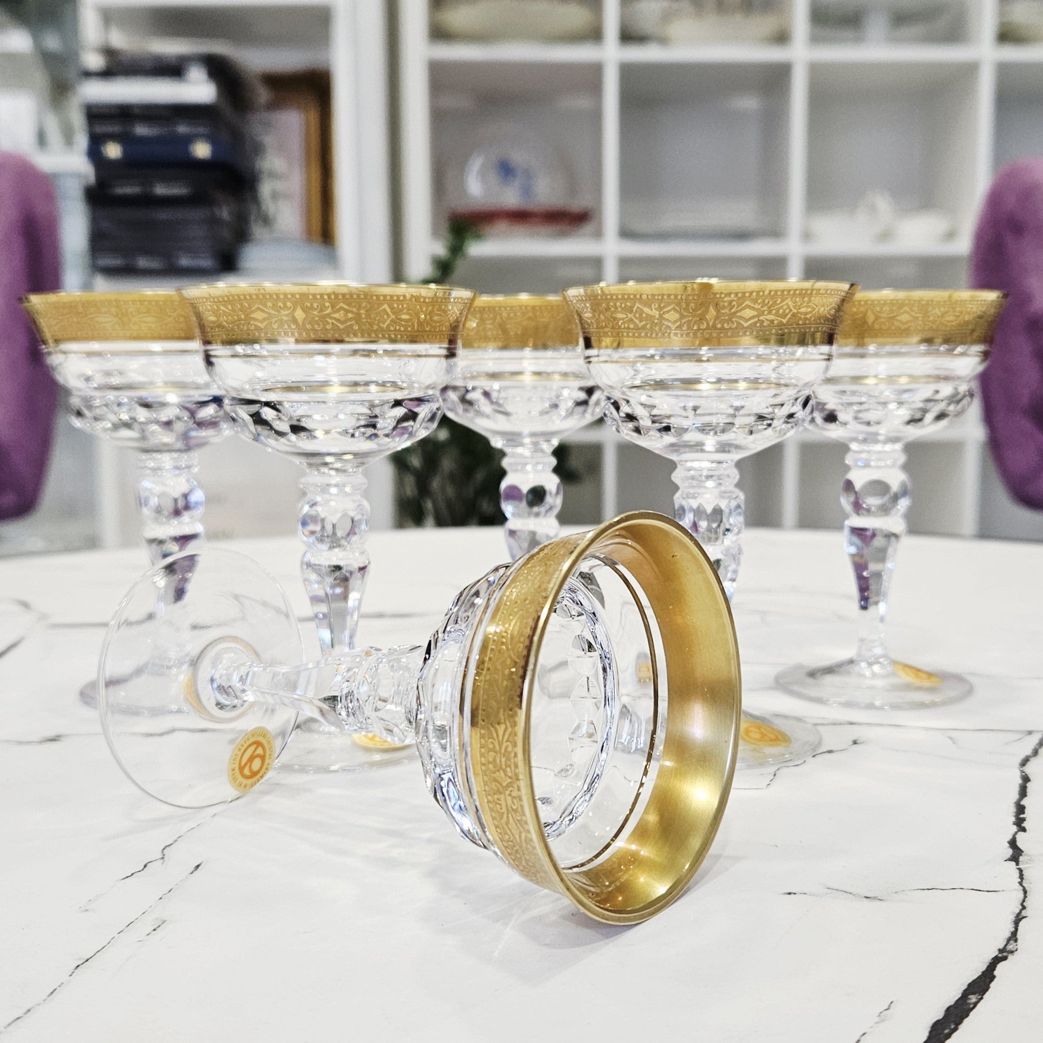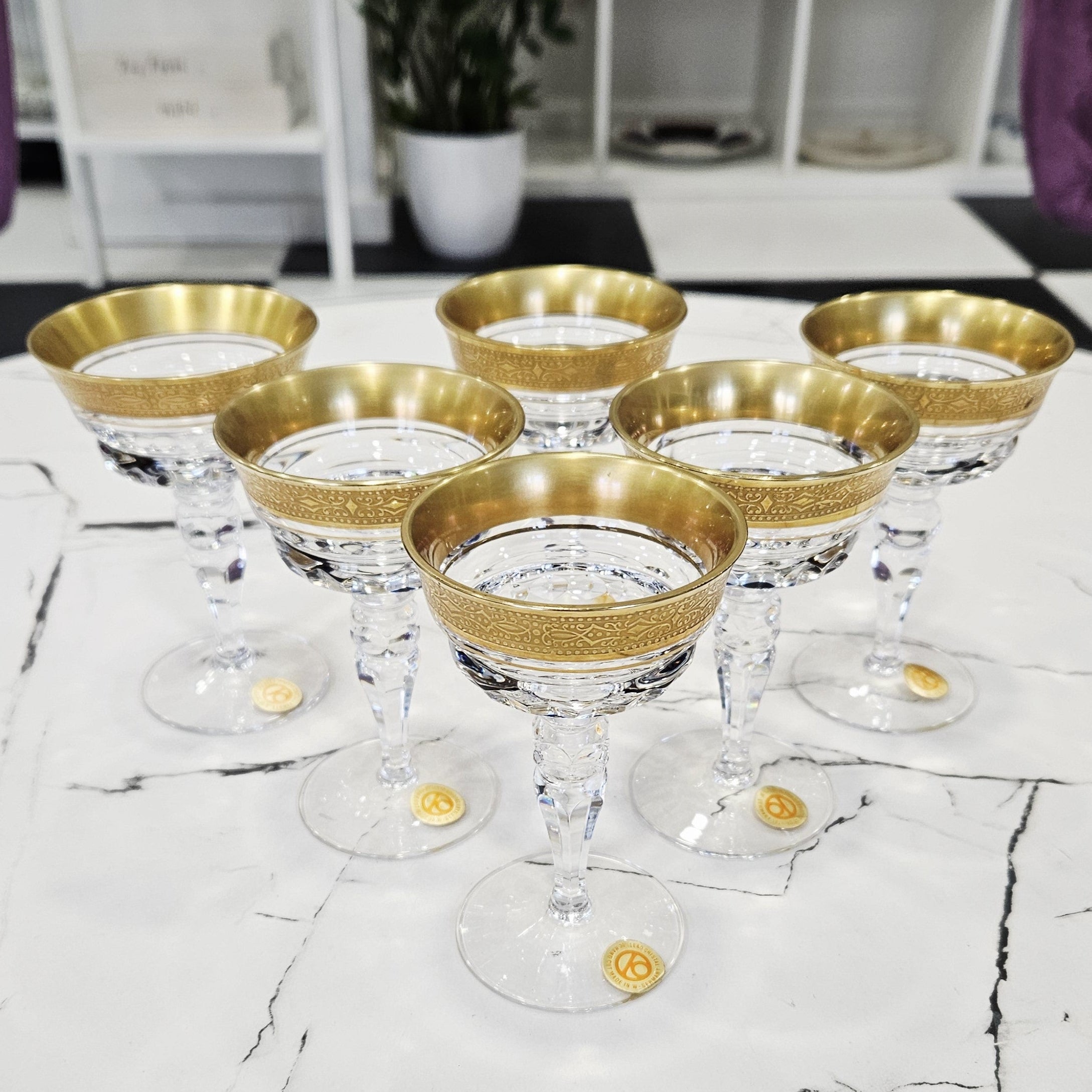 Prabangios vokiško krištolo taurelės saldžiam vynui/ likeriui/ martini. Puikiai tinka desertams pateikti. Pagamintos iš aukščiausios kokybės 30% švino krištolo ir puoštos 24K auksuota juostele, kuri suteikia išskirtinės prabangos ir klasikinės elegancijos pojūtį.