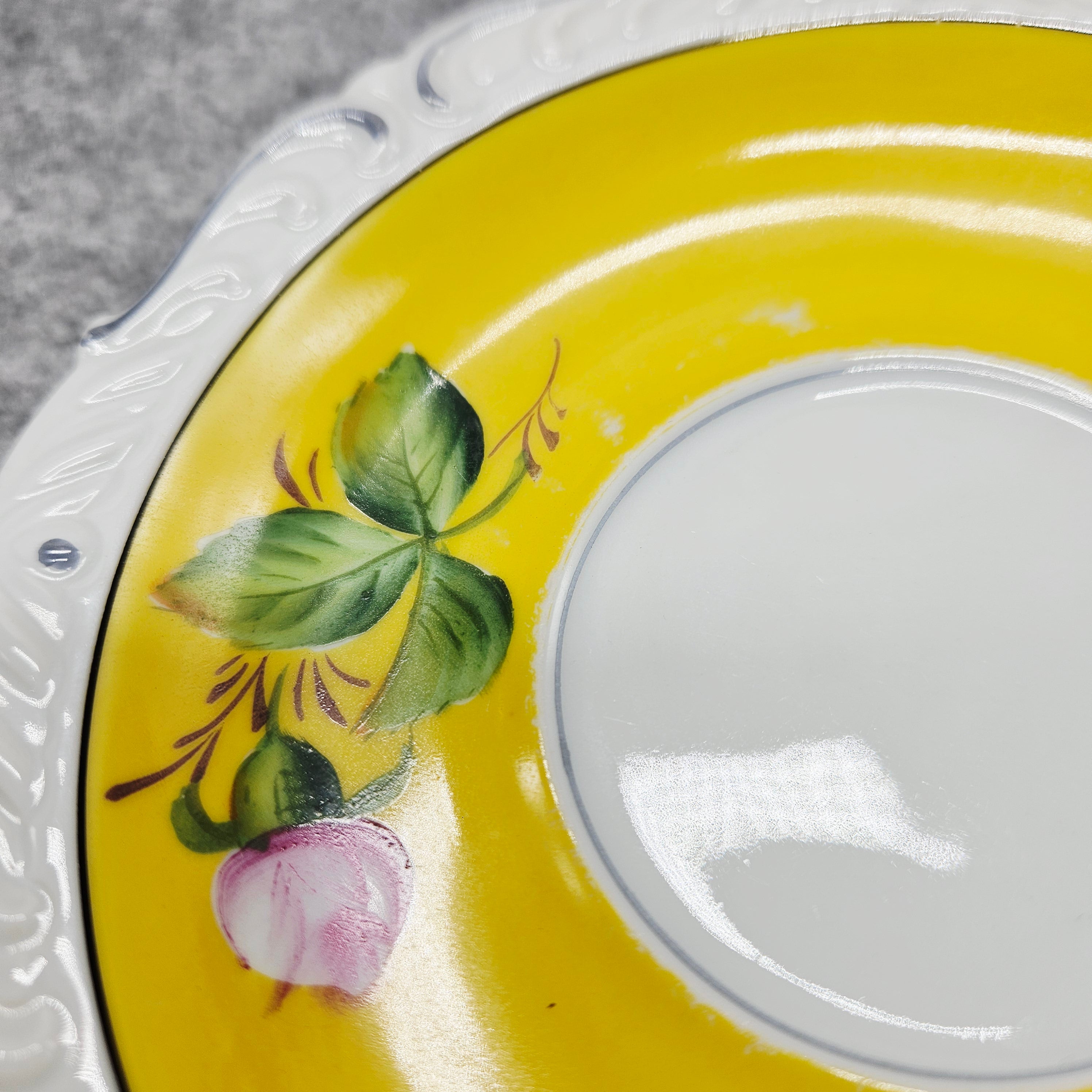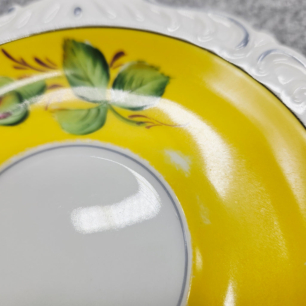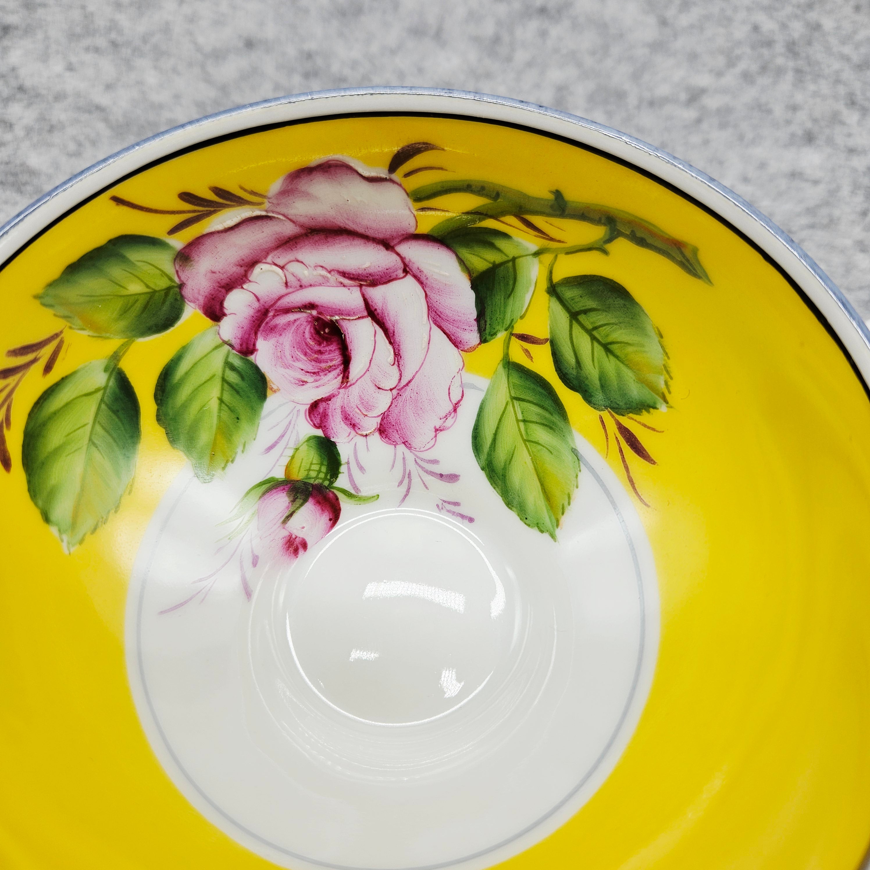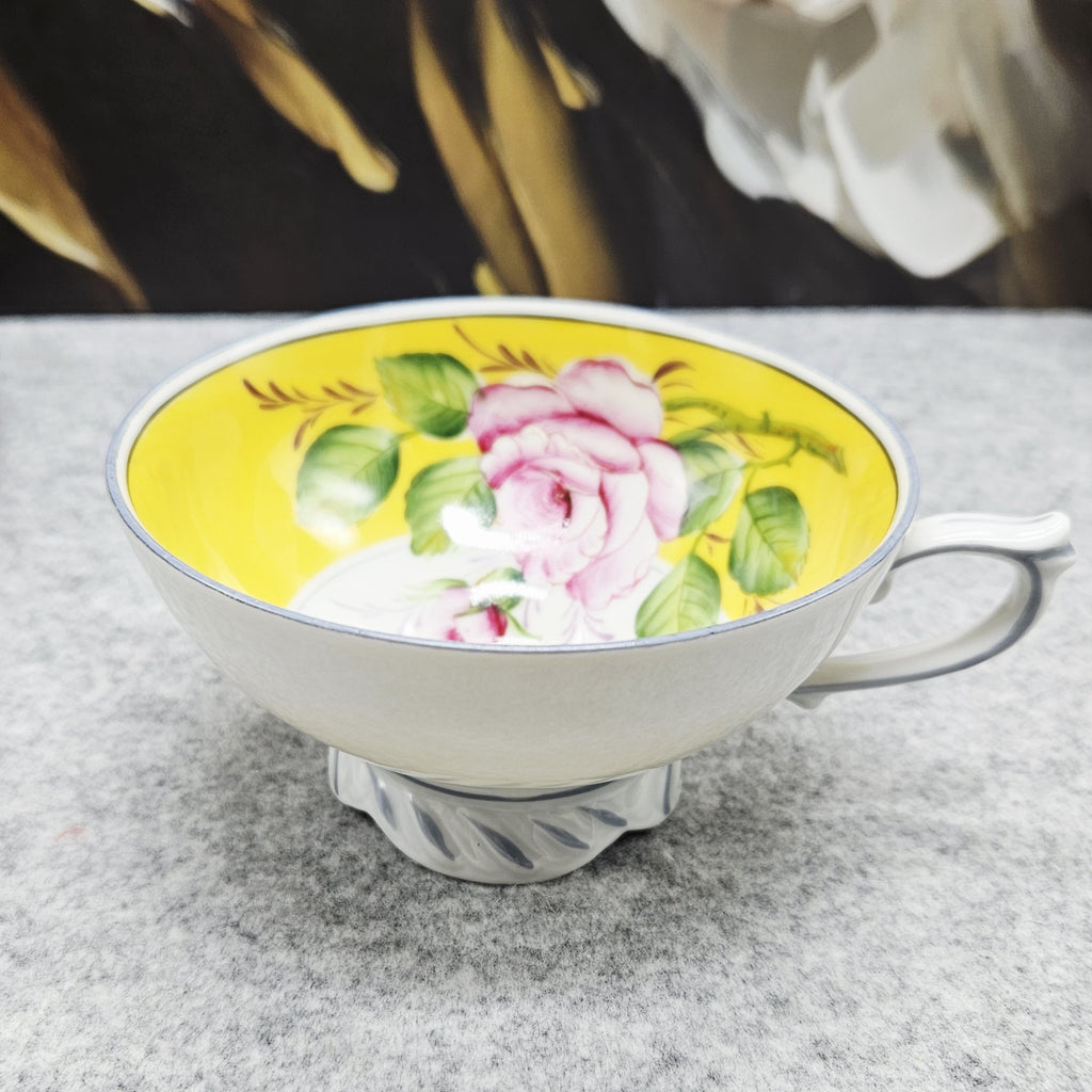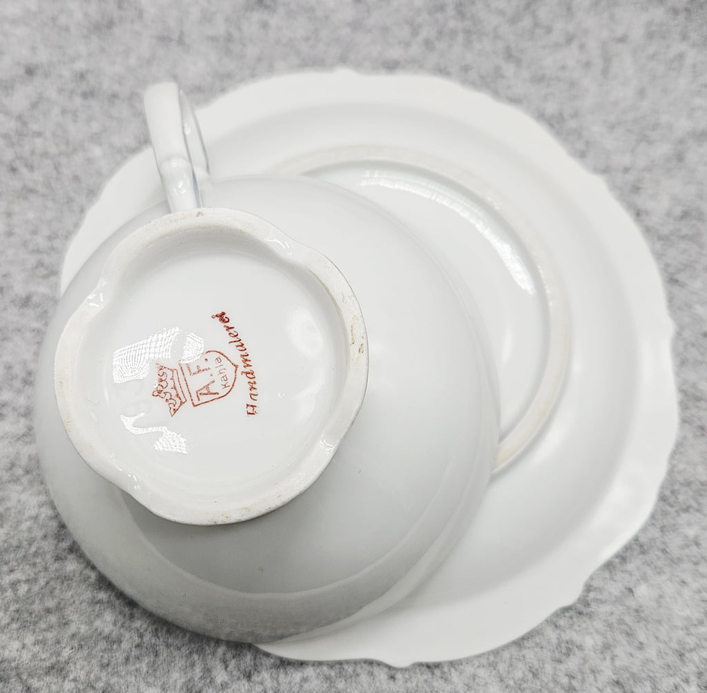 Tai elegantiškas, ryškiai dekoruotas „A. F. Kahla“ porceliano puodelis. Jo vidinė dalis nuspalvinta saulėtu geltonu fonu, kurį puošia ranka tapyta rožė ir sodrūs žalių lapų potėpiai. Išorė – švelniai balta, subtiliai reljefinė, papildyta švelnia pilka linija, suteikiančia lengvumo. Puodelį lydi deranti lėkštutė su tuo pačiu žaismingu gėlių dekoru. Tai žavingas, romantiškas retro stiliaus gaminys, išsiskiriantis spalvine šiluma ir kruopščiu rankų darbu.