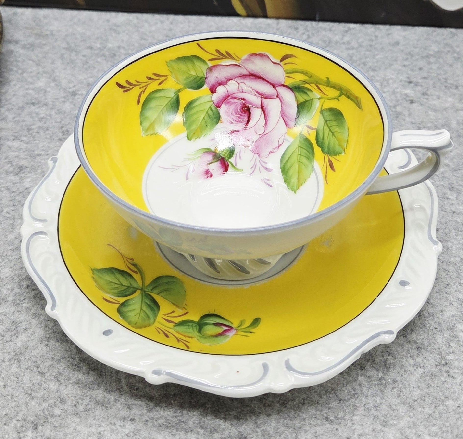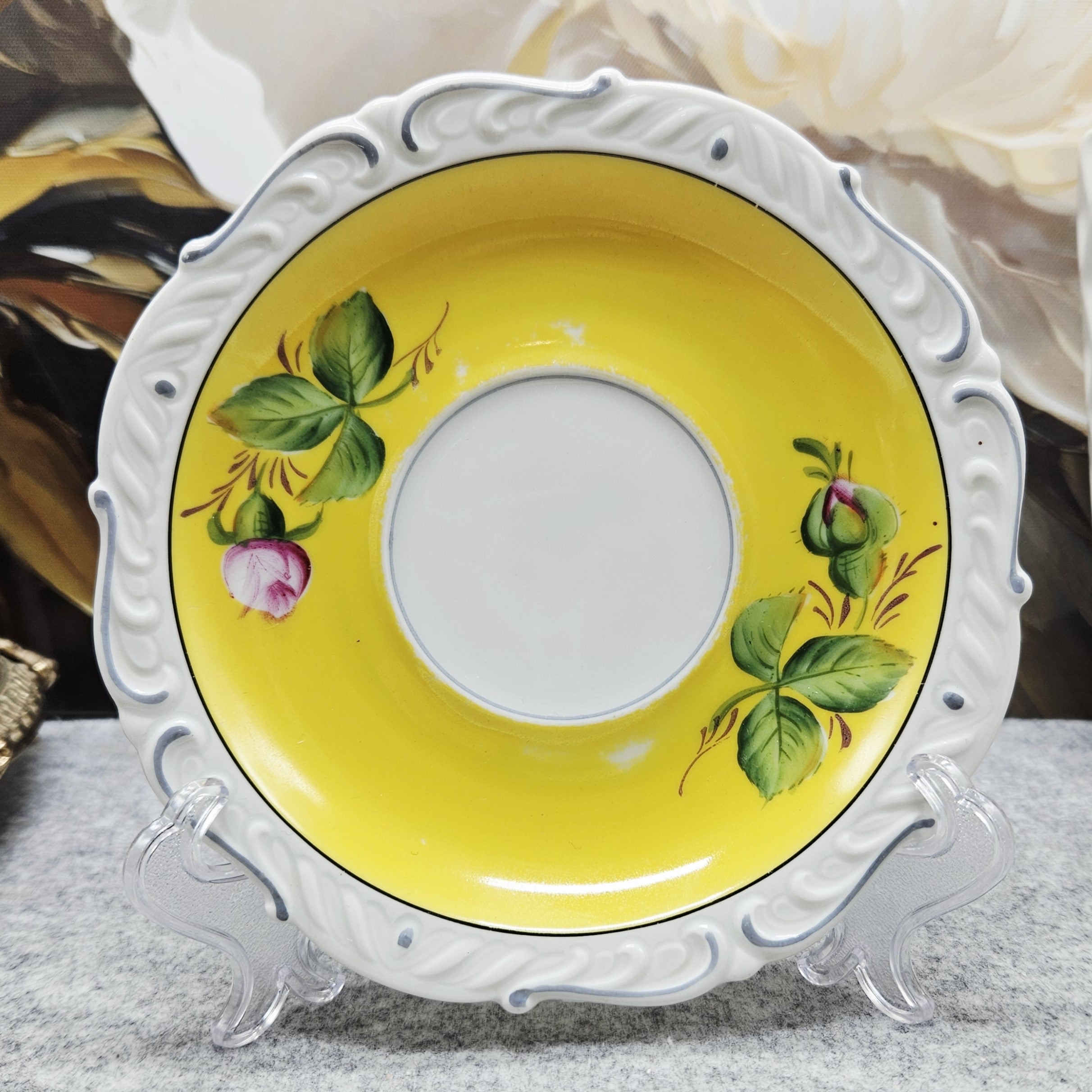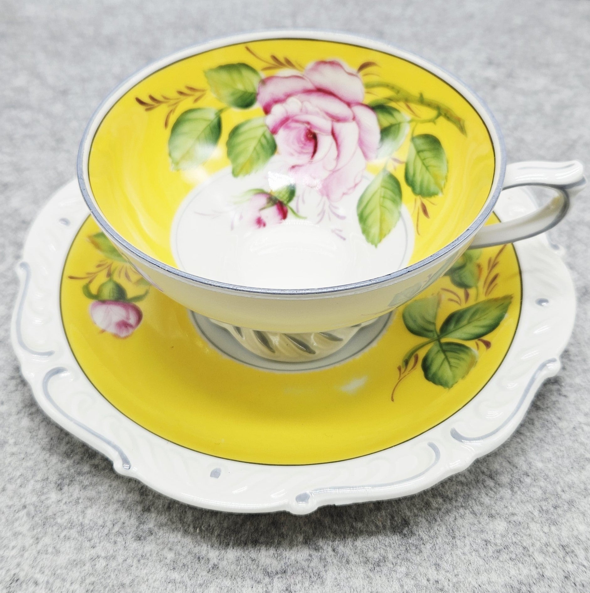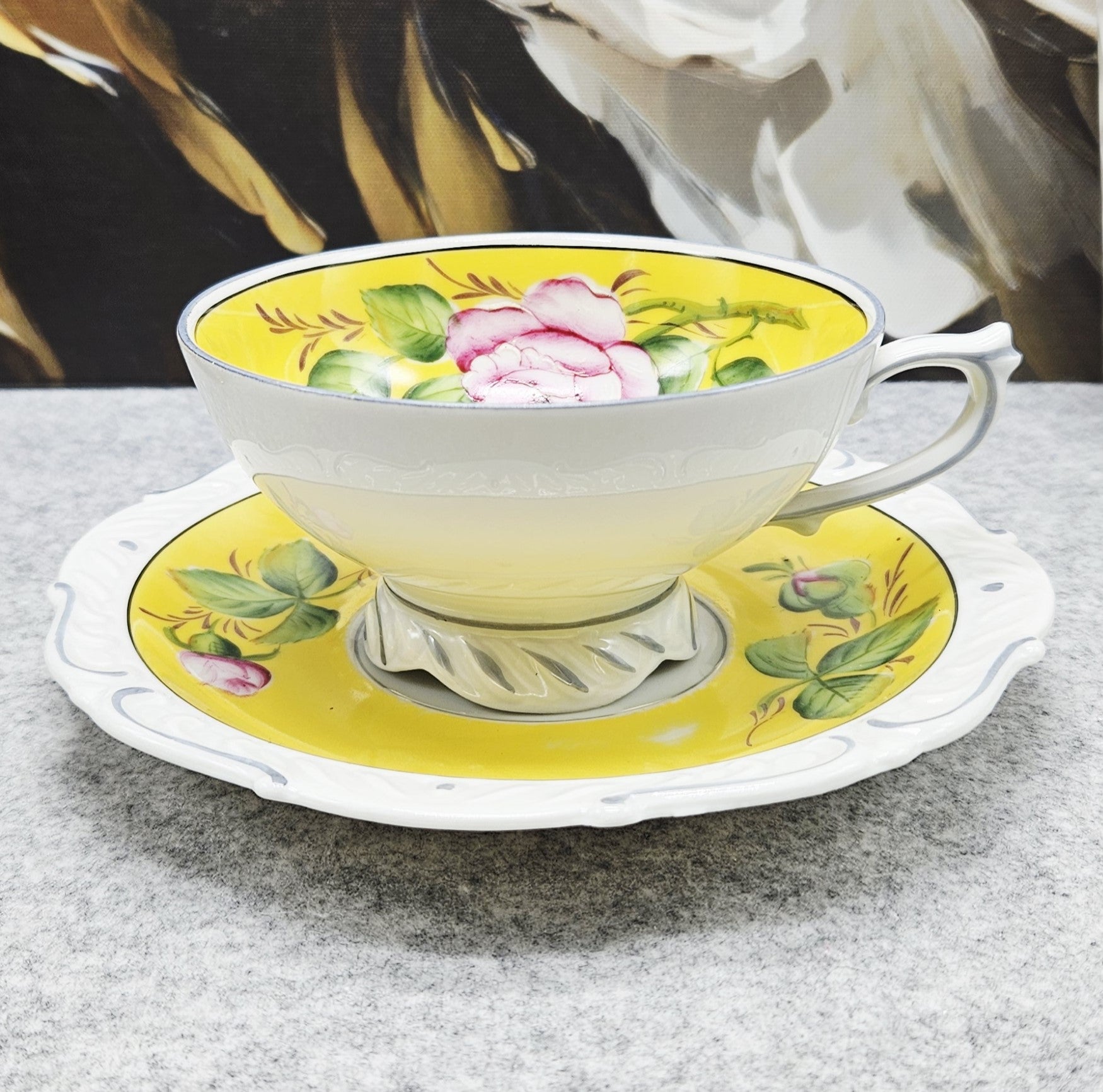Tai elegantiškas, ryškiai dekoruotas „A. F. Kahla“ porceliano puodelis. Jo vidinė dalis nuspalvinta saulėtu geltonu fonu, kurį puošia ranka tapyta rožė ir sodrūs žalių lapų potėpiai. Išorė – švelniai balta, subtiliai reljefinė, papildyta švelnia pilka linija, suteikiančia lengvumo. Puodelį lydi deranti lėkštutė su tuo pačiu žaismingu gėlių dekoru. Tai žavingas, romantiškas retro stiliaus gaminys, išsiskiriantis spalvine šiluma ir kruopščiu rankų darbu.