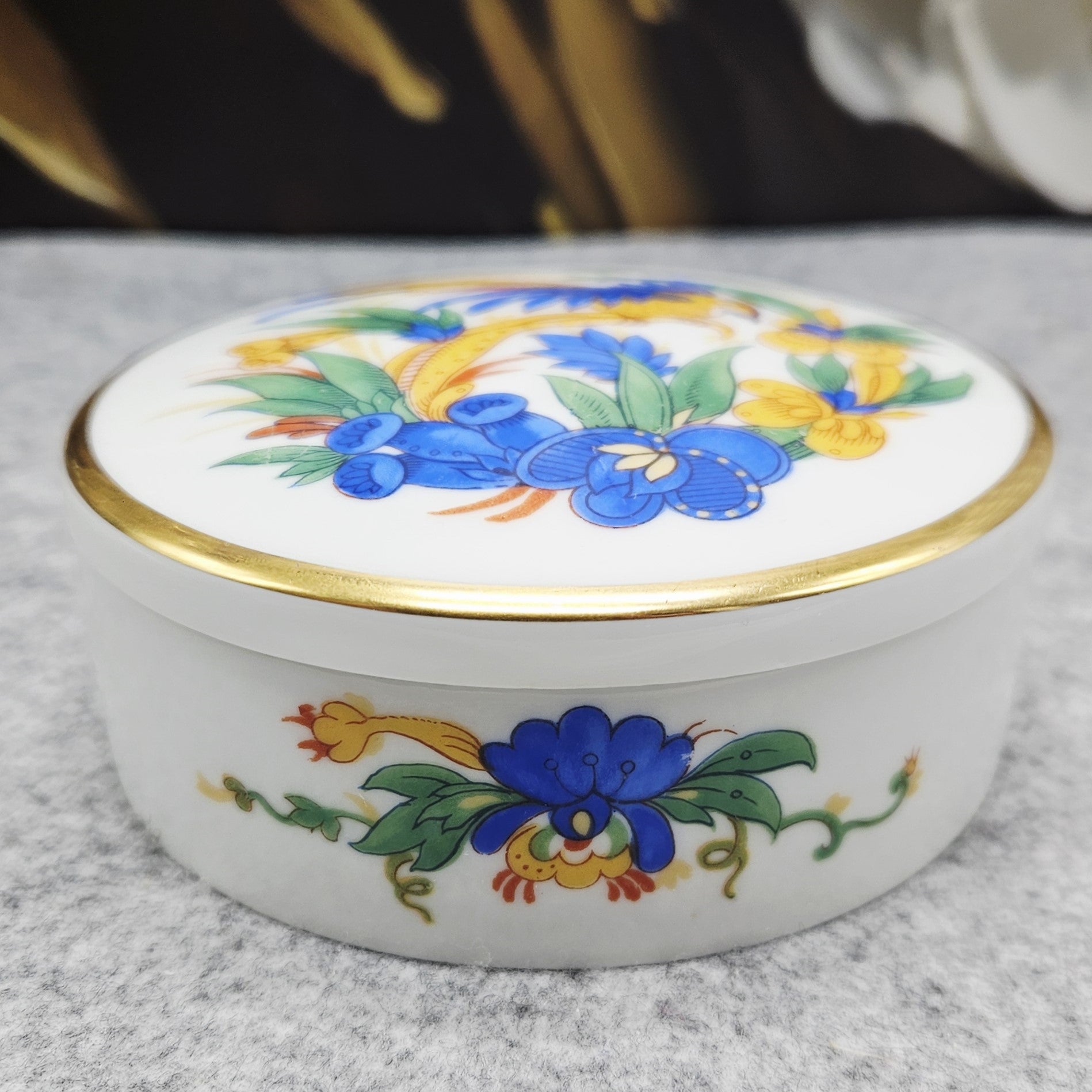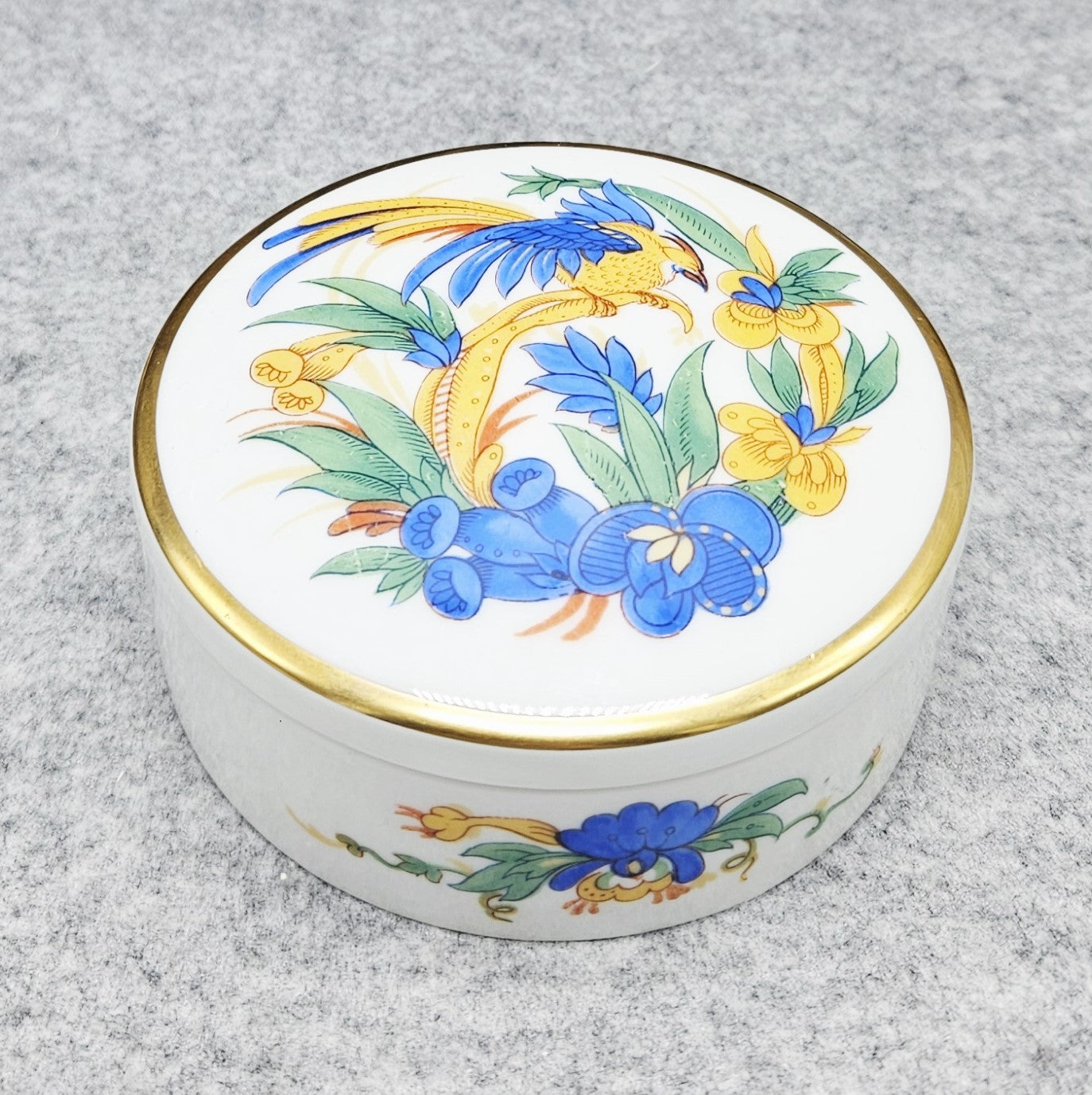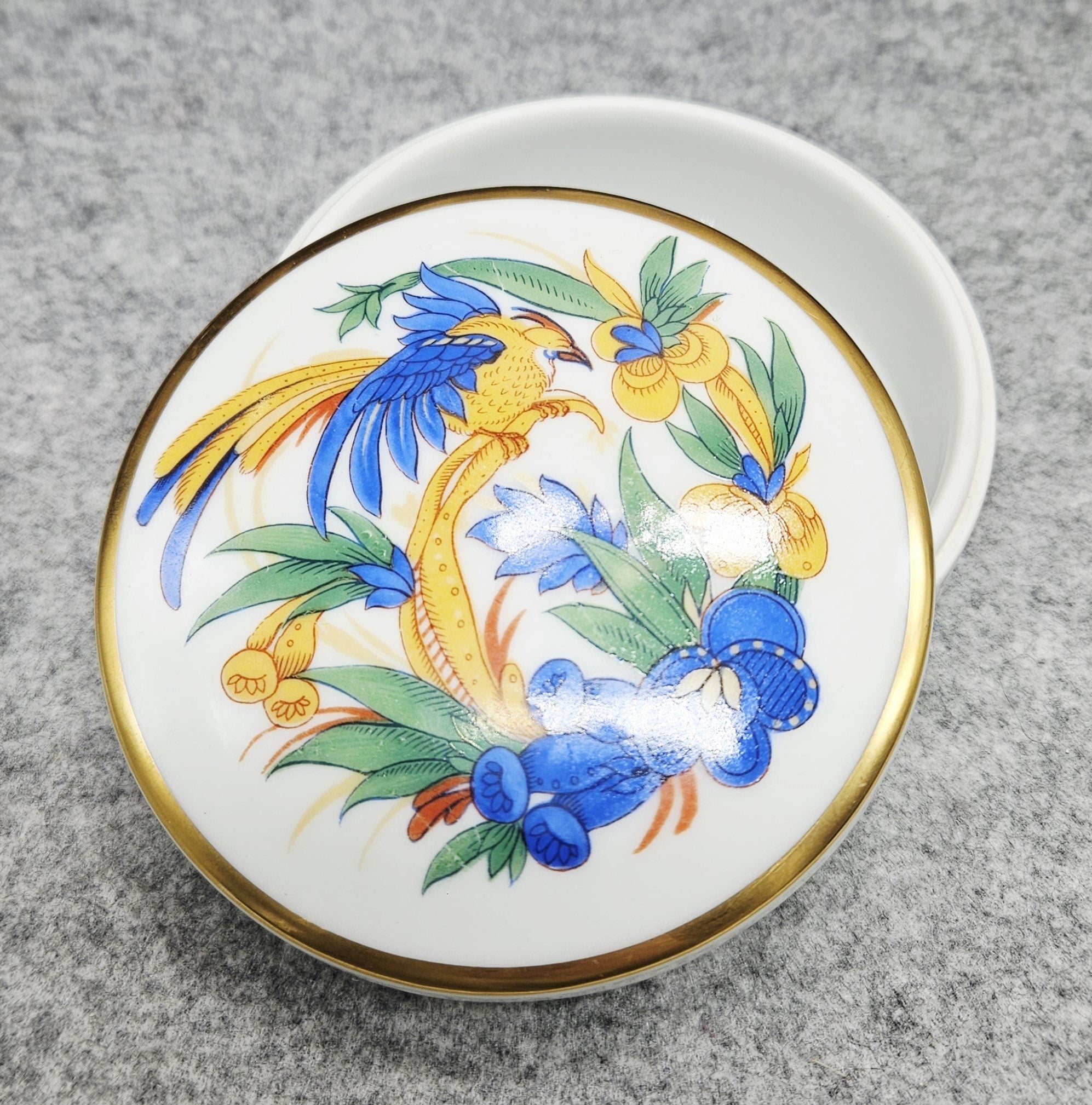 Šis prabangus dekoratyvinis „Rosenthal“ porceliano gaminys – unikali dėžutė, kuri papuoš bet kurį interjerą. Pagaminta iš aukščiausios kokybės balto porceliano, ji pasižymi klasikine apvalia forma ir subtilia elegancija. Dangtelis dekoruotas egzotiškų gėlių ir paukščio motyvu ryškiomis mėlynos, geltonos bei žalių atspalvių spalvomis, kurių kontrastas harmoningai derinamas su plona auksine juostele.
