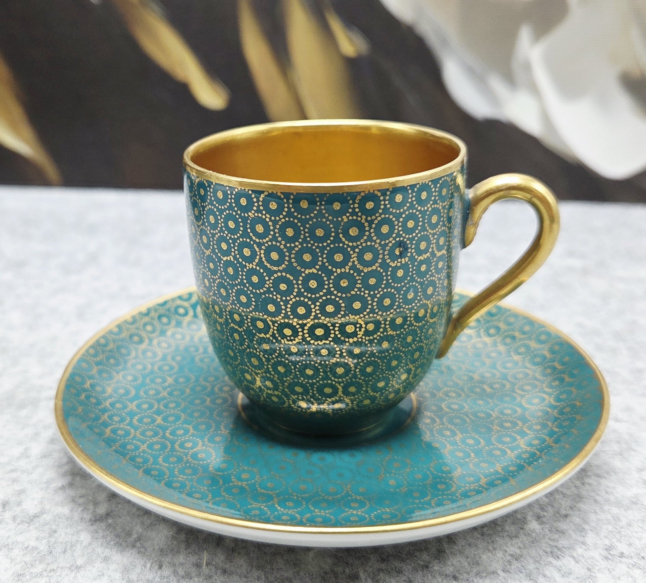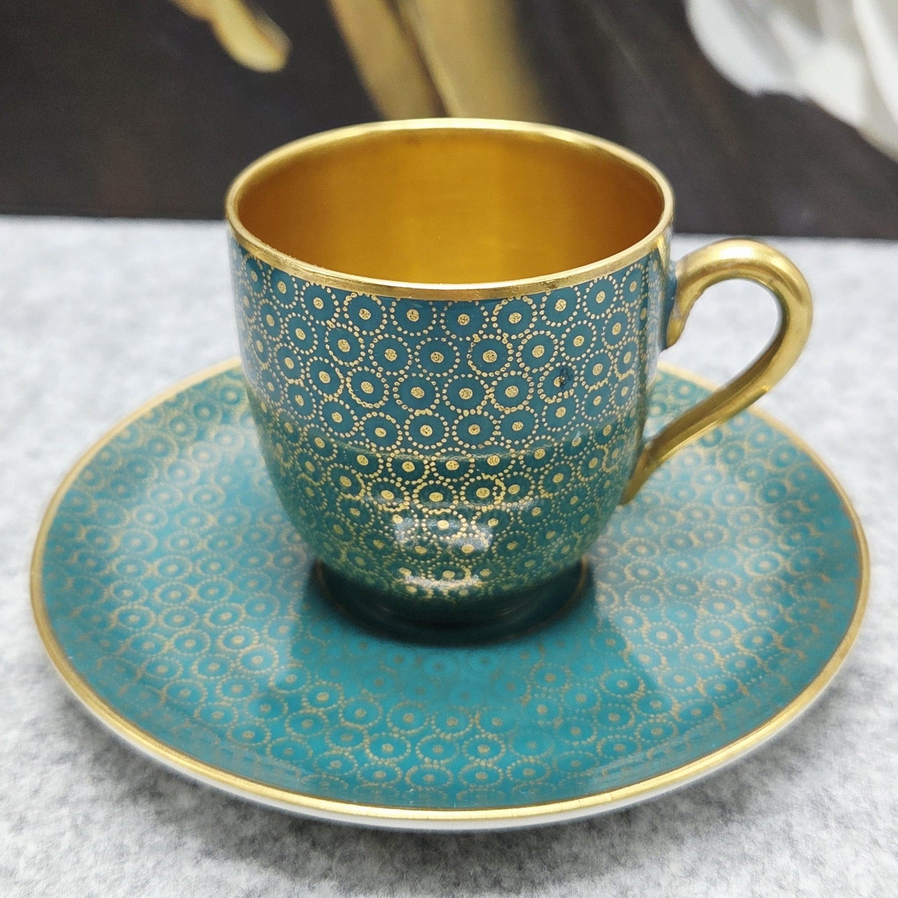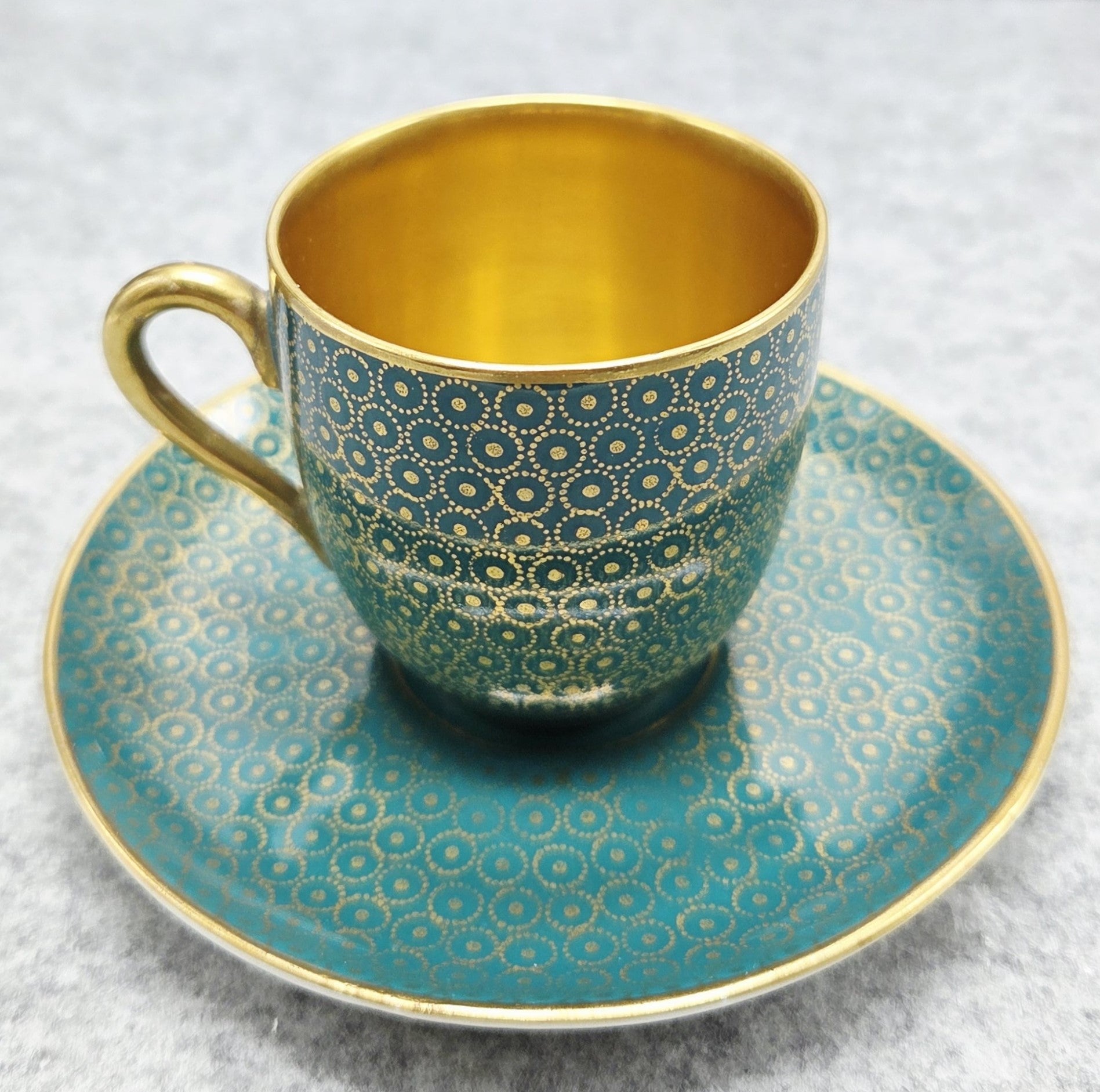 Šis rafinuotas rinkinys žavi sodria turkio spalva, dekoruota subtiliu auksu dengtu geometriniu ornamentu, kuris sukuria išskirtinį, beveik juvelyrinį efektą. Puodelio vidus padengtas aukso spalvos glazūra, suteikiančia ypatingą prabangos pojūtį kiekvienam gurkšniui.