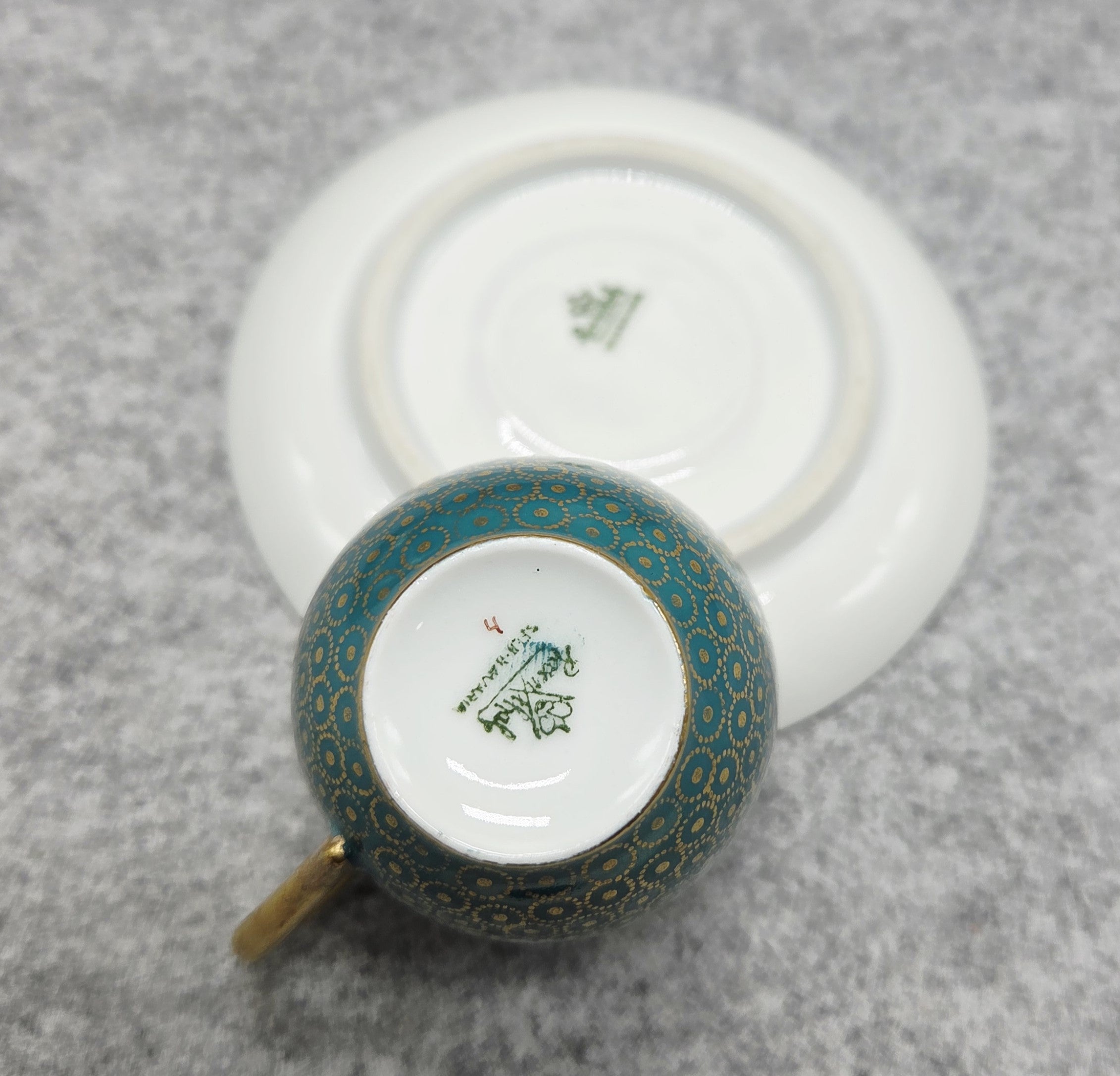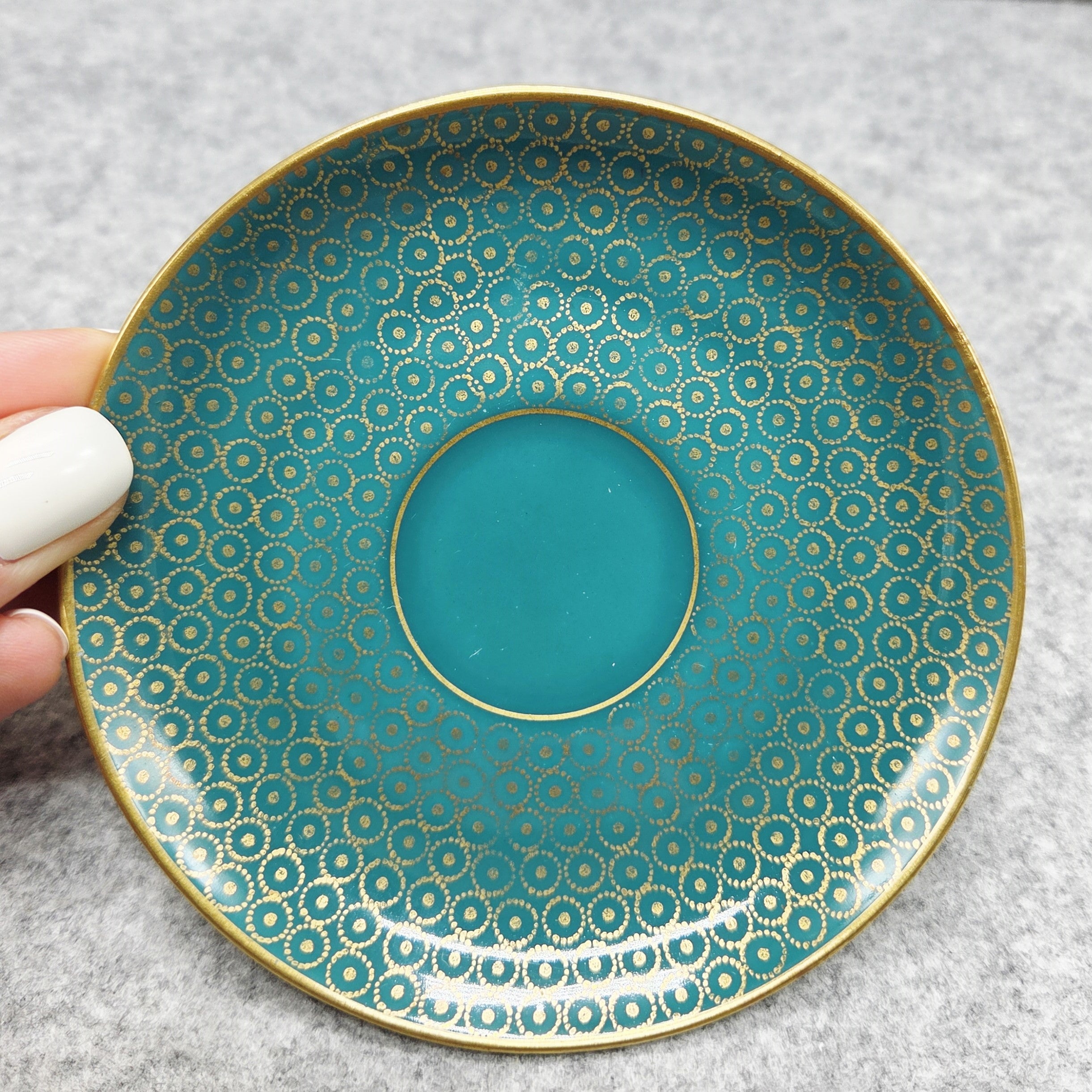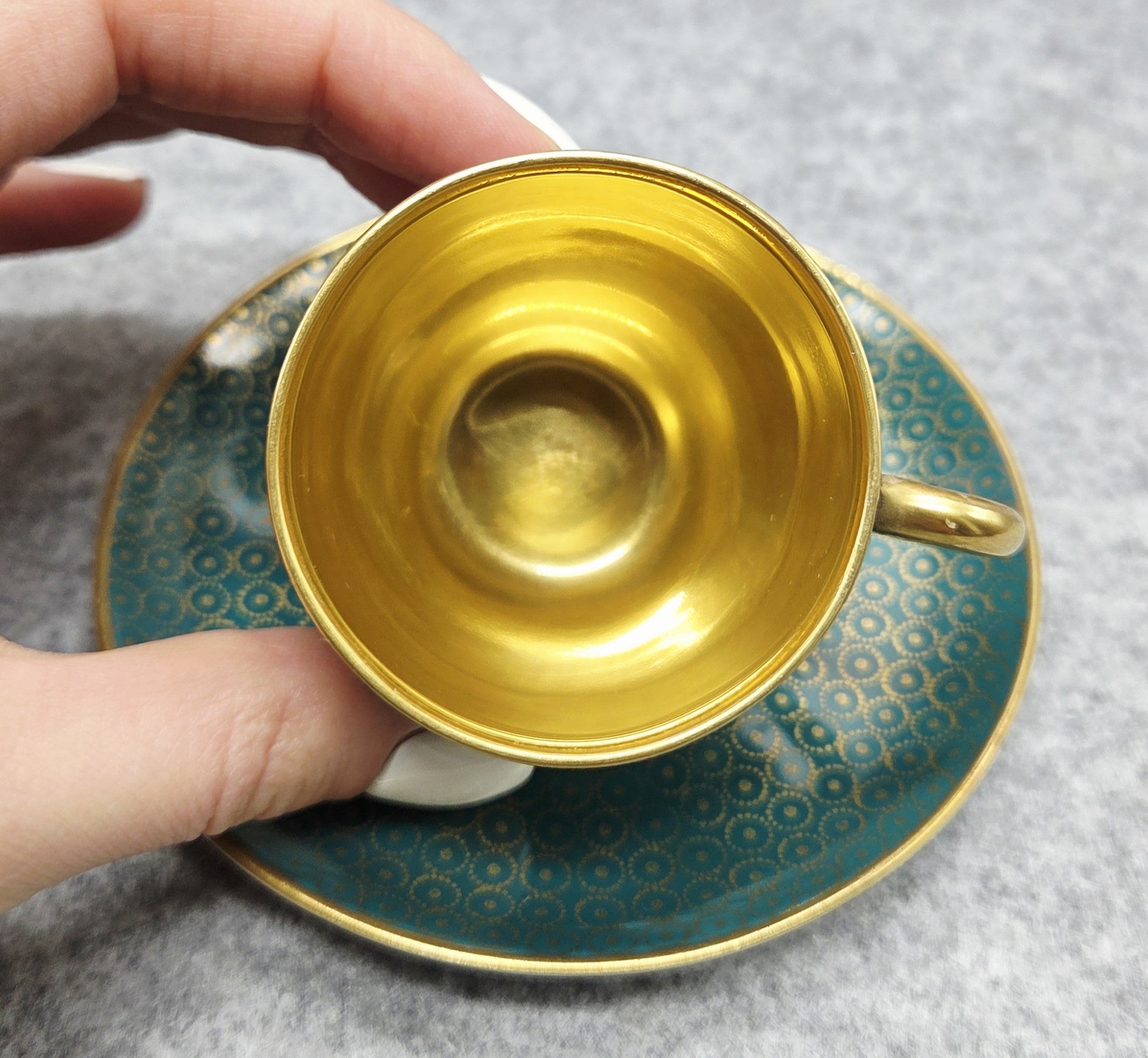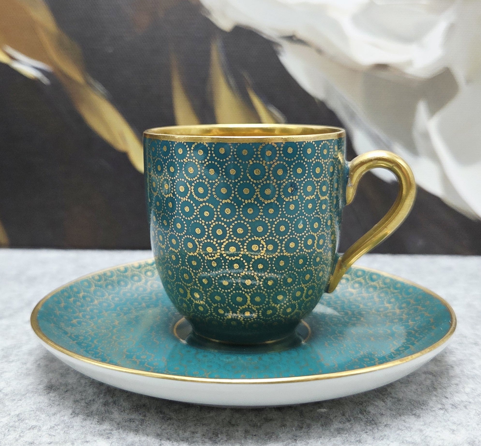 Šis rafinuotas rinkinys žavi sodria turkio spalva, dekoruota subtiliu auksu dengtu geometriniu ornamentu, kuris sukuria išskirtinį, beveik juvelyrinį efektą. Puodelio vidus padengtas aukso spalvos glazūra, suteikiančia ypatingą prabangos pojūtį kiekvienam gurkšniui.