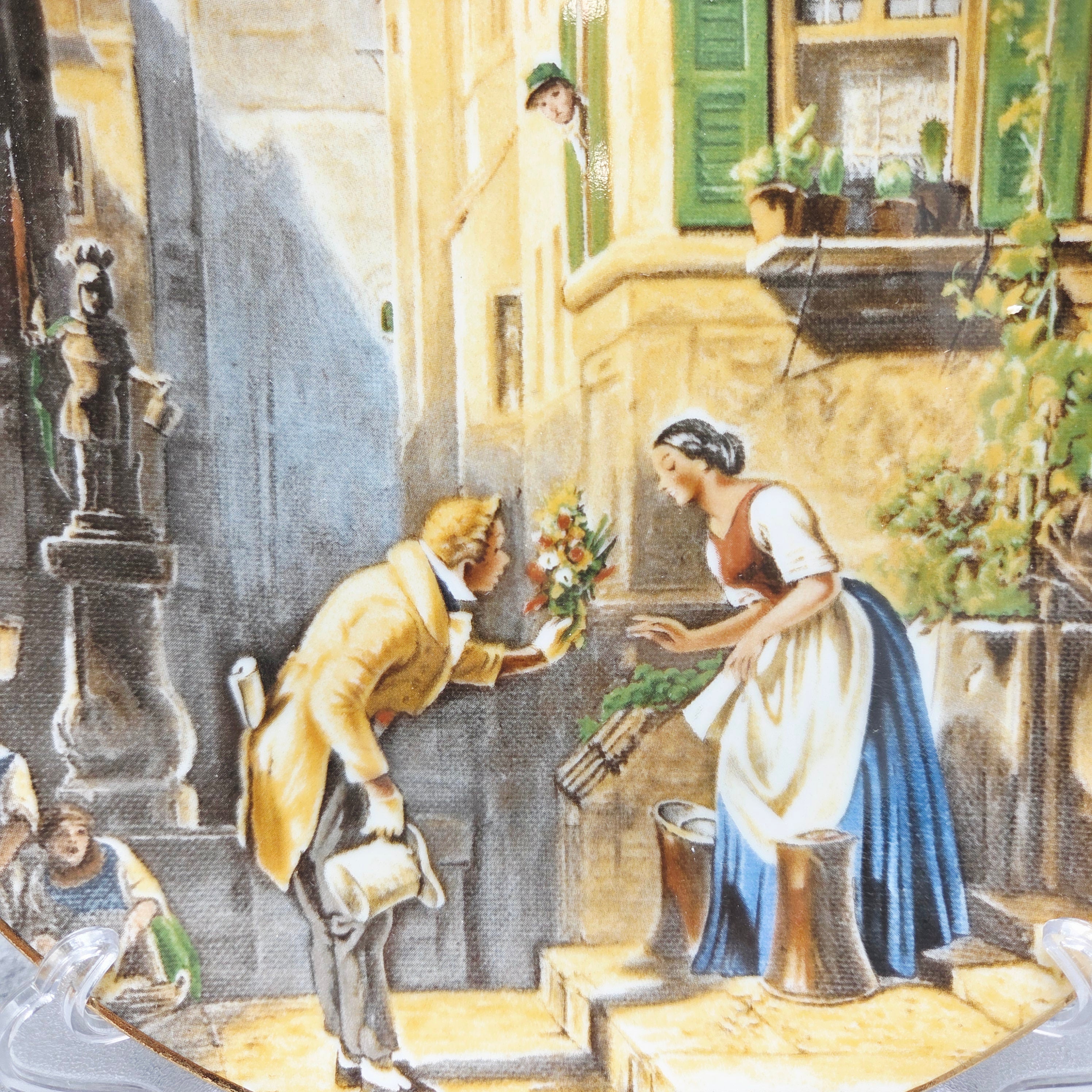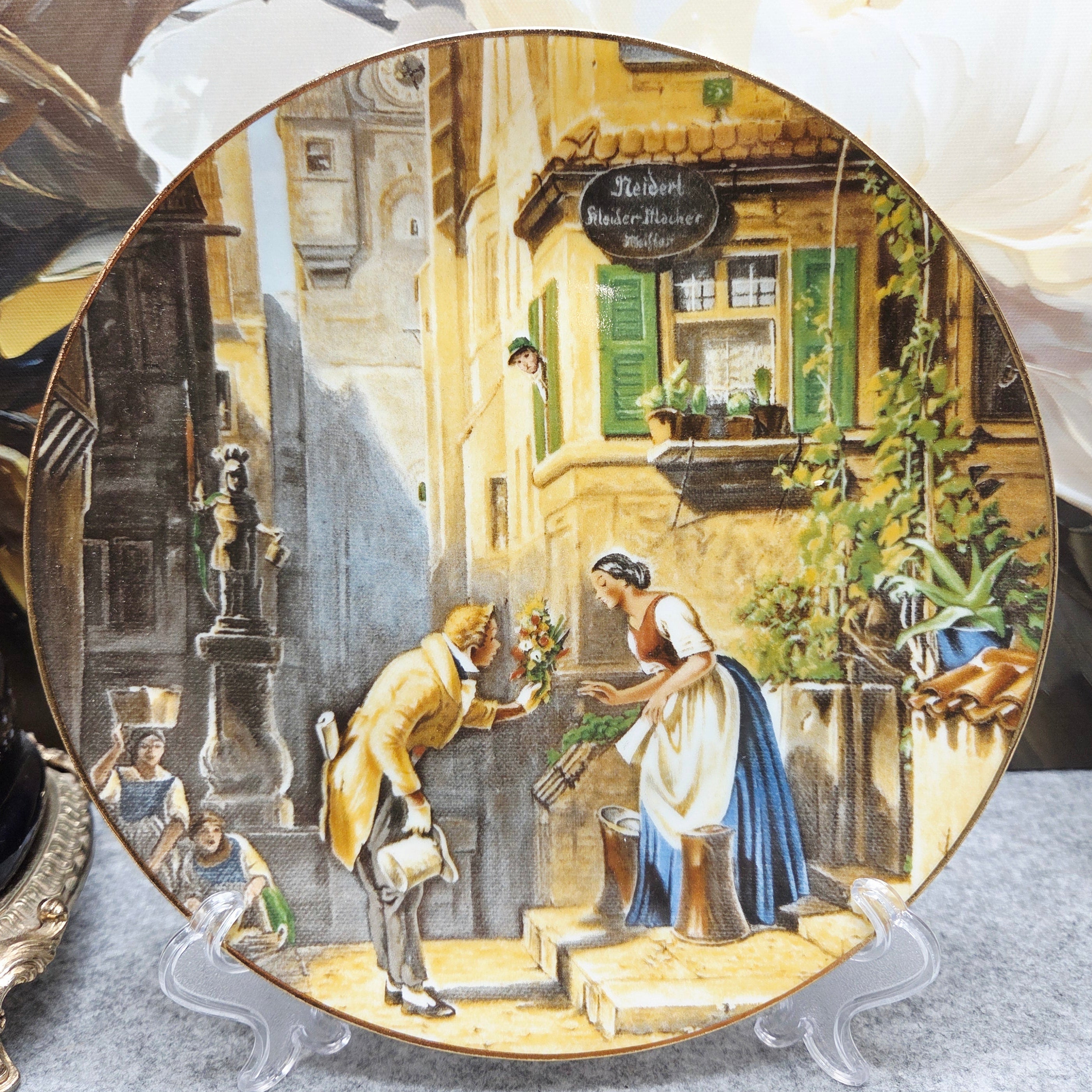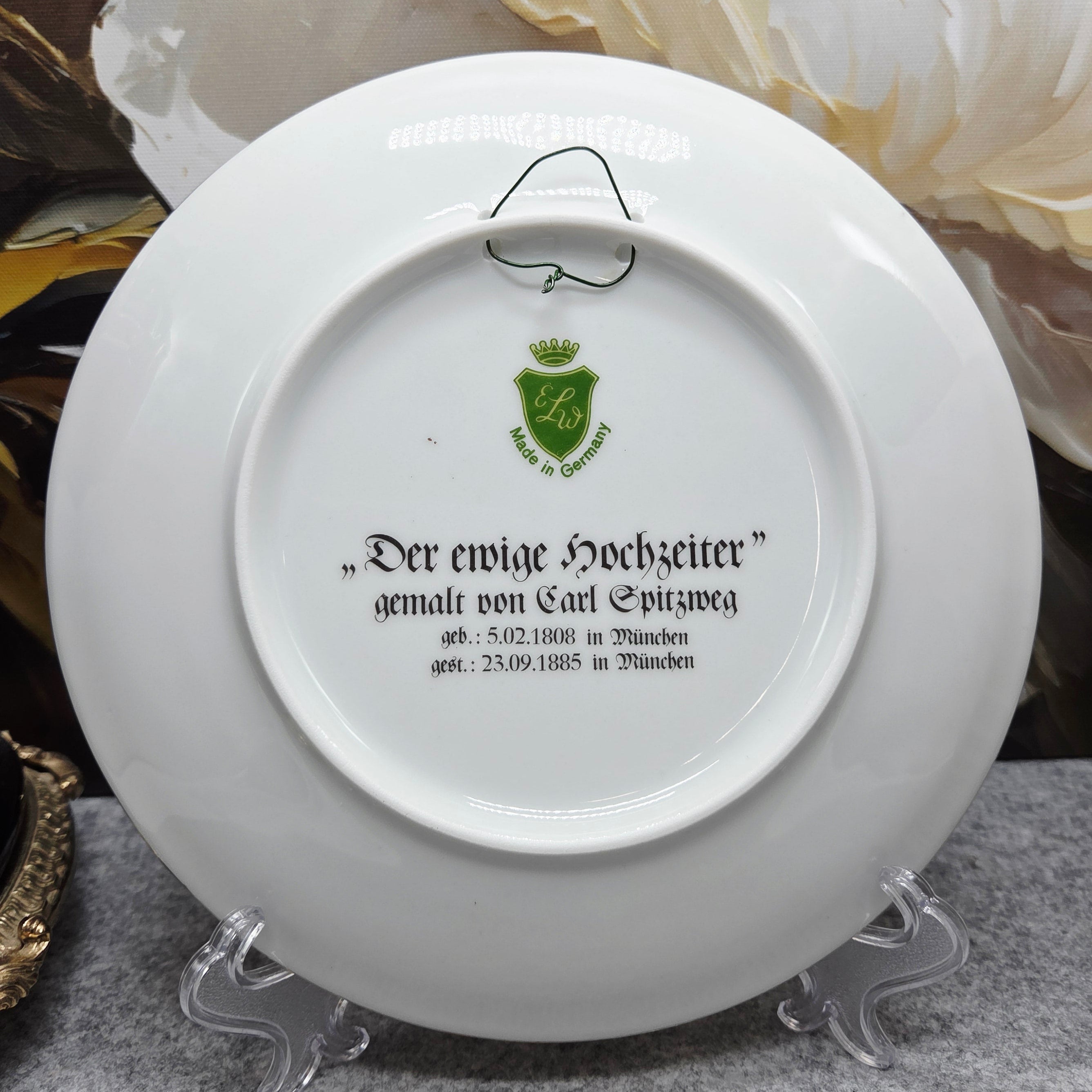 Elegantiška vokiško Ernst Leitner Weltarbeit (ELW) porceliano dekoratyvinė lėkštė, dekoruota romantine scena pagal garsaus XIX a. vokiečių dailininko Carl Spitzweg paveikslą „Der ewige Hochzeiter“ („Amžinas jaunikis“). Scenoje subtiliai perteikta nostalgiška miestelio atmosfera – džentelmenas su gėlių puokšte ir švelnus romantinis siužetas sukuria šiltą, pasakojimo kupiną nuotaiką.