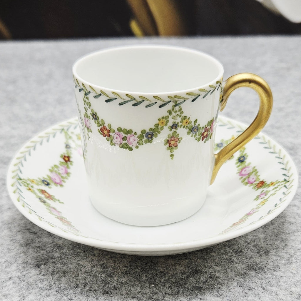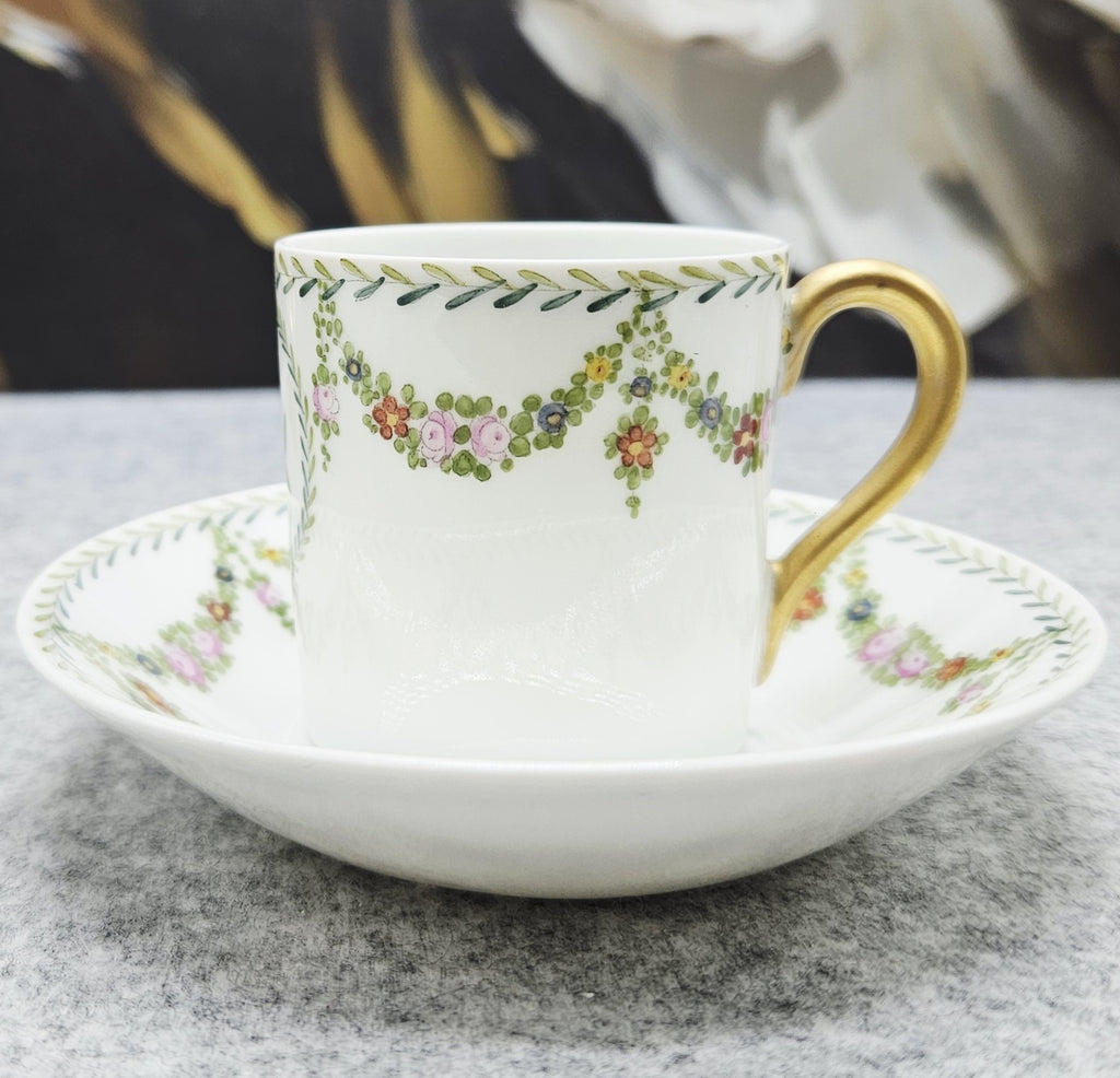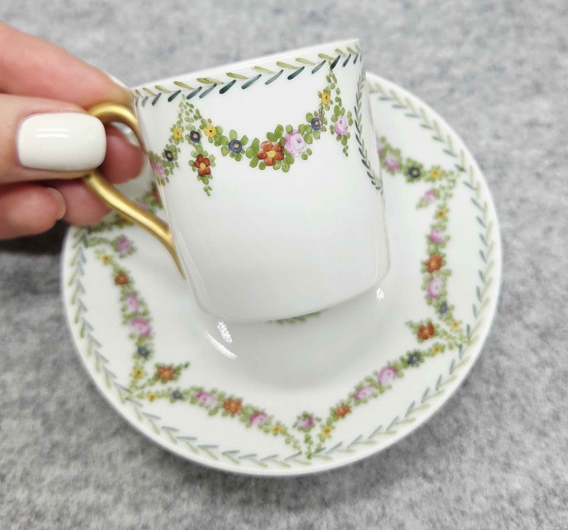 Nuostabus, „Nymphenburg“ plono porceliano kavos puodelis su lėkštute. Tapytas rankomis, kruopščiai išryškinta kiekvienos gėlės ar lapelio detalė, o išskirtinumo ir prabangos dirbiniui suteikia auksuota rankenėlė. Tai tikras meistriško rankų darbo ir itin gilių porceliano tradicijų pavyzdys.