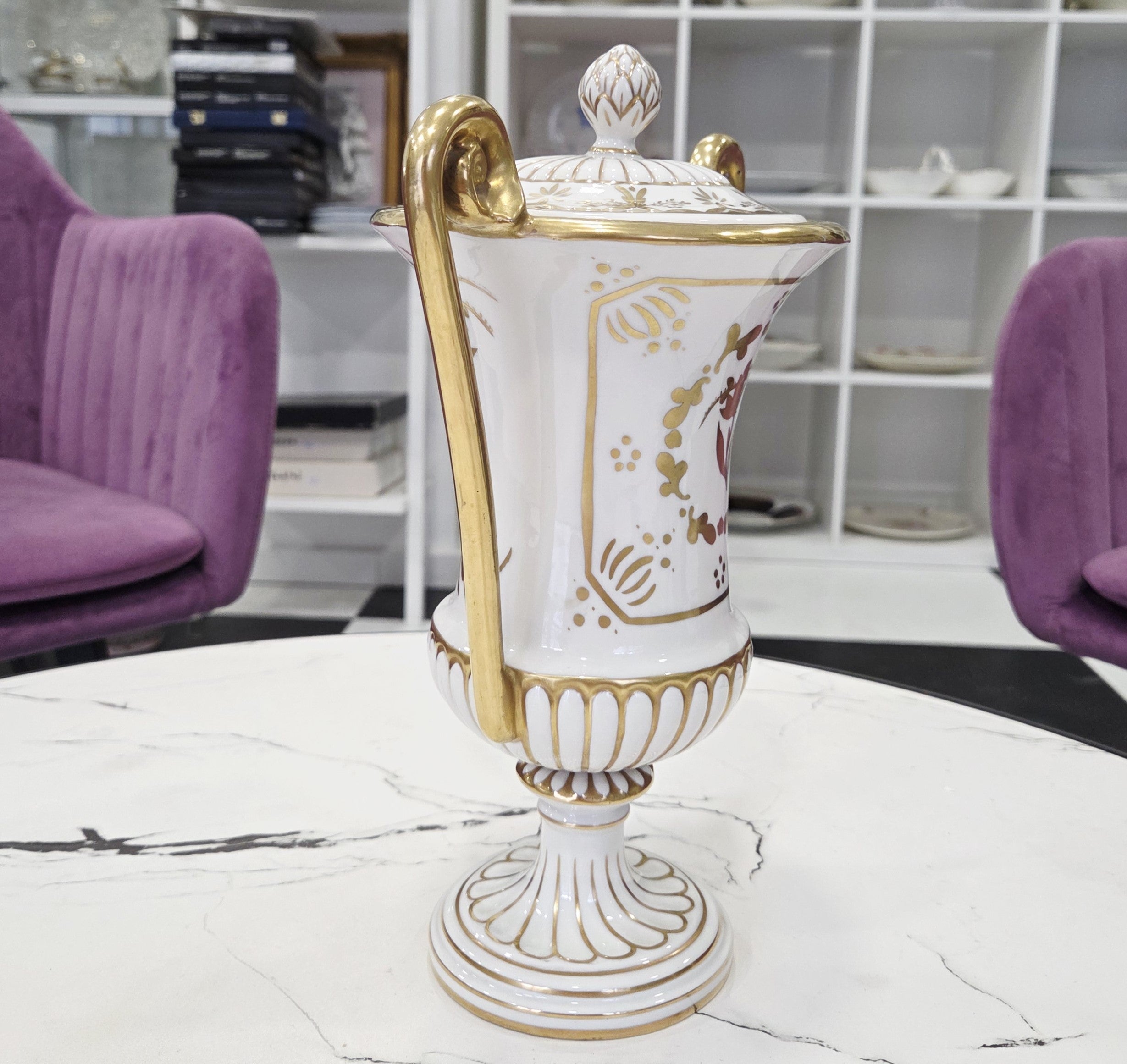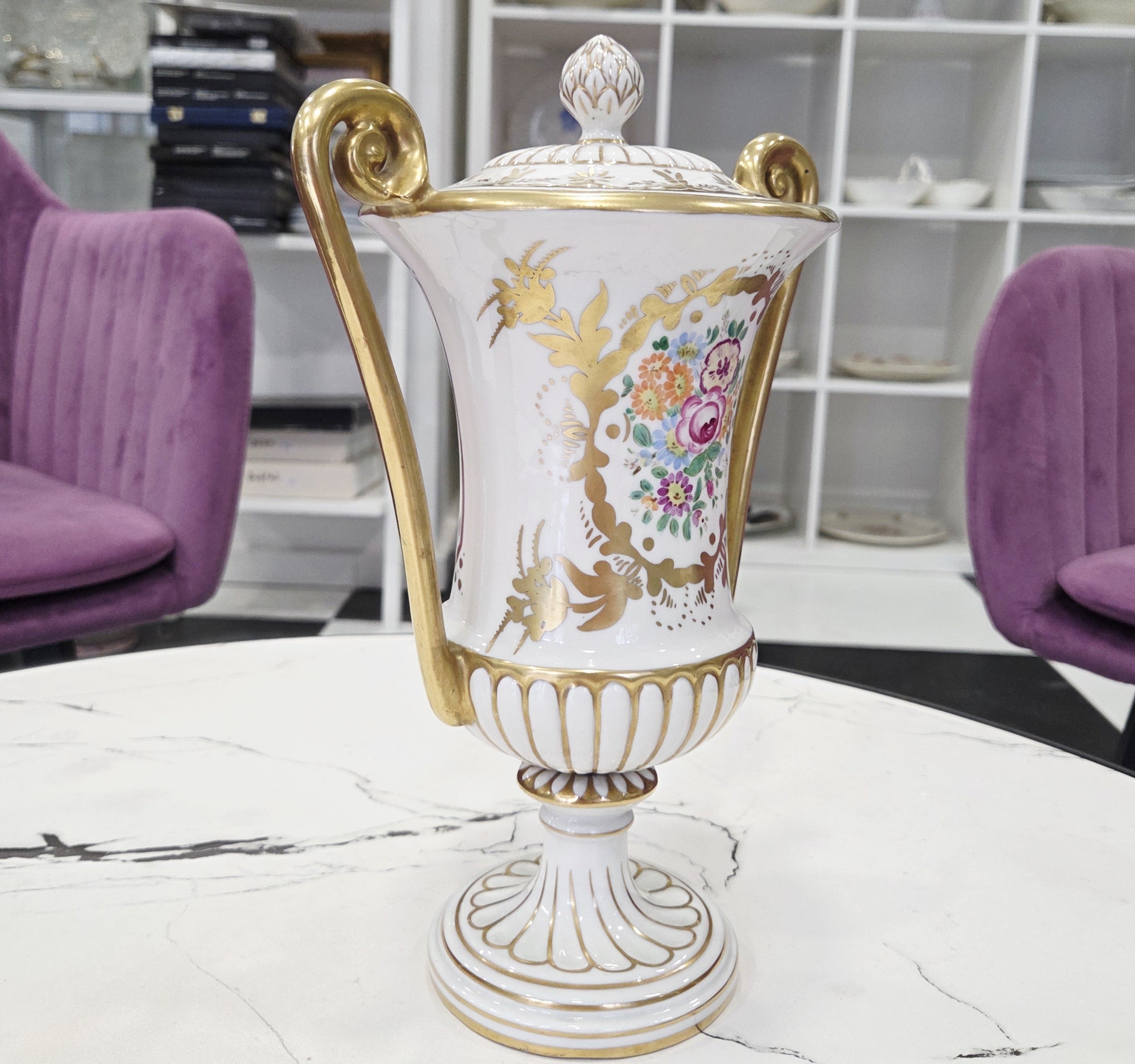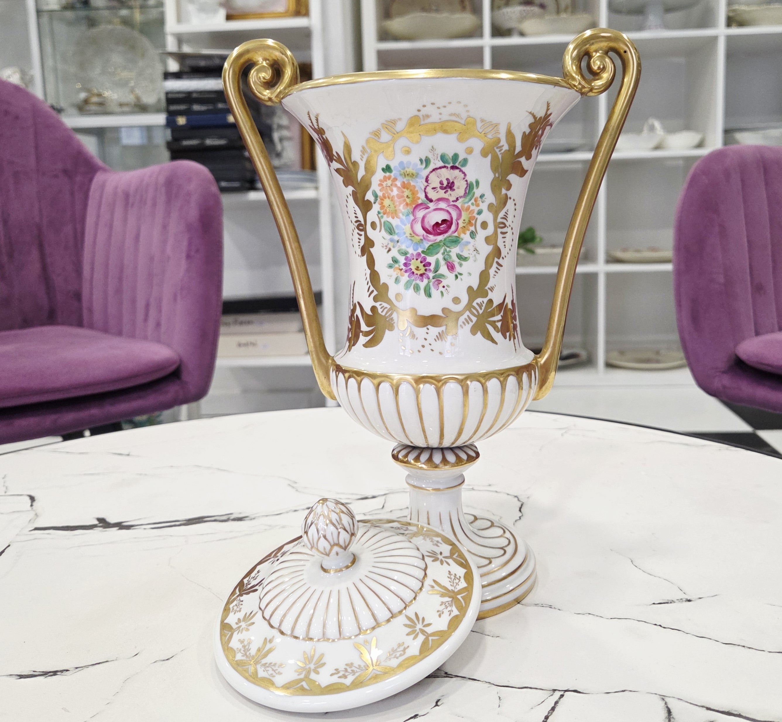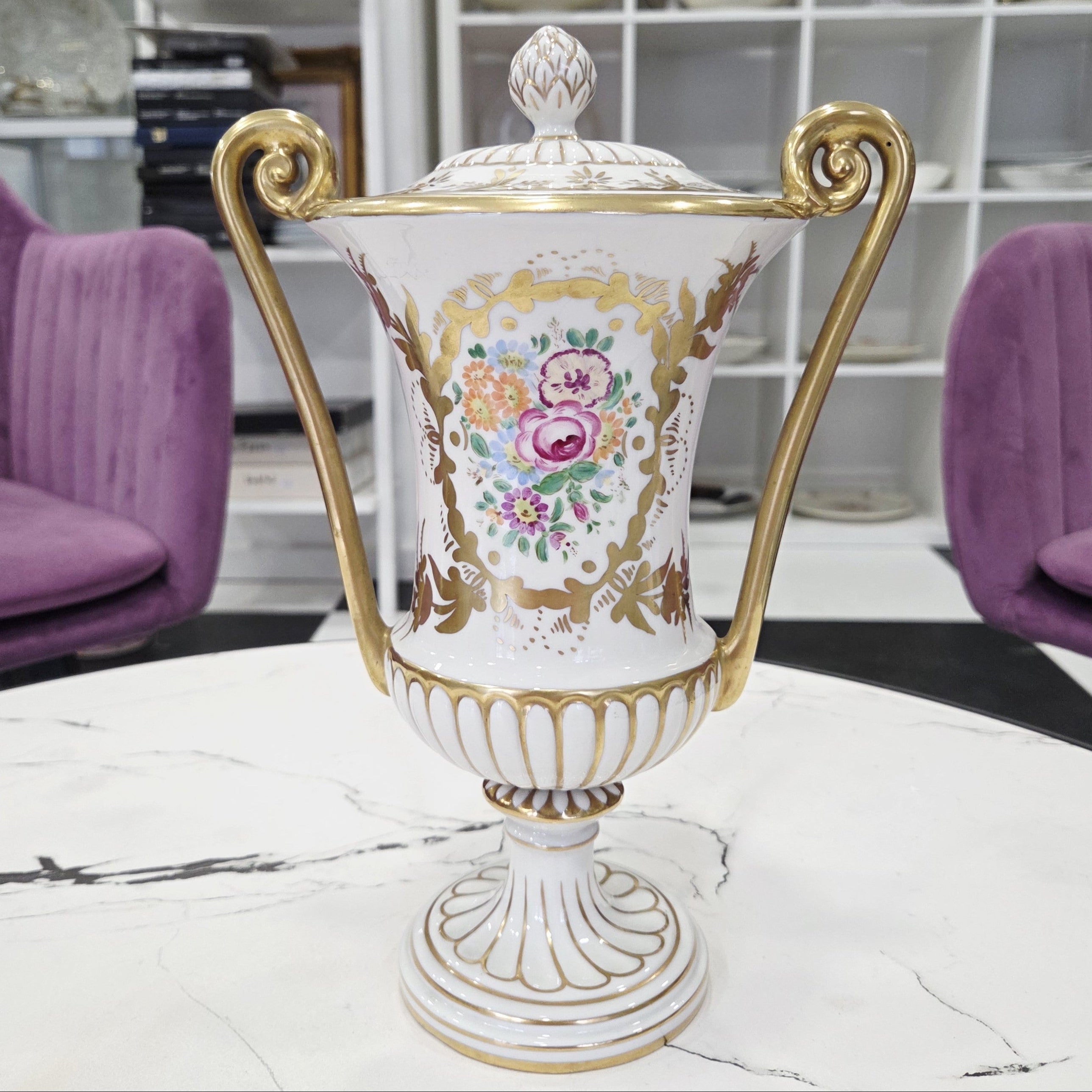 Rafinuotas balto porceliano paviršius dekoruotas subtiliais gėlių motyvais bei sodriais aukso ornamentais, o grakščios išlenktos rankenos ir dekoratyvus dangtelis suteikia vazai aristokratiško lengvumo. Tokie kūriniai vertinami kolekcininkų dėl aukštos porceliano kokybės, ilgametės manufaktūros tradicijos ir nesenstančio dizaino.