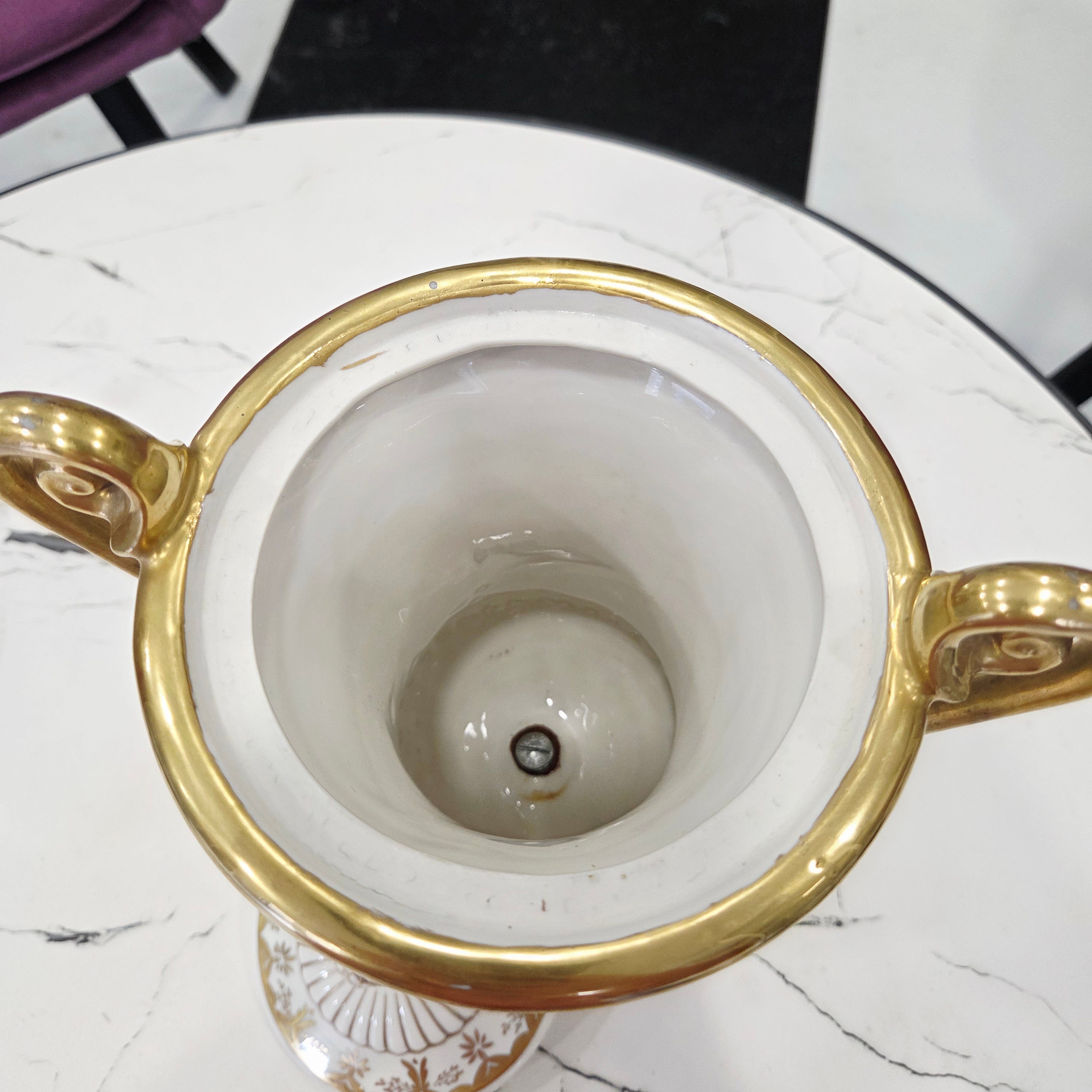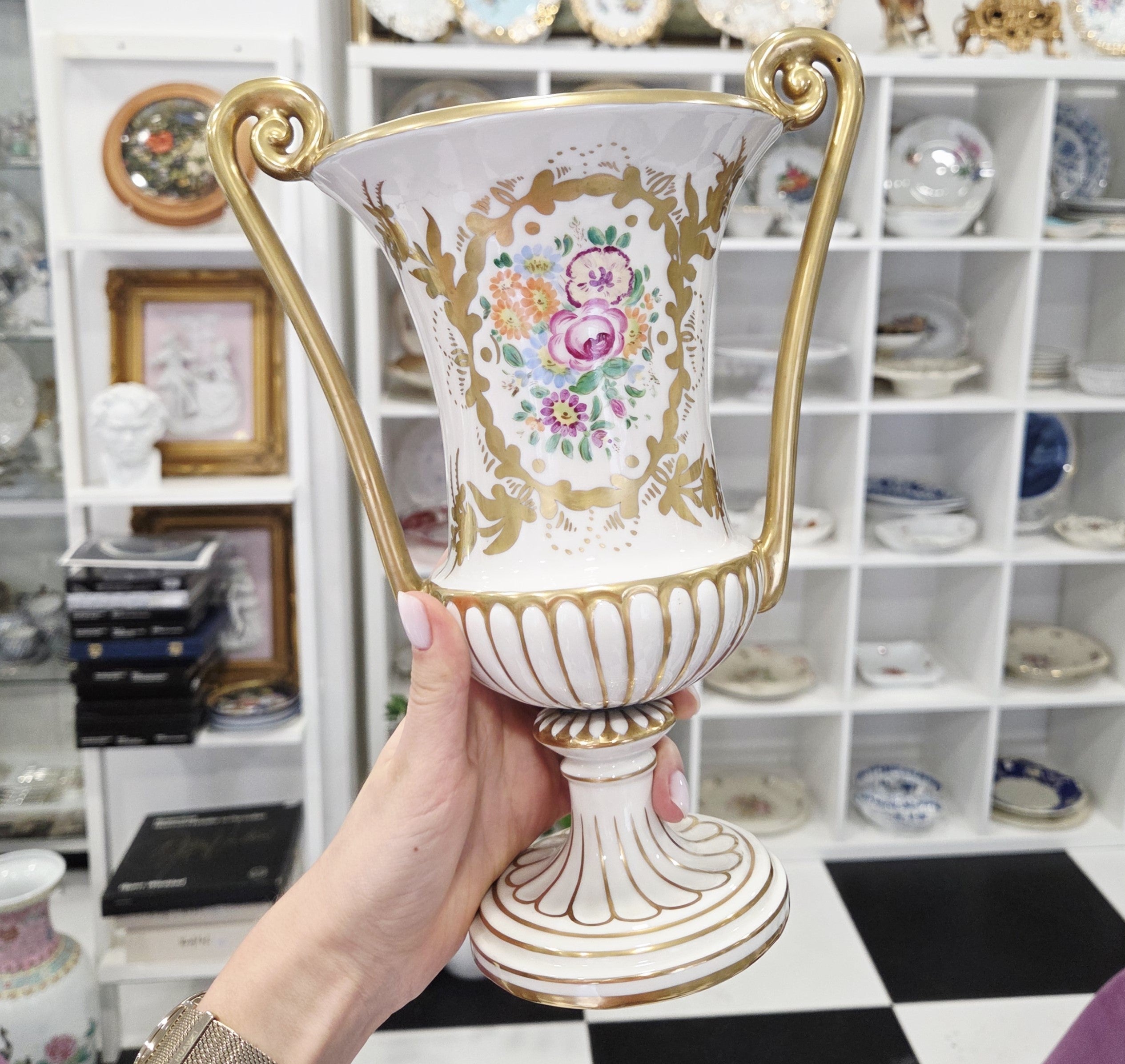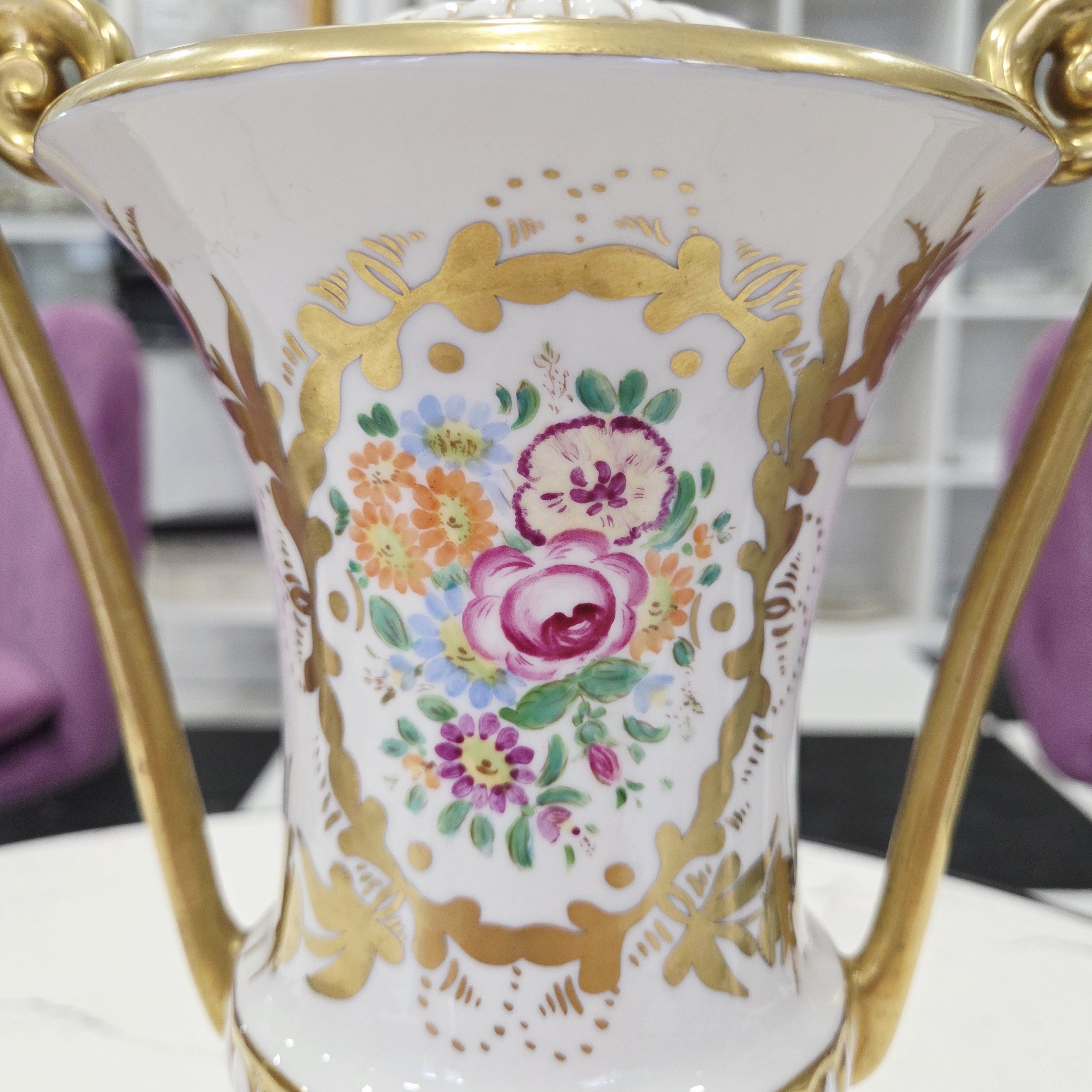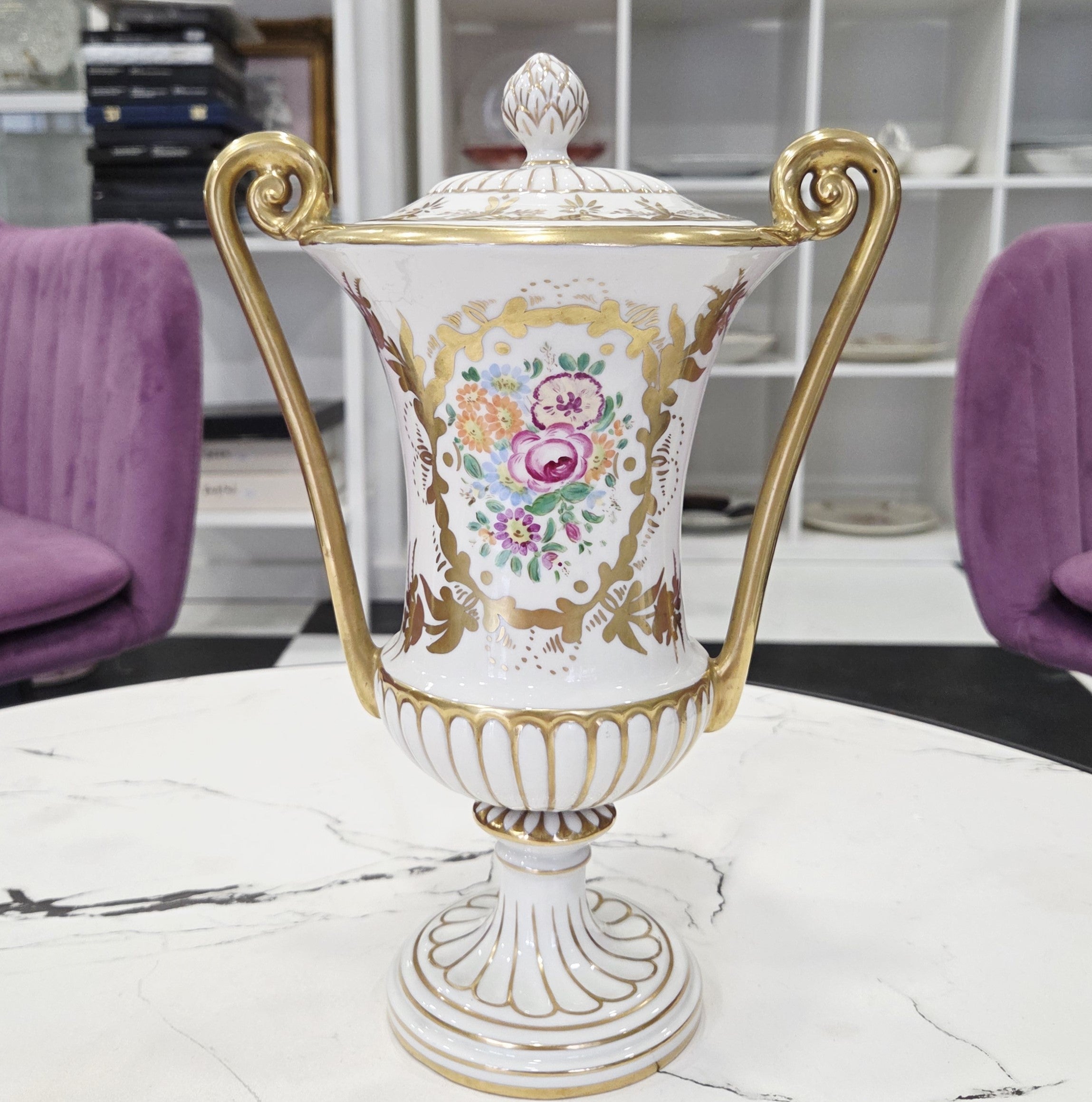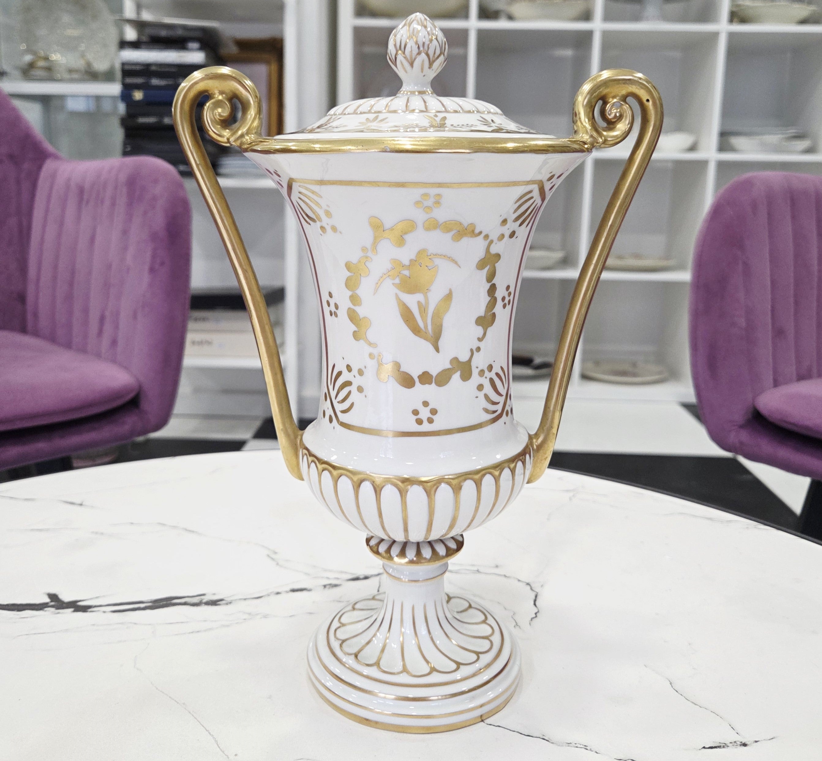 Rafinuotas balto porceliano paviršius dekoruotas subtiliais gėlių motyvais bei sodriais aukso ornamentais, o grakščios išlenktos rankenos ir dekoratyvus dangtelis suteikia vazai aristokratiško lengvumo. Tokie kūriniai vertinami kolekcininkų dėl aukštos porceliano kokybės, ilgametės manufaktūros tradicijos ir nesenstančio dizaino.