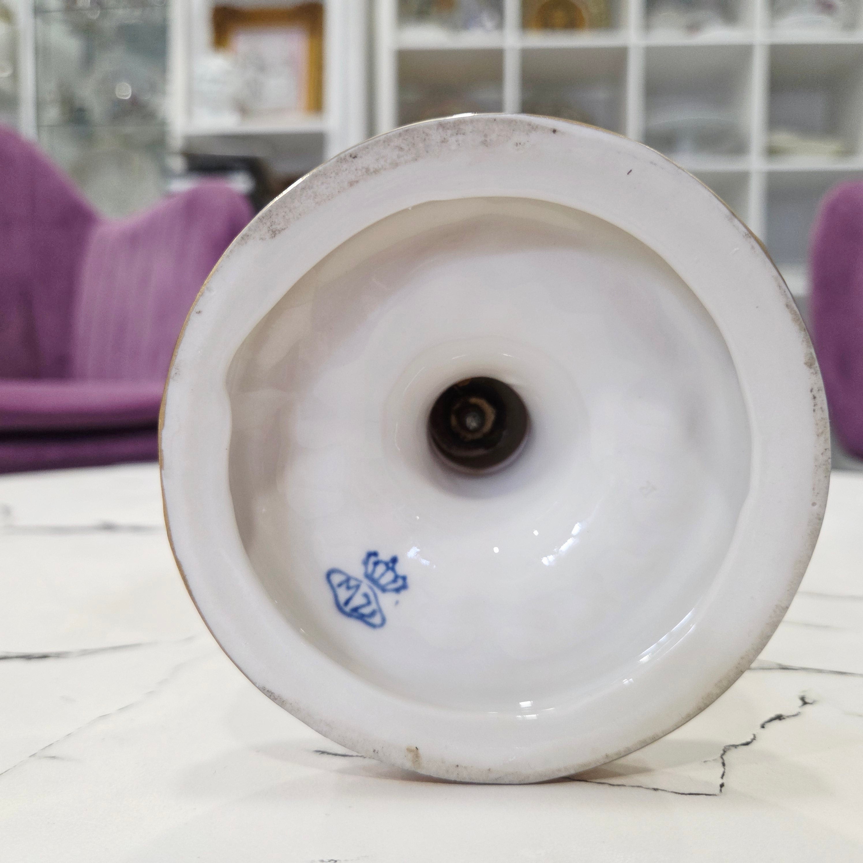 Išskirtinė MV „Mueller & Co Volkstedt“ porceliano vaza su dangčiu, pagaminta Vokietijoje apie 1907–1949 m. laikotarpiu – elegancijos, meistriškumo ir klasikinės prabangos simbolis.